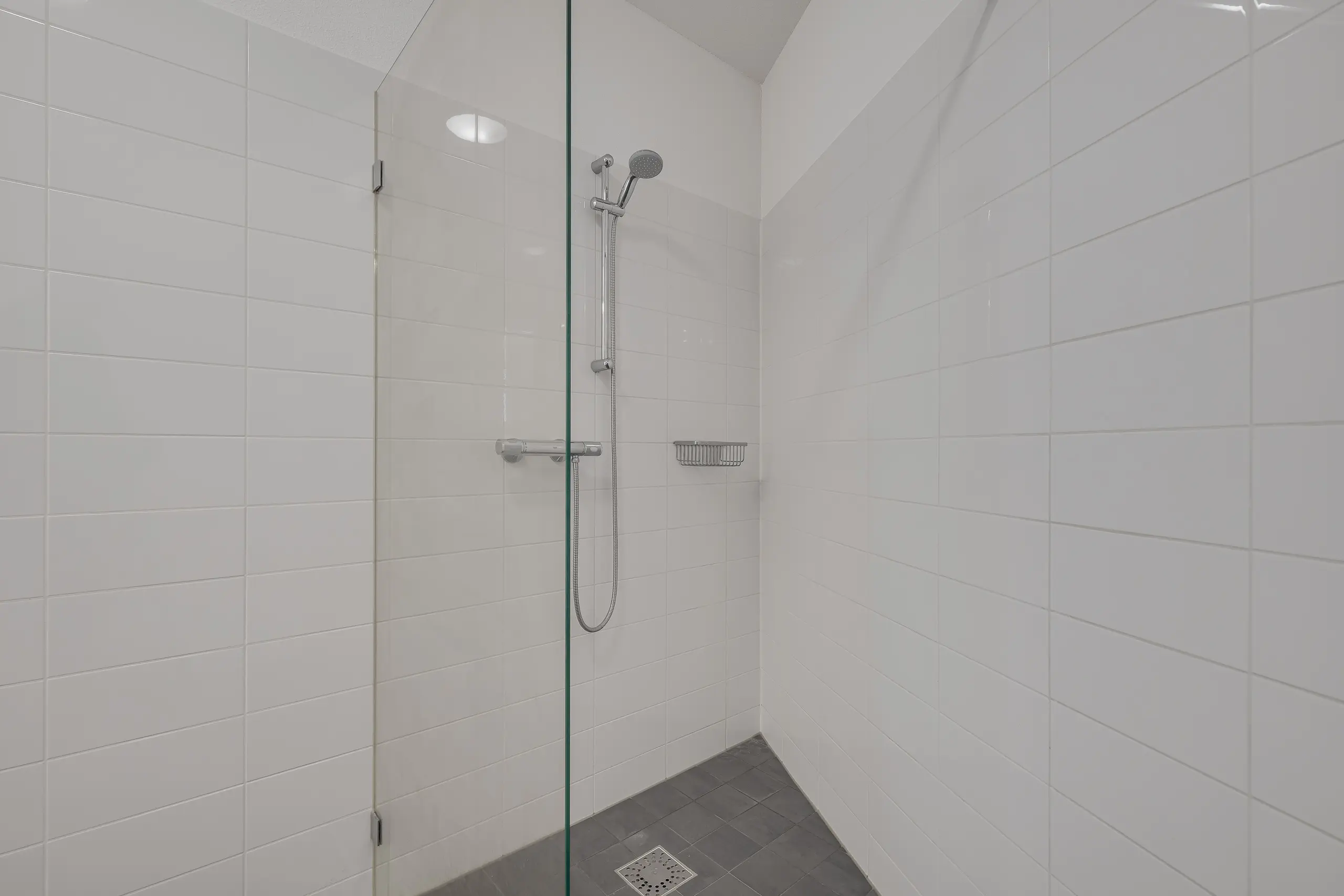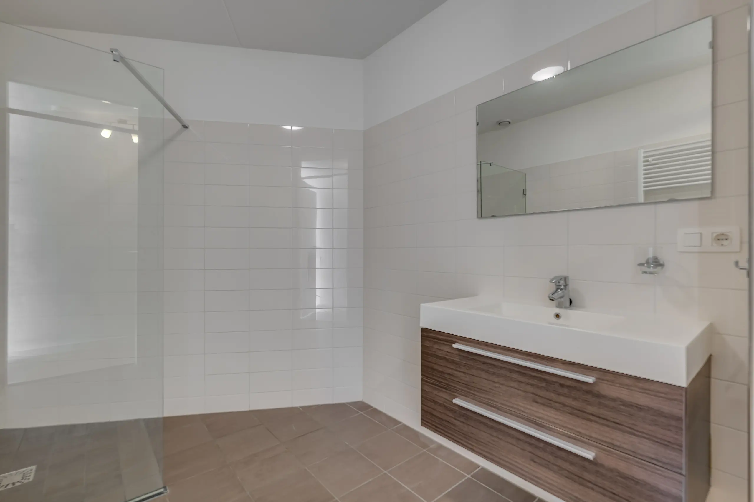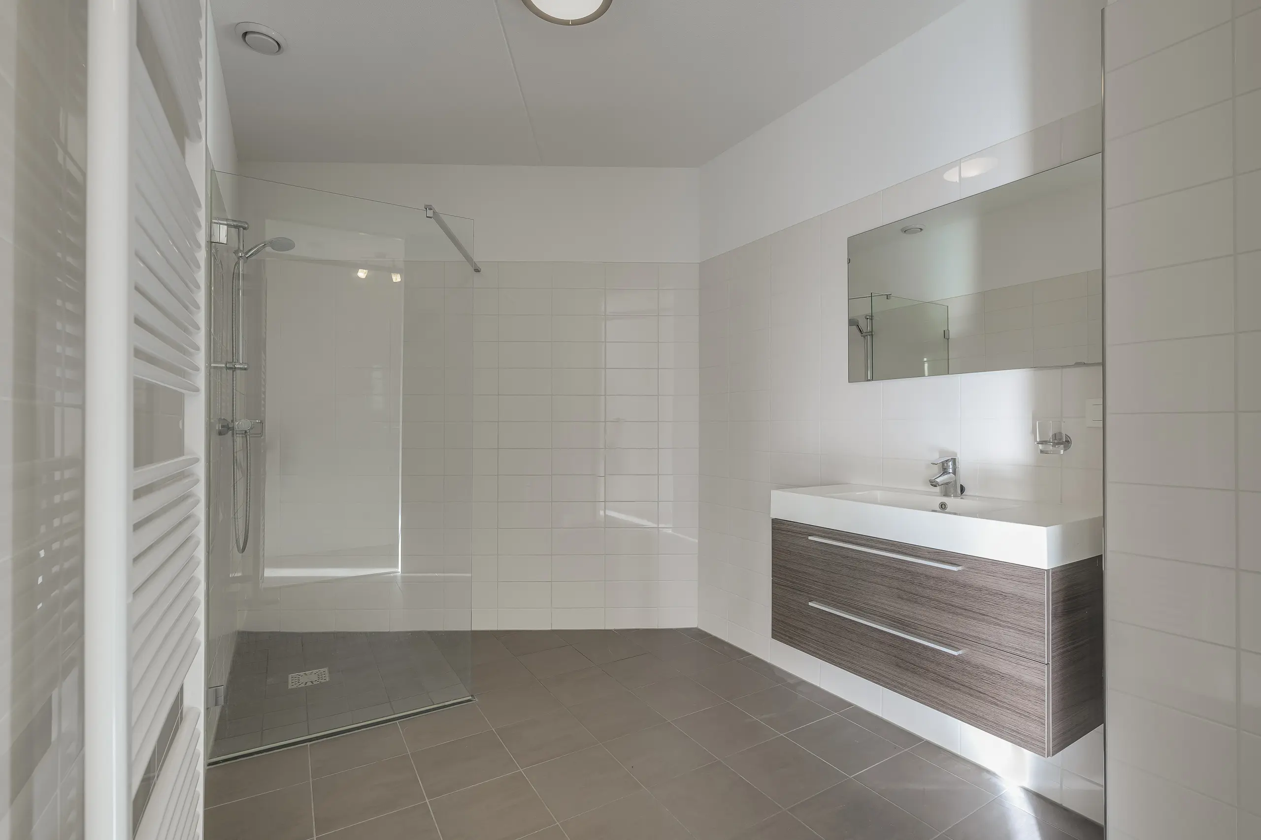 - Badkamer met wastafelmeubel, ruime inloopdouche en radiator;