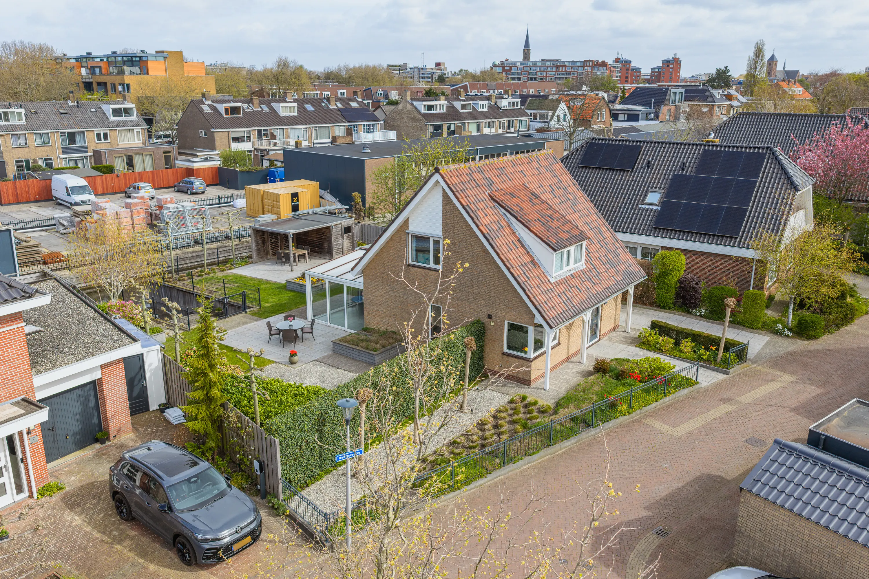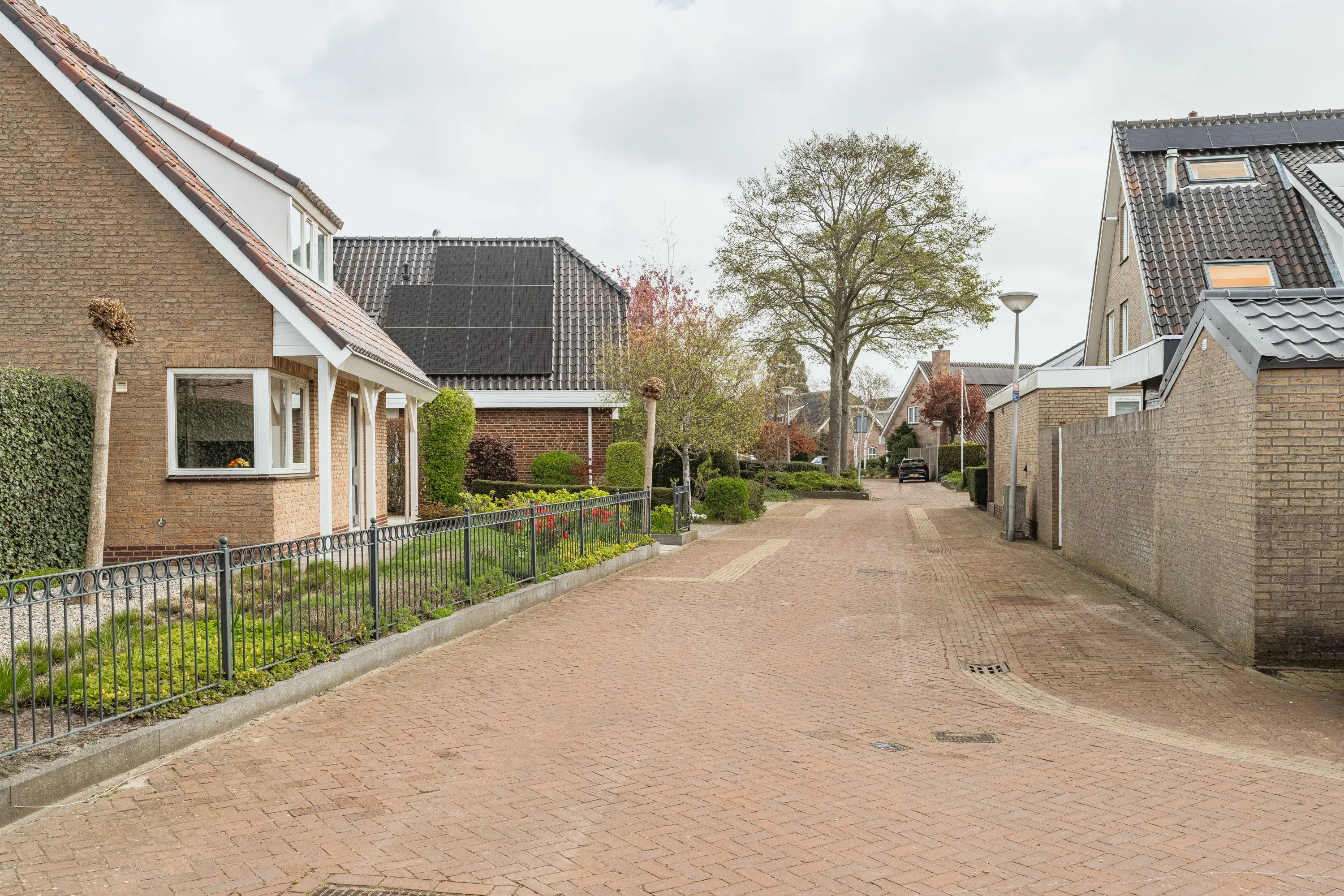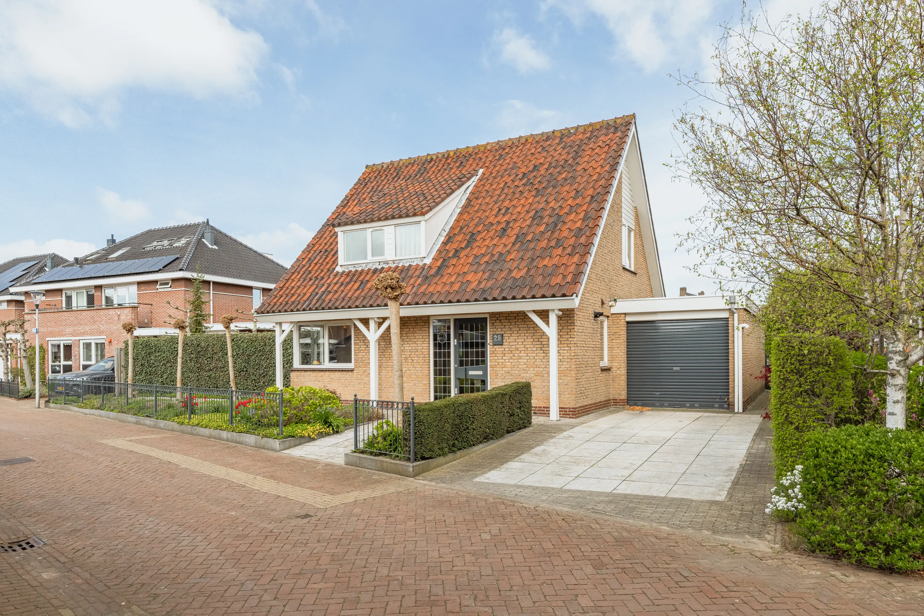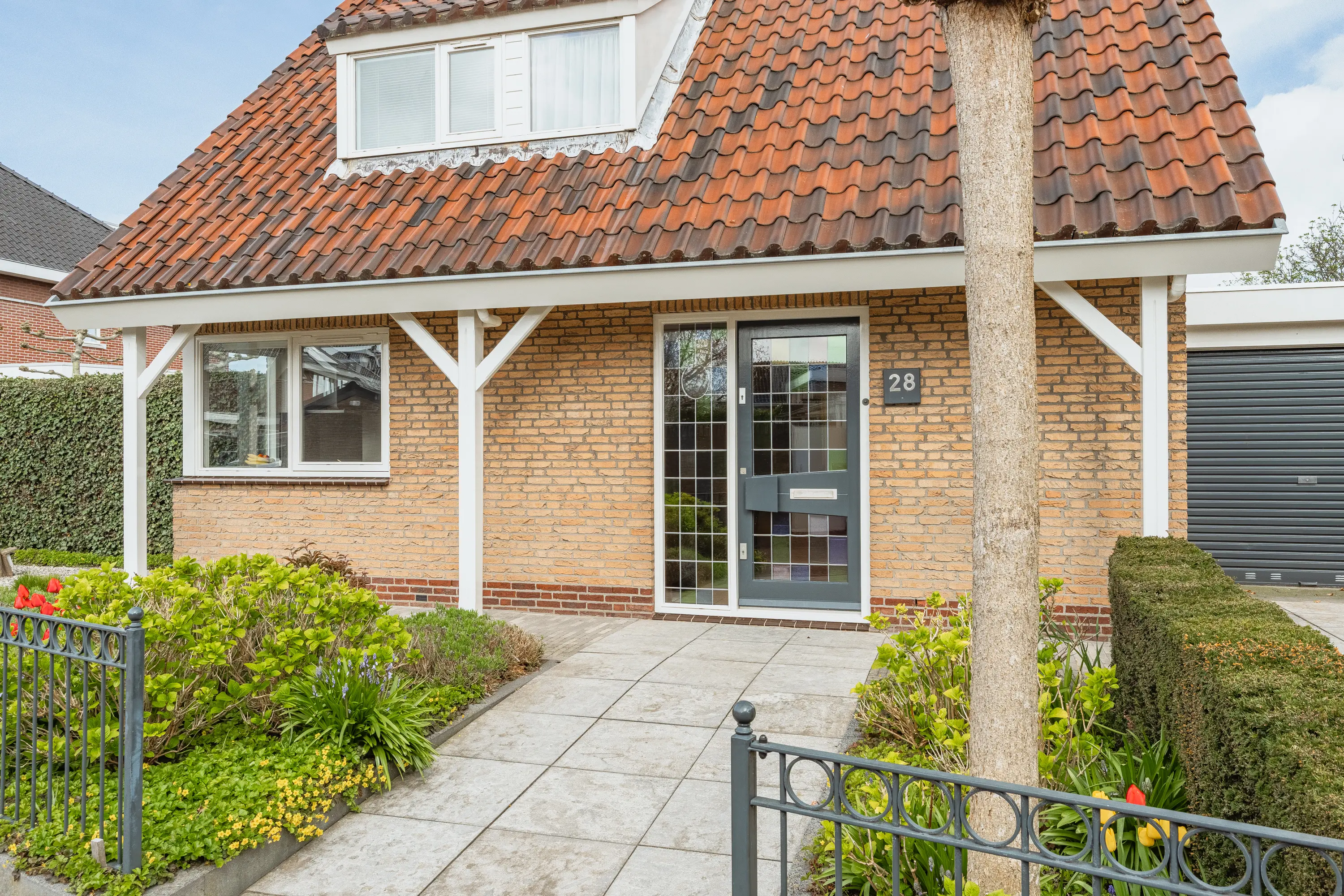 Aan de zijkant van de woning bevindt zich de aangebouwde stenen garage met roldeur en parkeergelegenheid voor twee auto’s op eigen terrein.