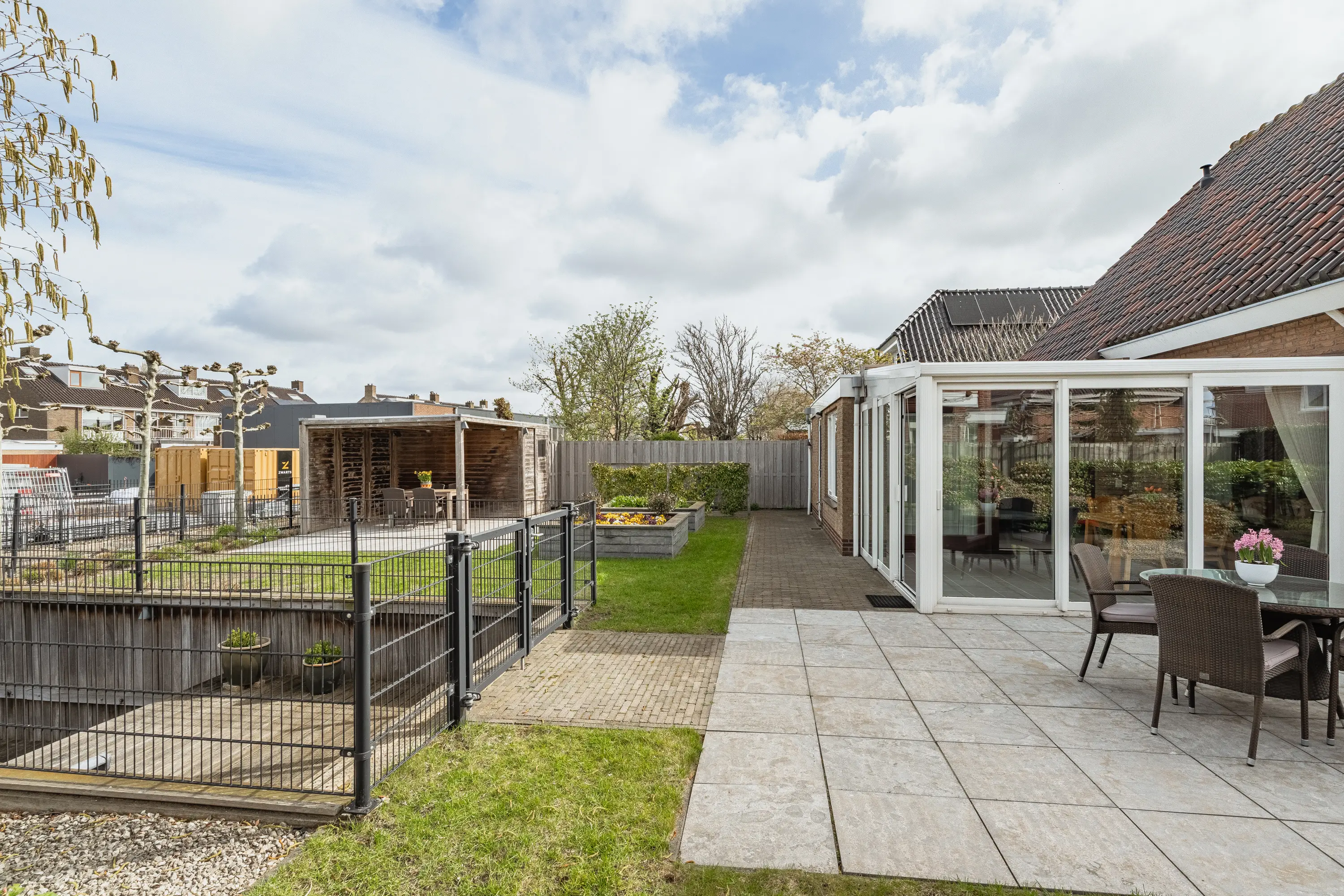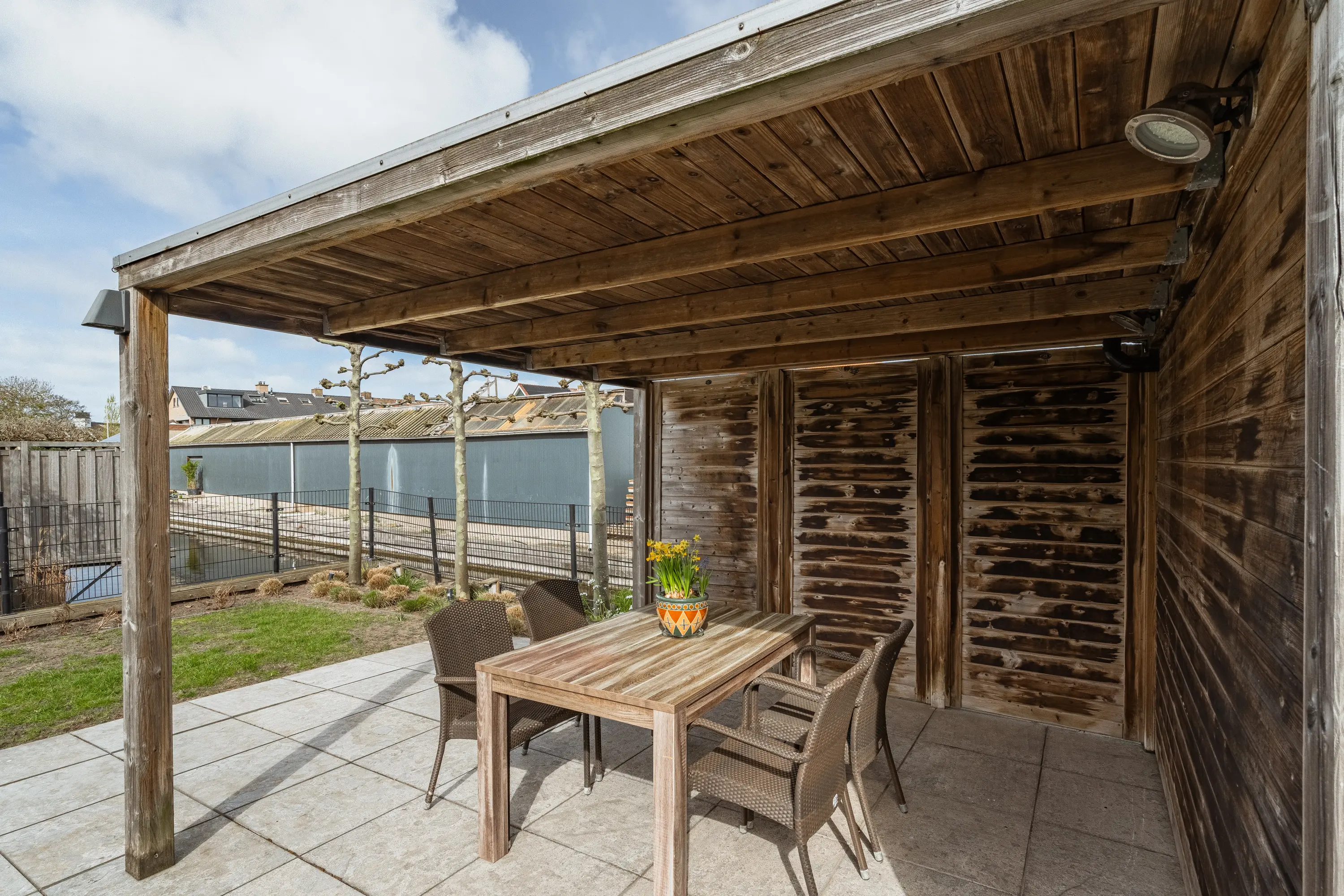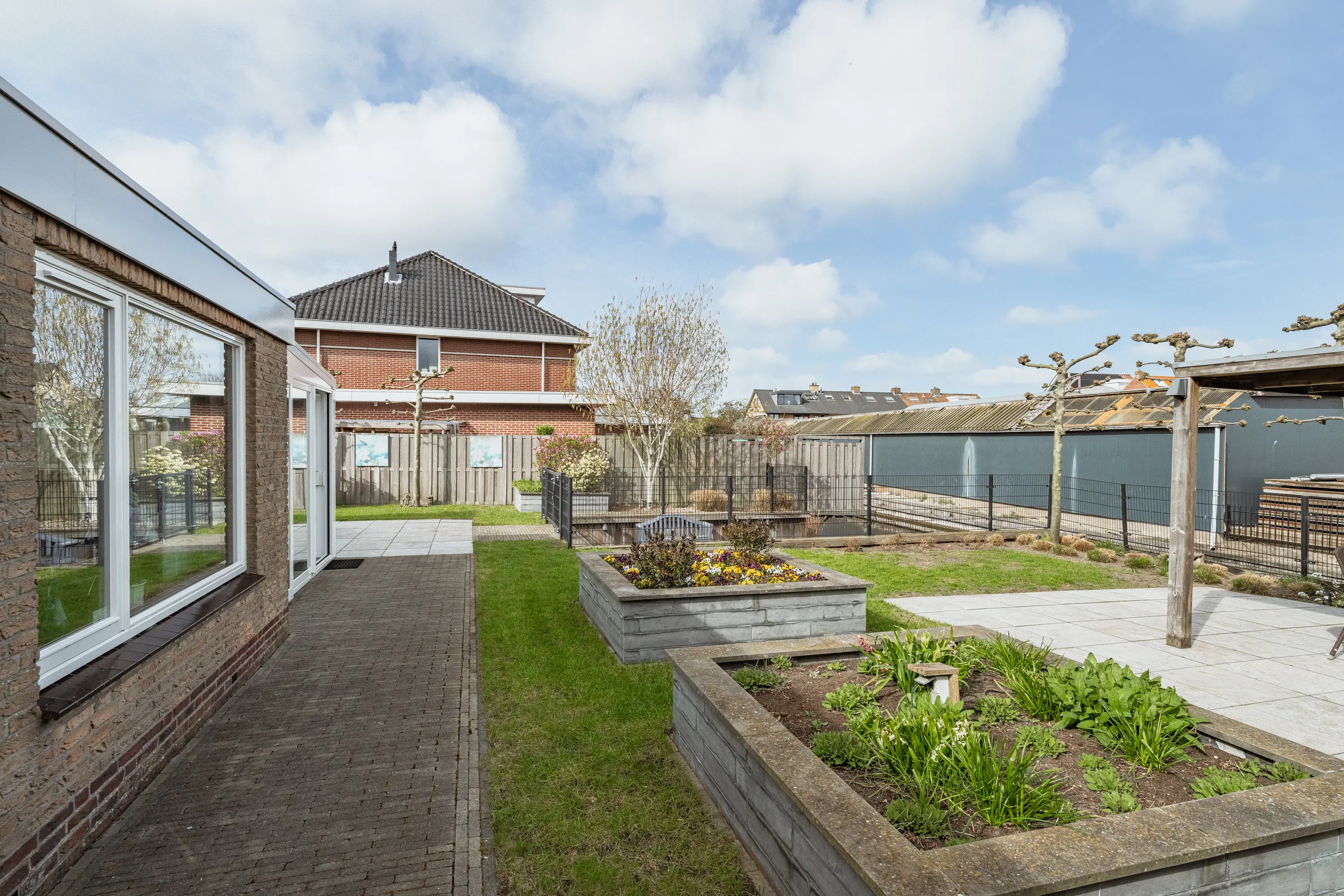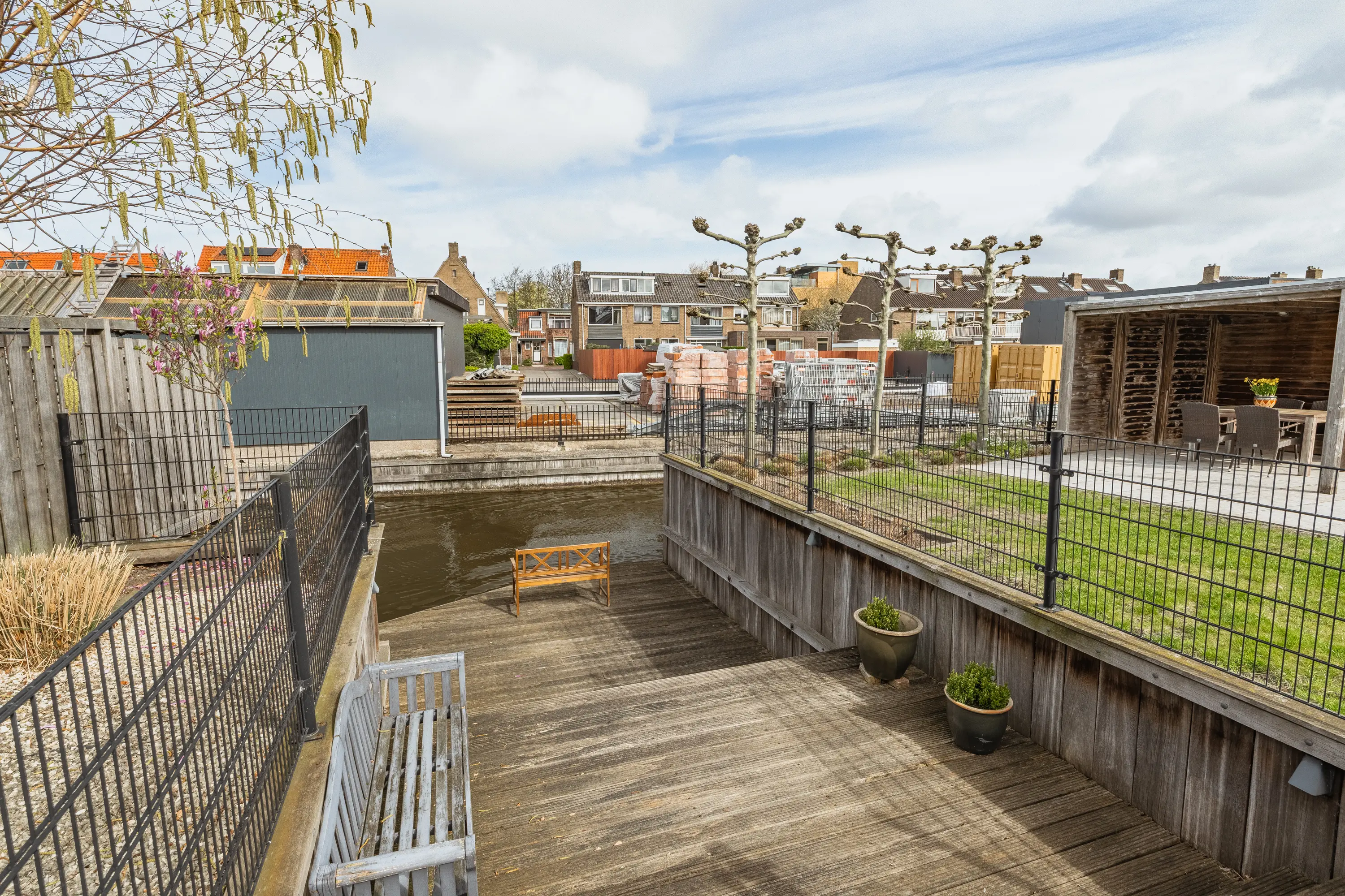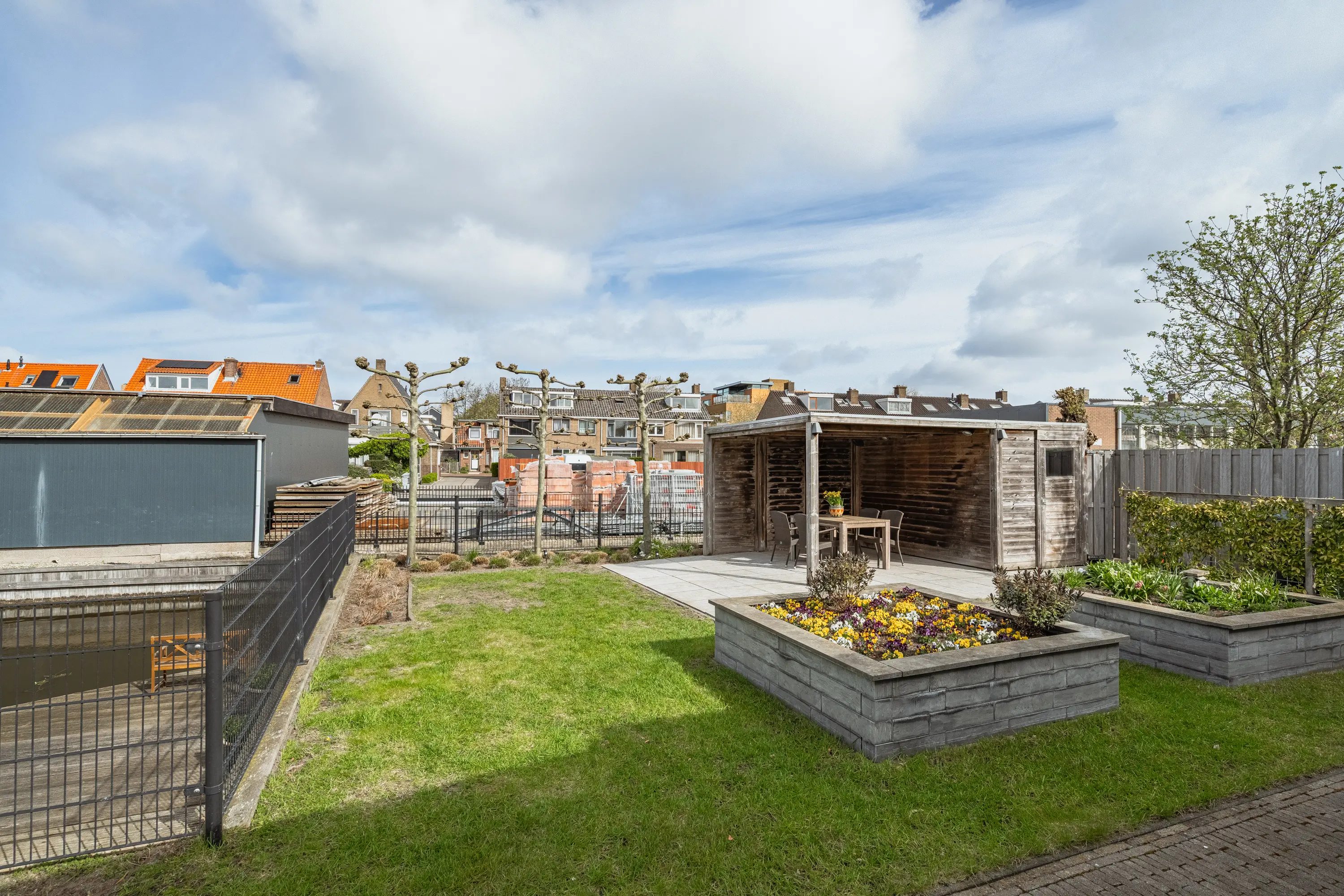 De achtertuin is een waar buitenparadijs: royaal, groen en direct aan het water gelegen. Dankzij meerdere terrassen vindt u altijd een plekje in de zon of schaduw. De tuin is kindvriendelijk ingericht met een hek naar de houten vlonder, zodat spelen veilig kan. Achterin staat een vrijstaande houten berging met overkapping. Ideaal voor fietsen, tuingereedschap én een gezellige zithoek.
