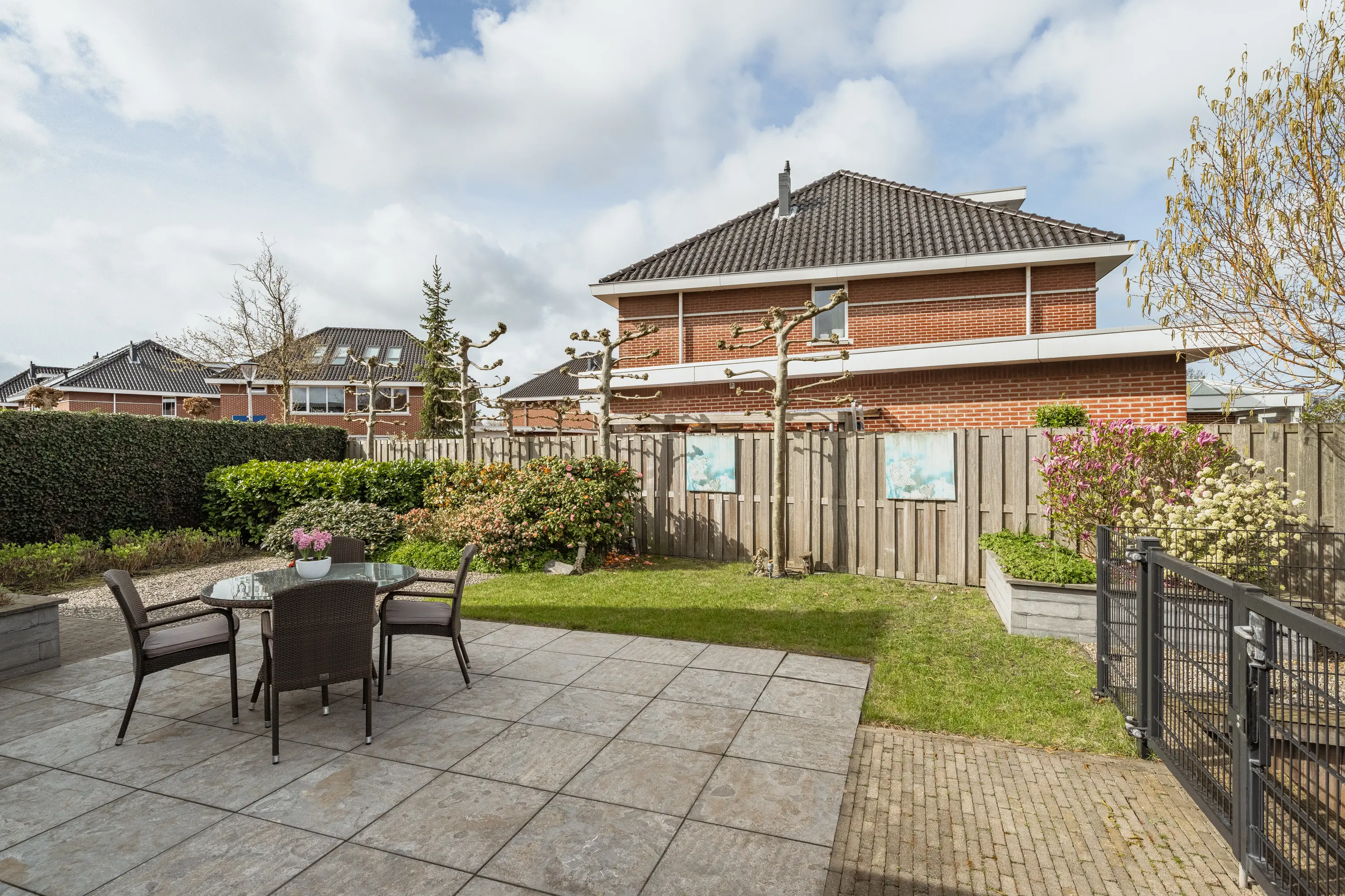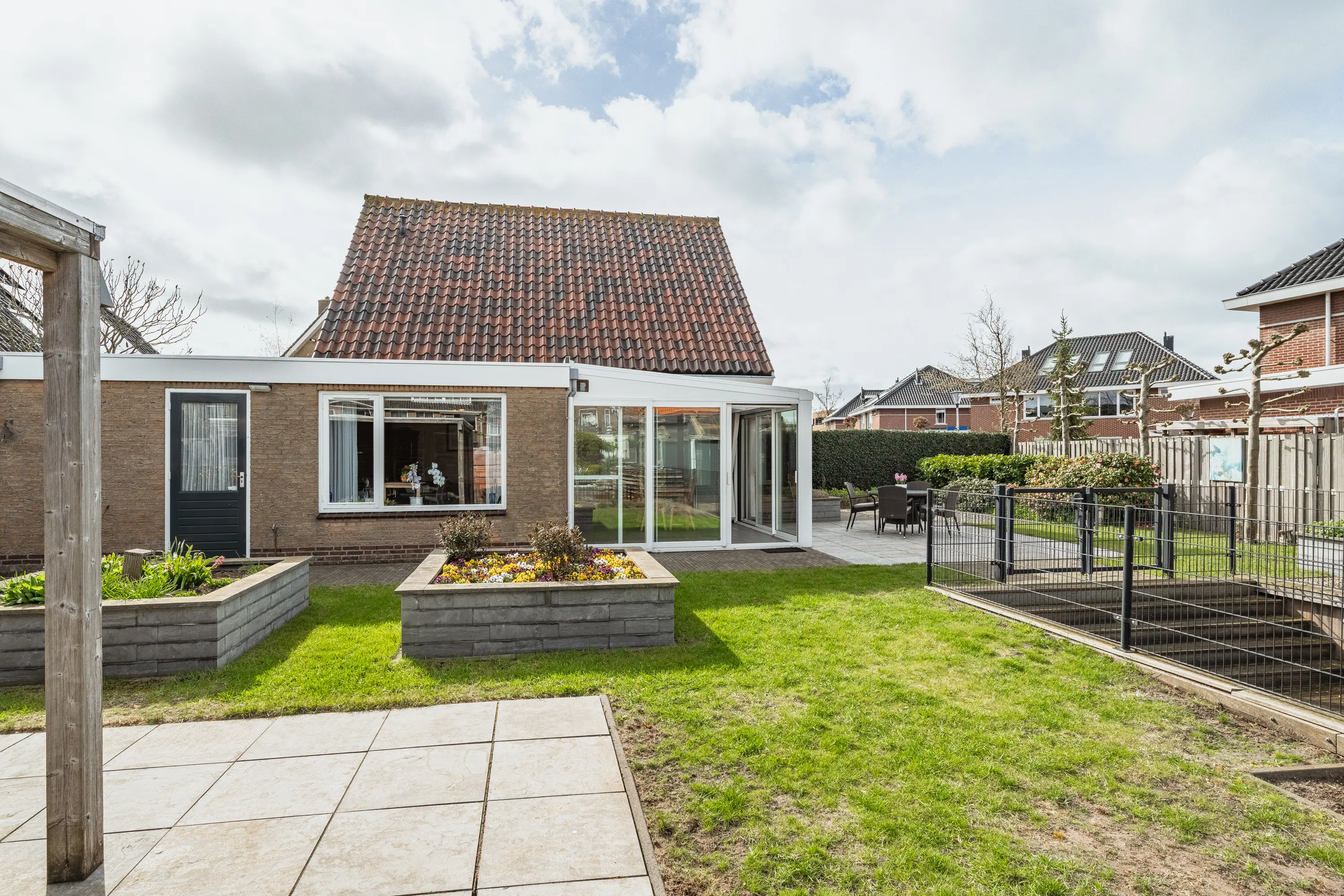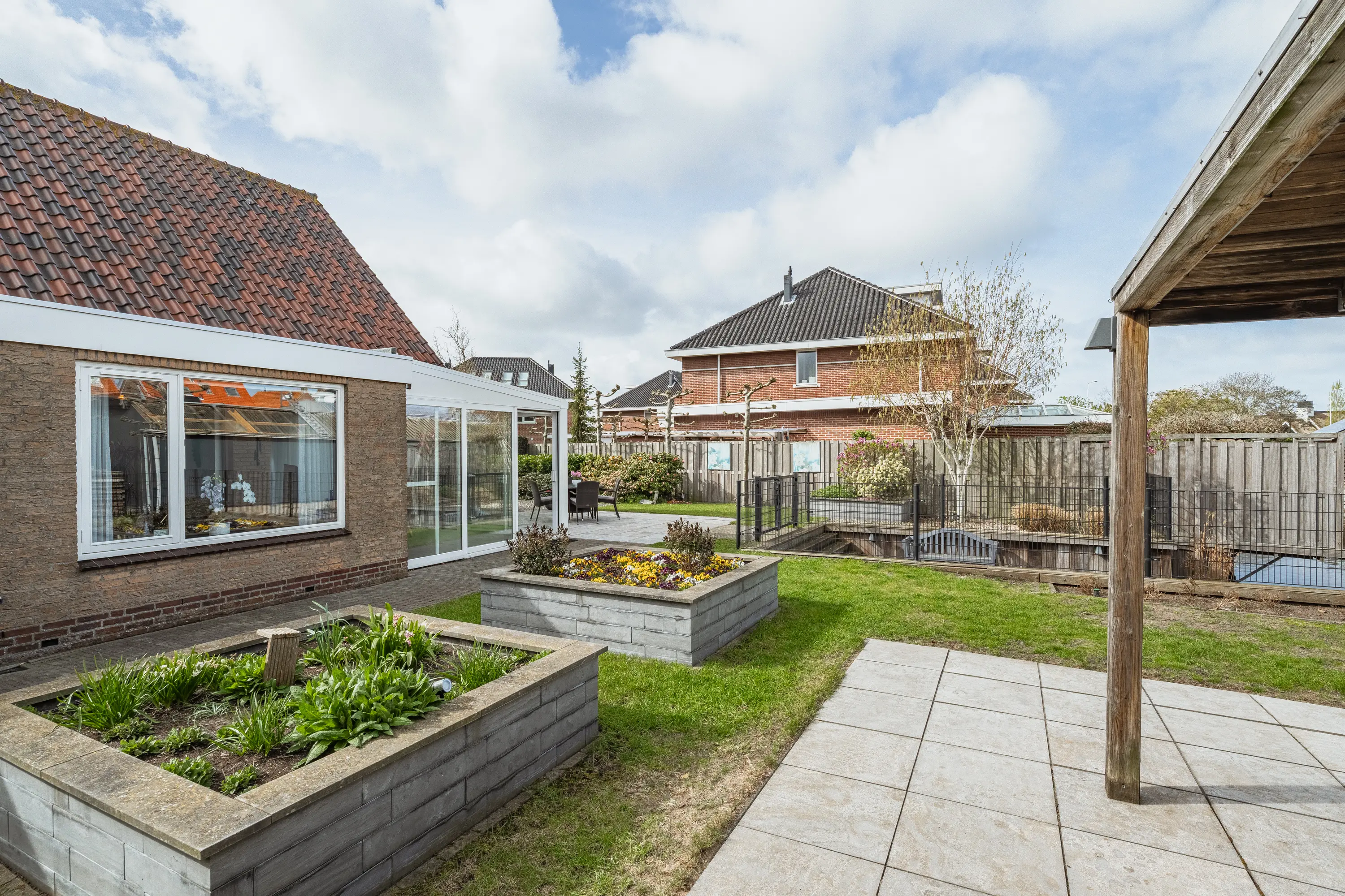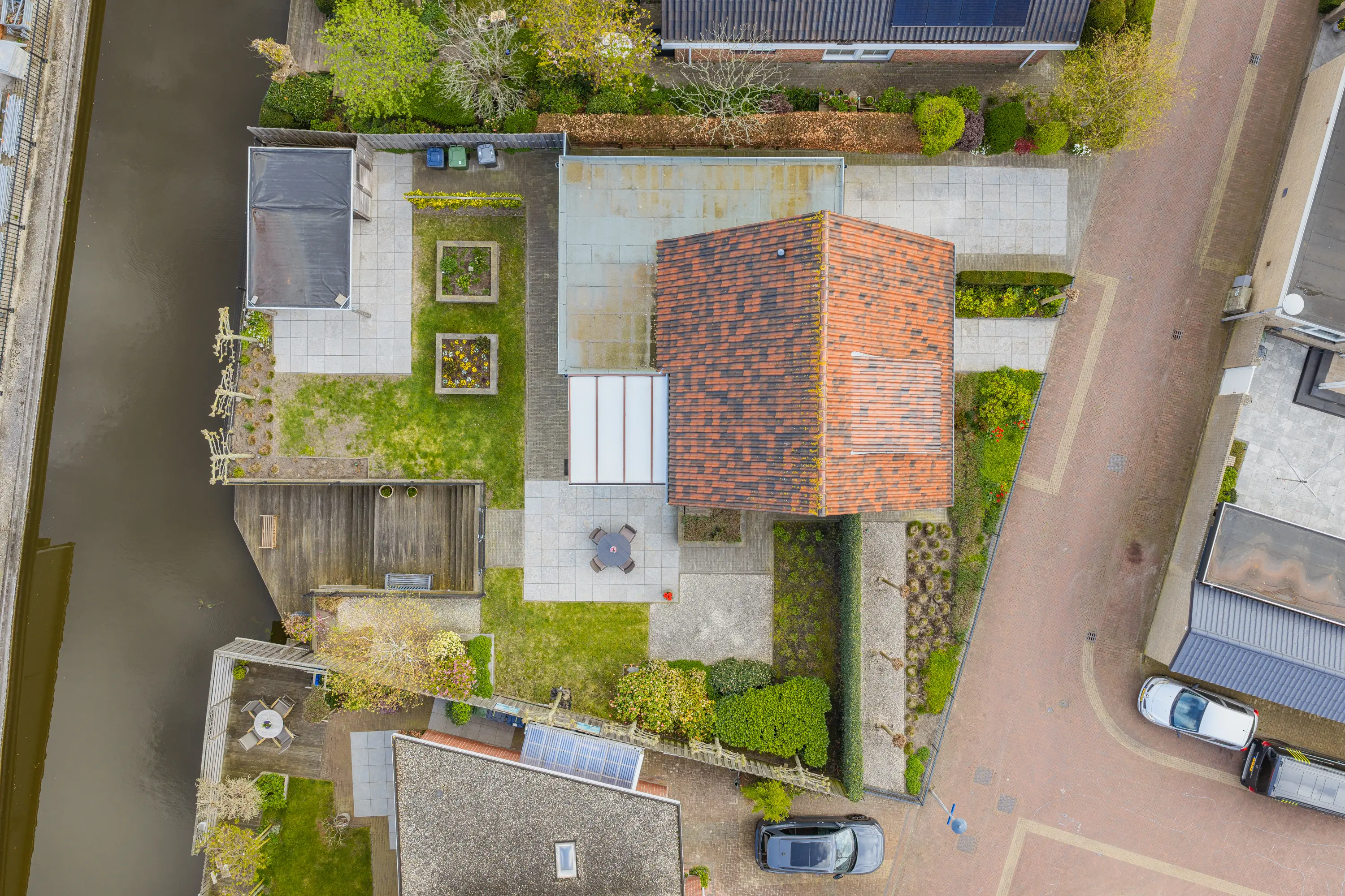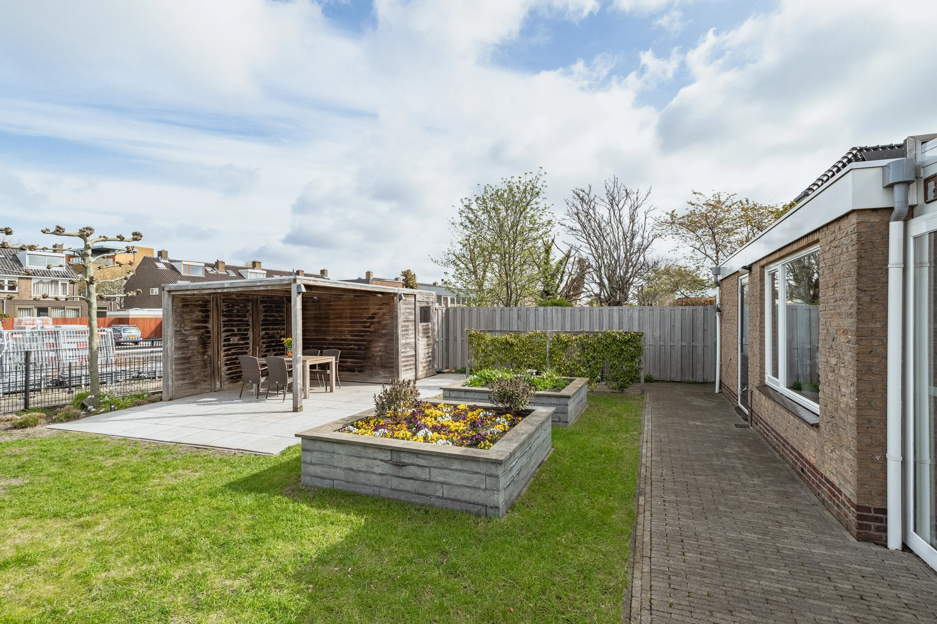 De achtertuin is een waar buitenparadijs: royaal, groen en direct aan het water gelegen. Dankzij meerdere terrassen vindt u altijd een plekje in de zon of schaduw. De tuin is kindvriendelijk ingericht met een hek naar de houten vlonder, zodat spelen veilig kan. Achterin staat een vrijstaande houten berging met overkapping. Ideaal voor fietsen, tuingereedschap én een gezellige zithoek.