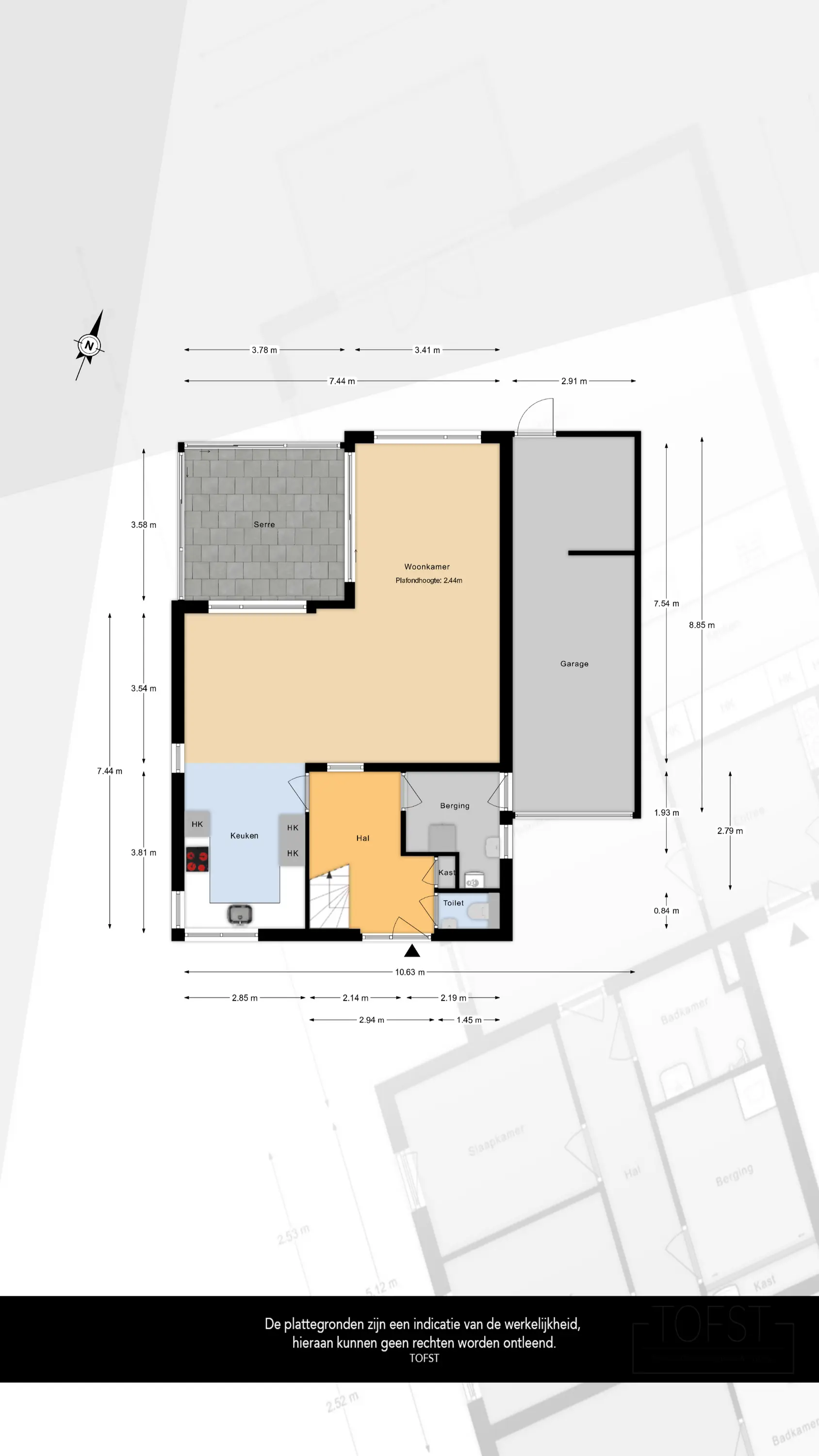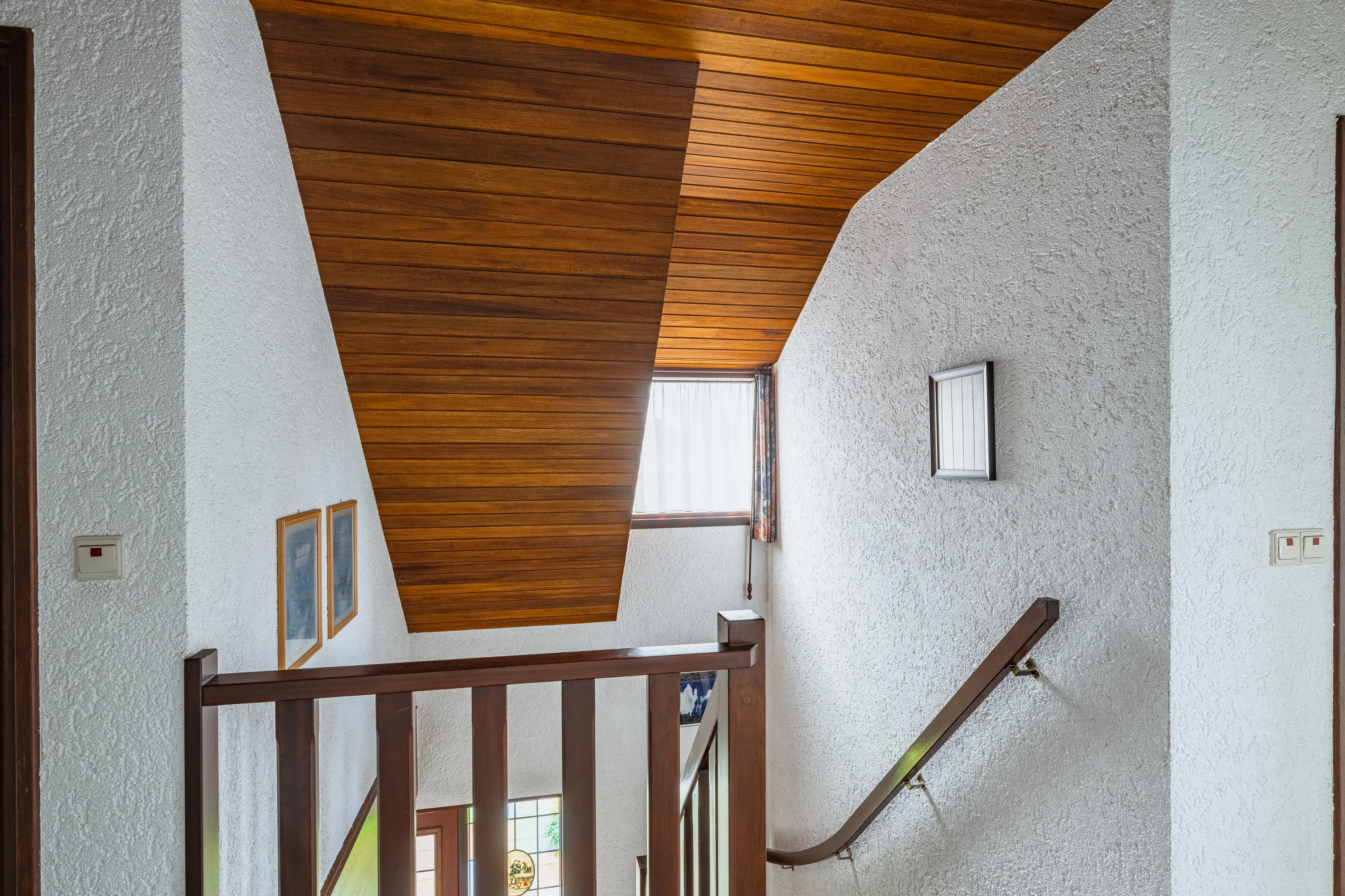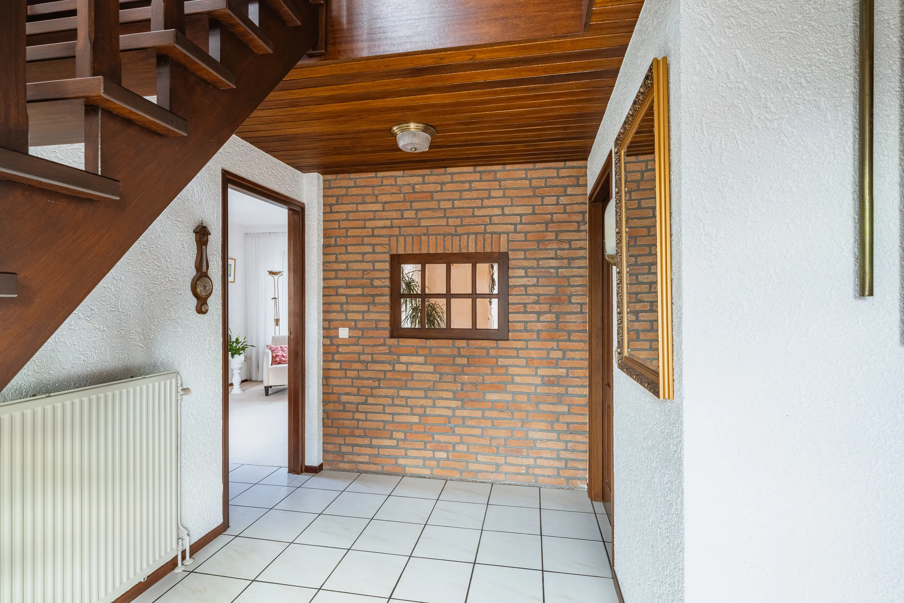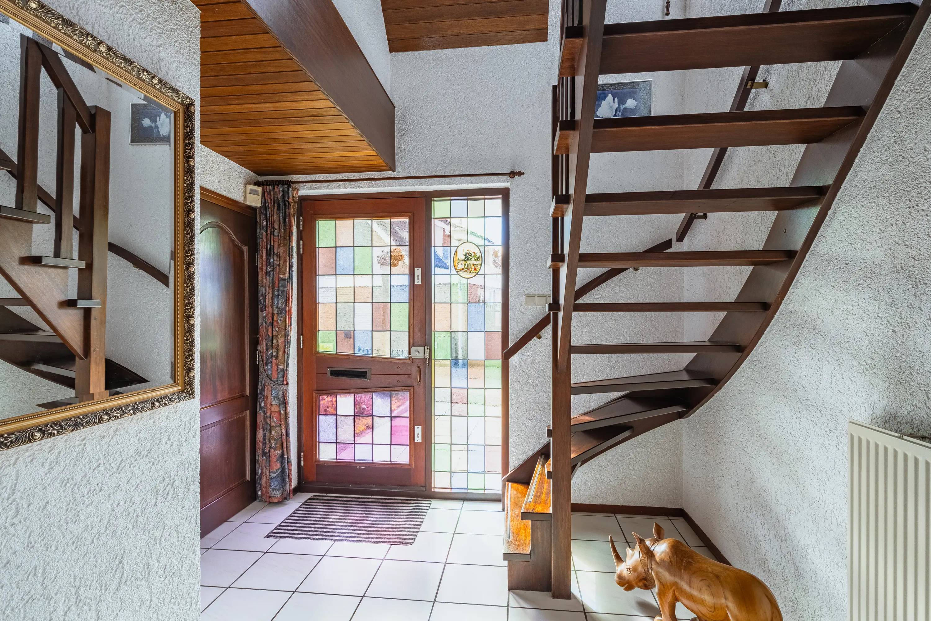 Via de diepe, groene voortuin bereikt u de voordeur met prachtig glas-in-lood. U stapt binnen in een ruime hal met garderobe, een statige open trap naar de vide, een toiletruimte en toegang tot de woonkamer en de garage.