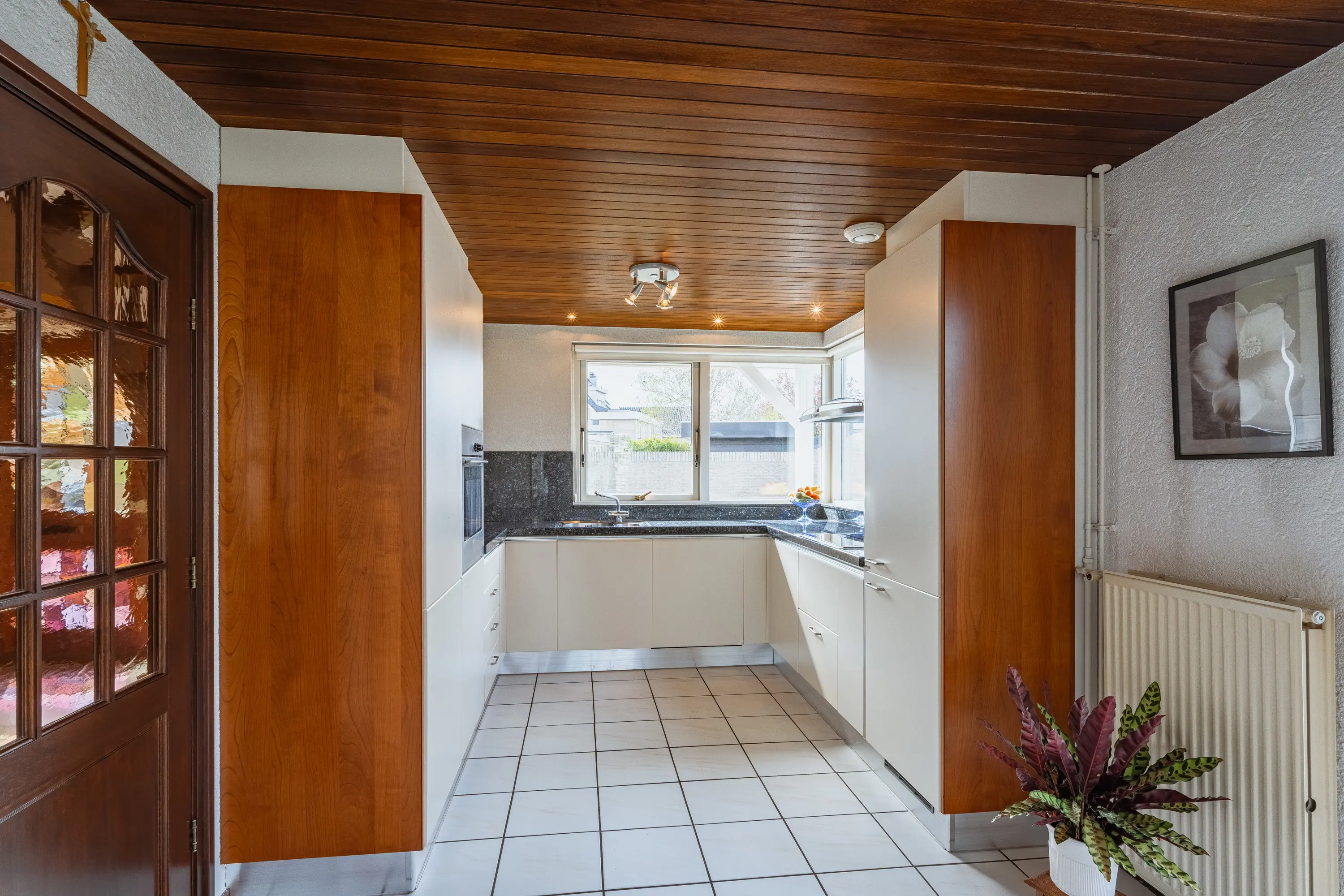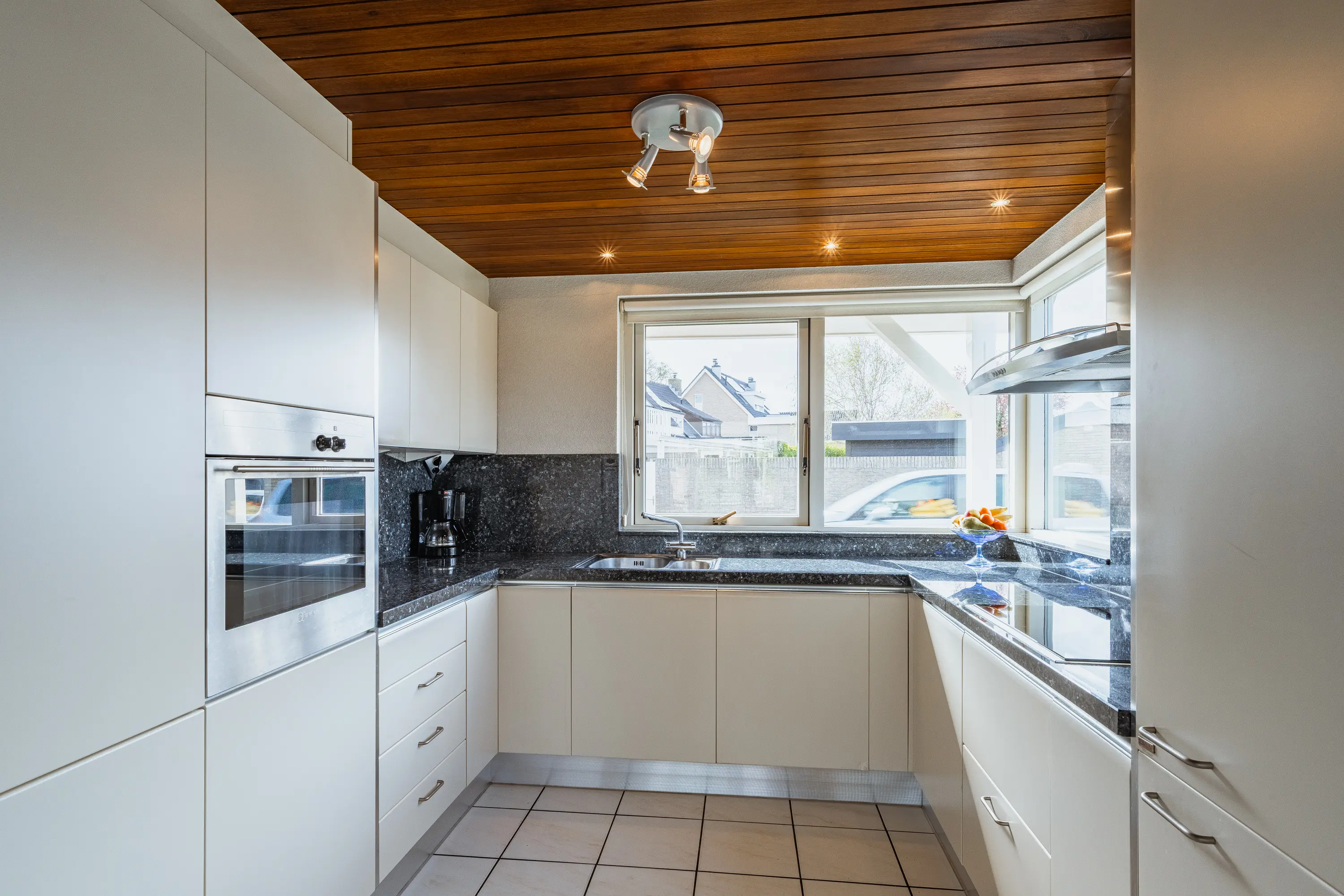 De open keuken in U-vorm (2002) sluit mooi aan op de woonkamer en is voorzien van diverse inbouwapparatuur, waaronder een inductiekookplaat (2017), combi-oven, koelkast, vriezer, vaatwasser en een anderhalve spoelbak. Er is volop kastruimte, waardoor u hier prettig kunt koken en leven.