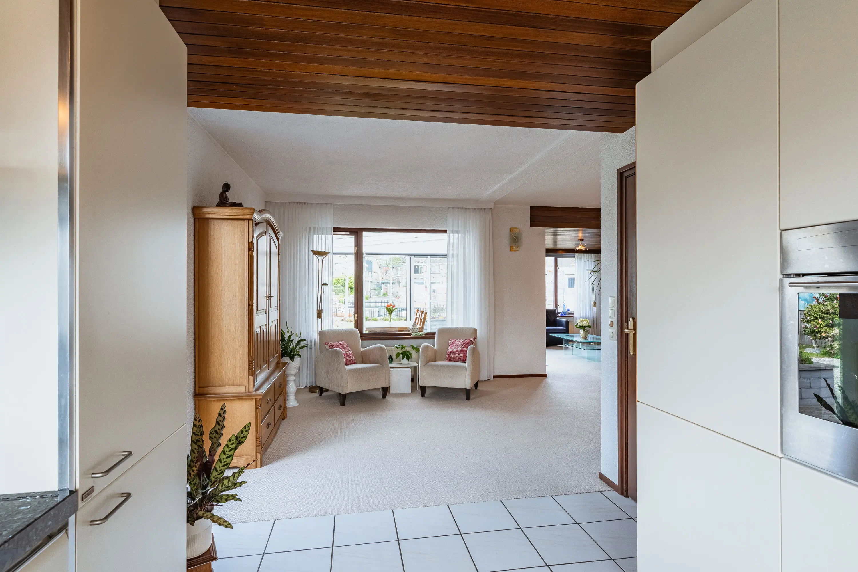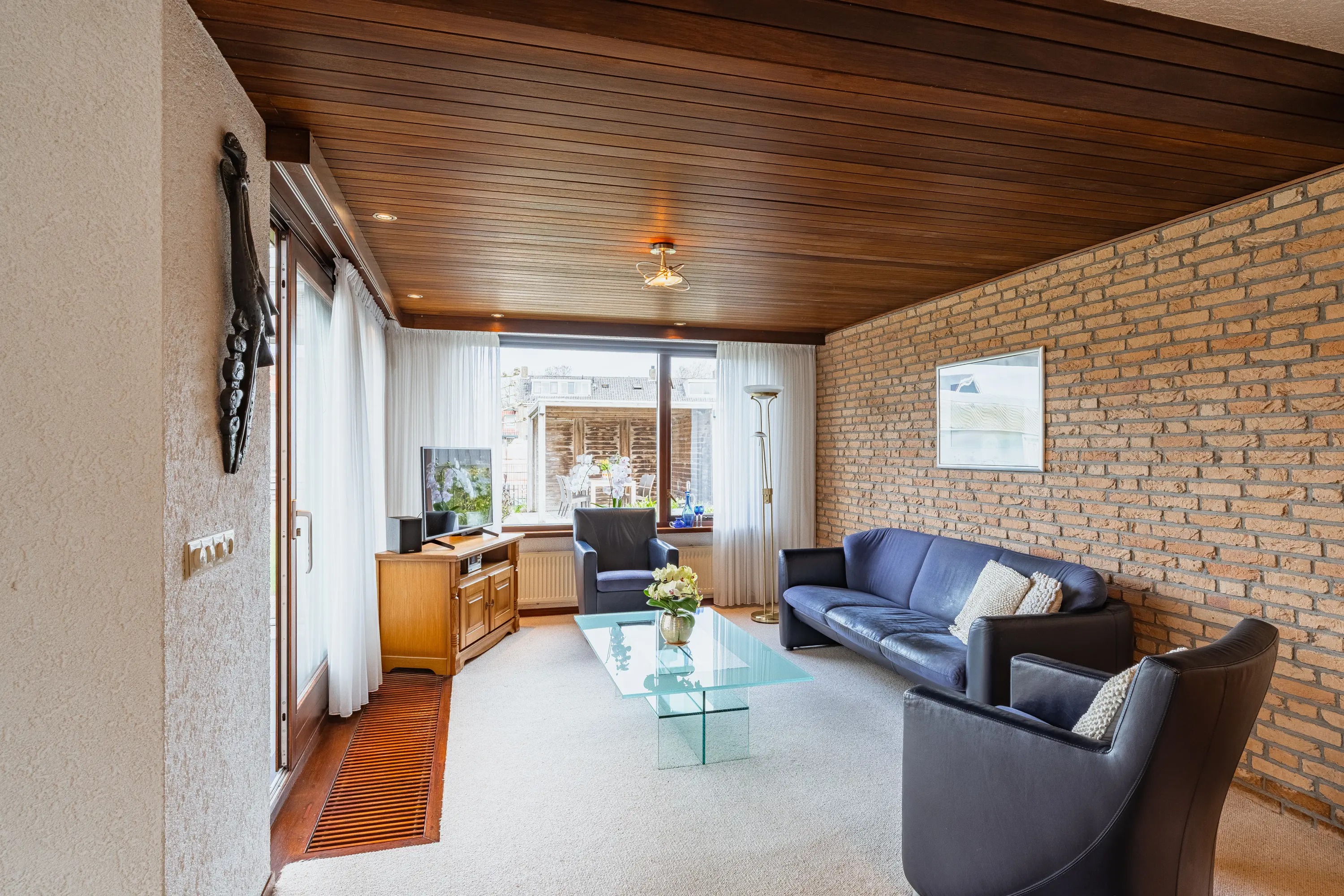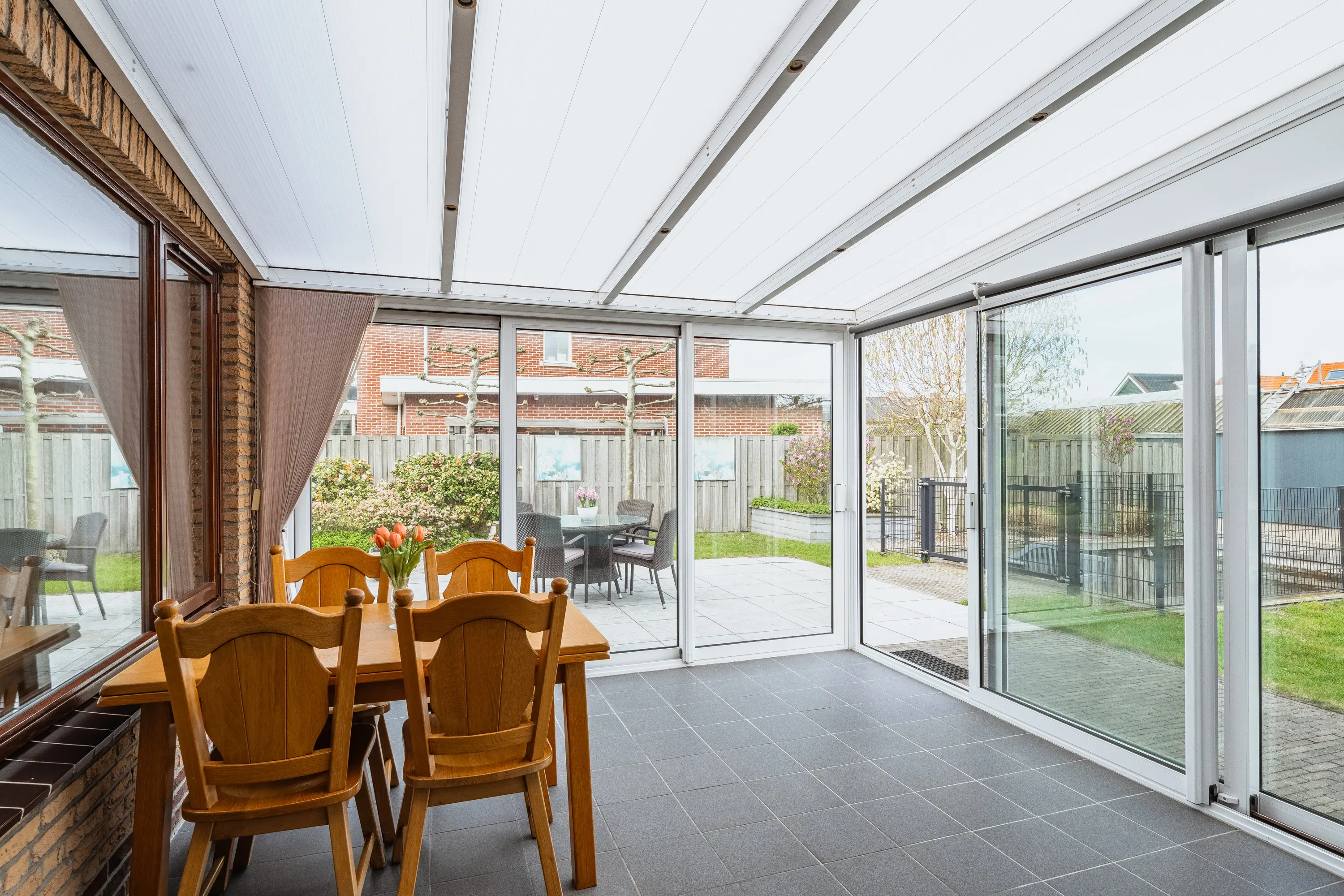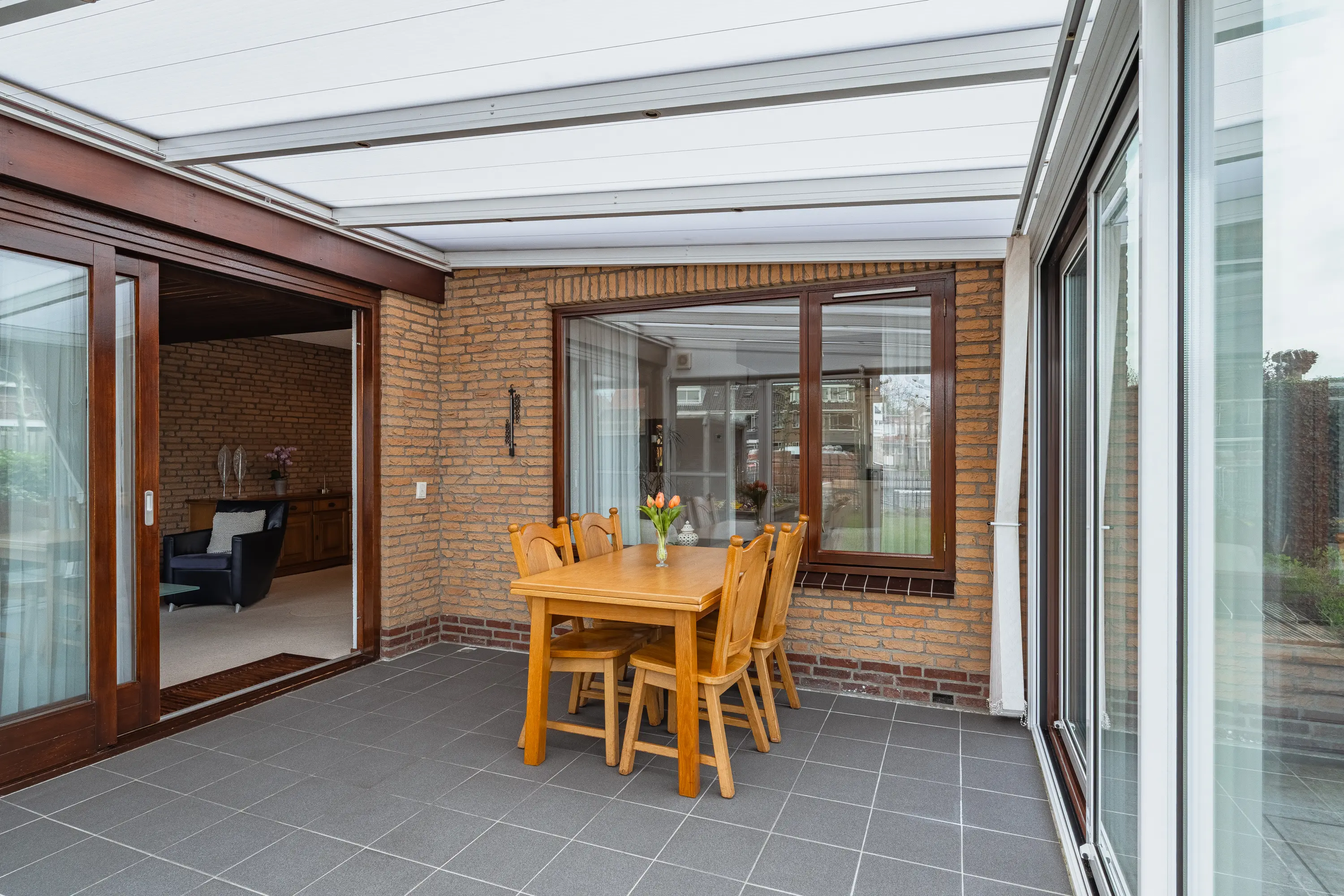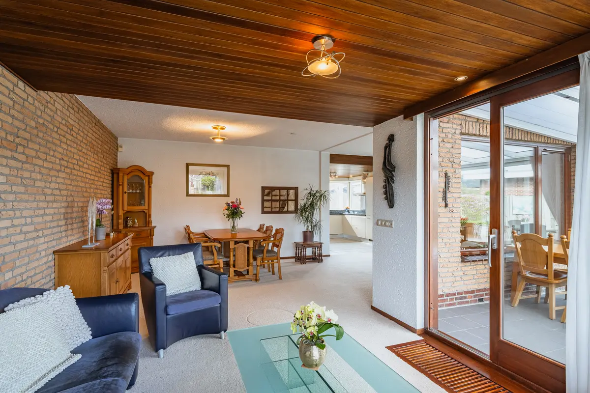 De L-vormige woonkamer voelt direct royaal aan. Grote ramen en de aangebouwde serre zorgen voor een overvloed aan daglicht. De houten schuifpui leidt naar de serre met prachtig uitzicht op de tuin, waardoor binnen en buiten naadloos in elkaar overlopen. Ideaal voor lange zomeravonden of gezellige momenten met familie en vrienden.