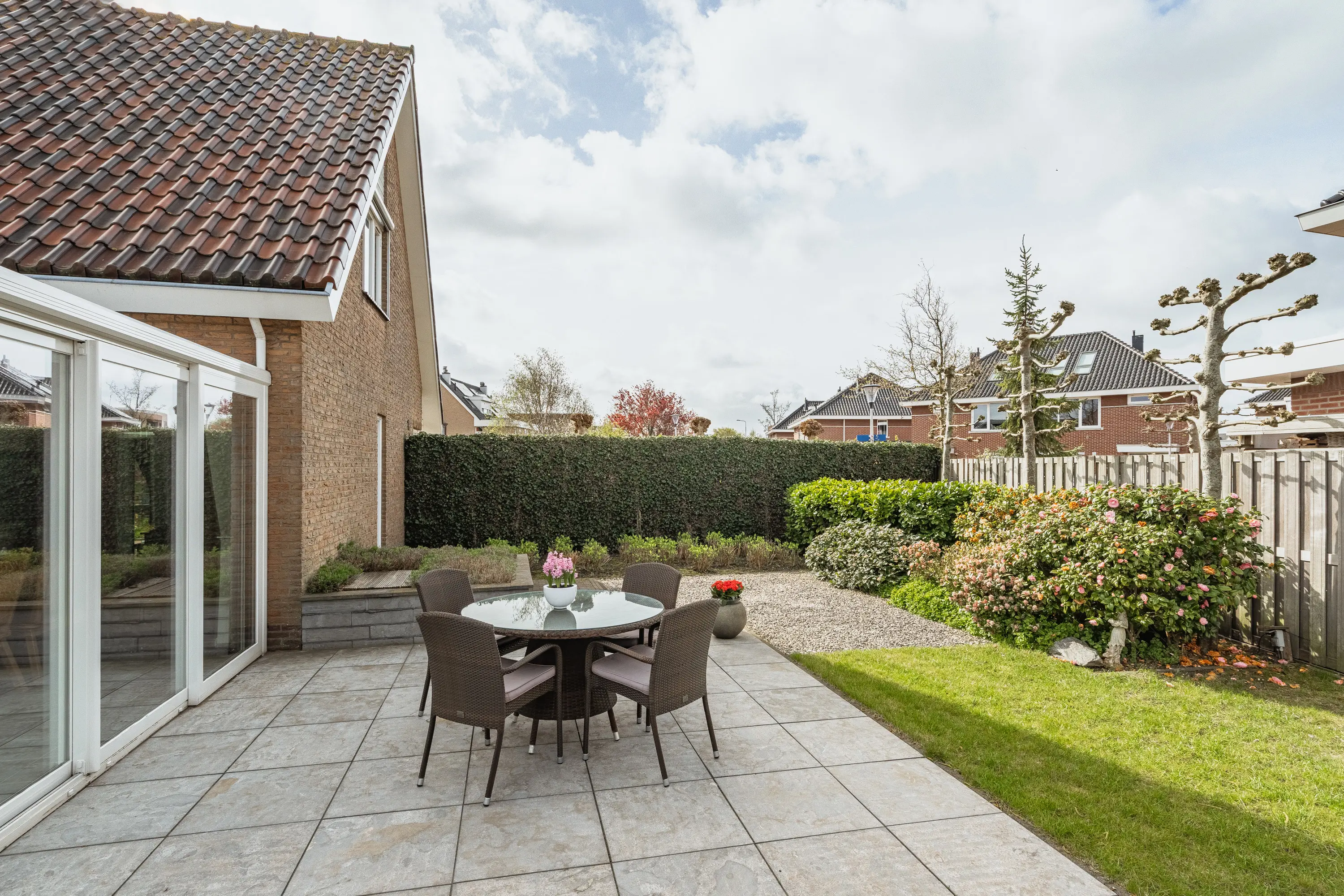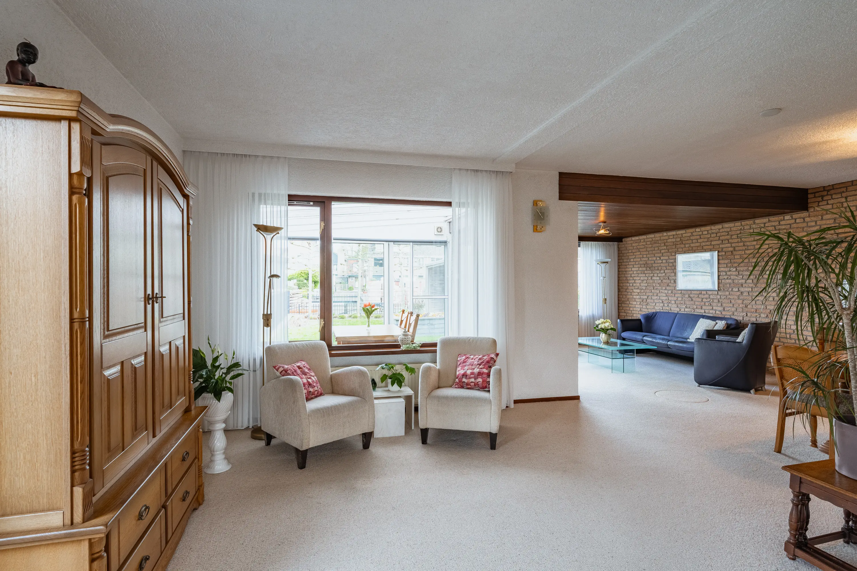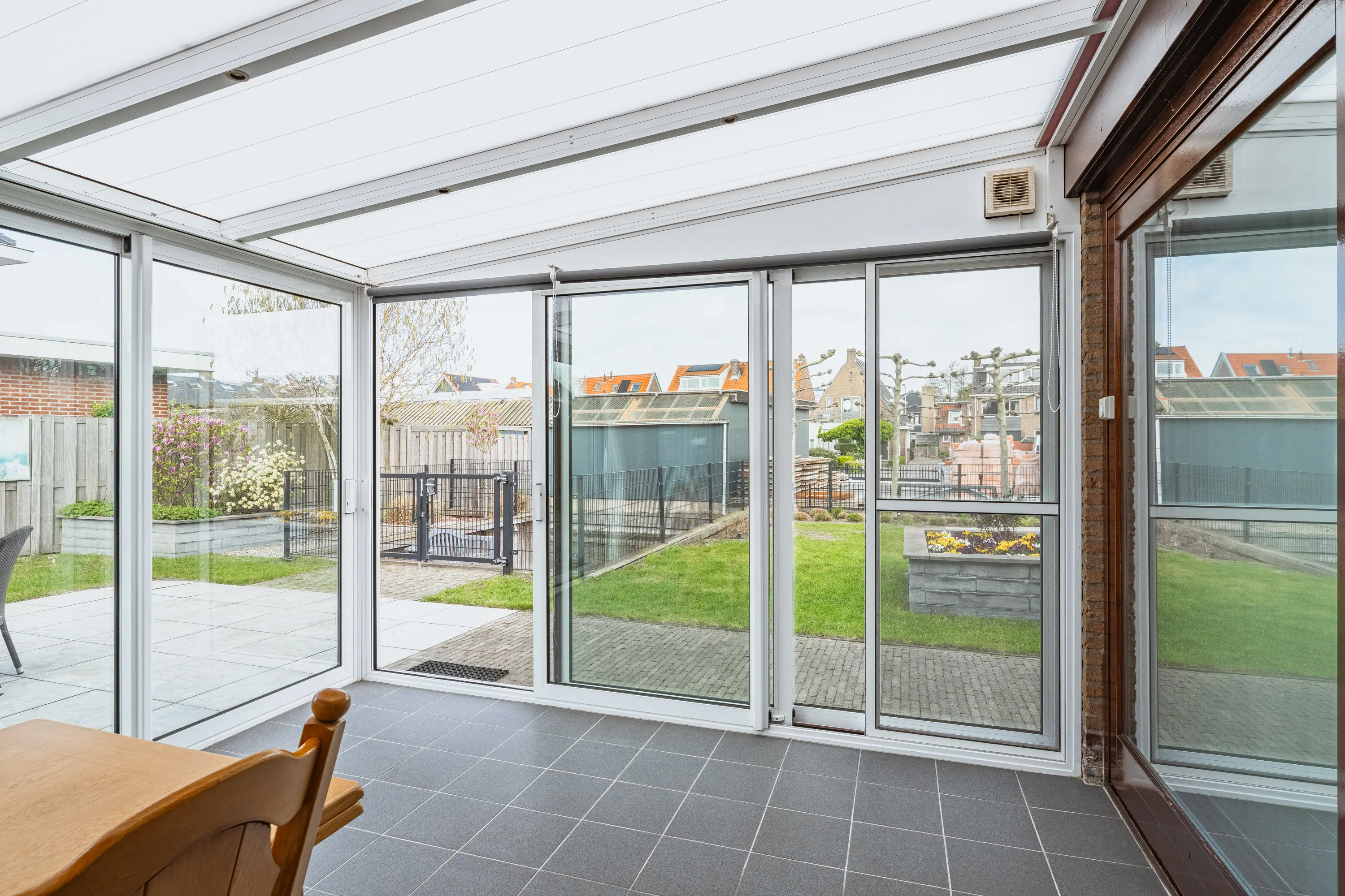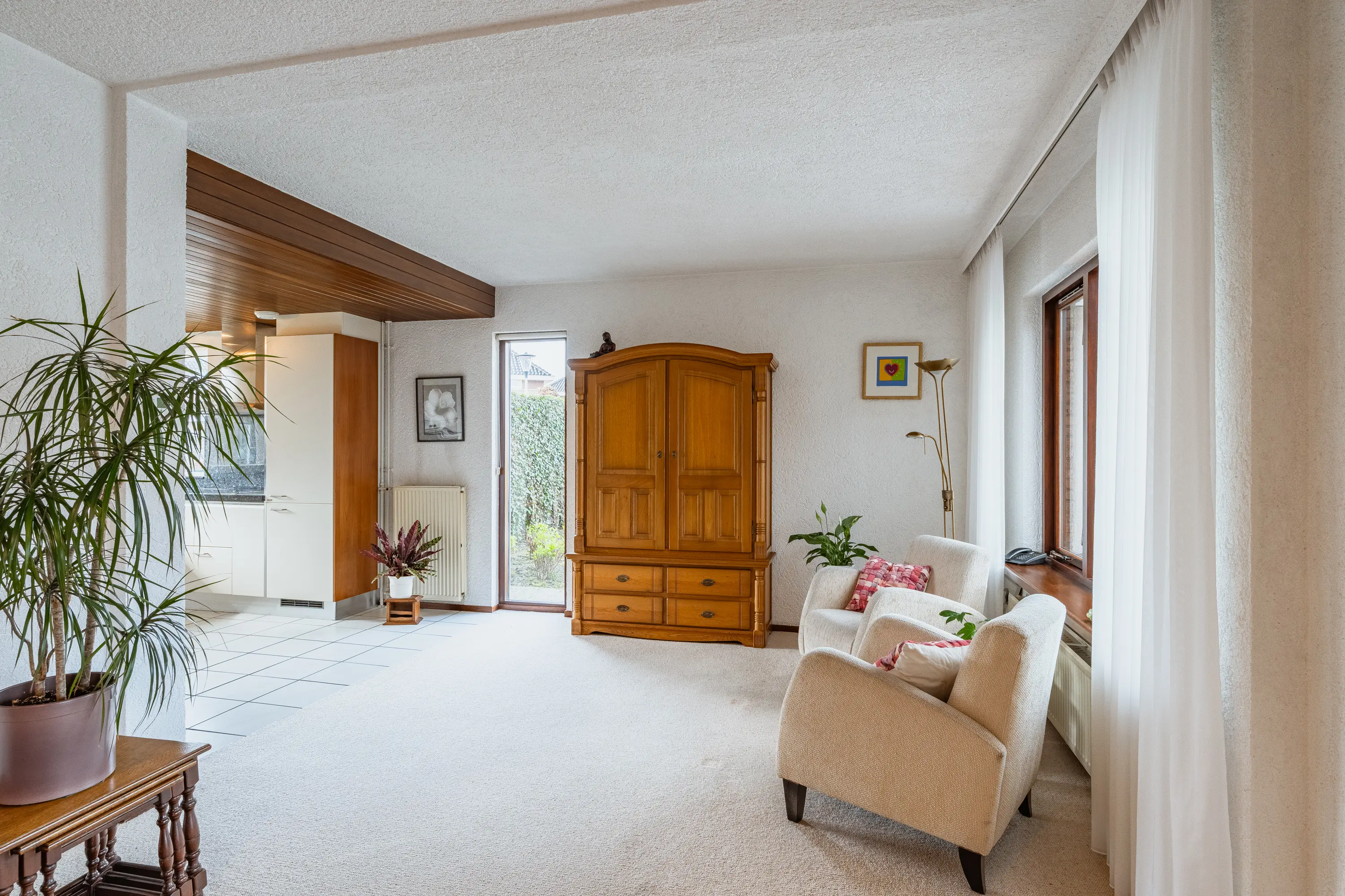 De L-vormige woonkamer voelt direct royaal aan. Grote ramen en de aangebouwde serre zorgen voor een overvloed aan daglicht. De houten schuifpui leidt naar de serre met prachtig uitzicht op de tuin, waardoor binnen en buiten naadloos in elkaar overlopen. Ideaal voor lange zomeravonden of gezellige momenten met familie en vrienden.