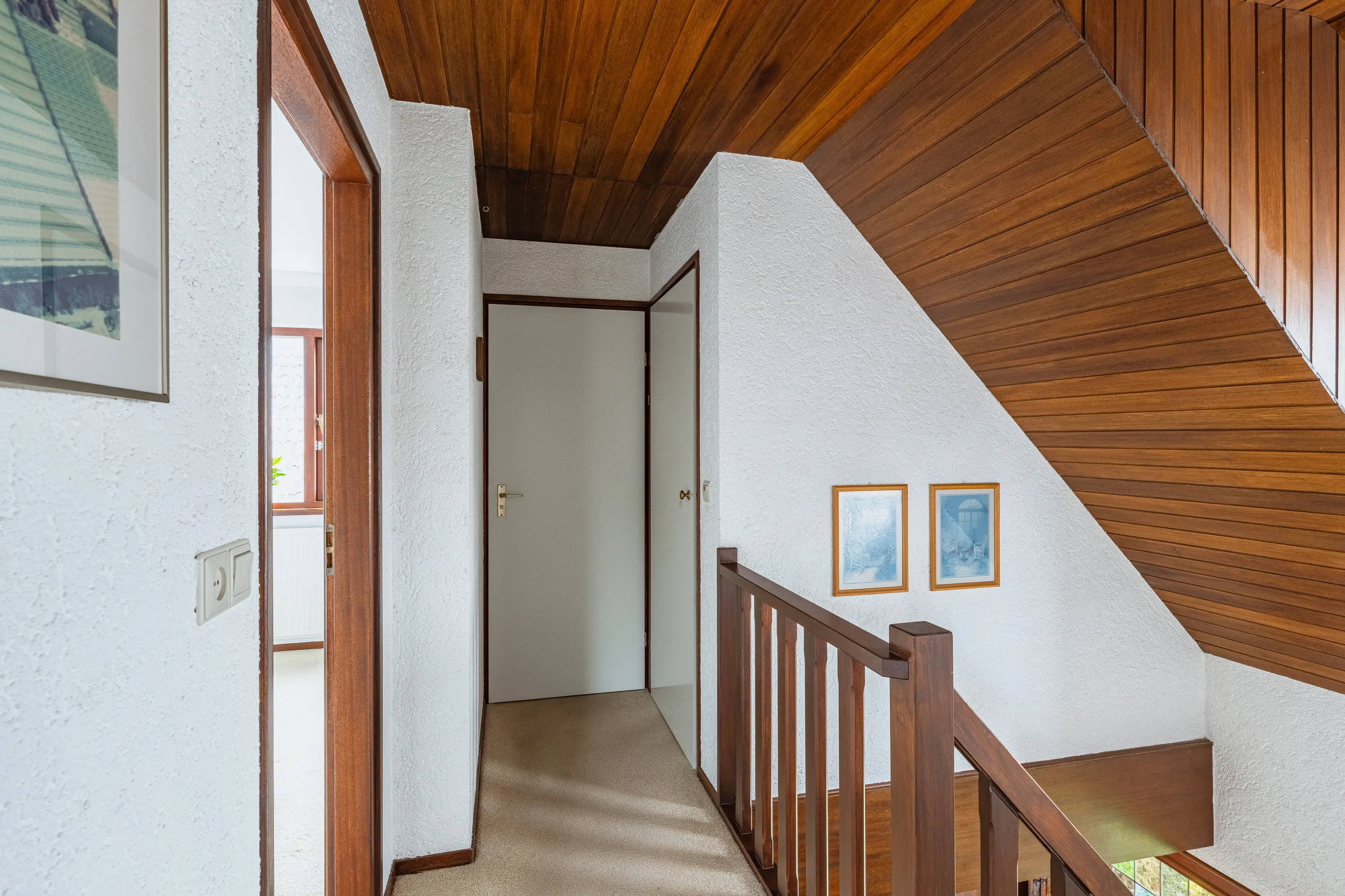 Op de verdieping bevinden zich twee ruime slaapkamers. De hoofdslaapkamer heeft een groot raam met hardhouten kozijnen en een te openen raam voor frisse lucht. De tweede slaapkamer is eveneens ruim en voorzien van een screen aan de buitenzijde van het kozijn.