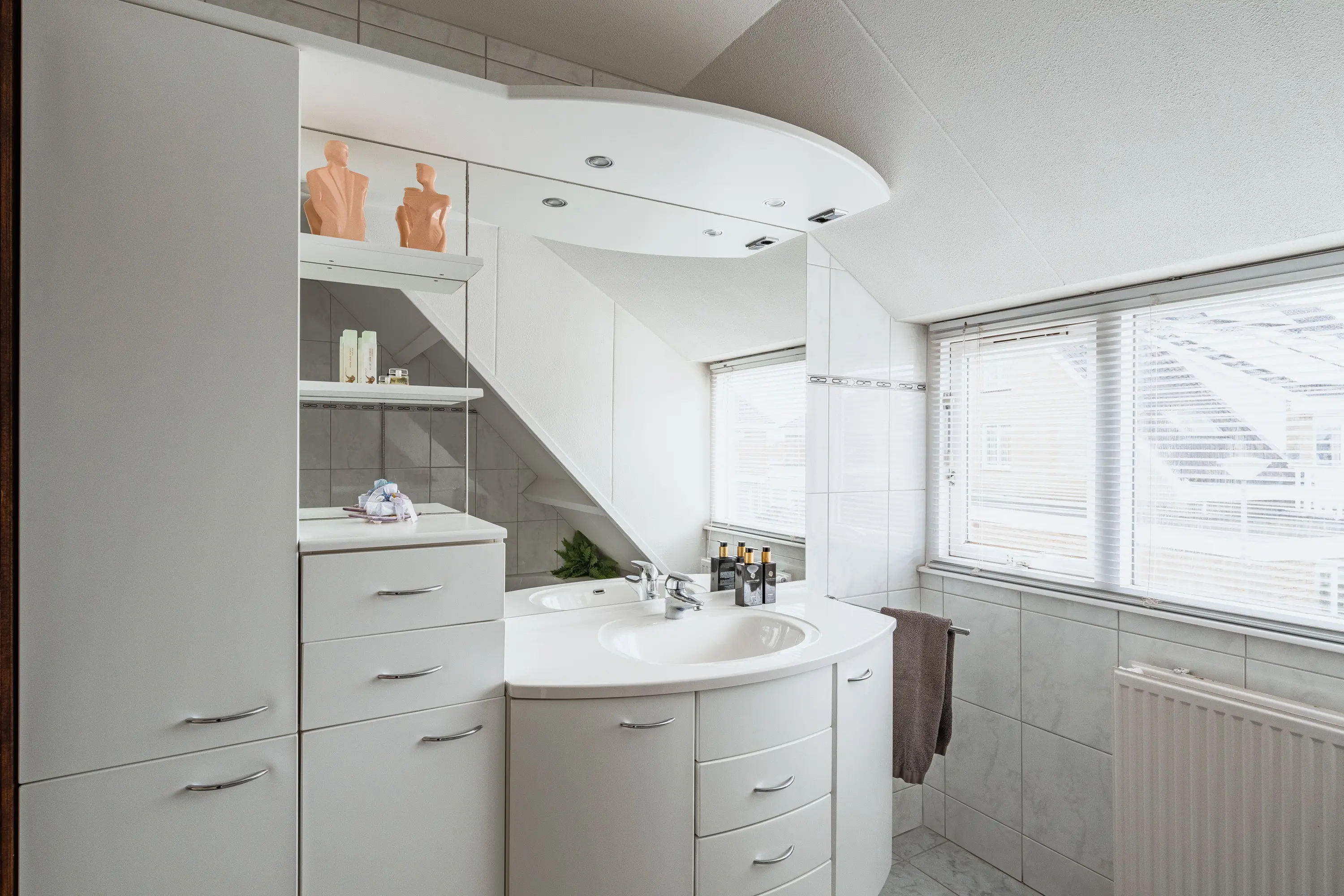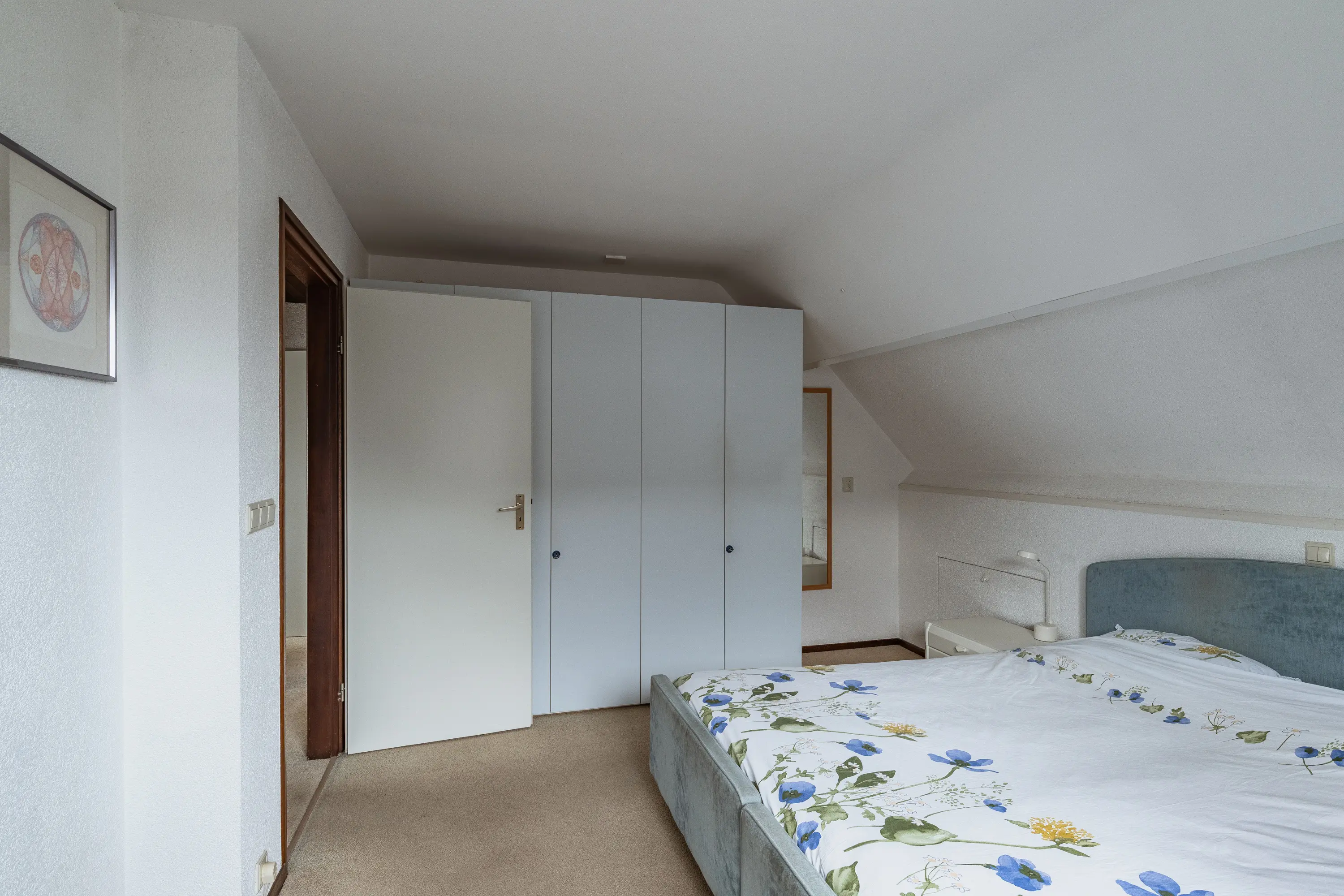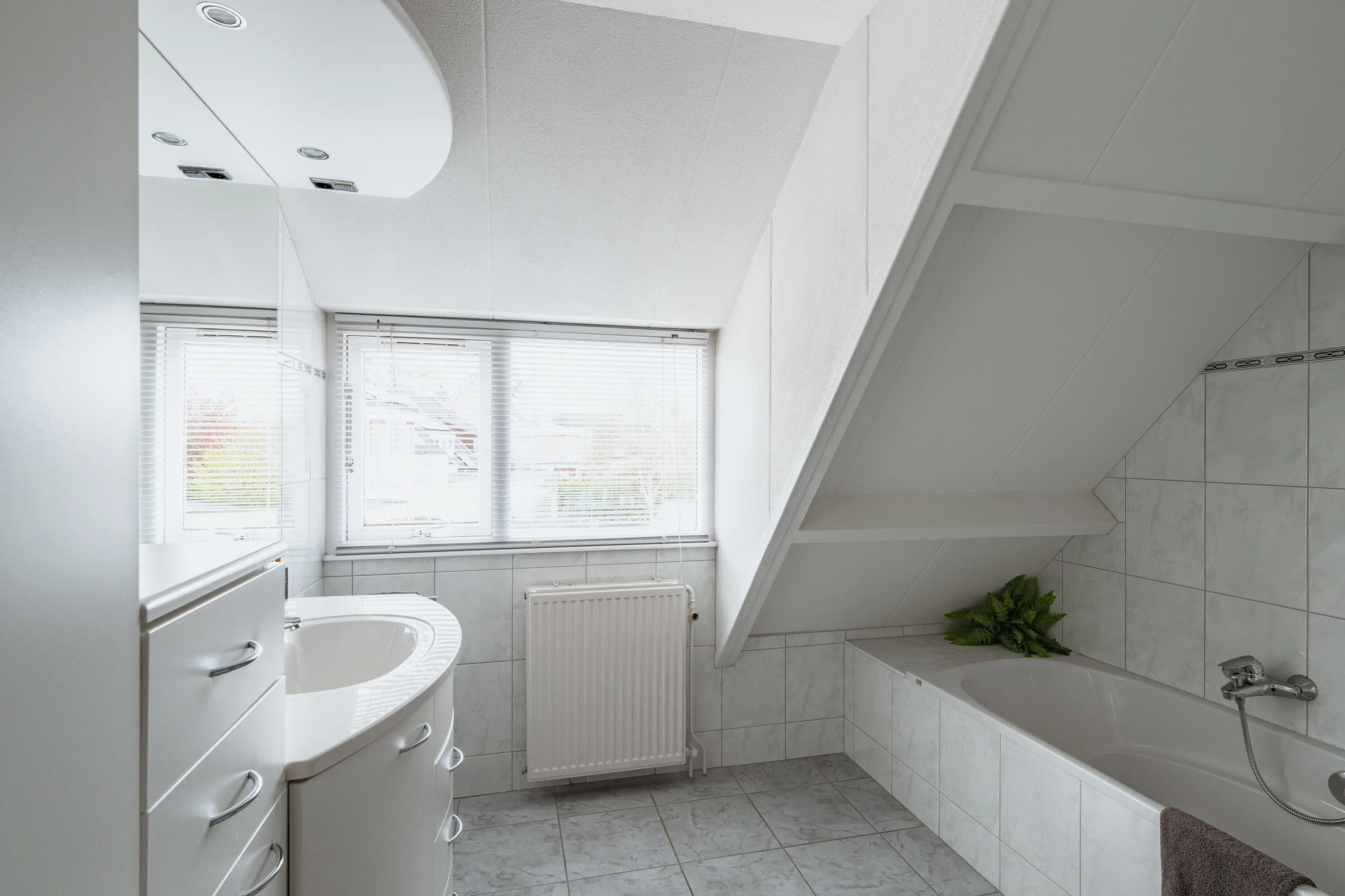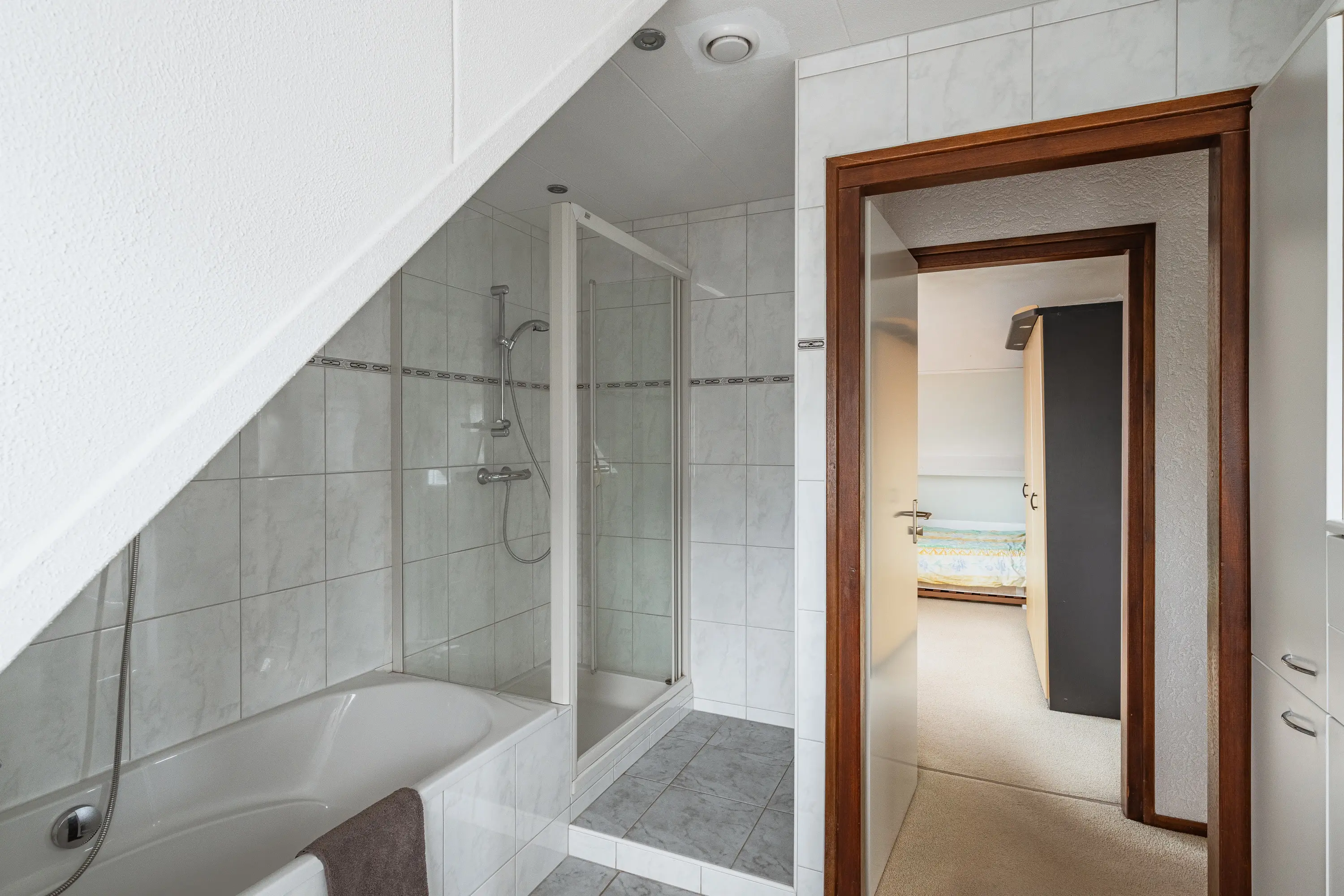 De badkamer is volledig betegeld en uitgerust met een ligbad, douchecabine, wastafelmeubel en mechanische ventilatie. Daarnaast is er op de verdieping een separate toiletruimte. Dankzij de vide en de ruime overloop is er bovendien de mogelijkheid om een derde slaapkamer te creëren. Via de overloop is de vliering te bereiken.