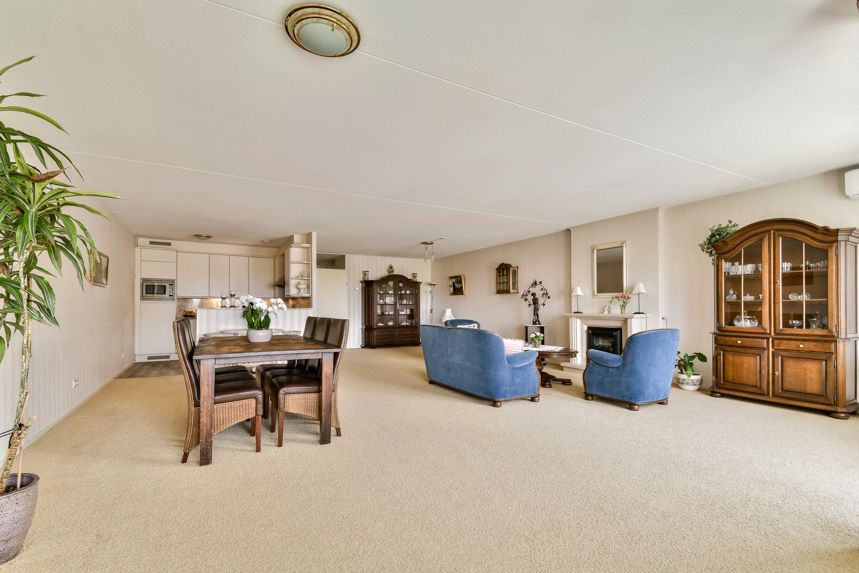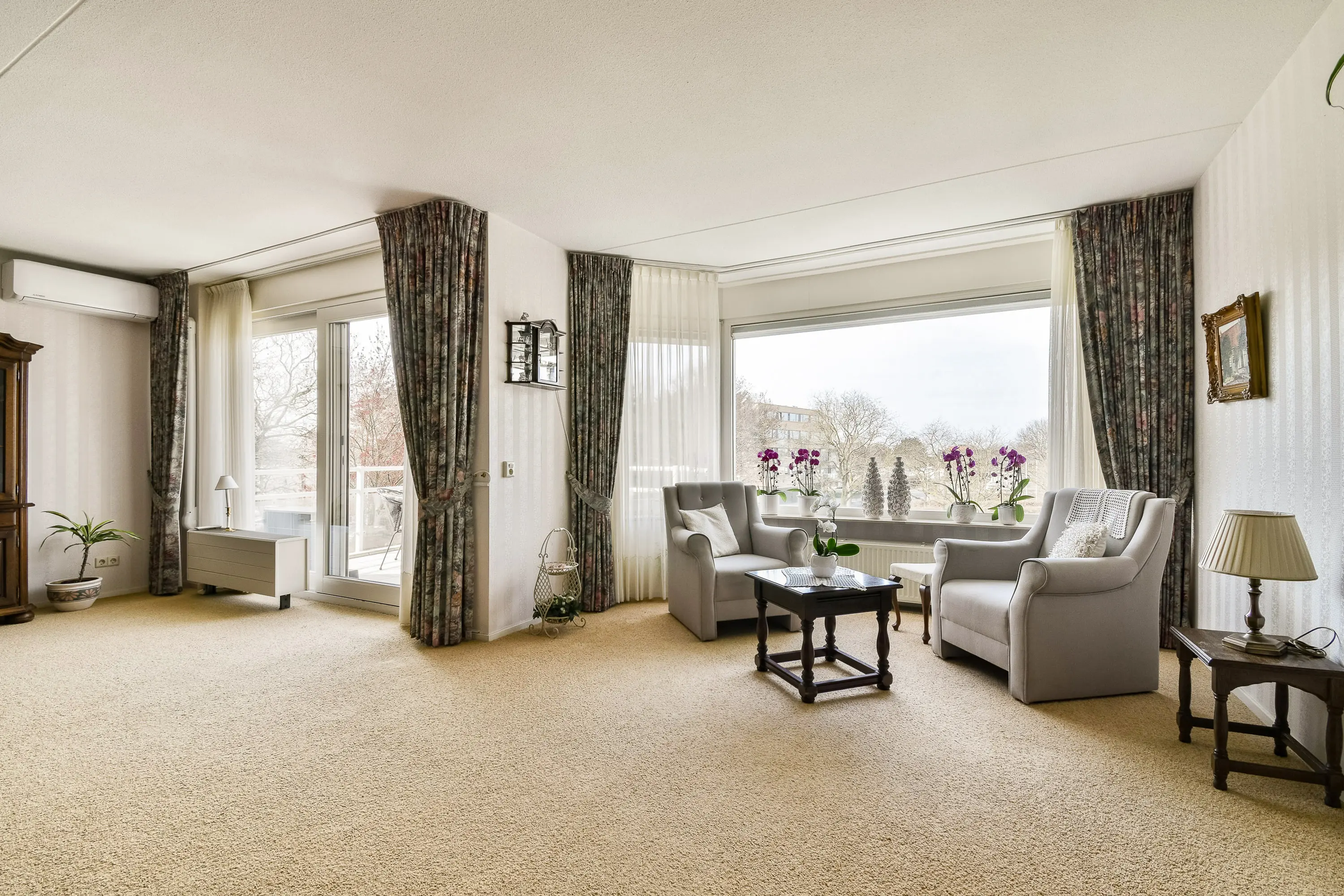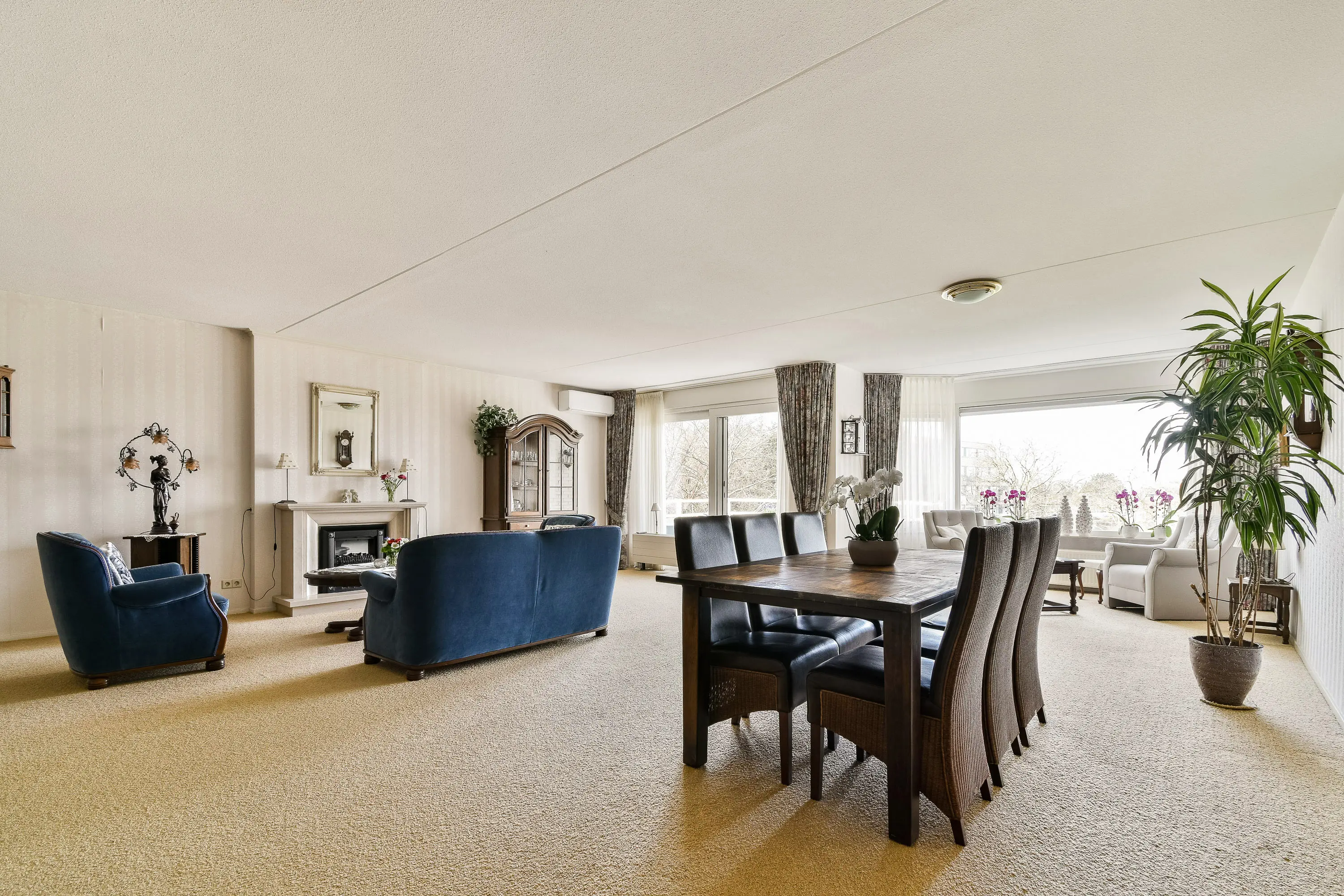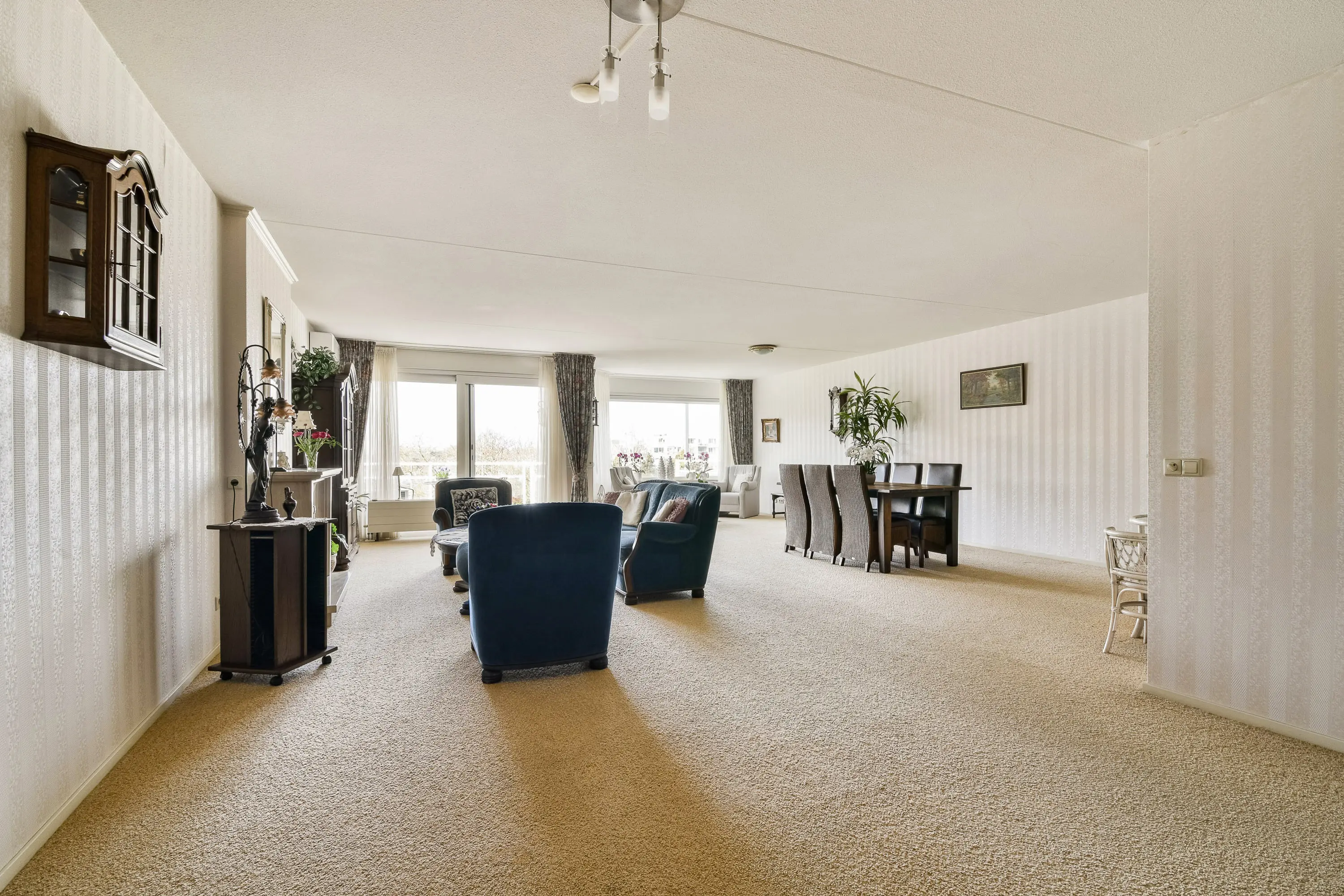 De gang leidt u naar de royale woonkamer, welke volledig is voorzien van tapijt, die zich kenmerkt door de ruime afmetingen en prettige indeling. Dankzij de grote raampartijen valt er een overvloed aan natuurlijk daglicht naar binnen. De woonkamer biedt meer dan voldoende ruimte voor zowel een comfortabele zithoek als een ruime eethoek, waardoor het een ideale plek is om te ontspannen of gasten te ontvangen. In de woonkamer is een airco aanwezig, wat bijdraagt aan extra comfort.
