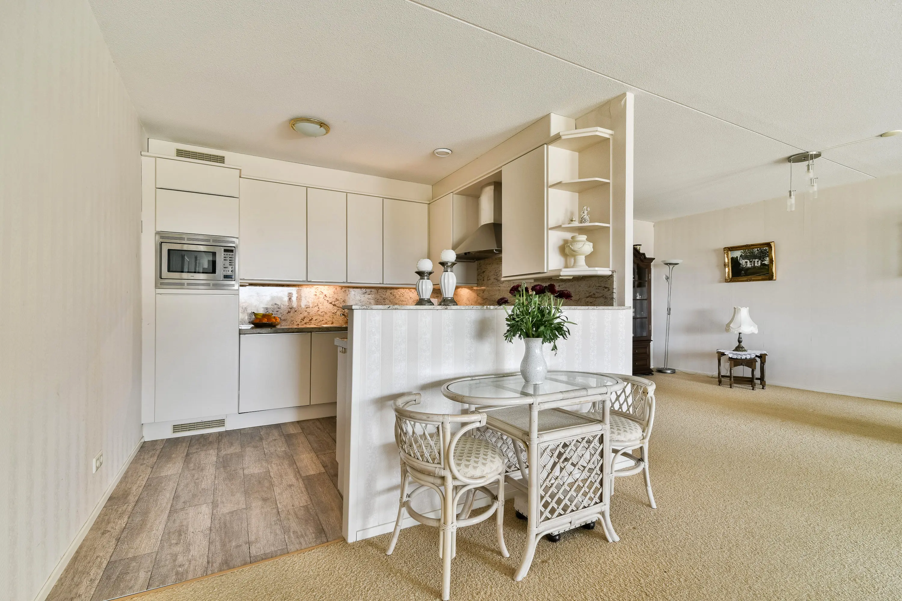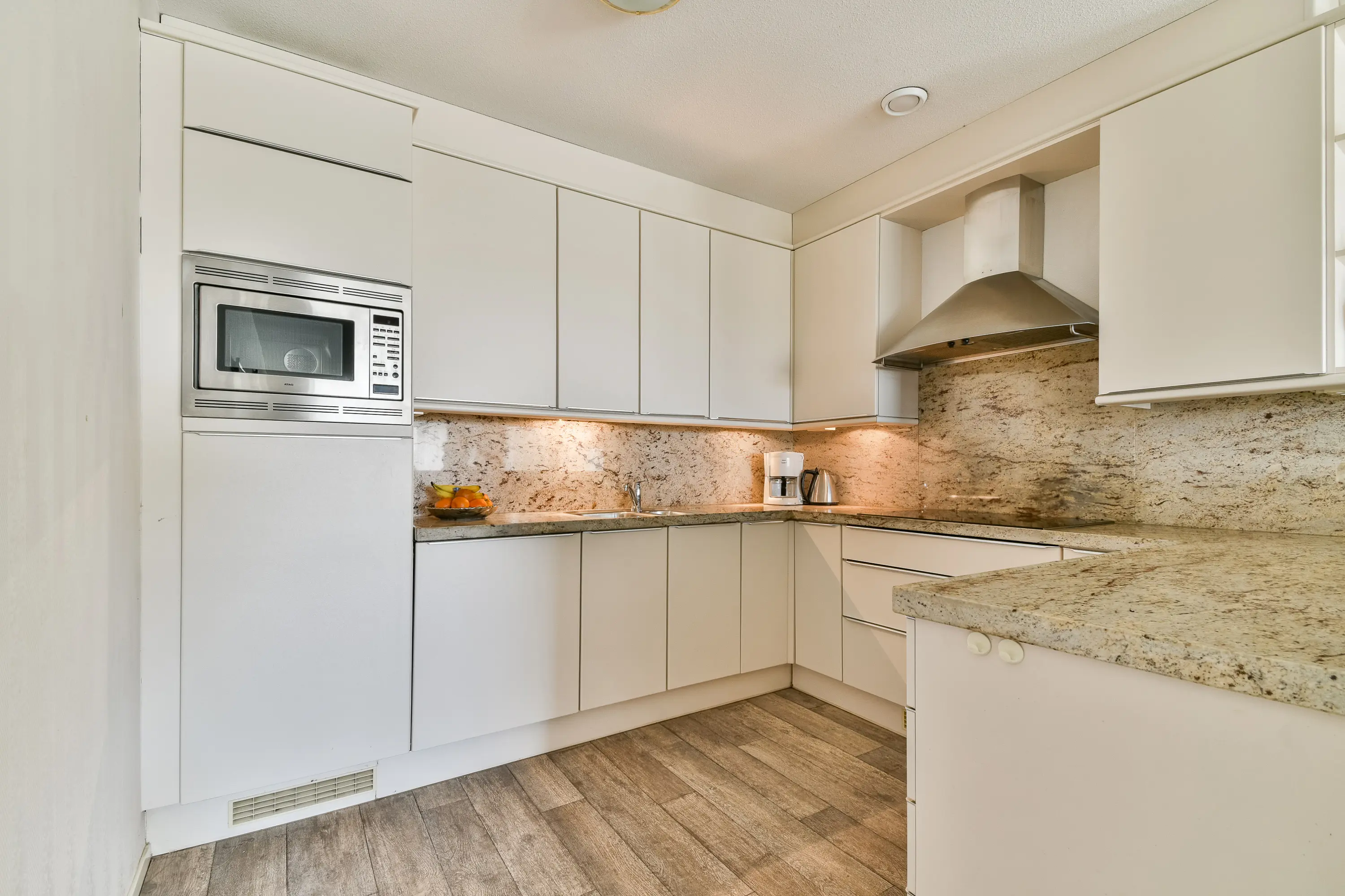 De open keuken is praktisch ingericht en voorzien van diverse inbouwapparatuur, waaronder een vaatwasser (2023), inductiekookplaat (2019), koelkast en magnetron. De keuken is afgewerkt met een vinyl vloer.
