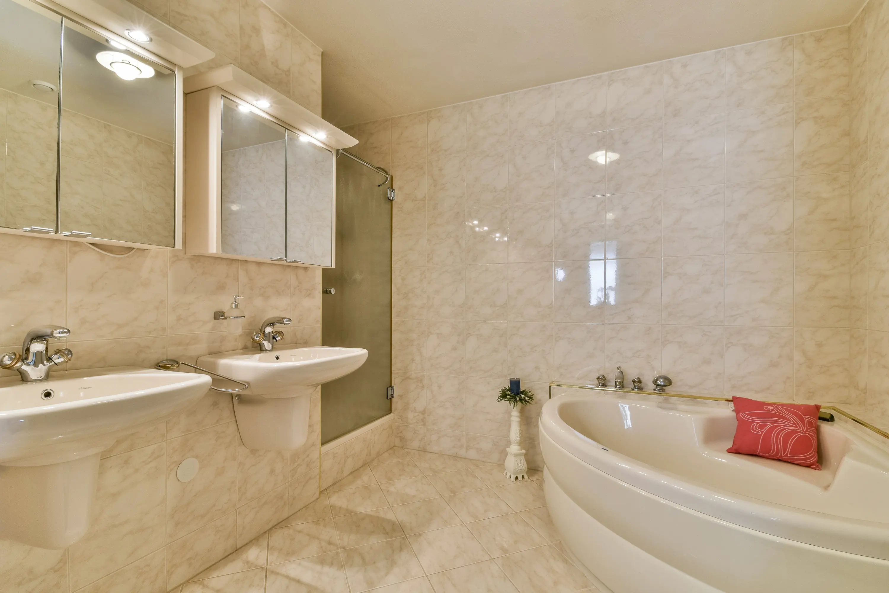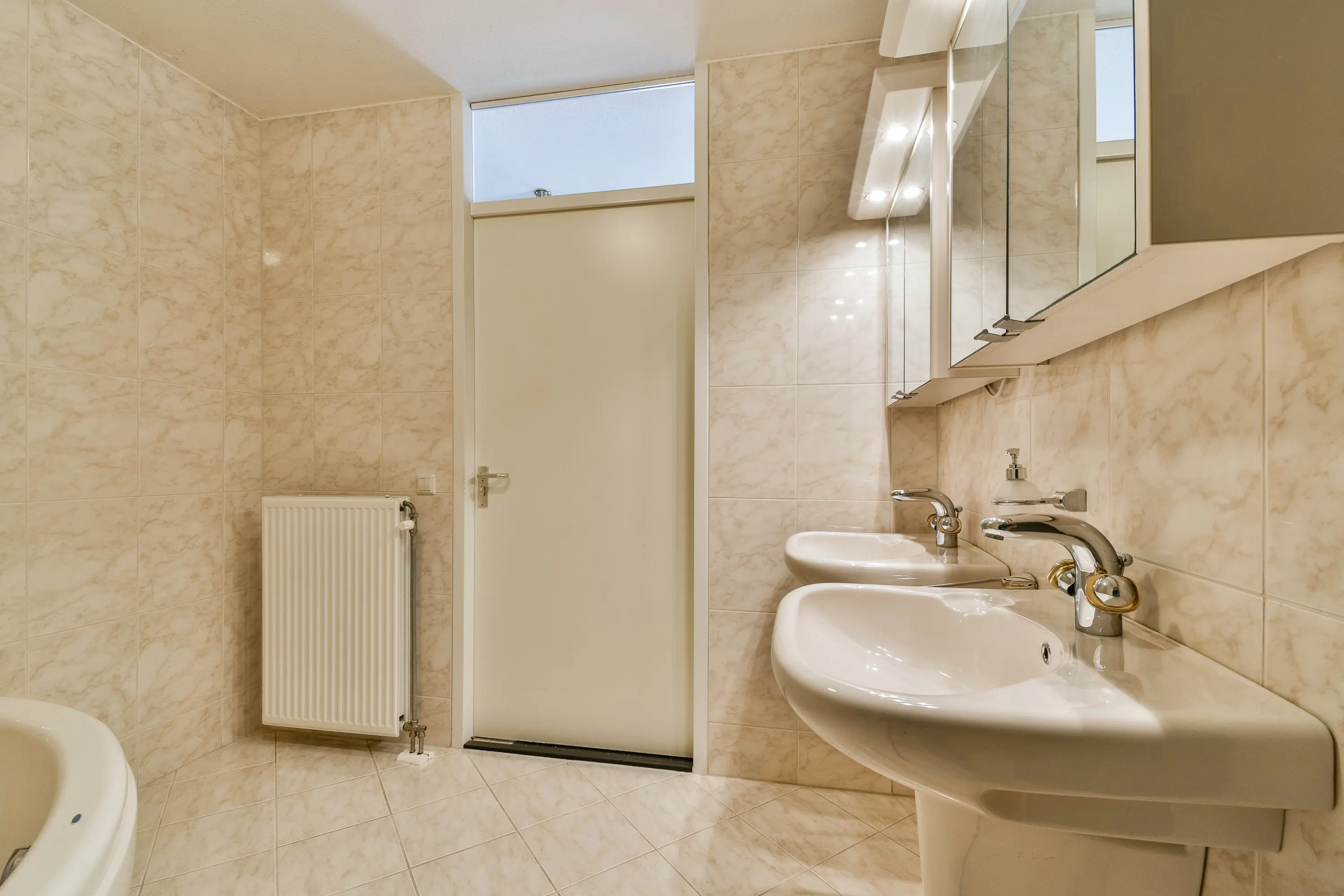 De volledig betegelde badkamer is opvallend ruim opgezet en stijlvol afgewerkt. De ruimte is praktisch ingedeeld en voorzien van een dubbele wastafel met voldoende opbergruimte, ideaal voor dagelijks gebruik. Daarnaast beschikt de badkamer over een heerlijk tweepersoons 'whirlpool' bad van het merk Cleopatra en een aparte douche met thermostaatkraan.