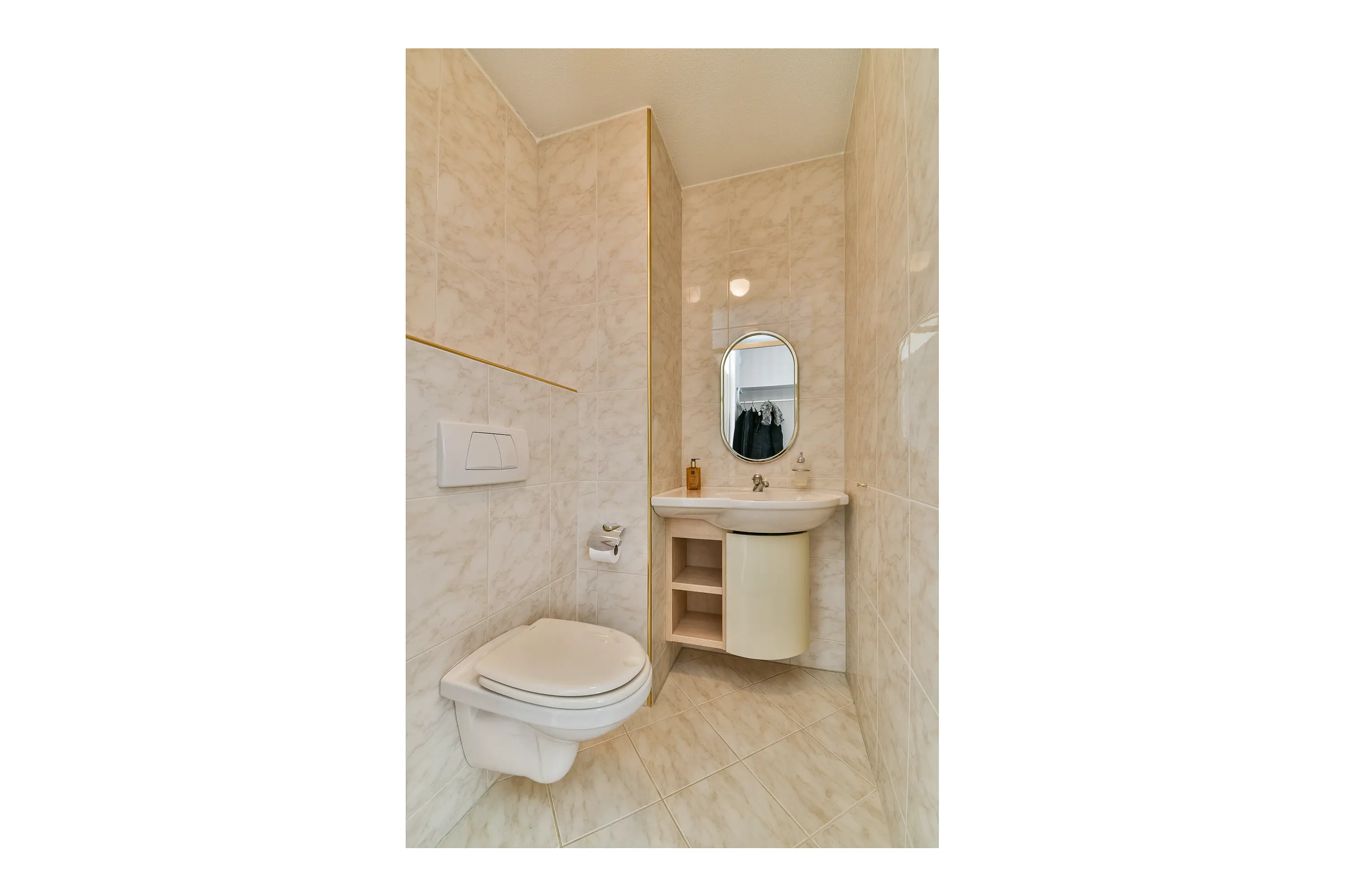 In de ruimte naast de badkamer bevindt zich het separate toilet, dat eveneens volledig is betegeld en in dezelfde stijl als de badkamer is uitgevoerd.