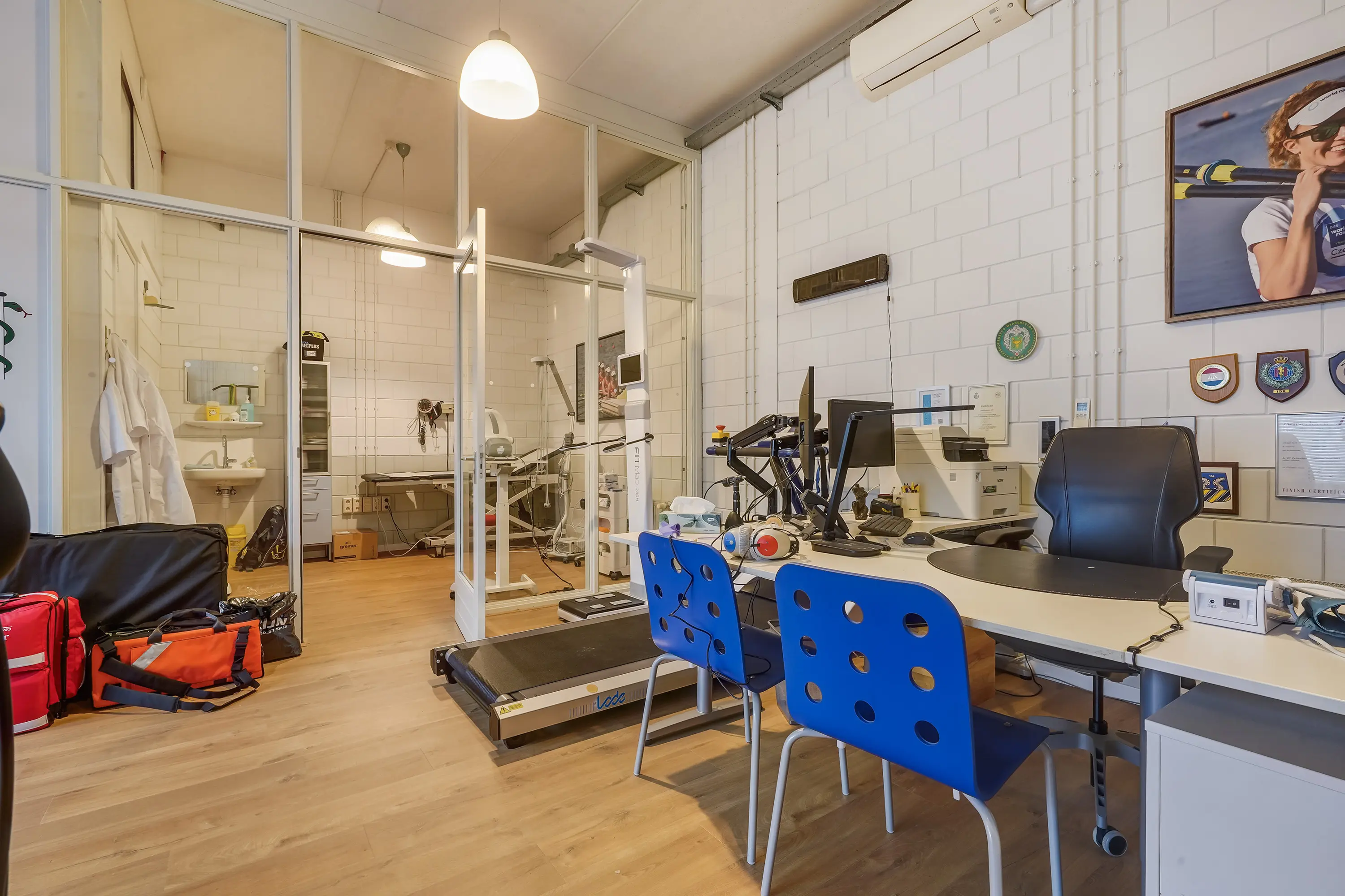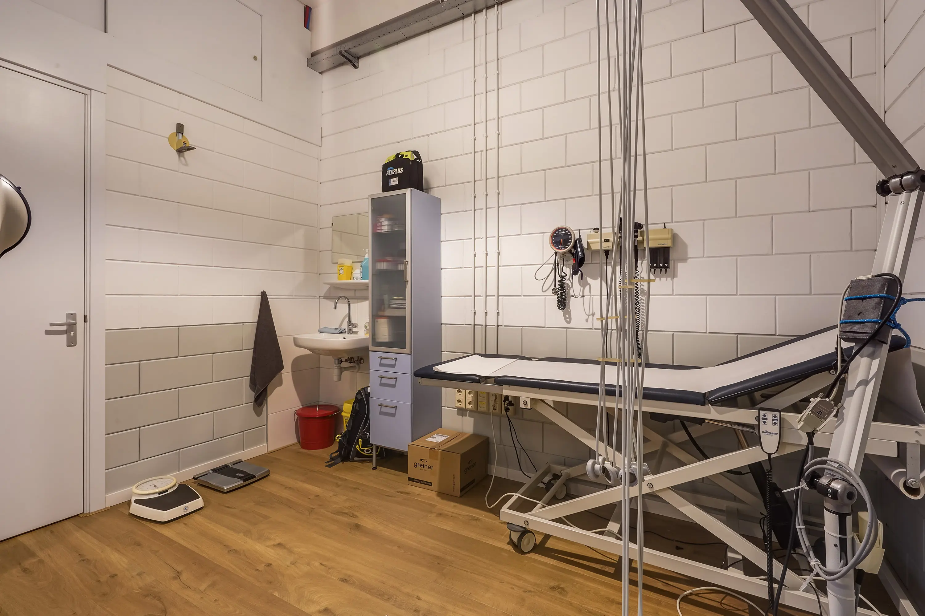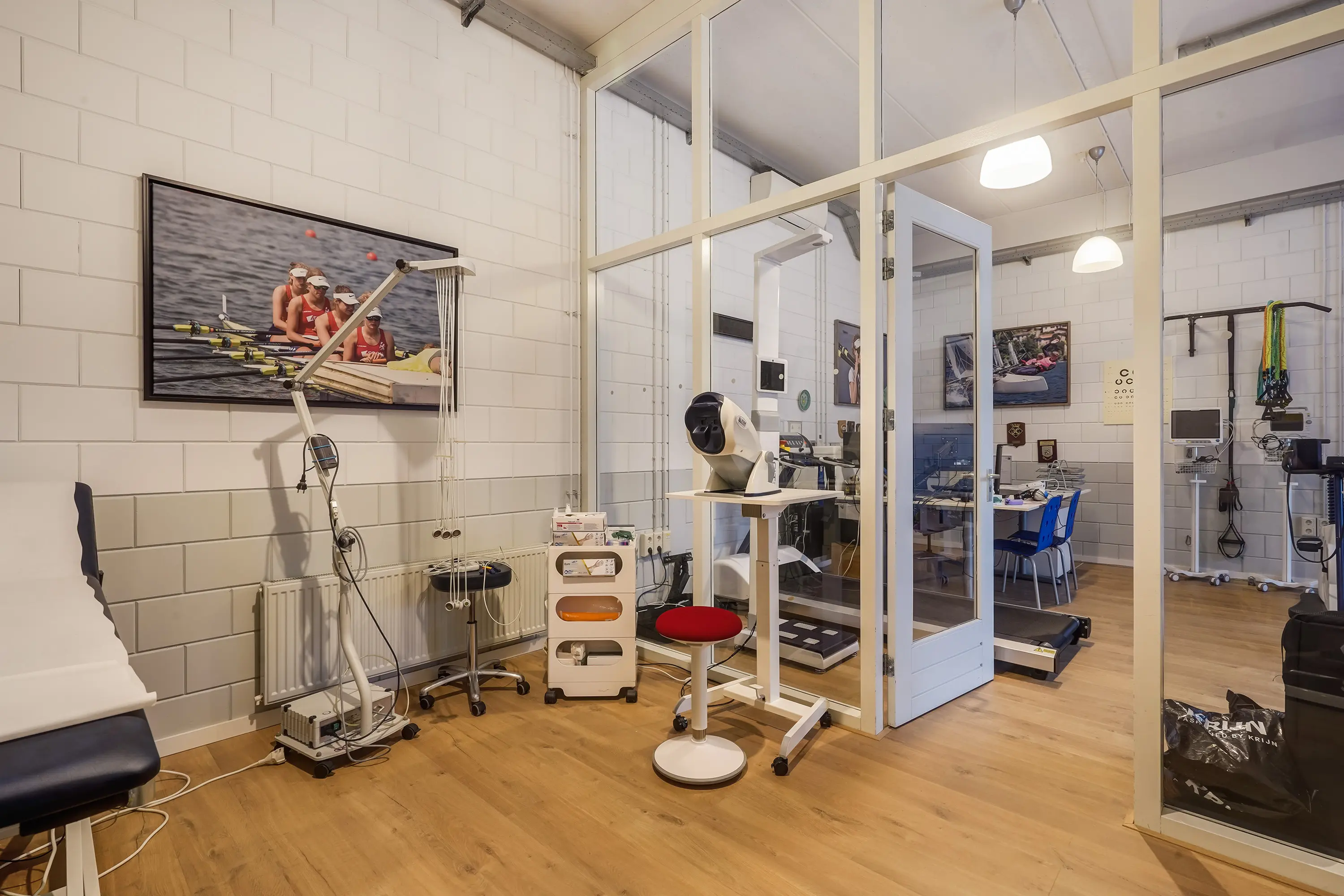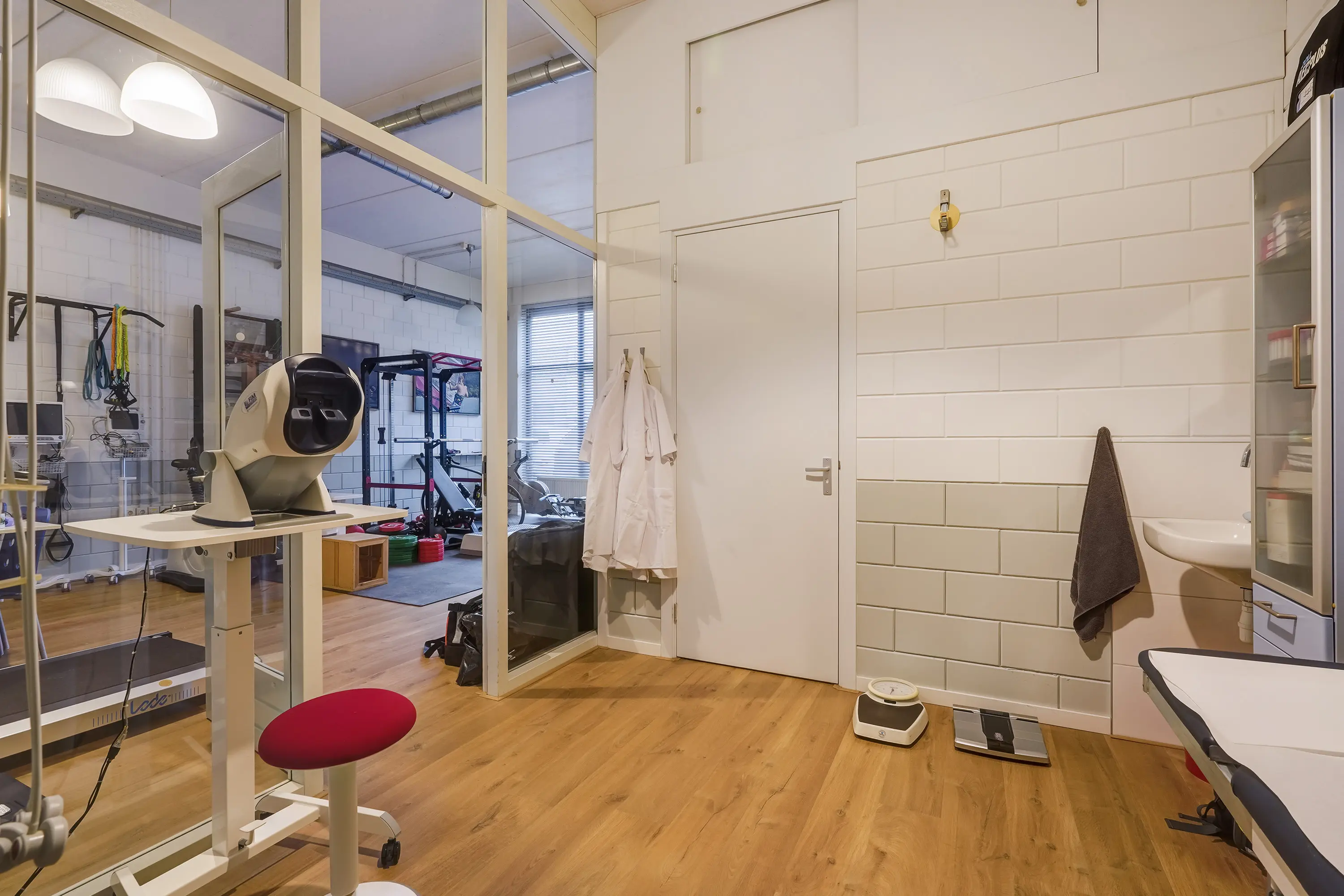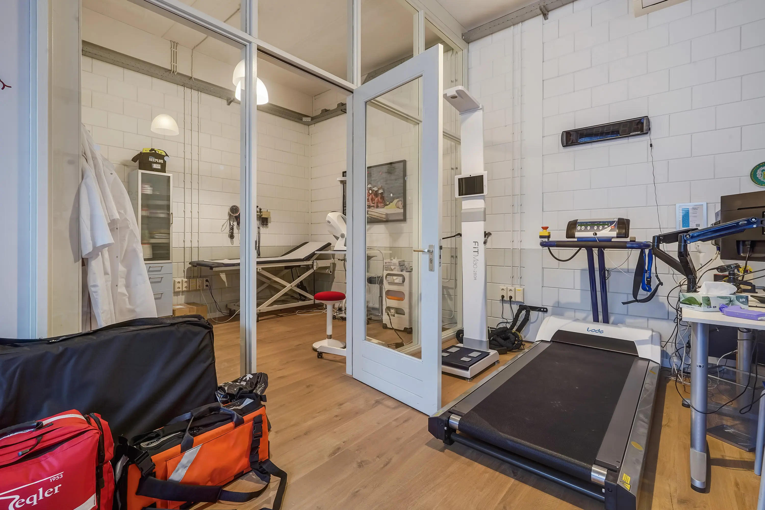 Open ruimte, thans ingericht als keuringsruimte. Achterin een onderzoeksruimte met wastafel van ca. 11 m2 met aangrenzende ruimte, geschikt als omkleedruimte, waar zich een douche en wastafel bevinden. Zowel de open ruimte als onderzoeksruimte zijn voorzien van airconditioning.