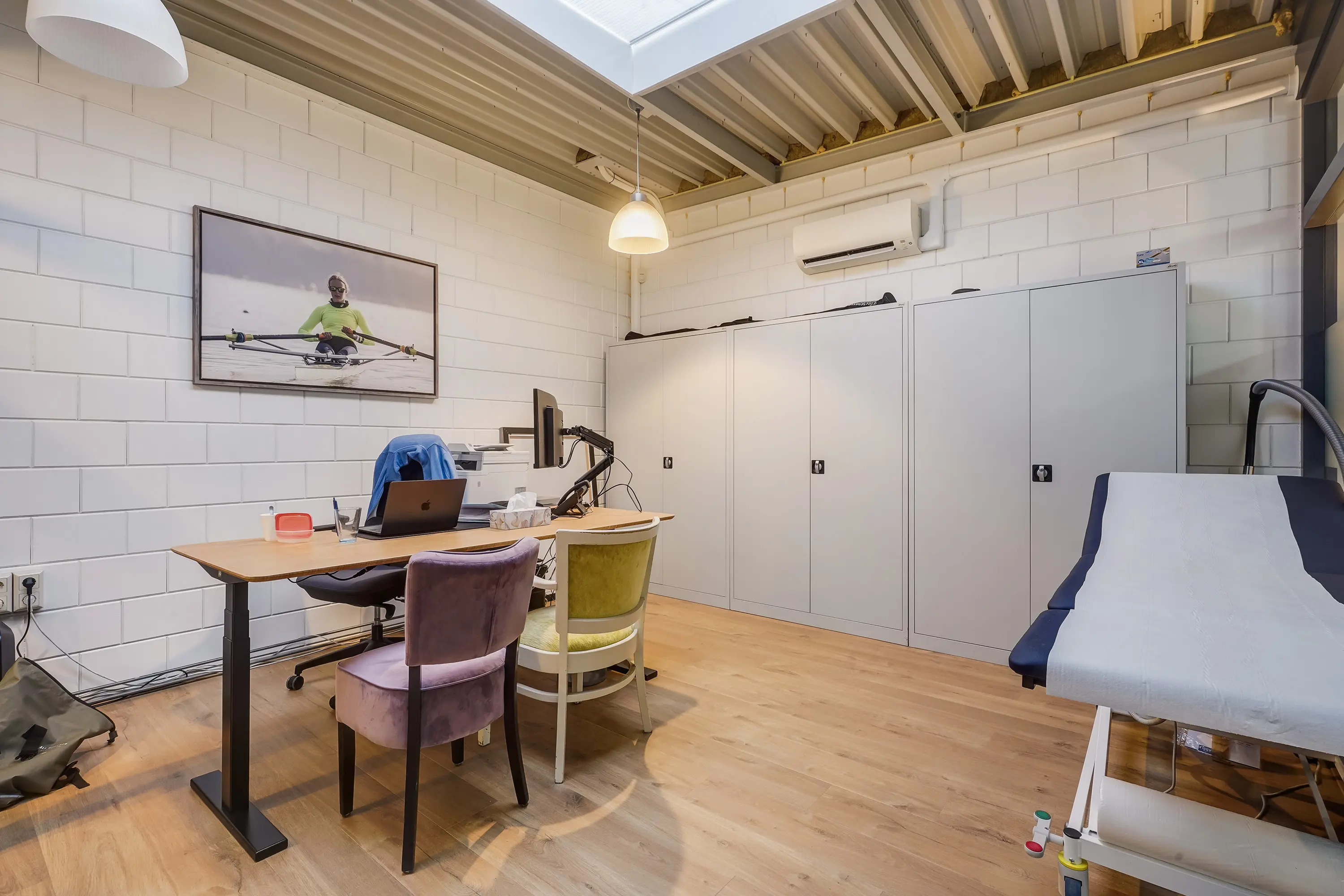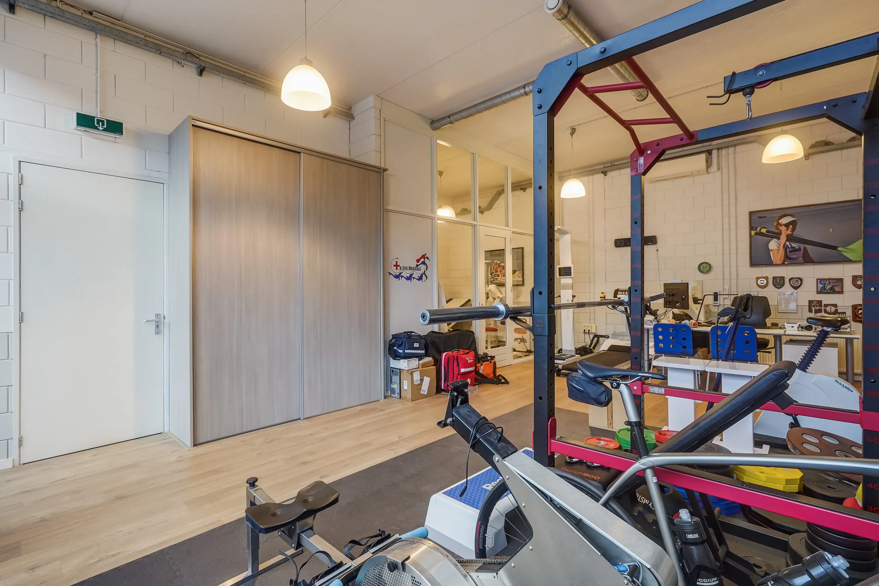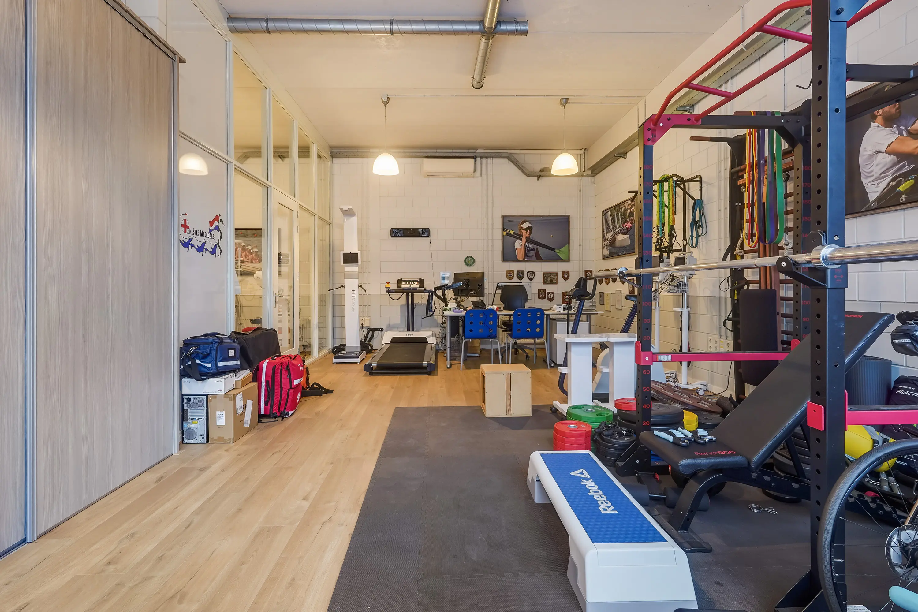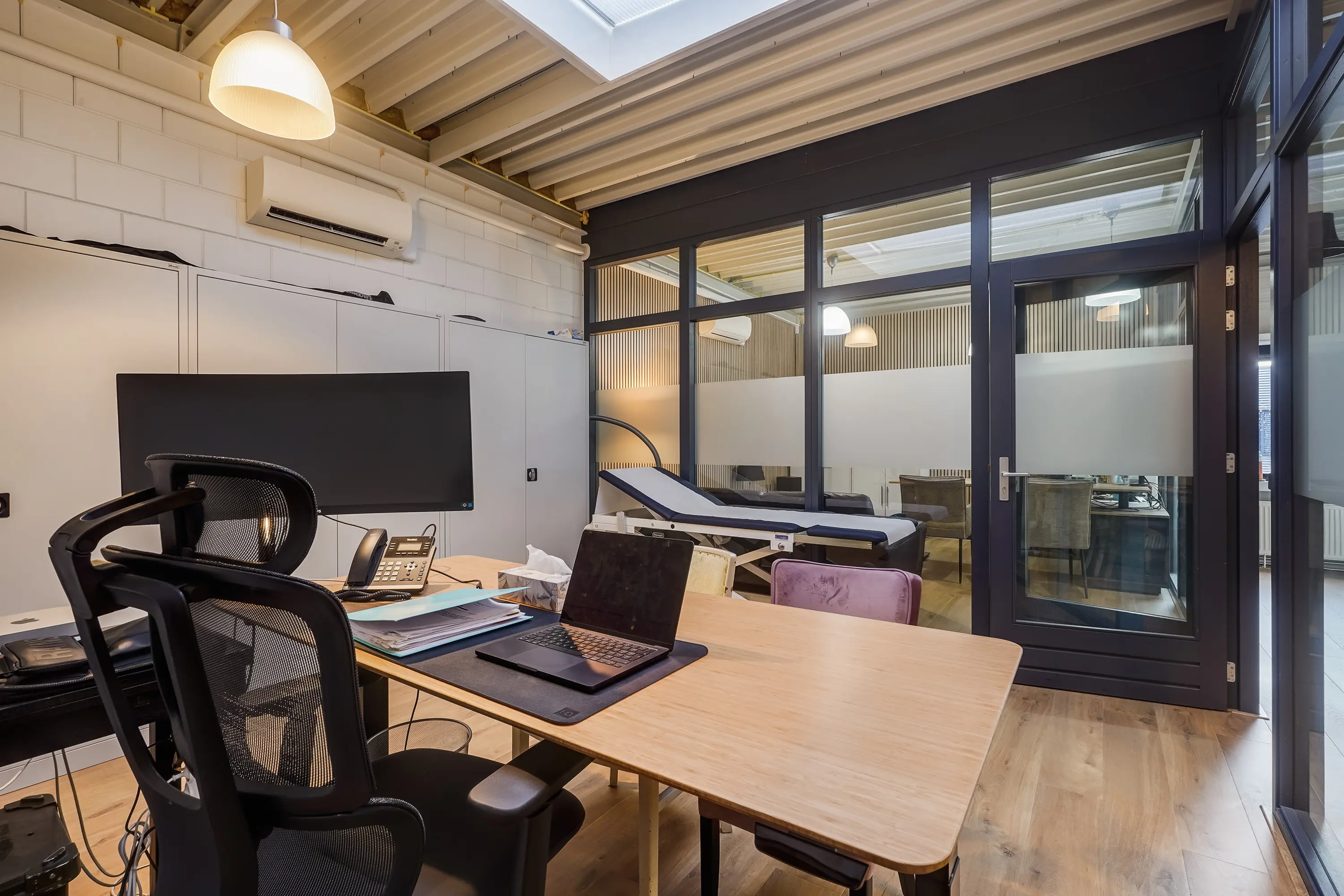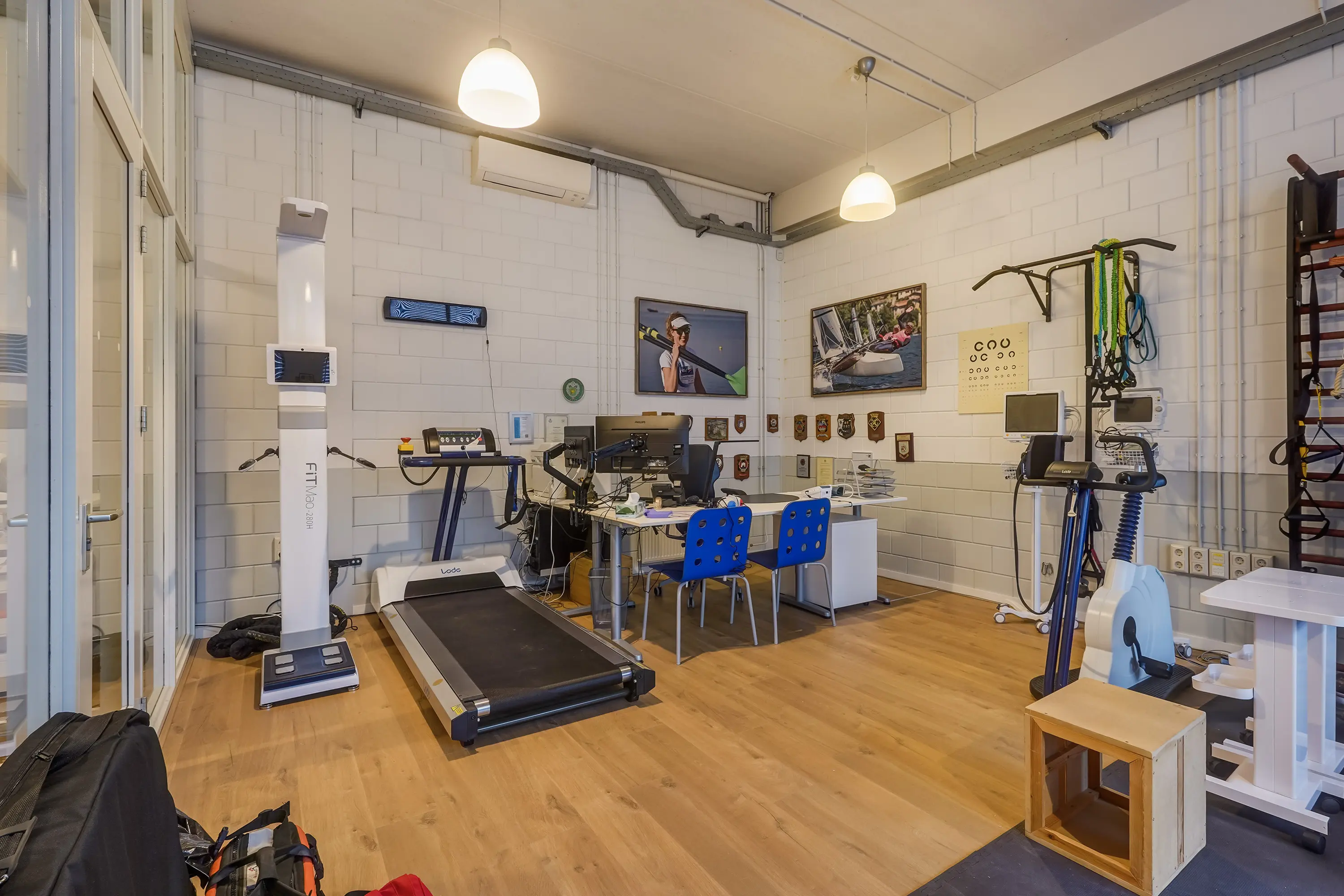 Open ruimte, thans ingericht als keuringsruimte. Achterin een onderzoeksruimte met wastafel van ca. 11 m2 met aangrenzende ruimte, geschikt als omkleedruimte, waar zich een douche en wastafel bevinden. Zowel de open ruimte als onderzoeksruimte zijn voorzien van airconditioning.