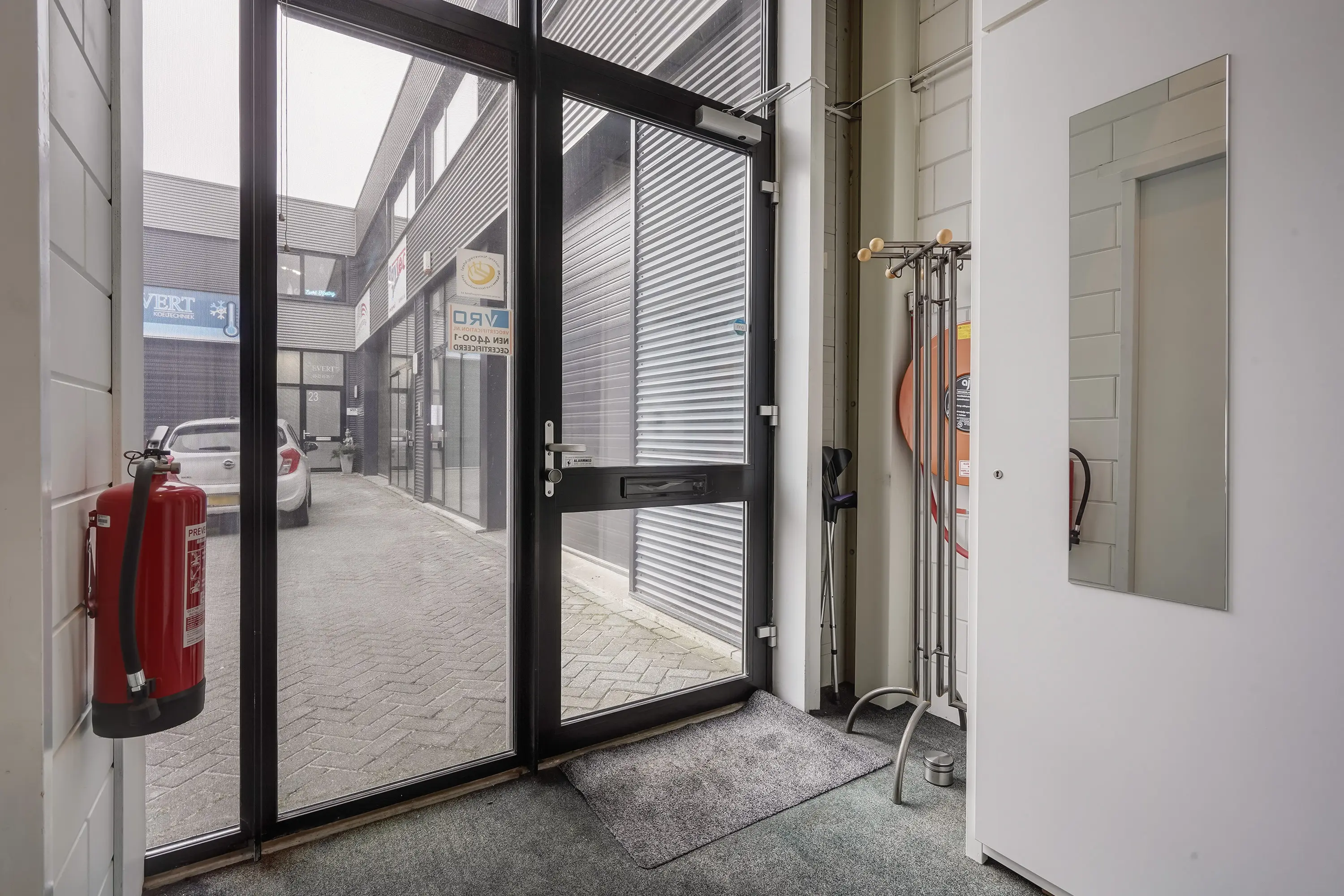 Entree in hal met toiletruimte, trapopgang naar de verdieping en toegangsdeur naar de bedrijfsruimte op de begane grond.