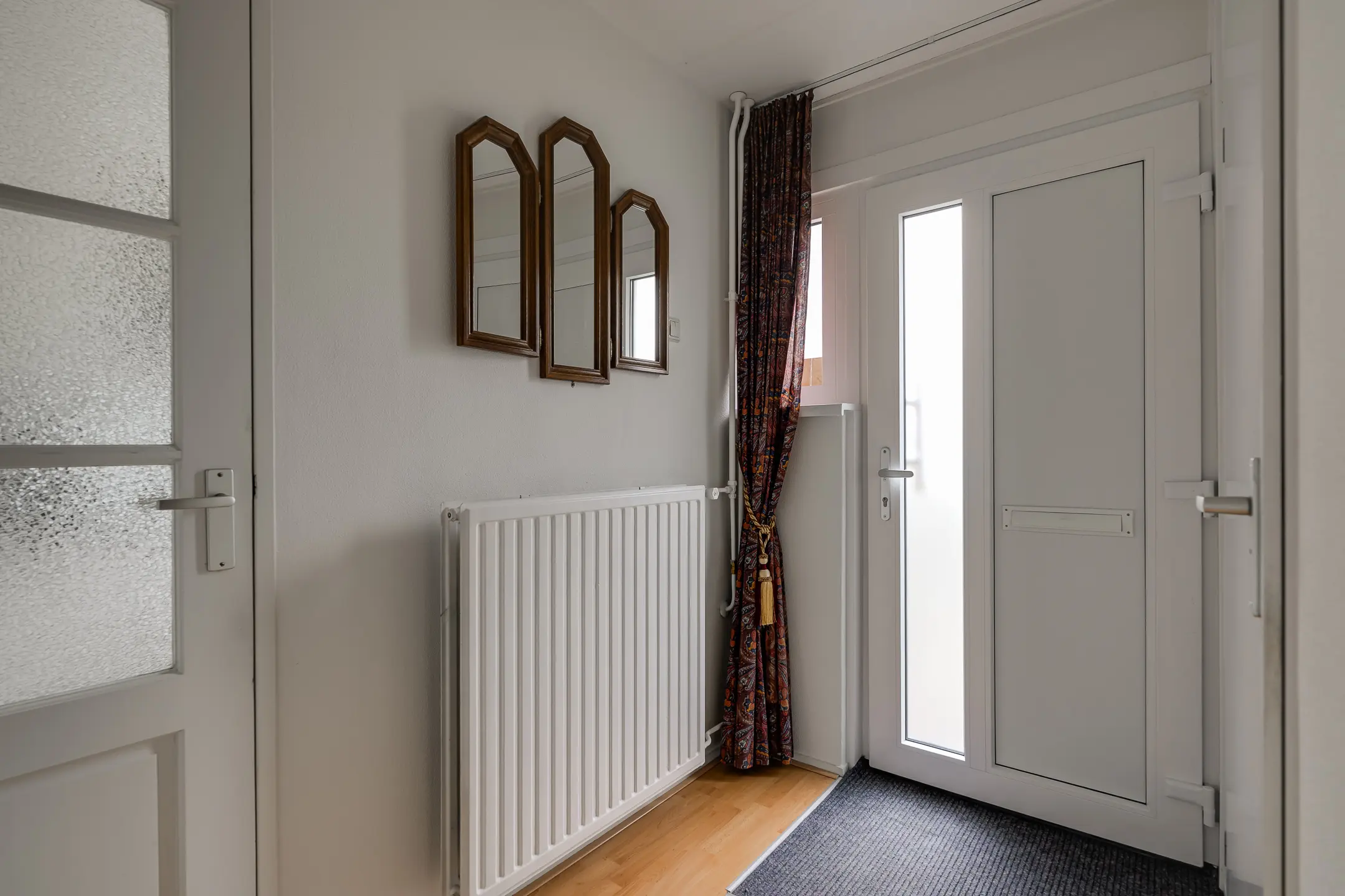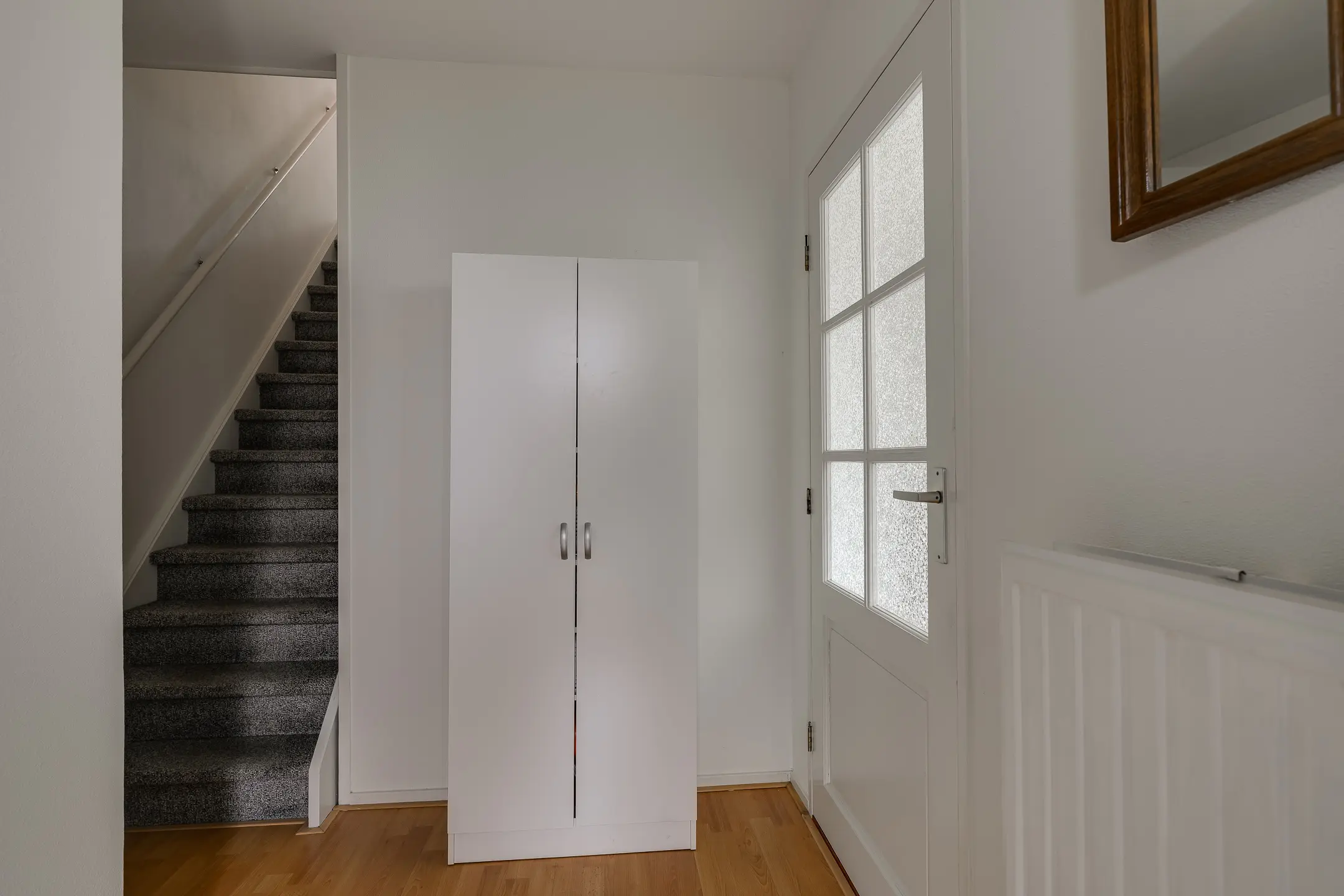 Entree in hal met toiletruimte, trapopgang, meterkast en toegangsdeuren naar zowel de woonkamer aan de achterzijde als de keuken aan de voorzijde van de woning.