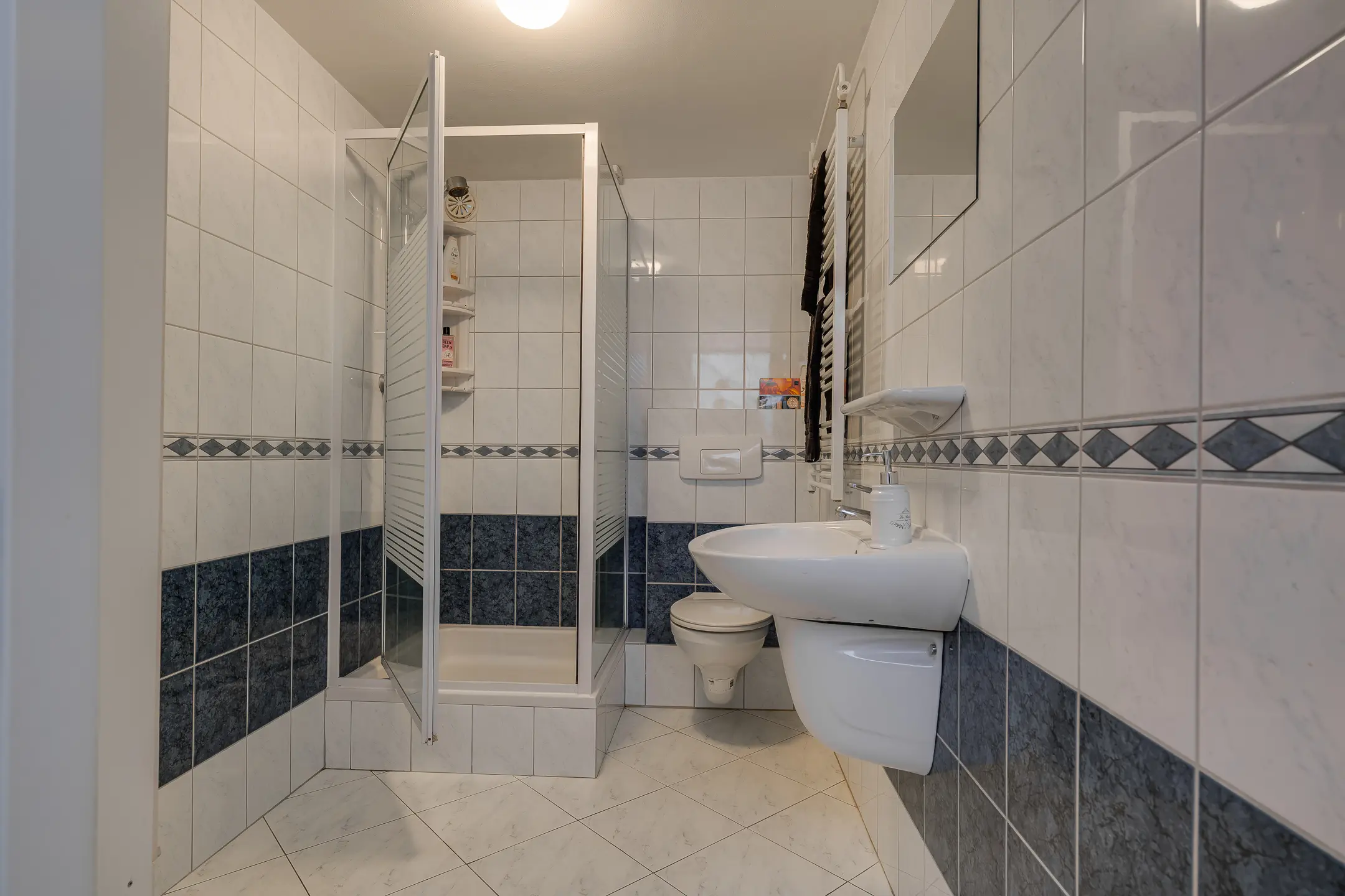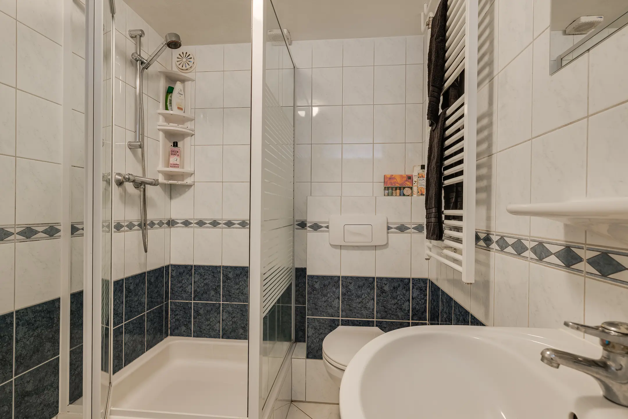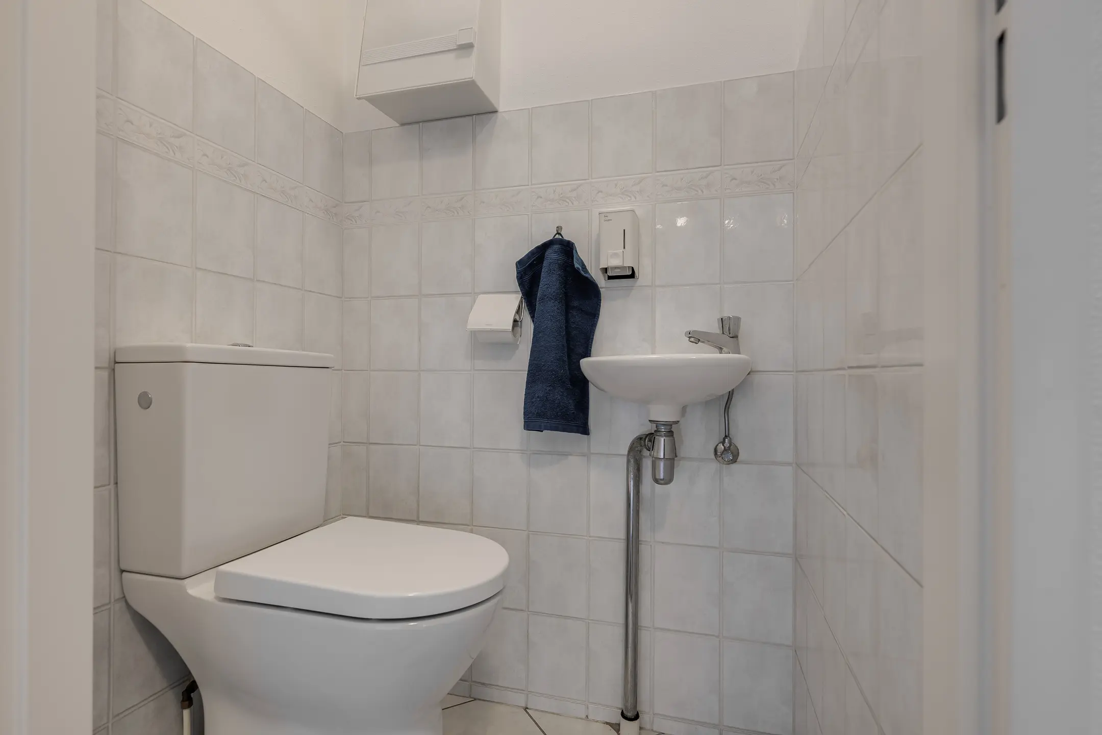 Centraal op de verdieping bevindt zich de badkamer, volledig betegeld in blauw-/wittinten, met douchecabine, wastafel, tweede toilet en designradiator.