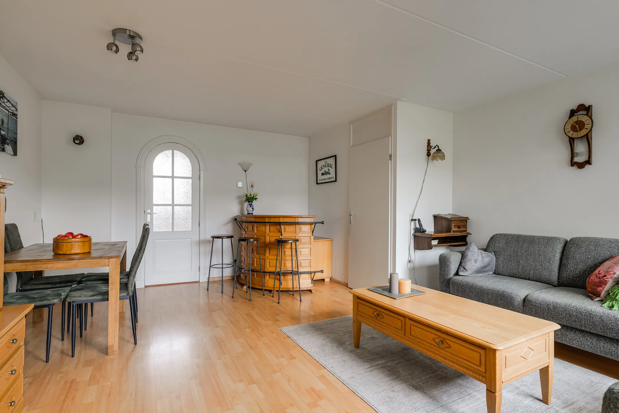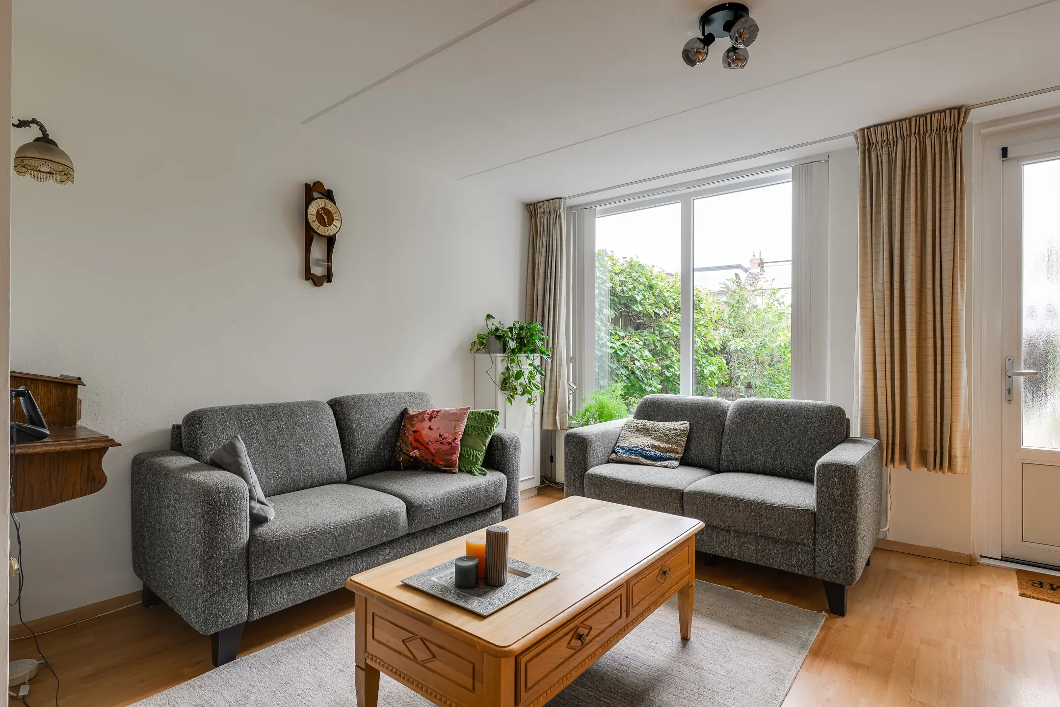 In de ruime woonkamer is voldoende ruimte voor een grote eettafel en comfortabele zithoek. Middels de grote raampartij heeft u vanuit de woonkamer een mooi uitzicht op de diepe, groene tuin, toegankelijk middels een loopdeur.