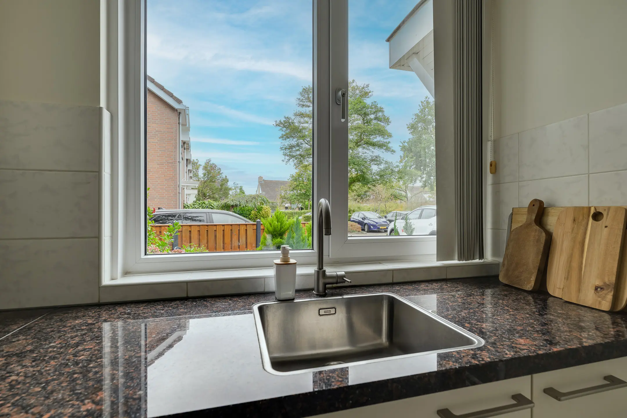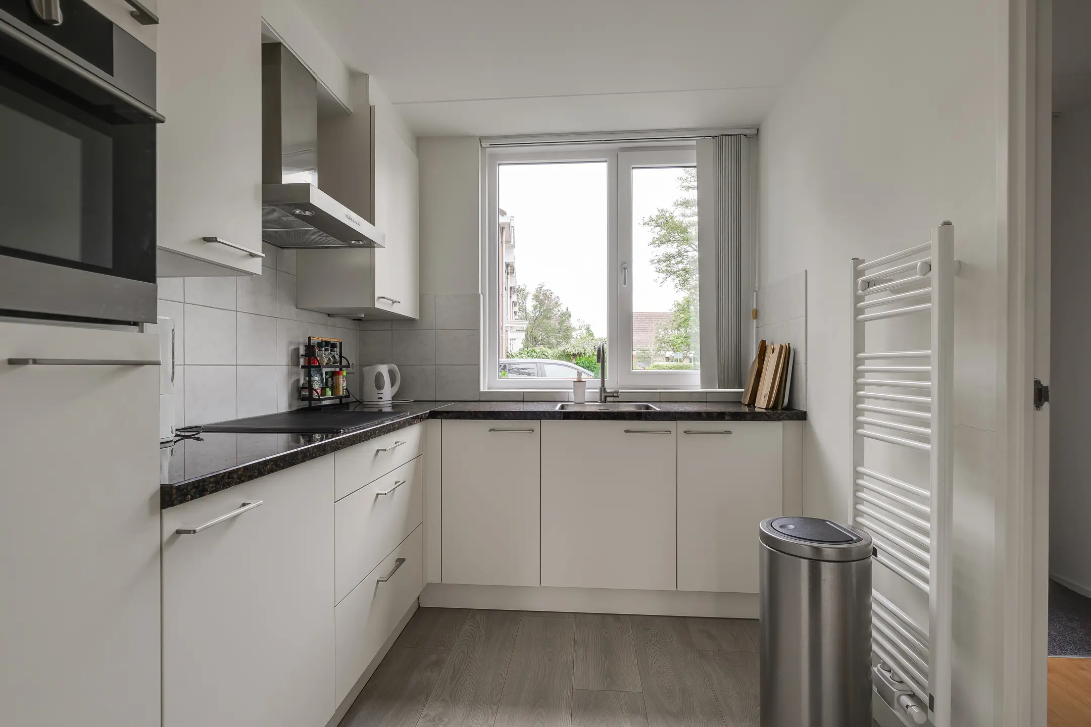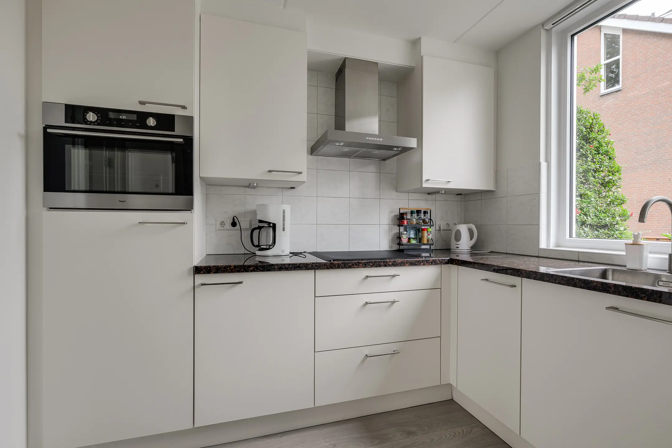 De separate keuken aan de voorzijde is in 2021 vernieuwd en heeft een praktische L-opstelling met een stijlvol stenen werkblad, witte fronten en wandtegels. De keuken is uitgerust met een spoelbak met mengkraan, combi-oven, inductiekookplaat en een koel-/vriescombinatie.
