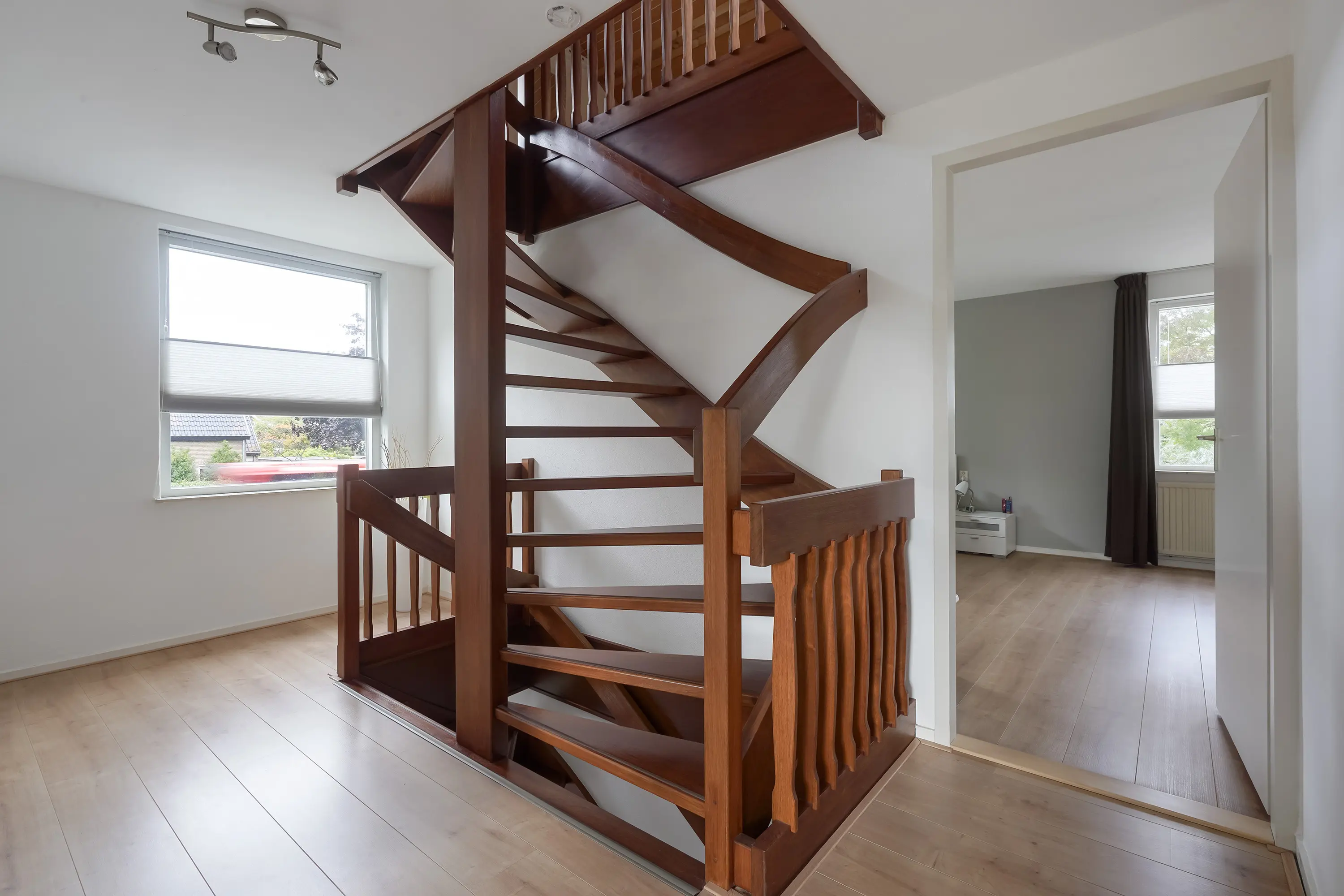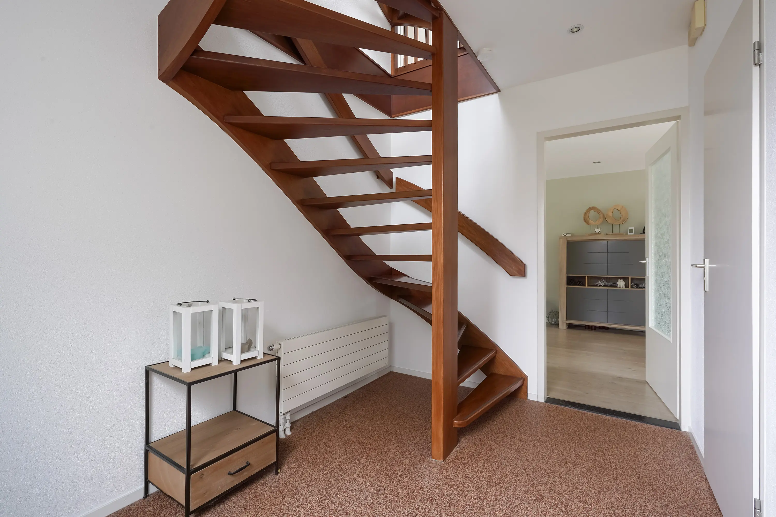 De robuuste, hardhouten trap loopt vanaf de begane grond volledig door naar de zolderverdieping.