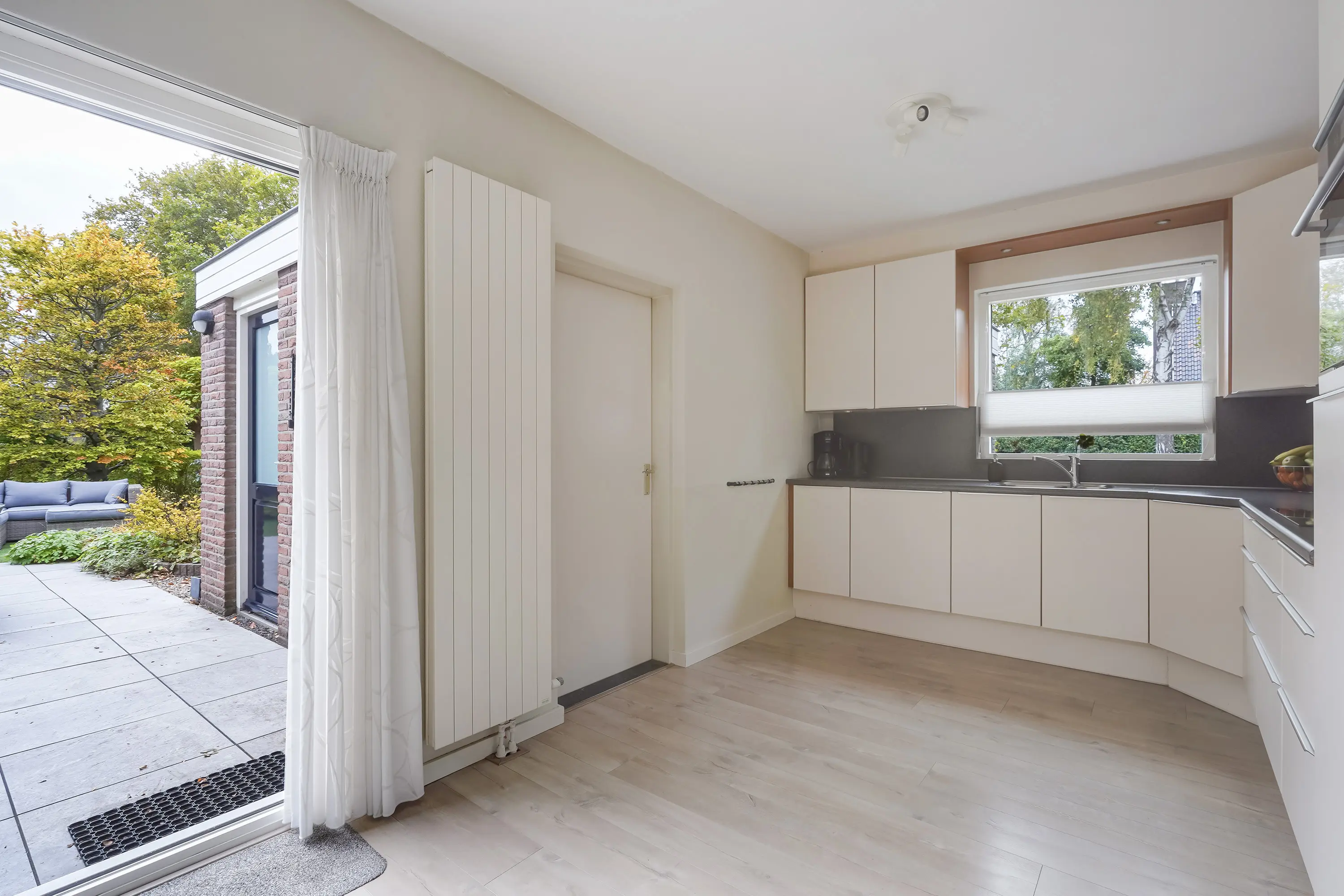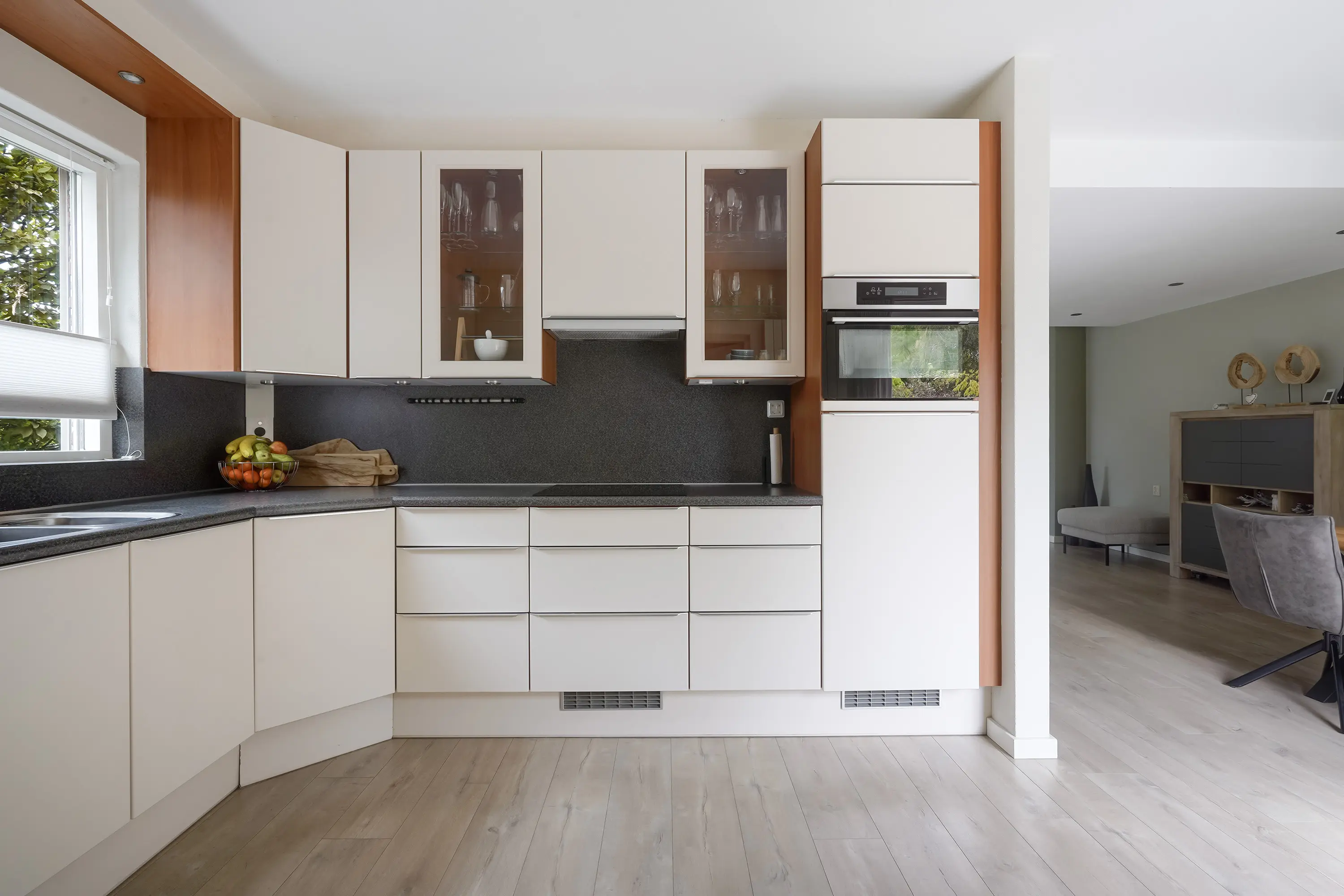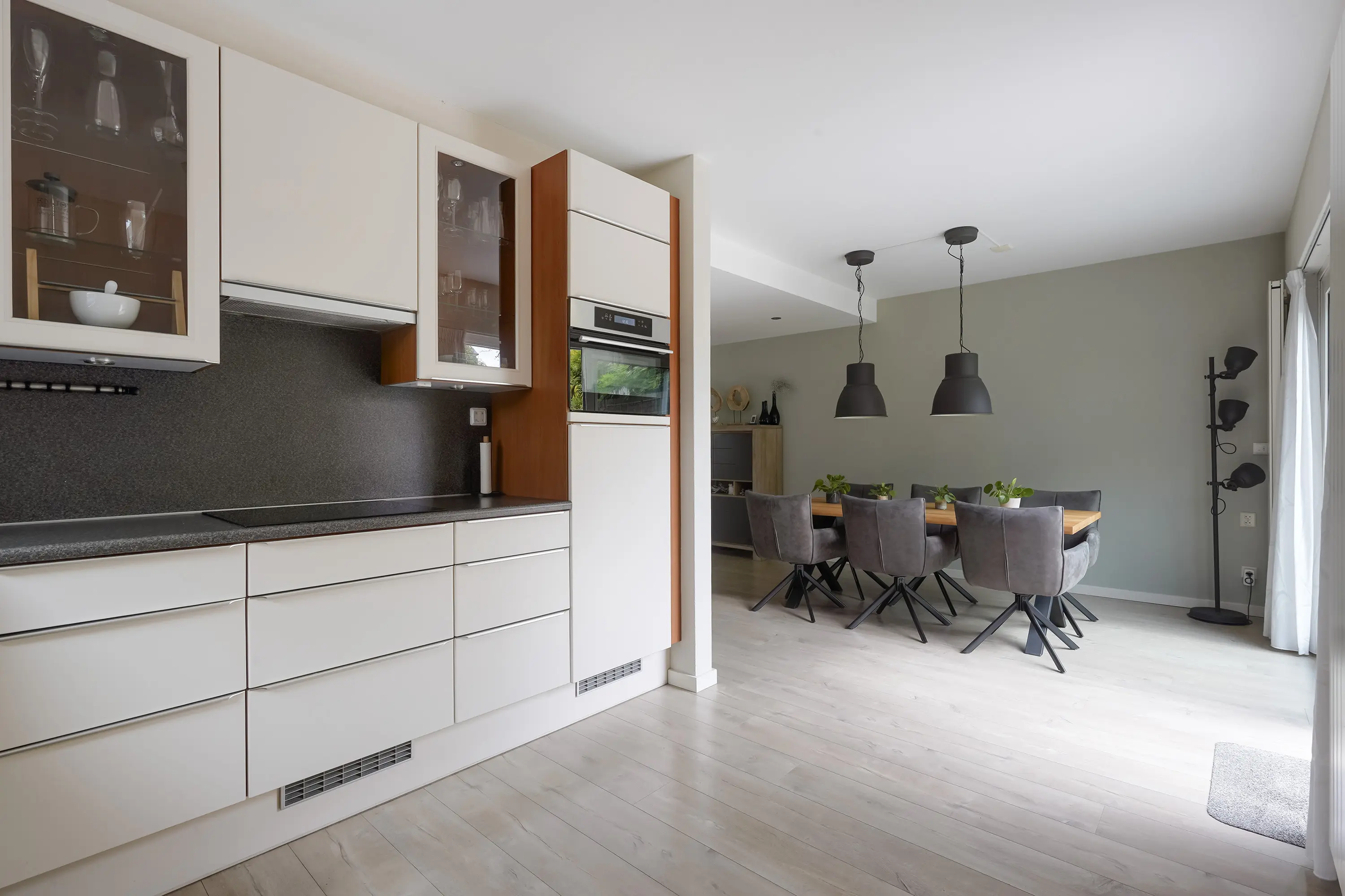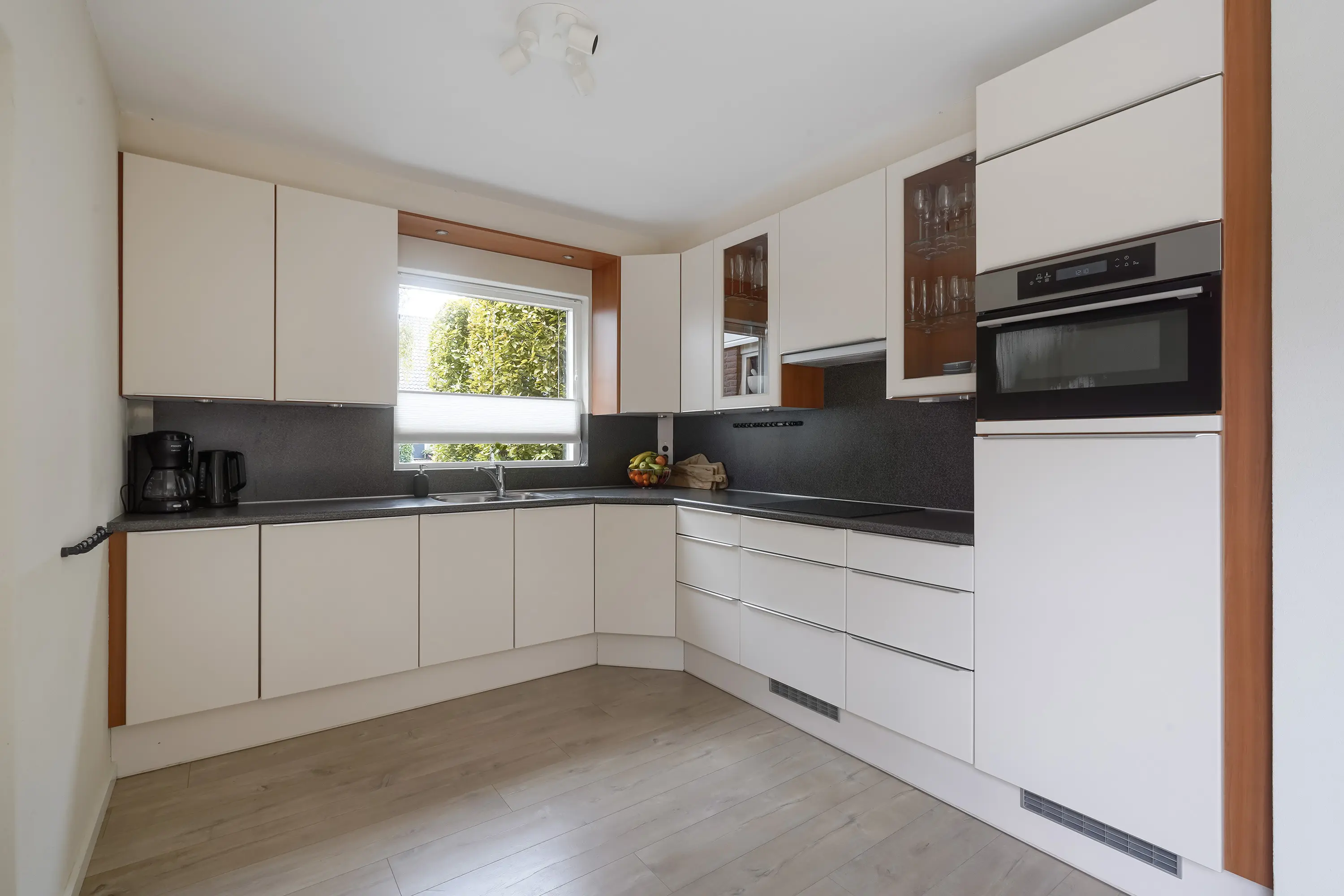 Aan de tuinzijde van de woning bevindt zich een open keuken, met voldoende ruimte voor een riante eethoek. De keuken is in L-opstelling en ingericht met diverse (vernieuwde) inbouwapparatuur: inductiekookplaat met afzuigkap, combi-oven, koelkast, vaatwasser en warm water boiler.