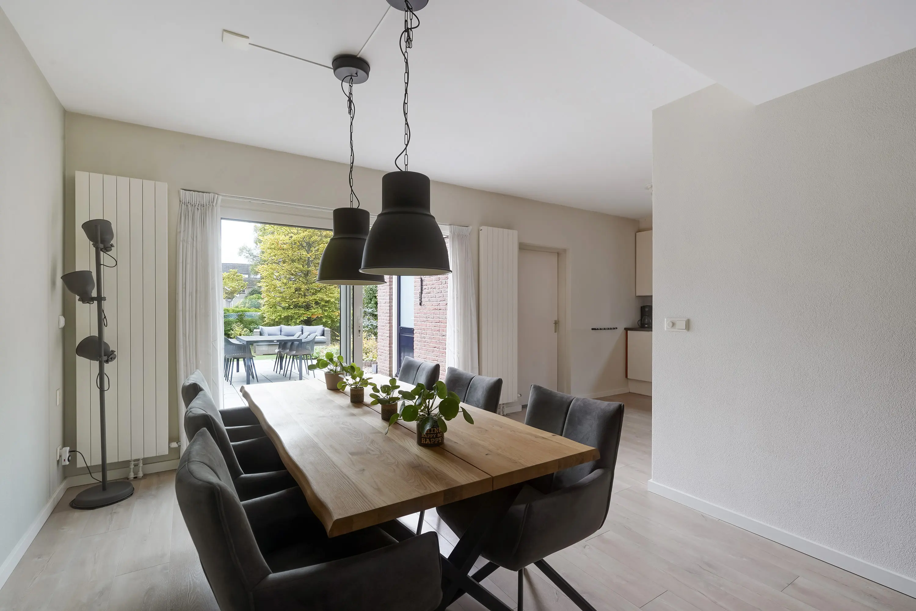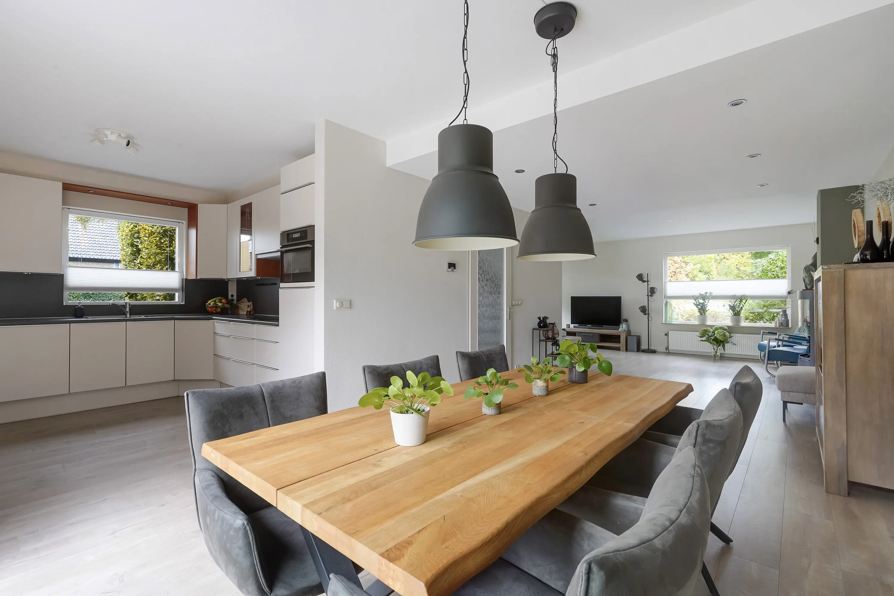 Hier springt de hoogwaardige afwerking direct in het oog; gespachtelde wanden en strak gestuukte plafonds met lichtspots, een keurige, neutrale laminaatvloer en op maat gemaakte raambekleding. De gehele begane grond is voorzien van vloerverwarming.