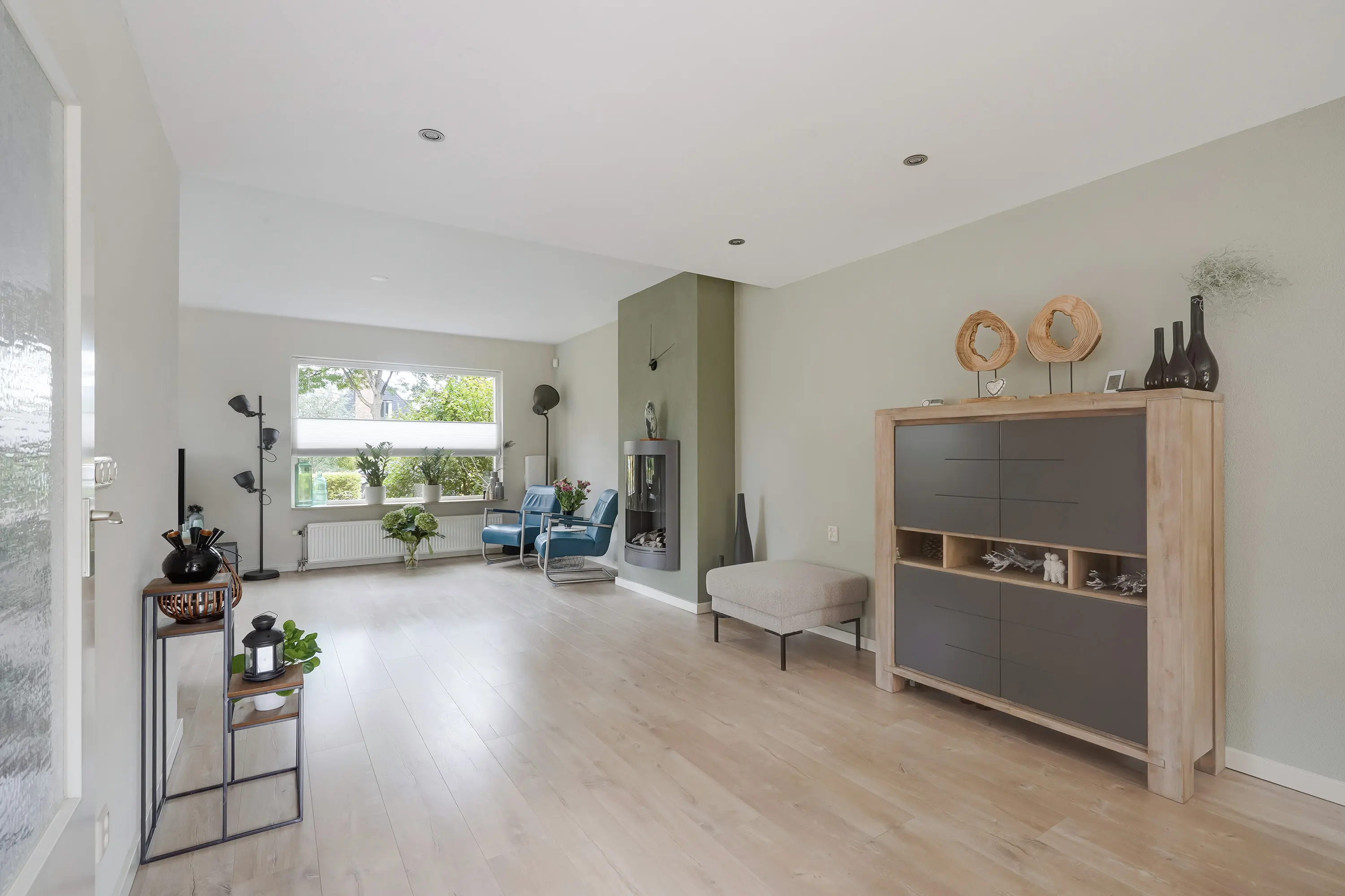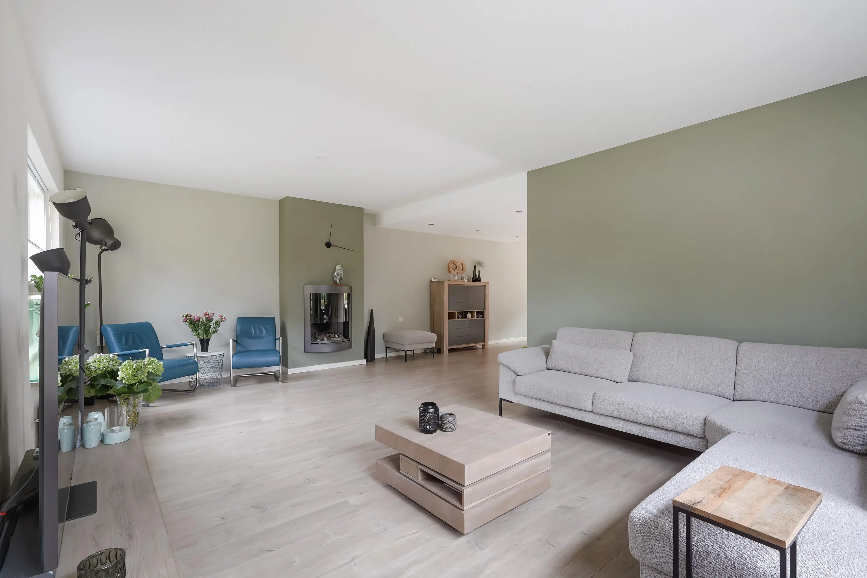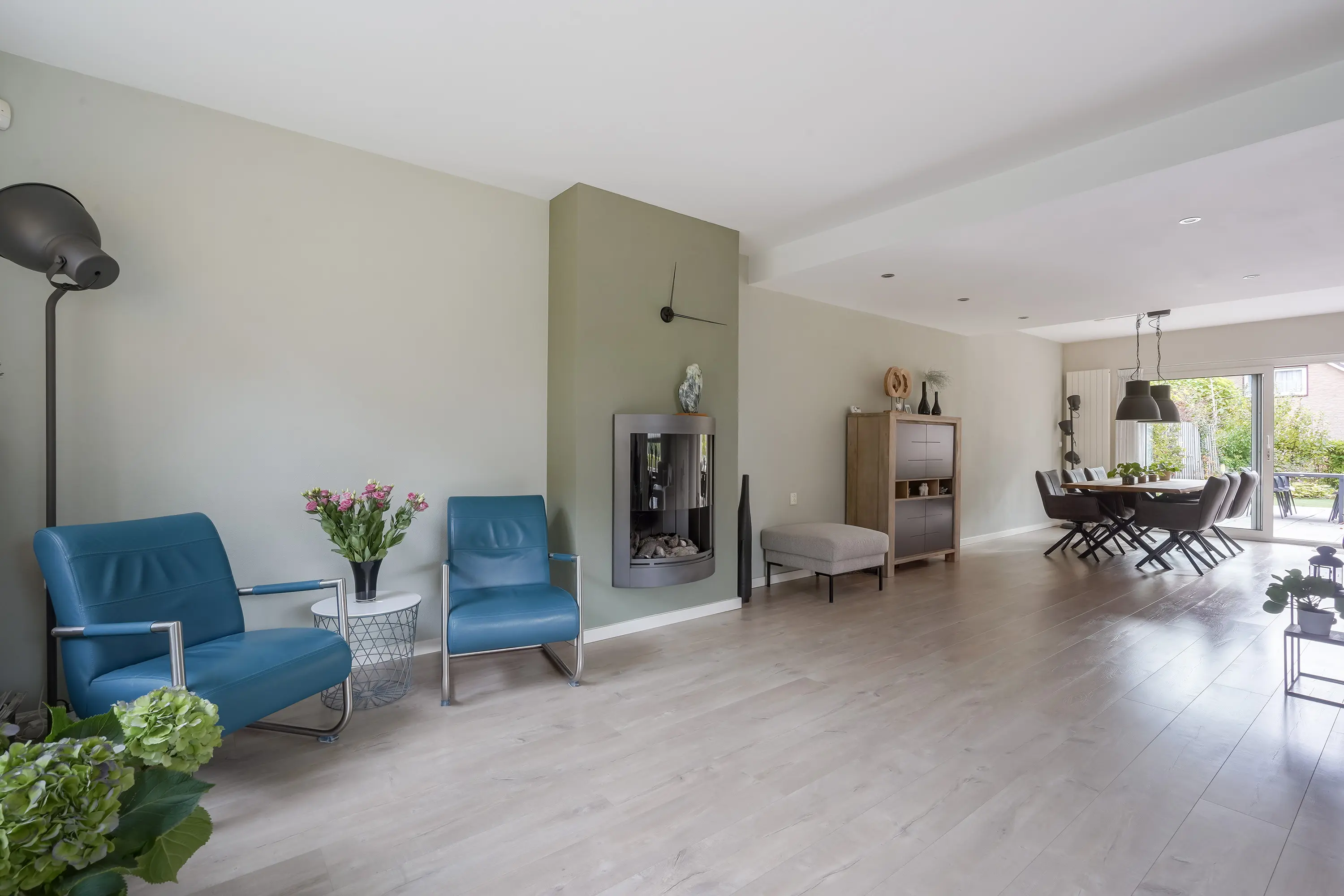Aan de voorzijde van de woning een royale zithoek met sfeervolle gashaard en aan voor- en zijzijde veel daglicht middels de grote raampartijen.