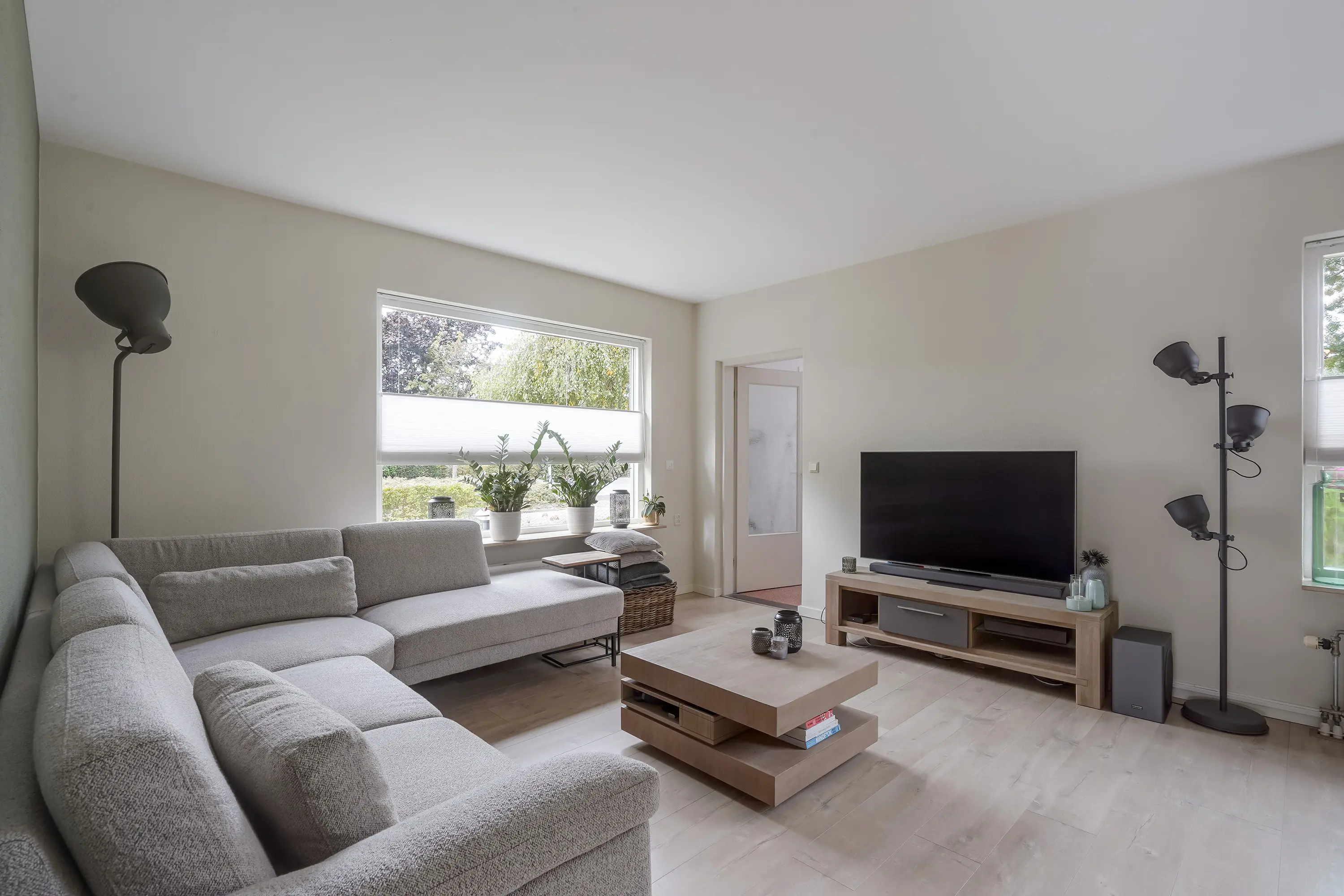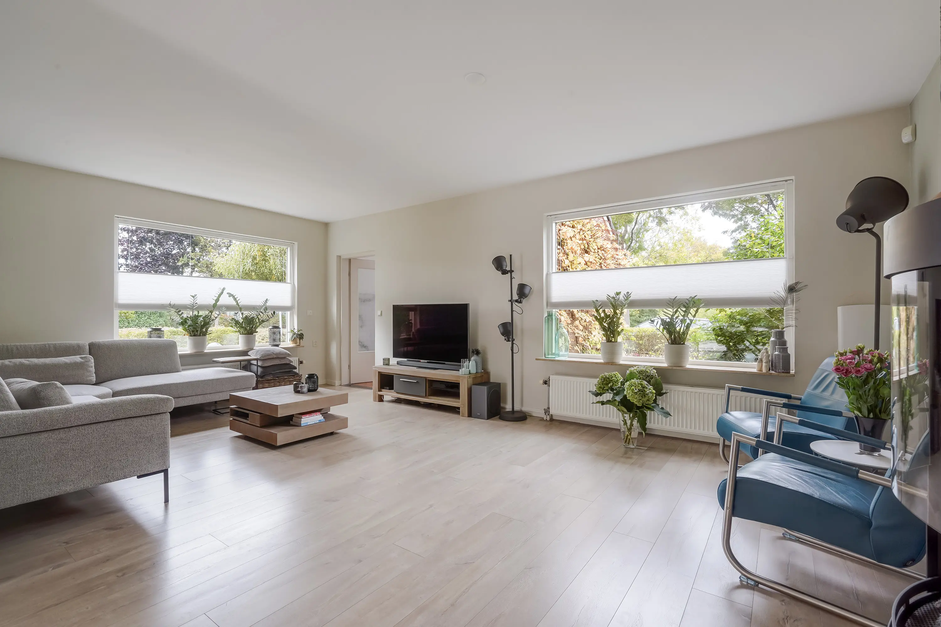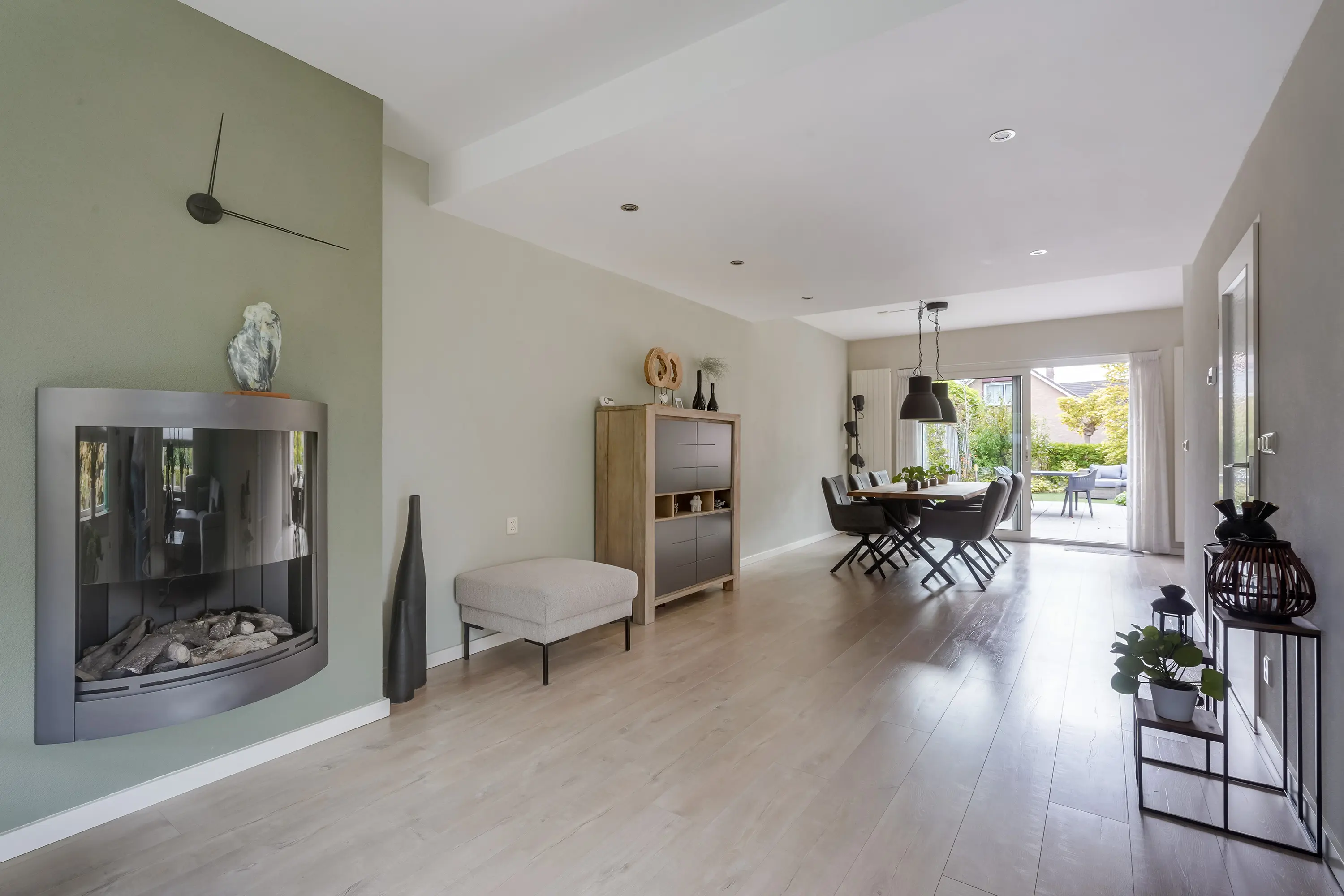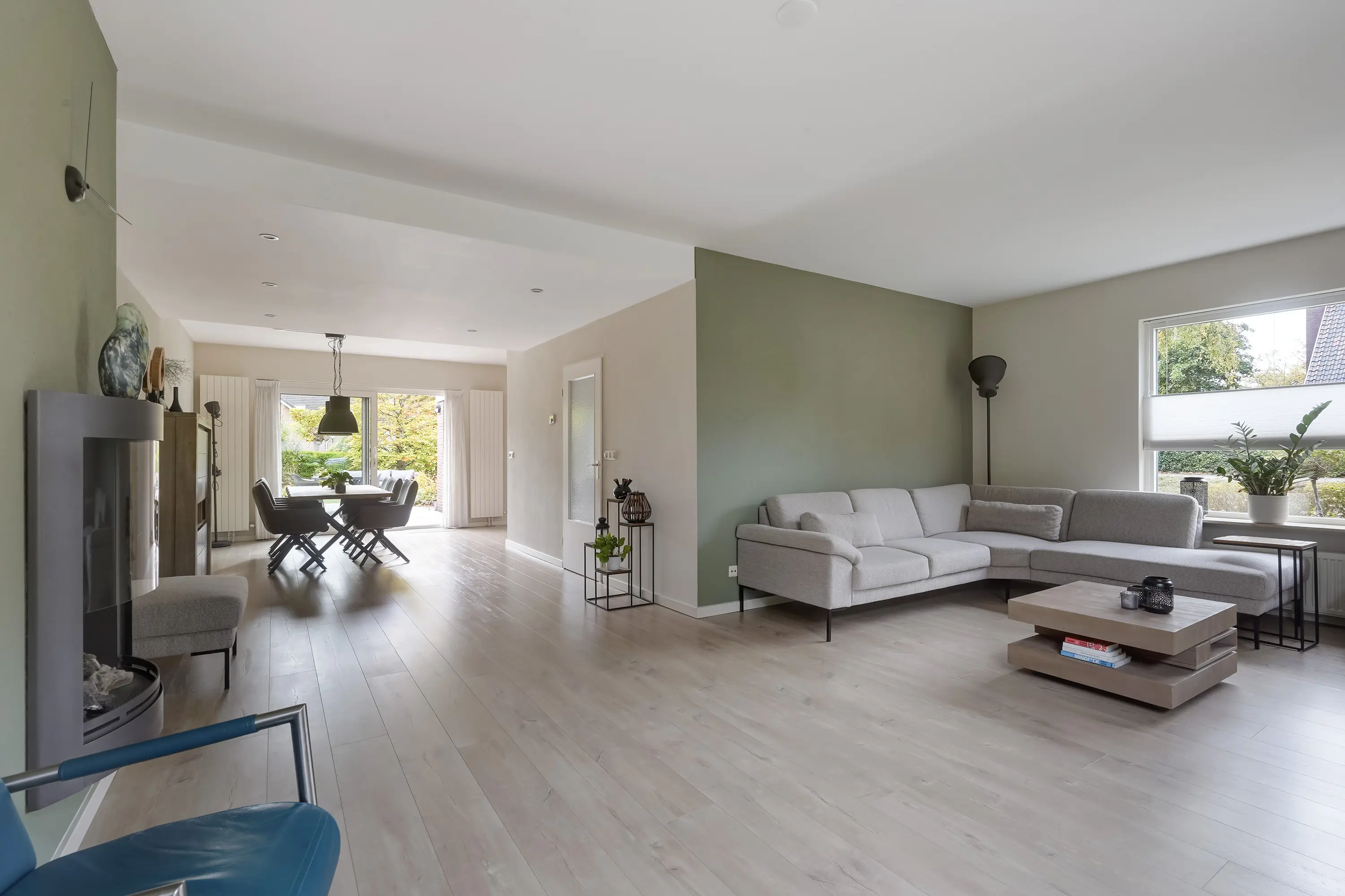 Aan de voorzijde van de woning een royale zithoek met sfeervolle gashaard en aan voor- en zijzijde veel daglicht middels de grote raampartijen.