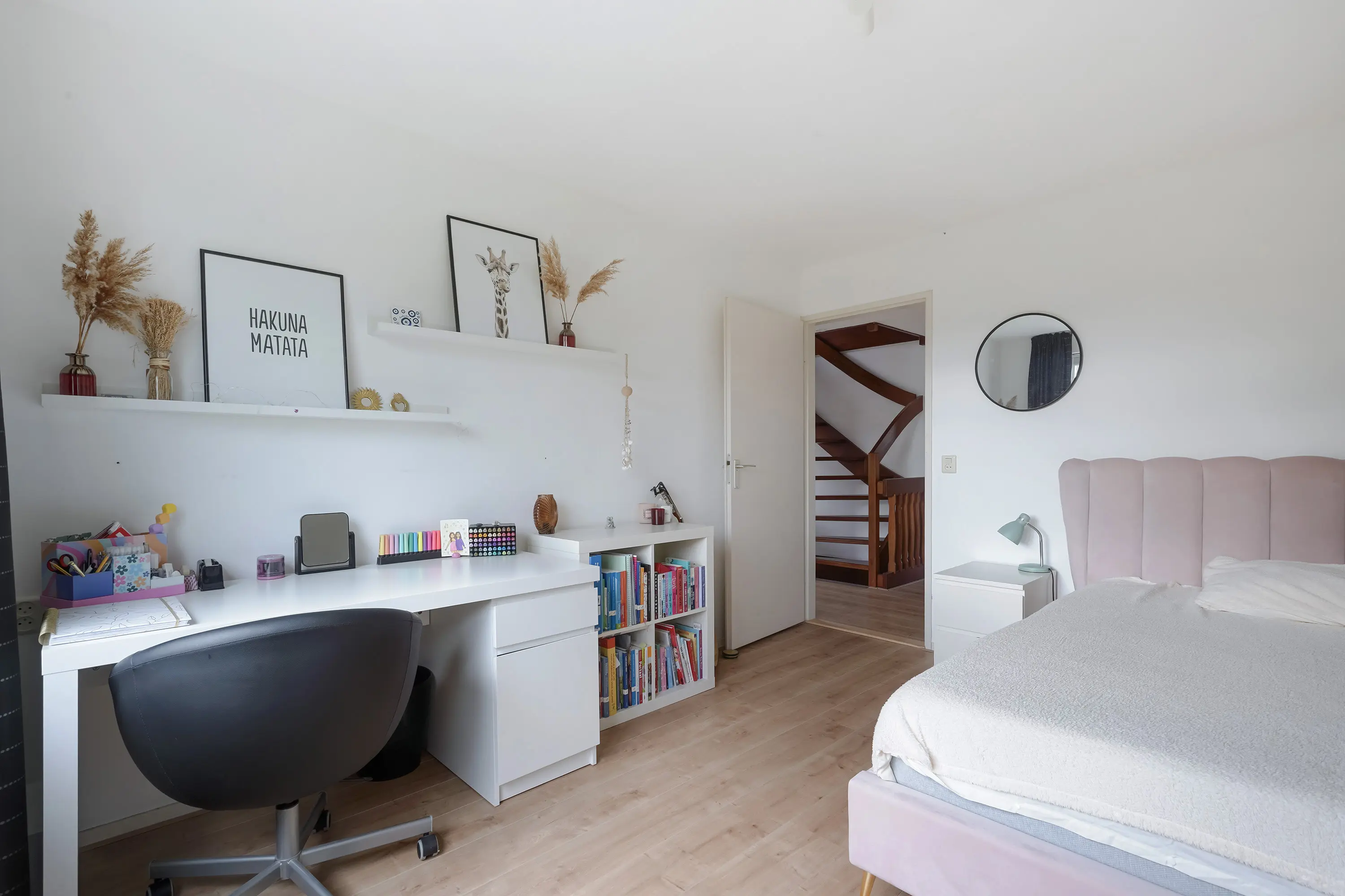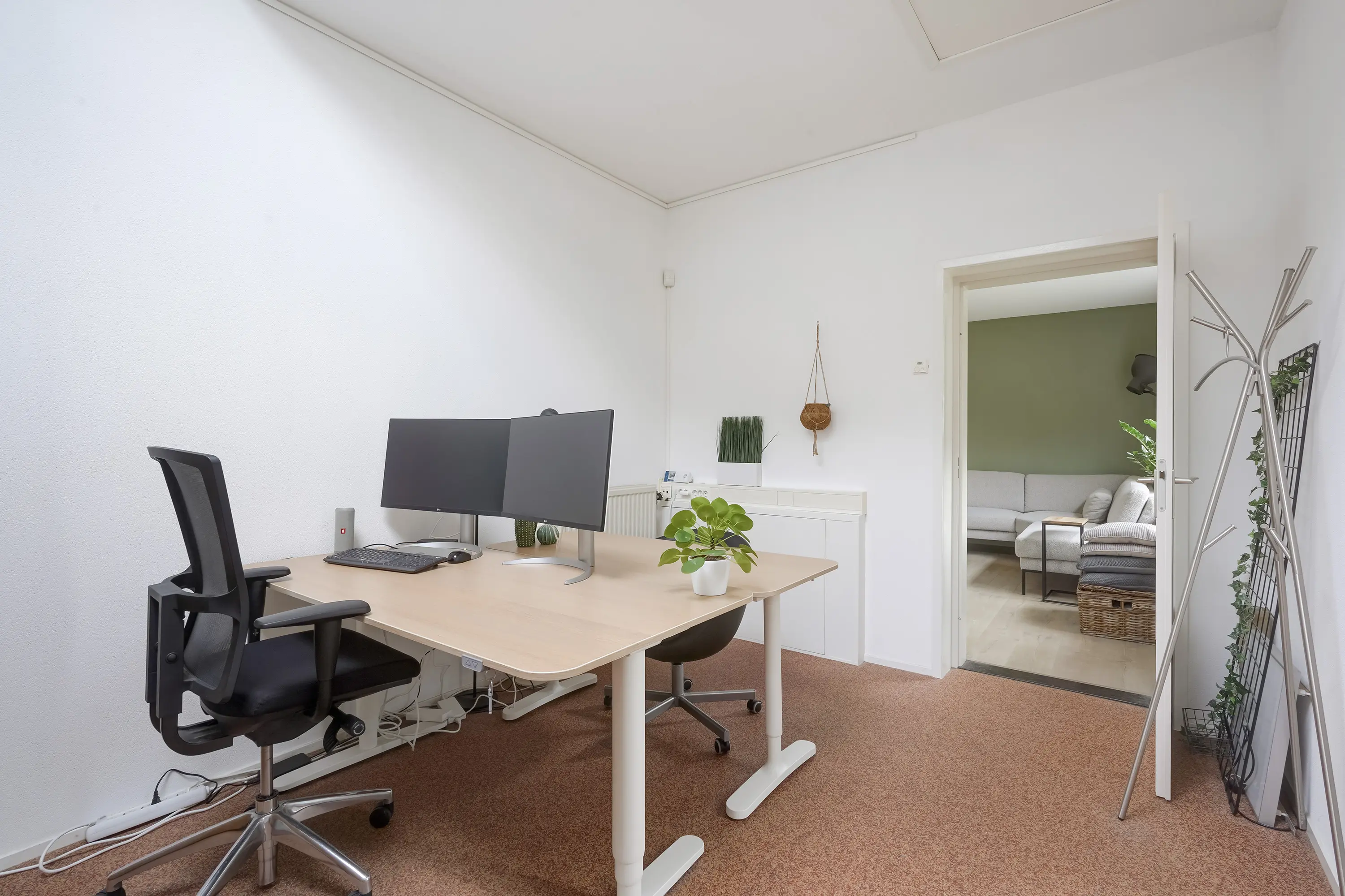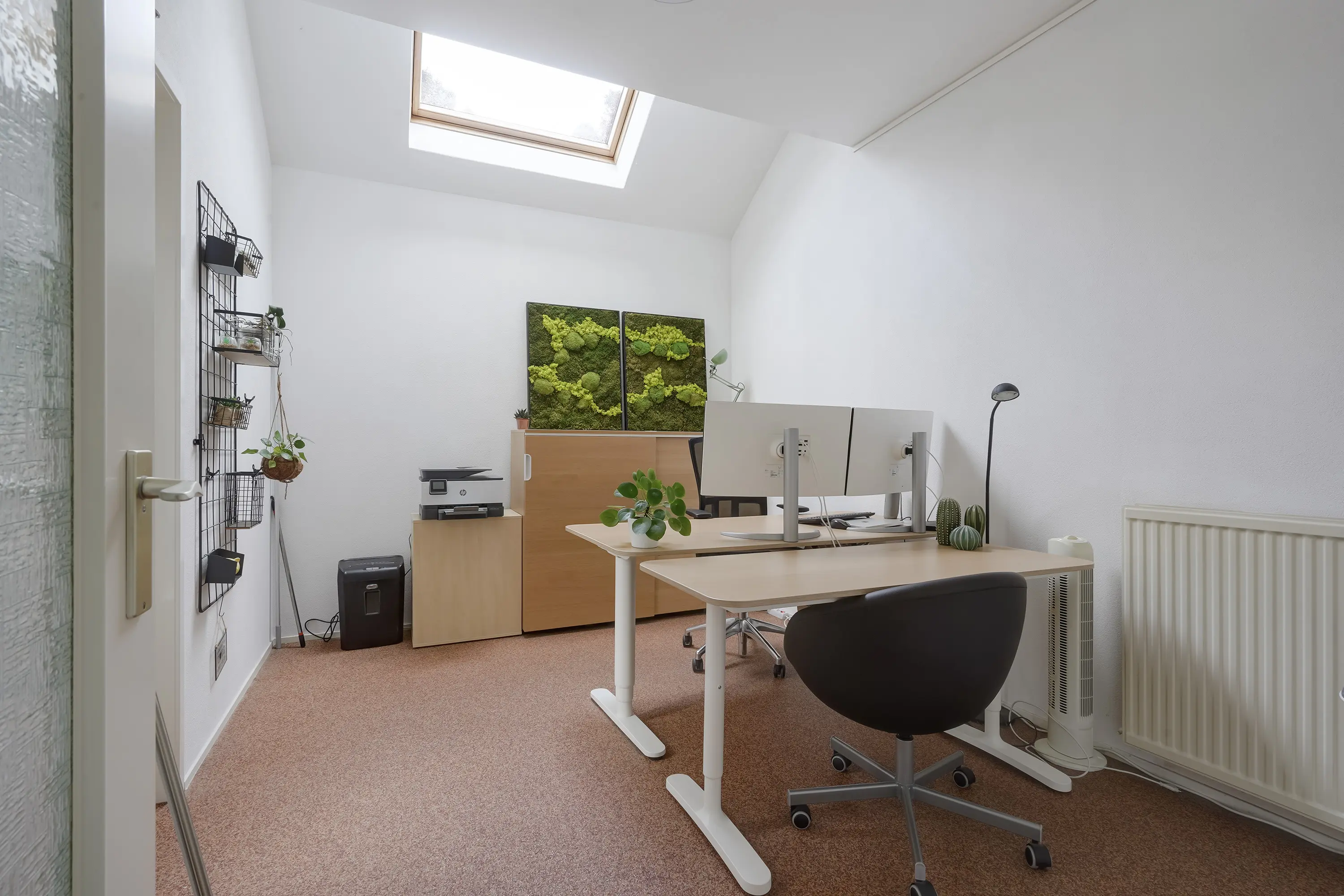 Een interne toegangsdeur leidt naar de separate ruimte, thans ingericht als kantoor. Deze multifunctionele ruimte beschikt over een dakraam, elektrische vloerverwarming, radiatoren, een eigen ingang en bergzolder.