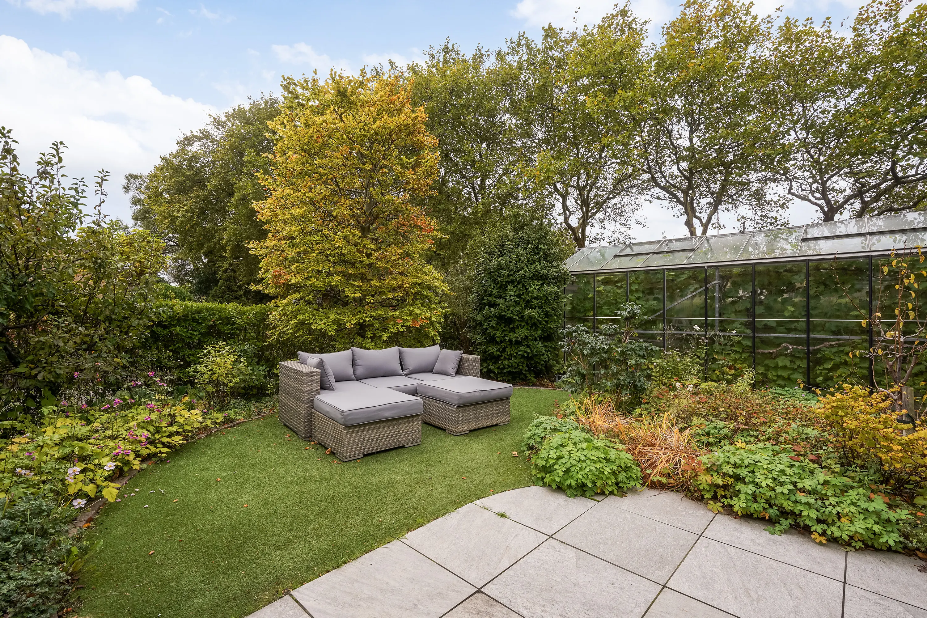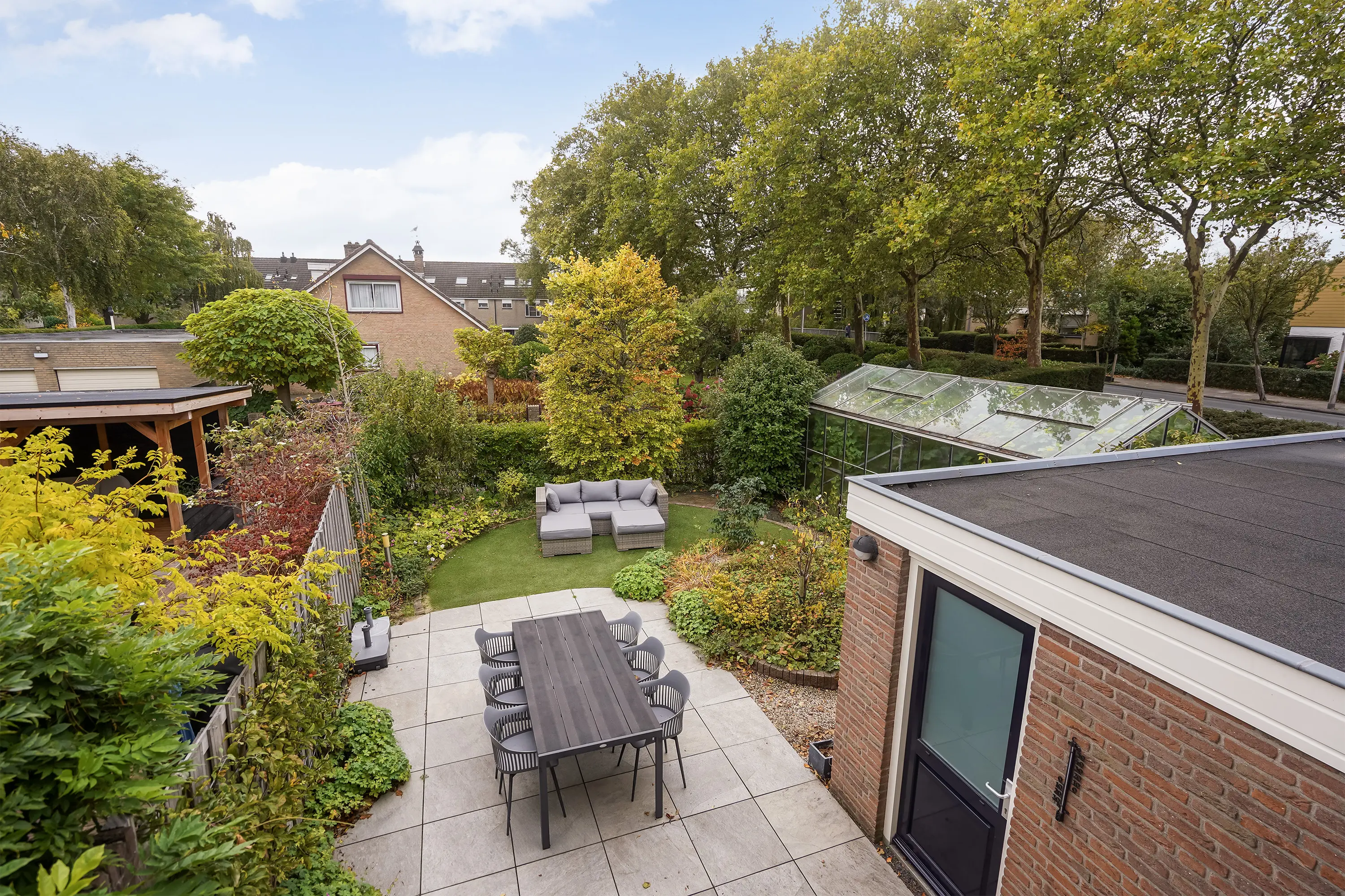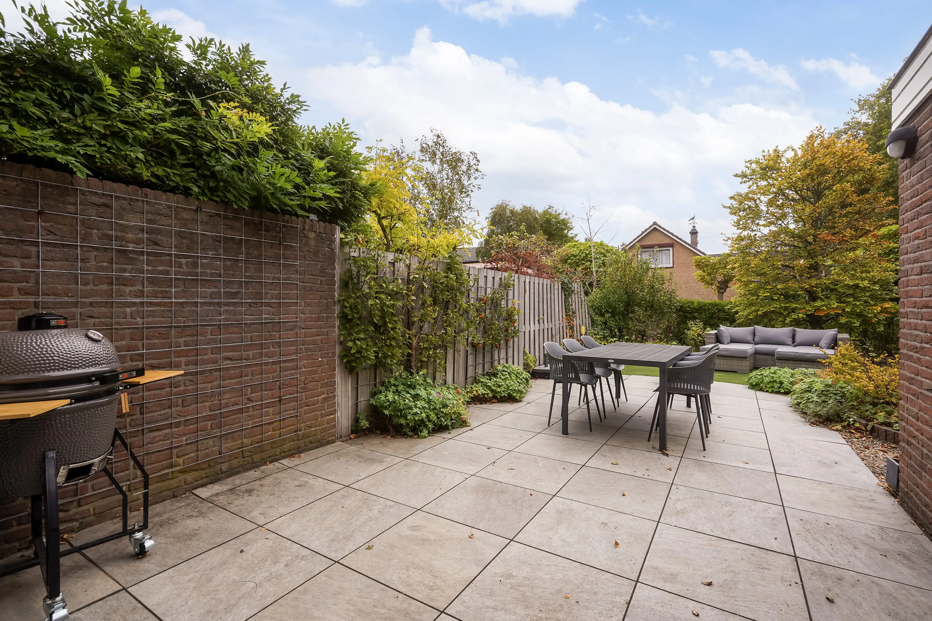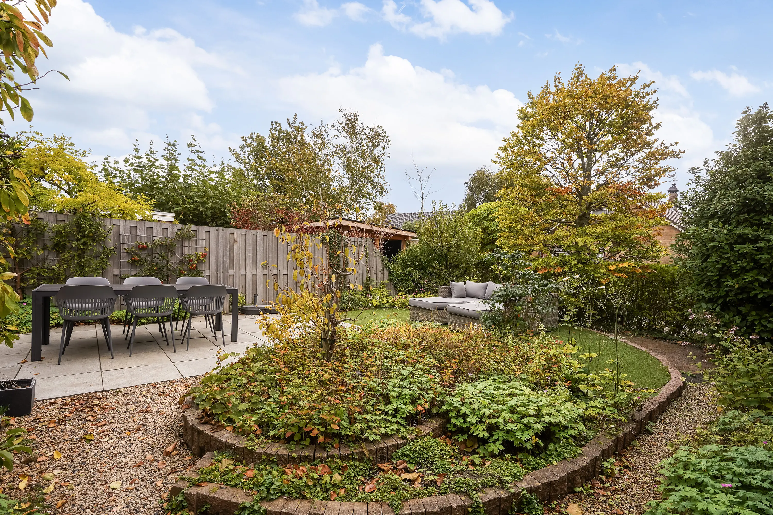 Via een aluminium schuifpui is de verzorgde achtertuin te bereiken. Direct achter de deur een betegeld terras met buitenzonwering aan de gevel. Achterin de tuin is het een oase van groen met het kunstgrasveld en de diverse beplanting.