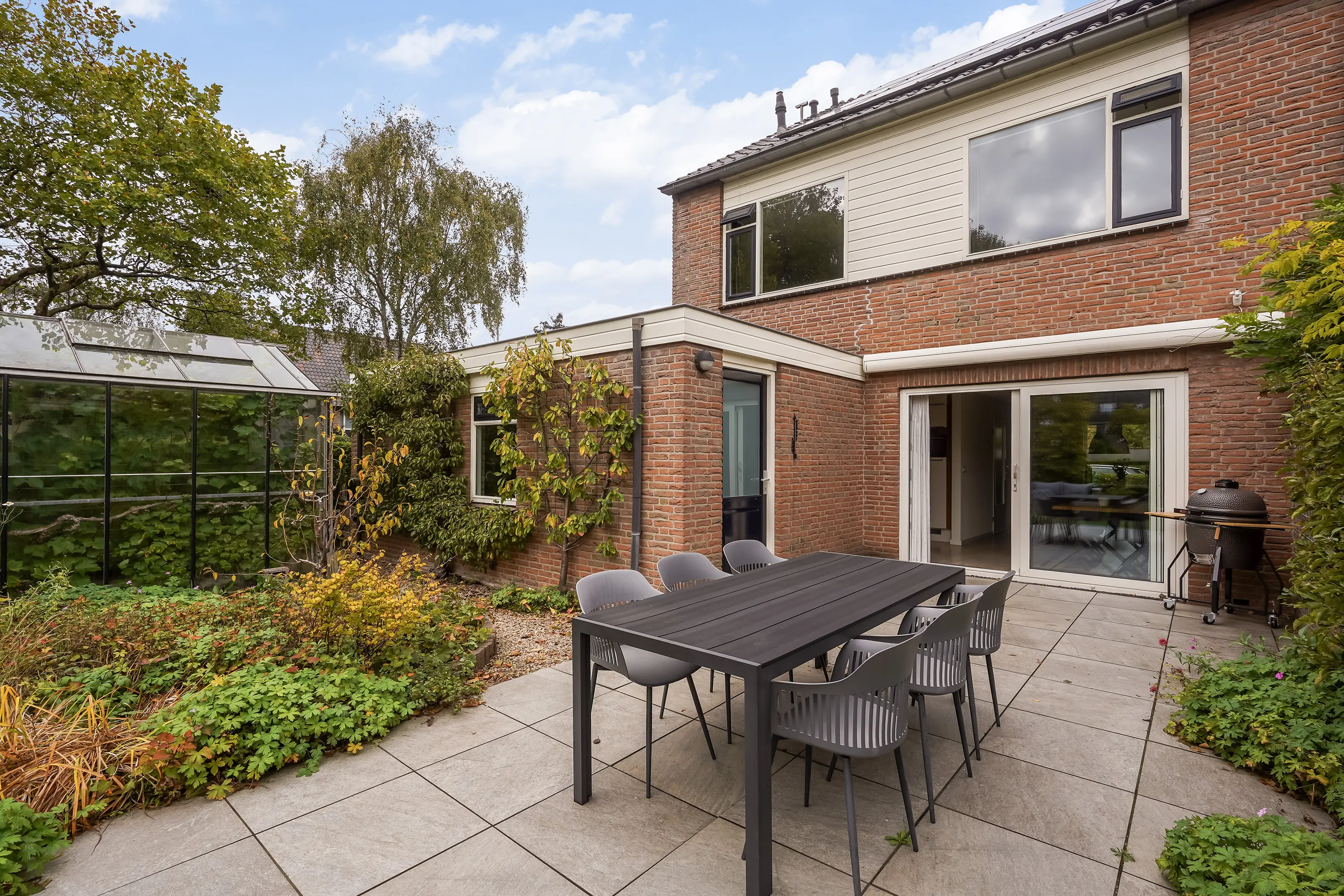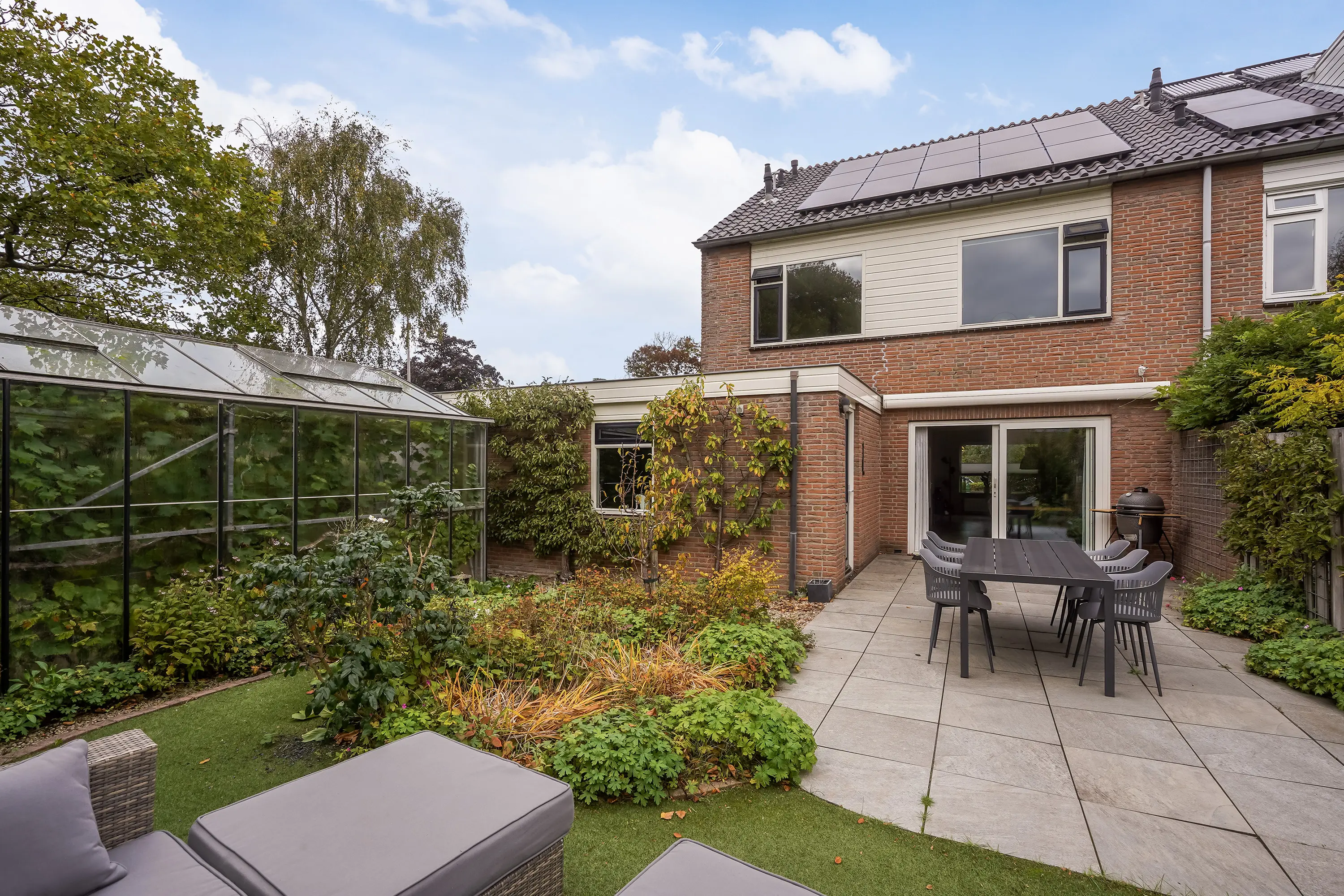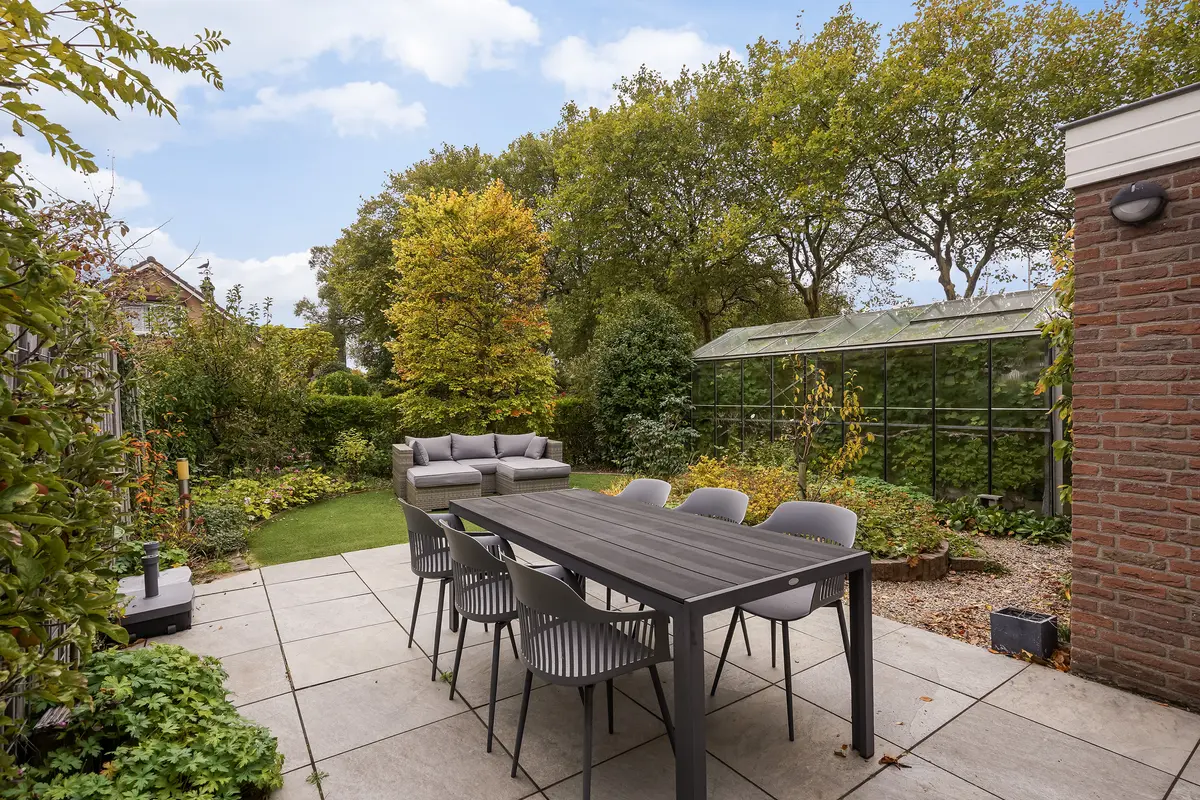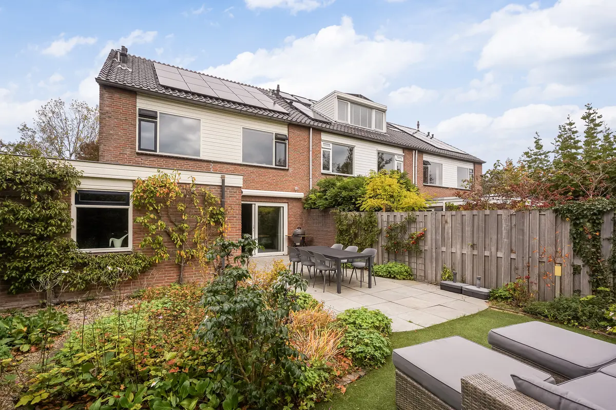 Via een aluminium schuifpui is de verzorgde achtertuin te bereiken. Direct achter de deur een betegeld terras met buitenzonwering aan de gevel. Achterin de tuin is het een oase van groen met het kunstgrasveld en de diverse beplanting.