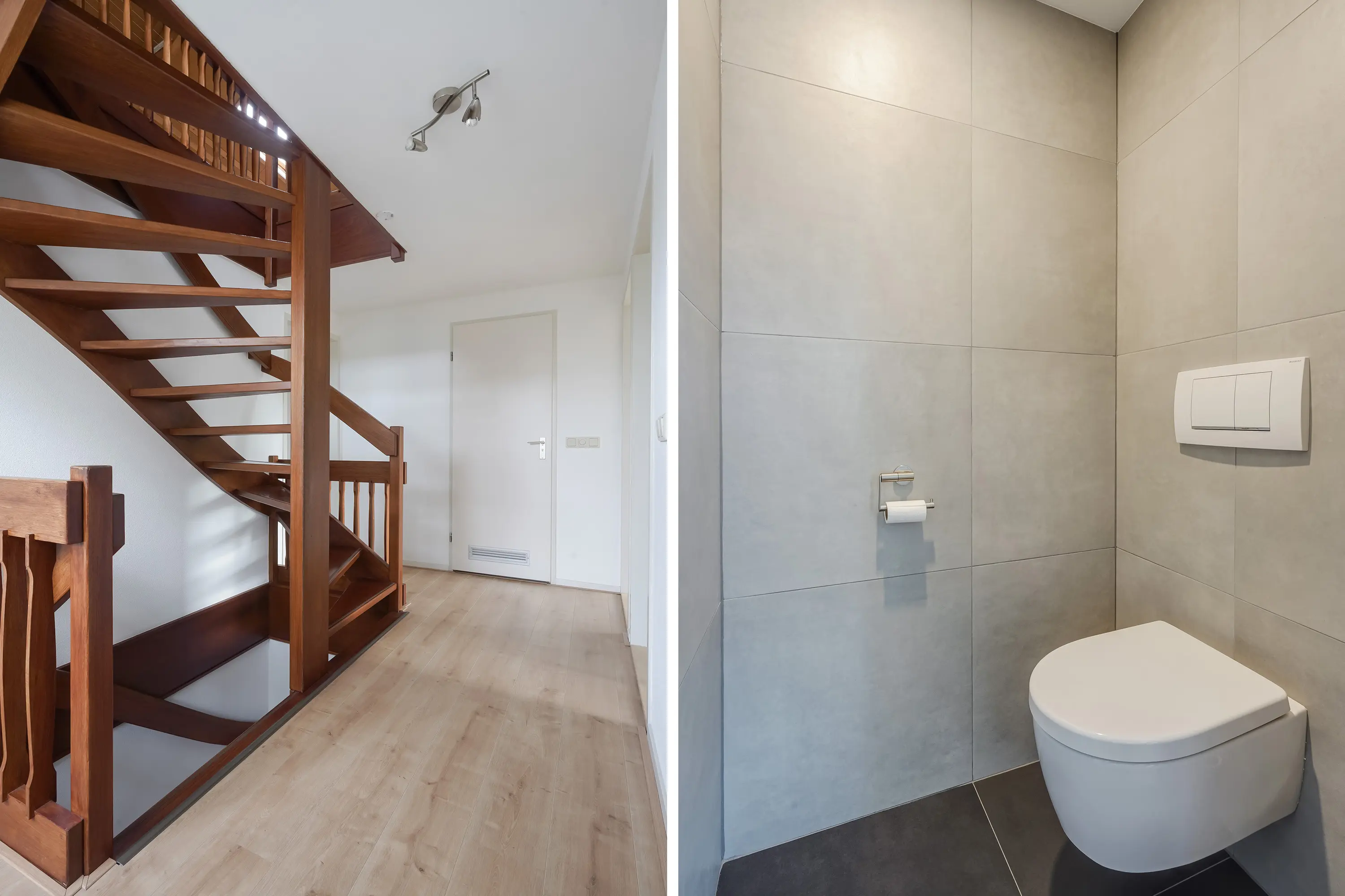 Ruime hal, met meterkast, toiletruimte, garderobe, vaste, open trap naar de verdieping en toegangsdeur naar de woonkamer.