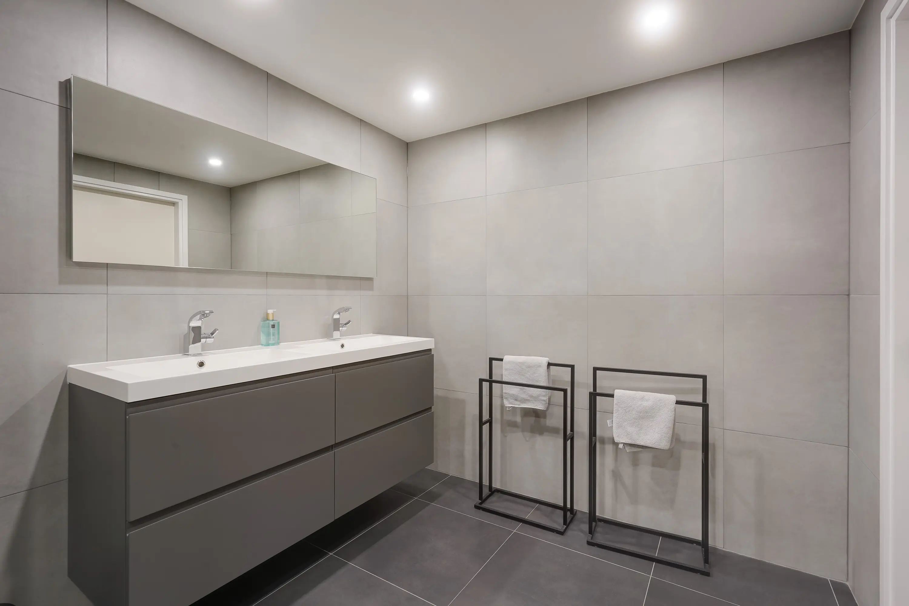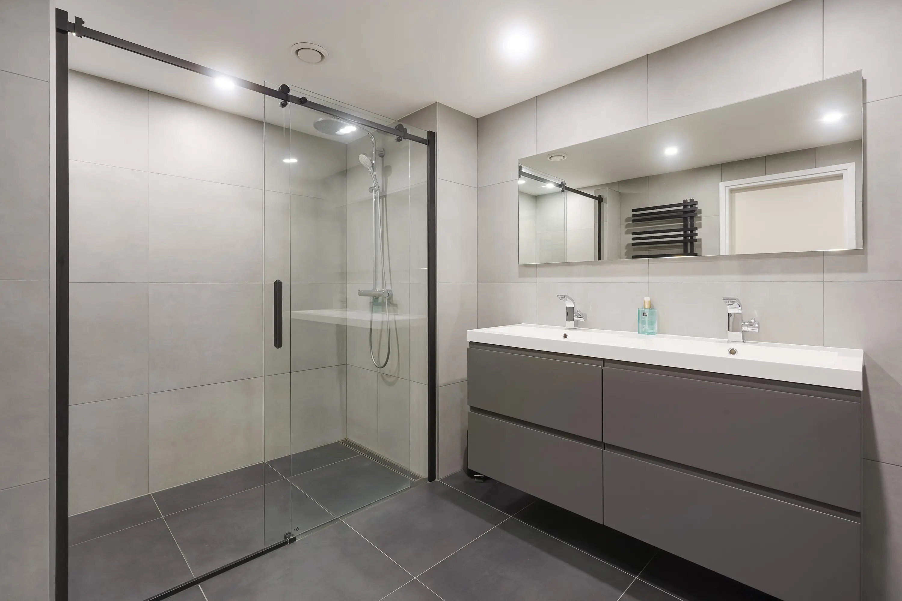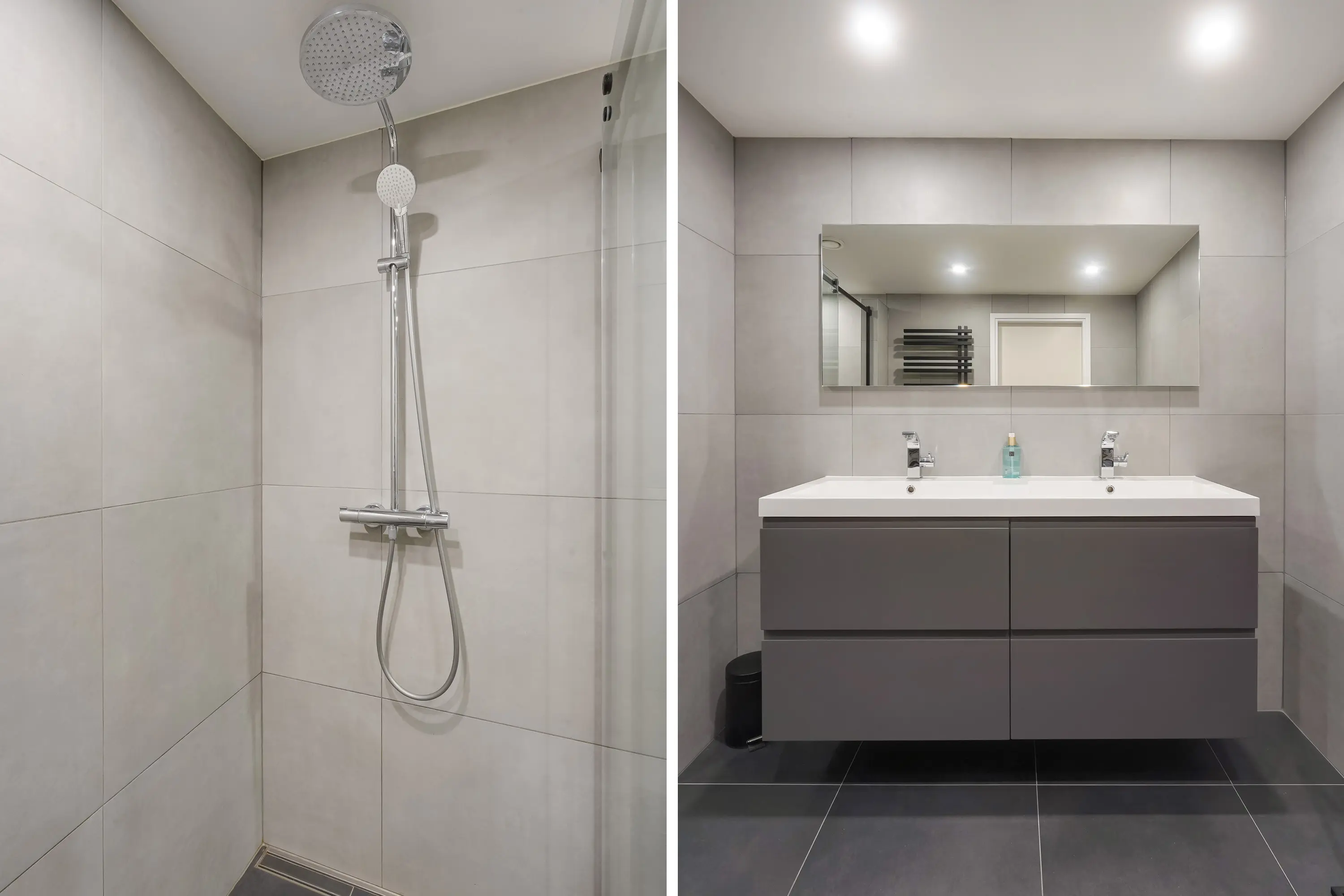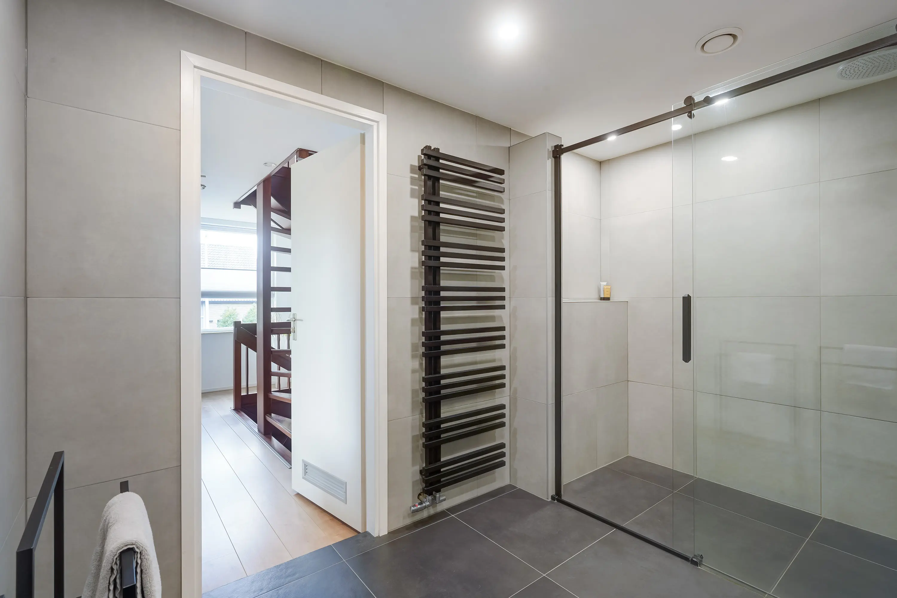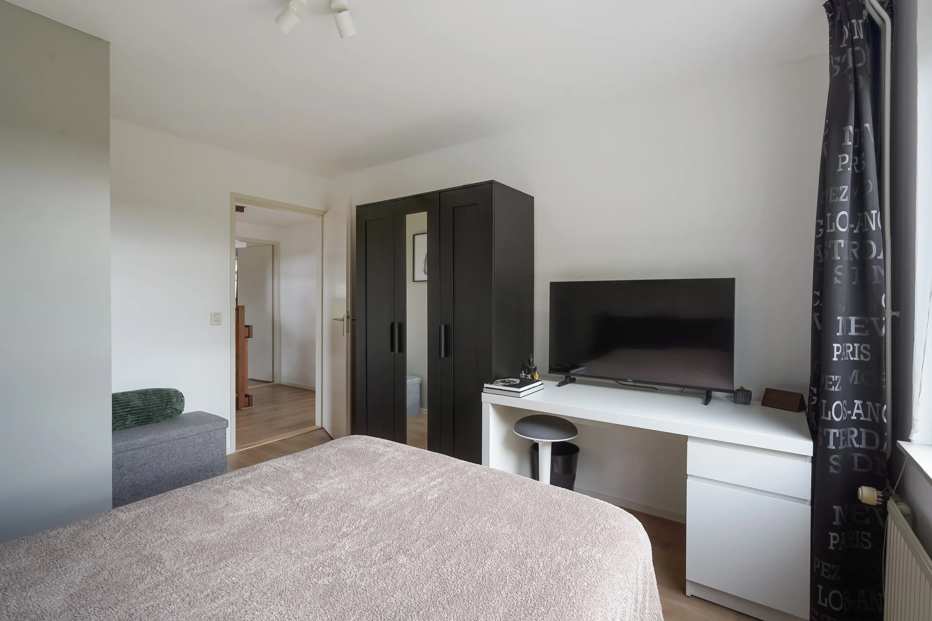 Centraal op de verdieping is de in 2021 vernieuwde, moderne badkamer. Deze is volledig betegeld in natuurtinten en ingericht met riante inloopdouche met glazen deur, dubbel wastafelmeubel met opberglades en grote wandspiegel.