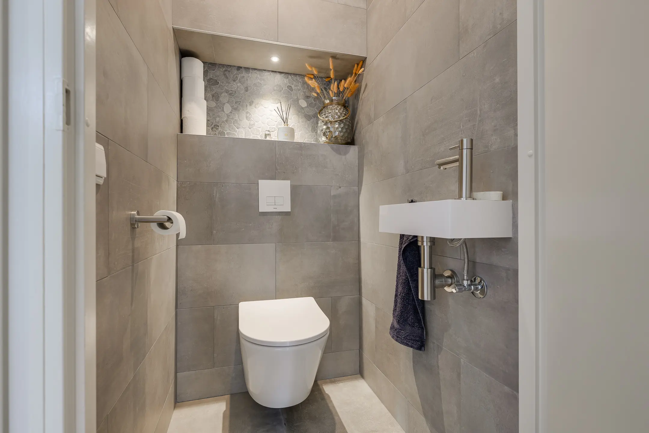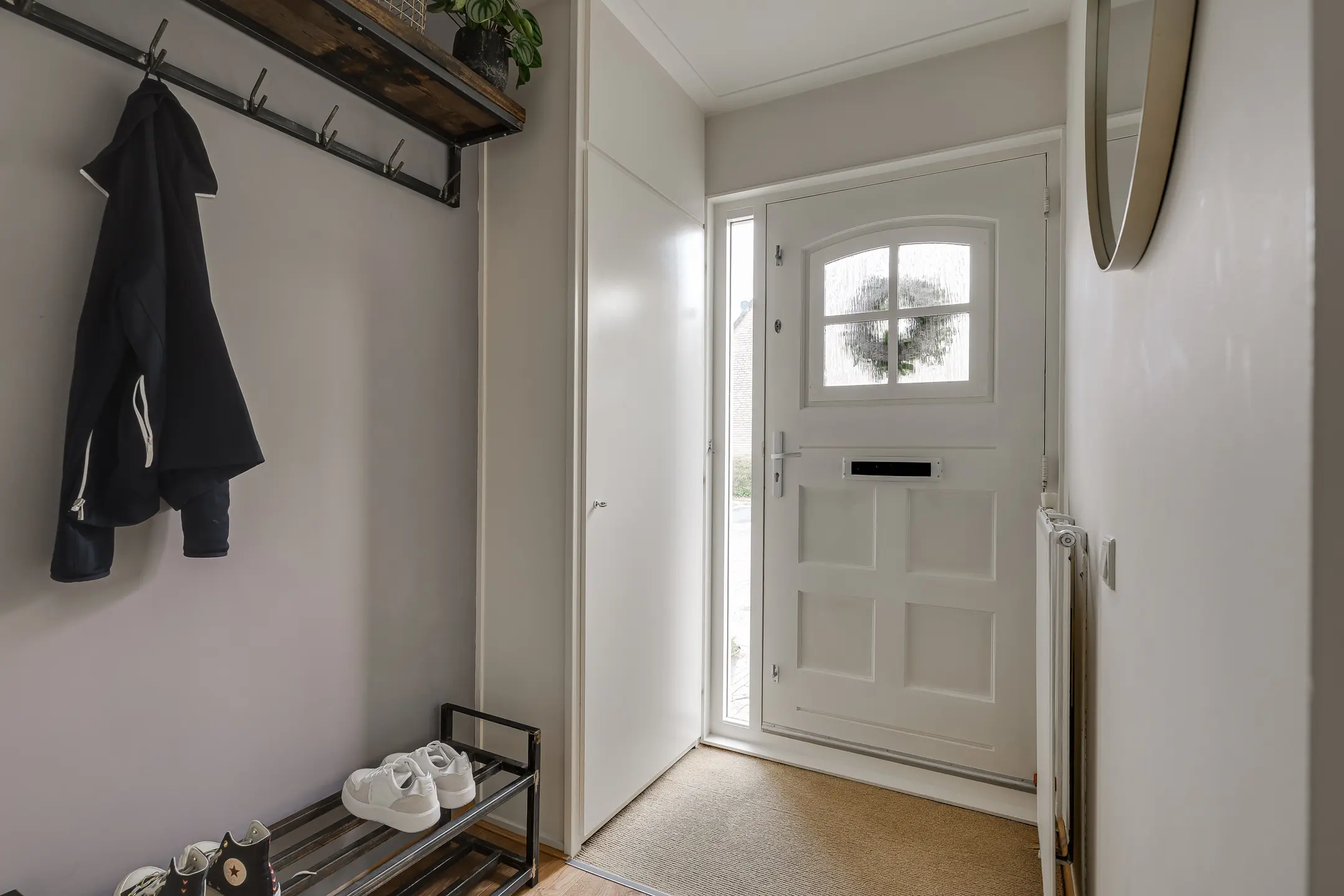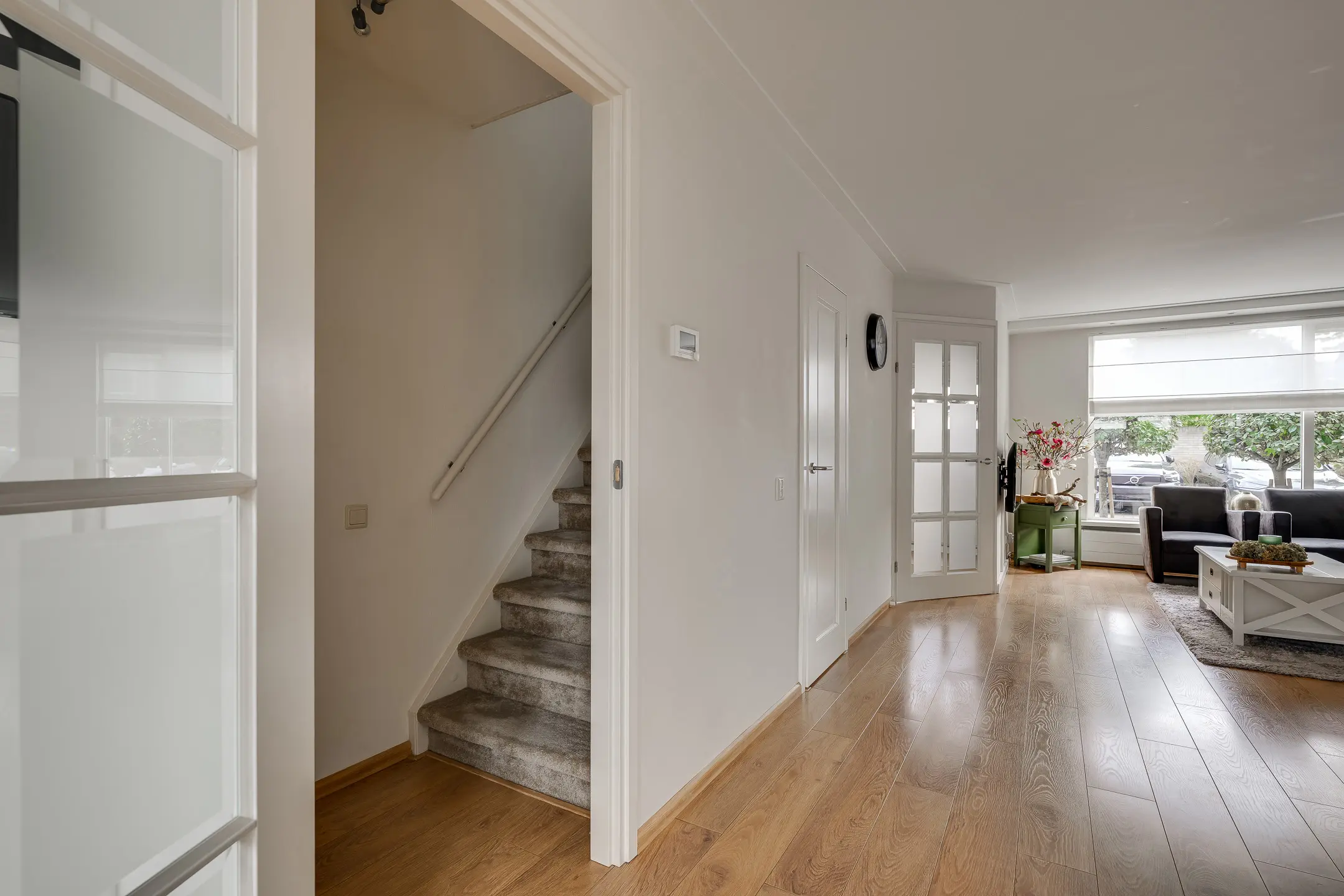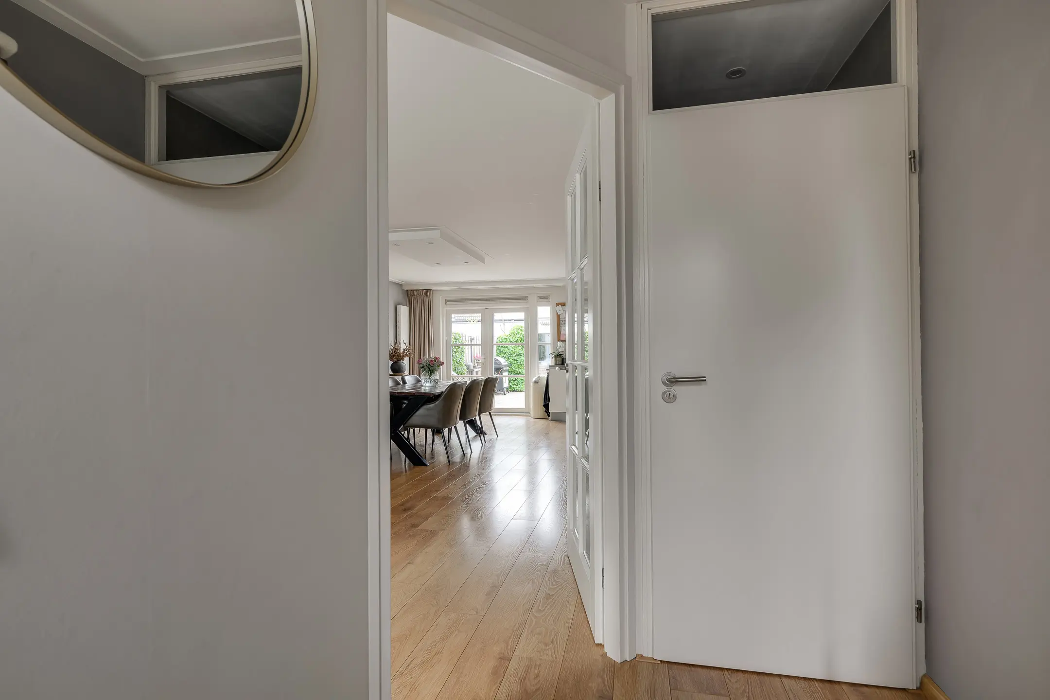 Entree woning in hal met meterkast en toiletruimte (vernieuwd in mei 2023). Loopdeur naar de doorzonwoonkamer, waar de sfeervolle laminaatvloer en fraaie paneeldeuren direct in het oog vallen en een goede eerste indruk maken.