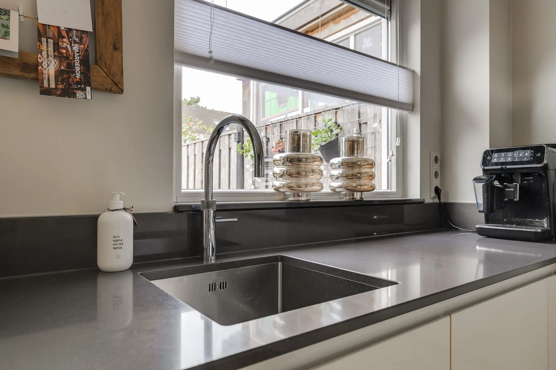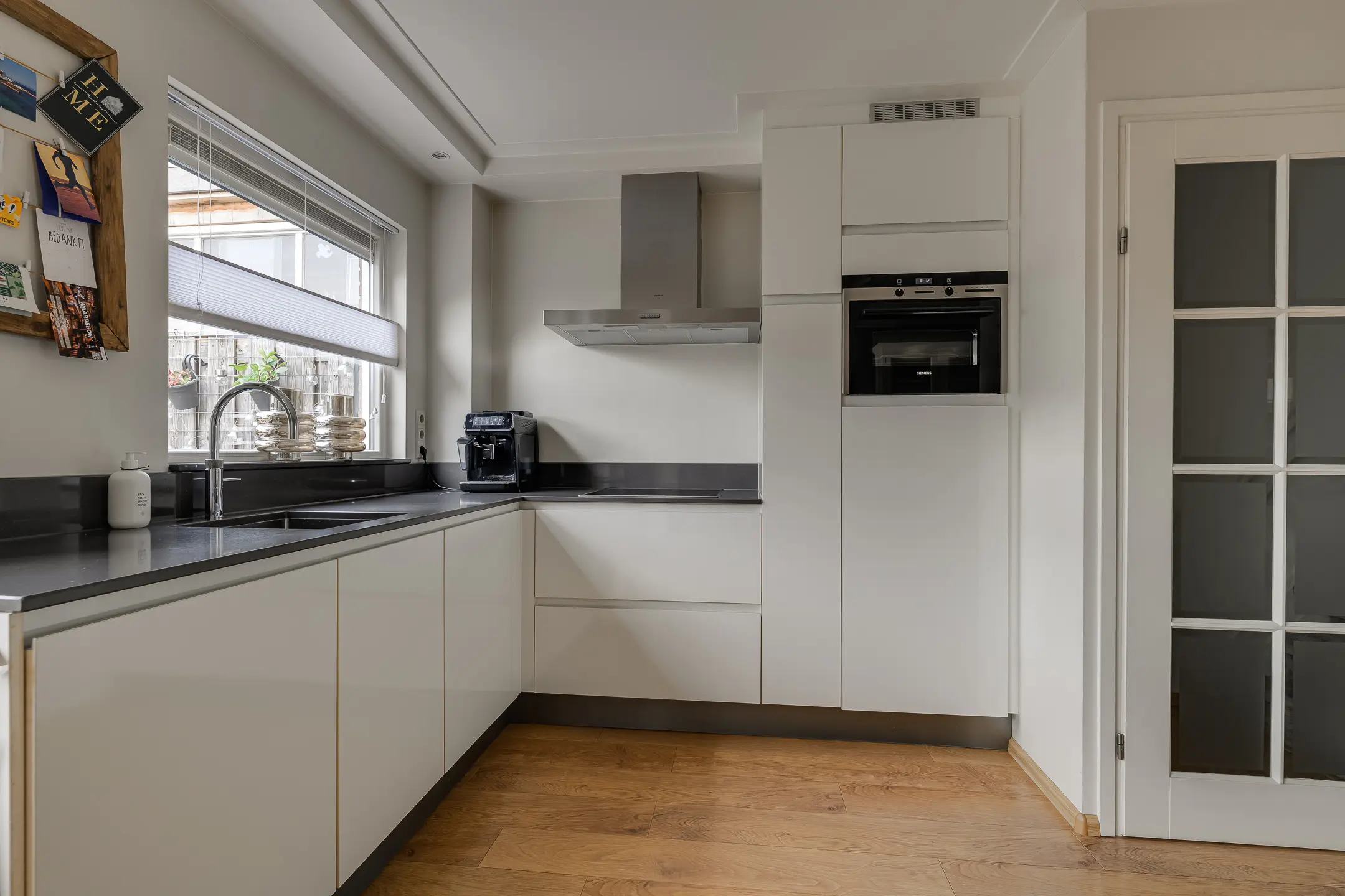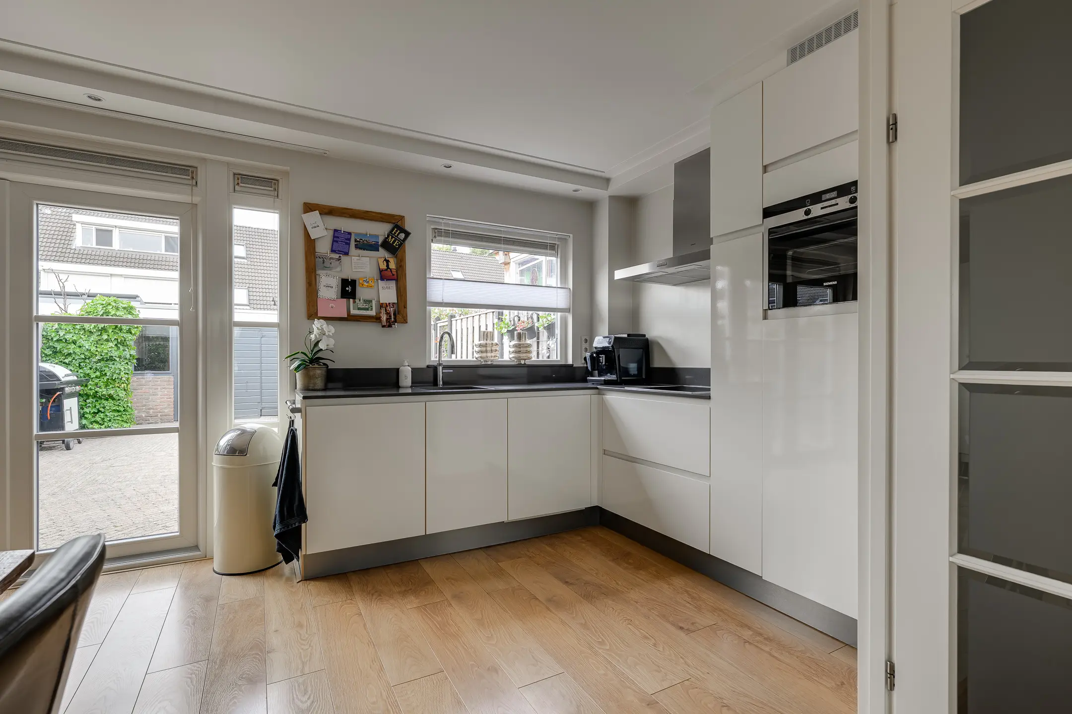 De keuken aan de tuinzijde is in L-opstelling en beschikt naast voldoende bergruimte en composiet werkblad ook over inbouwapparatuur van Siemens; een inductiekookplaat met RVS afzuigkap, koelkast, vriezer, combi-oven, vaatwasser en kokend waterkraan.