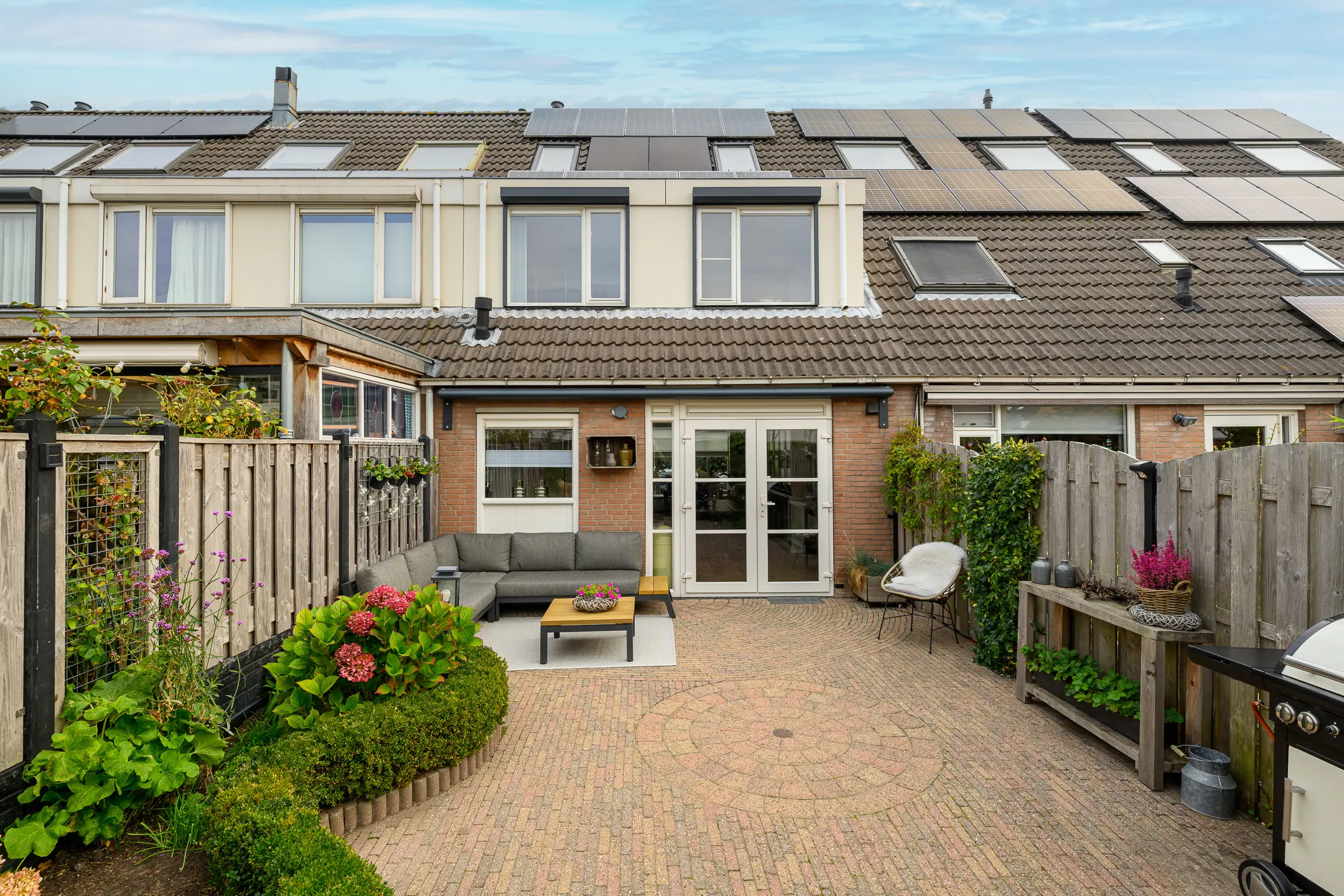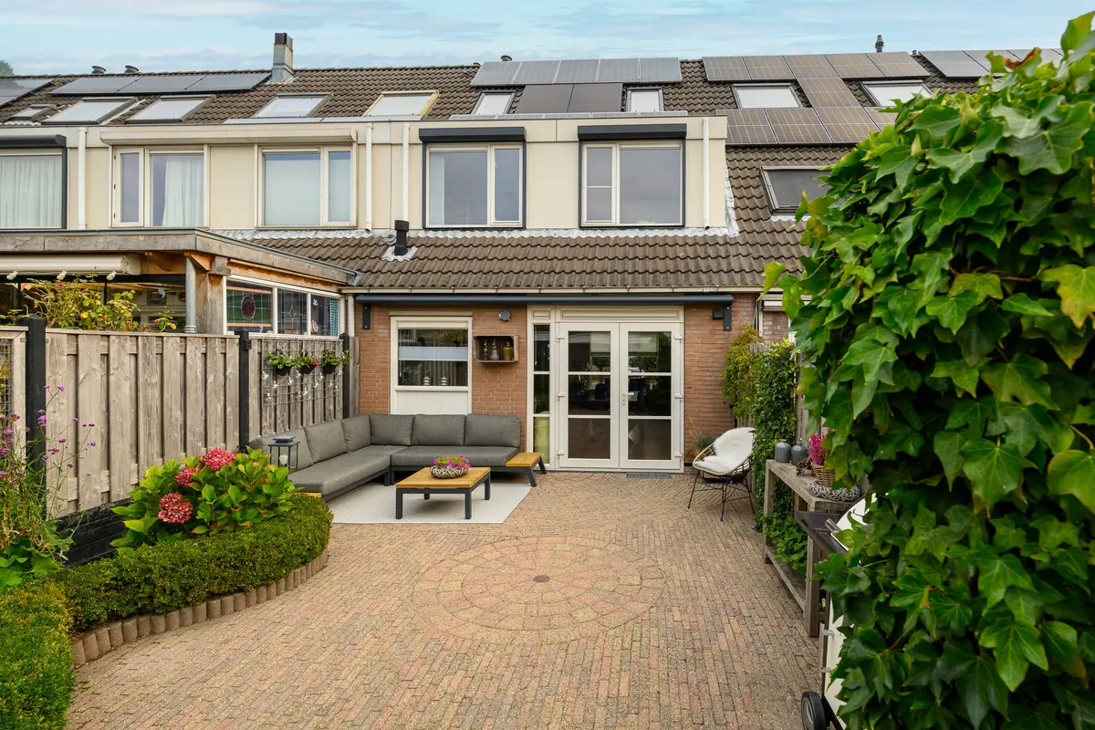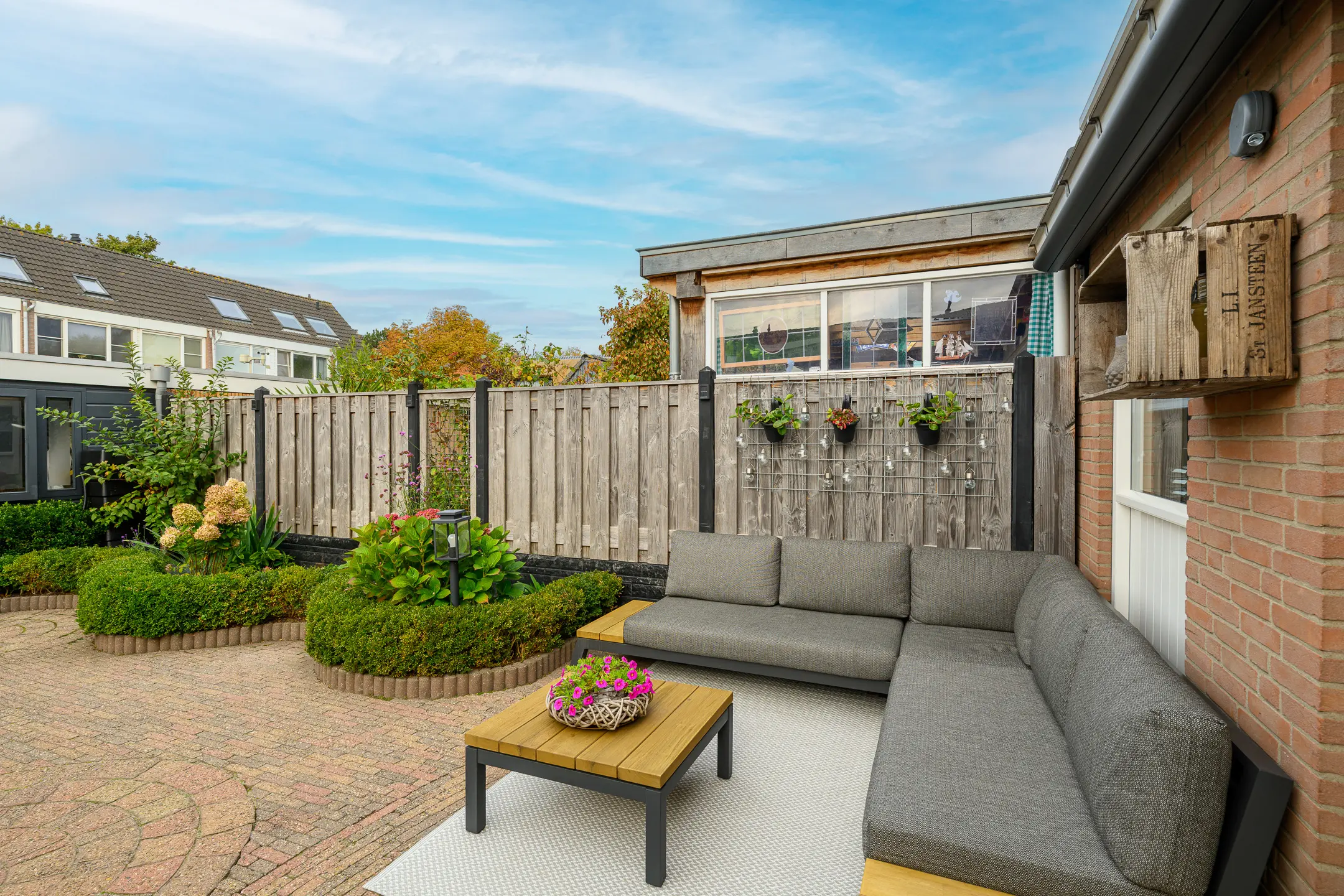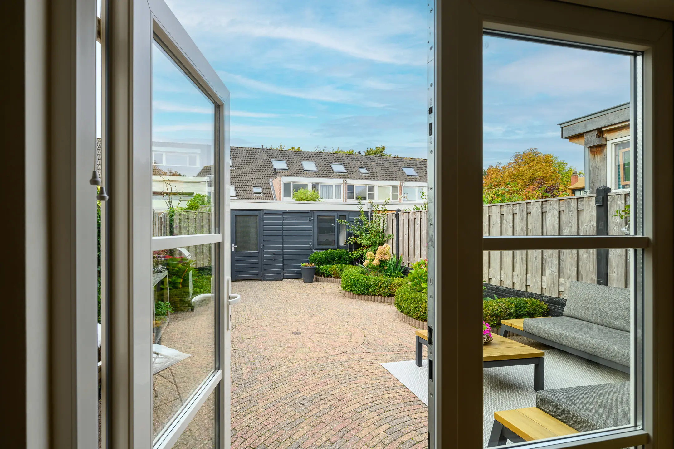 Openslaande deuren leiden naar de keurig verzorgde tuin, grotendeels bestraat met aan de zijkant diverse beplanting in een gezellige ronding.