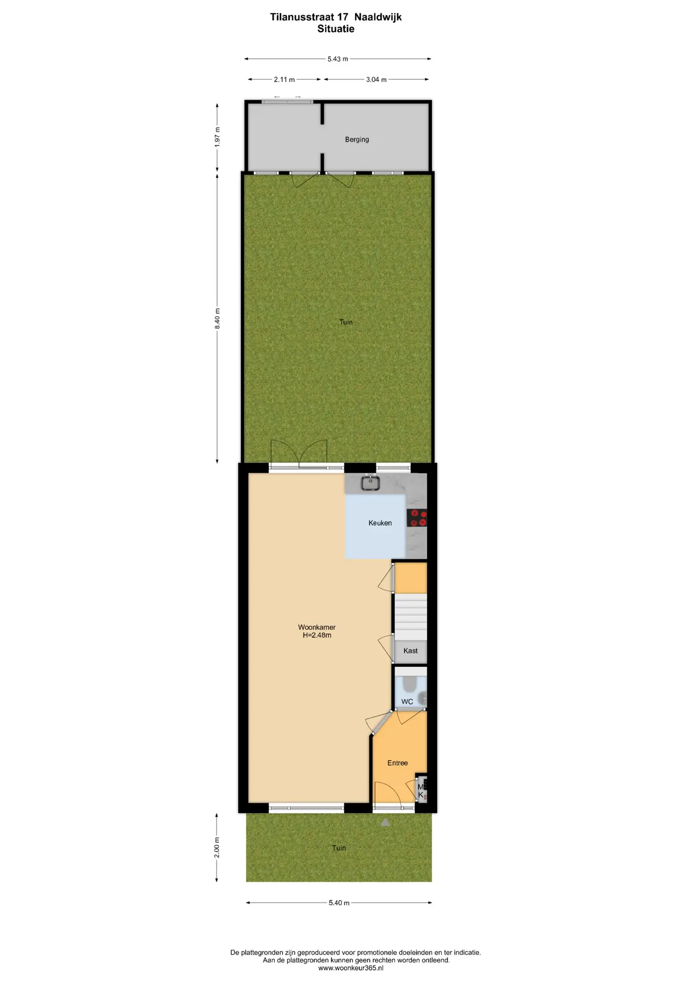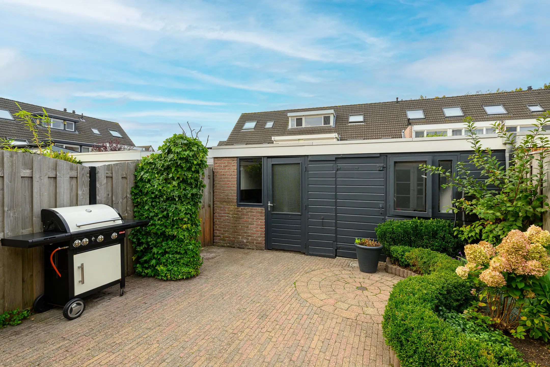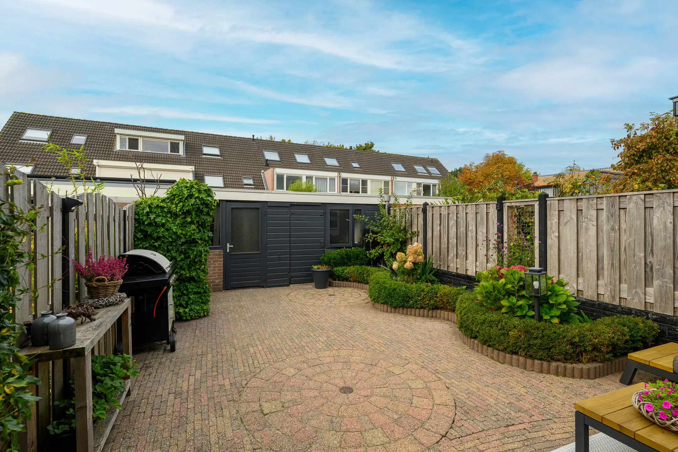 Achterin de tuin is een dubbele berging (steen en hout) over de gehele breedte van de tuin, voorzien van elektra, waarvan de stenen berging ook een achterom biedt.