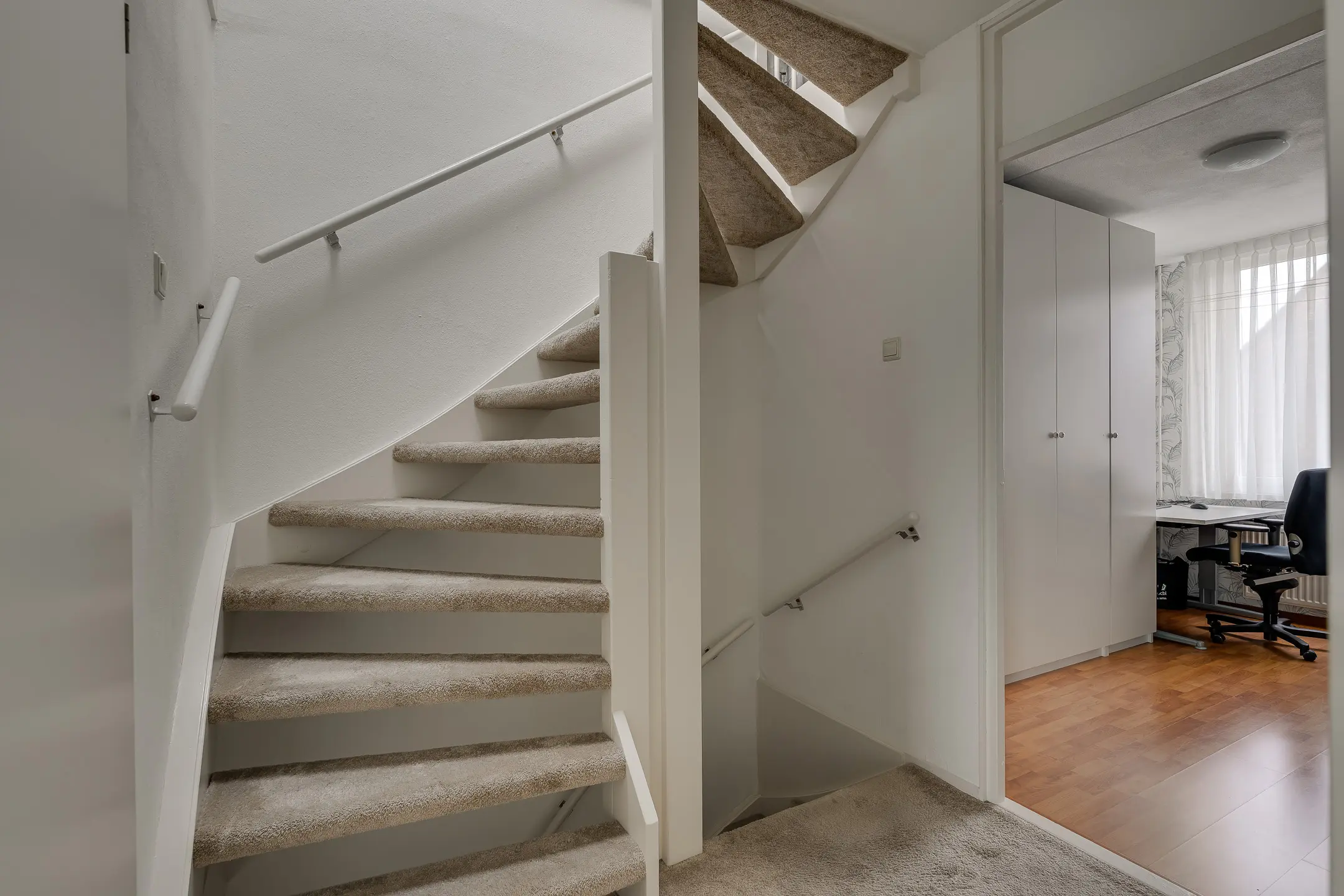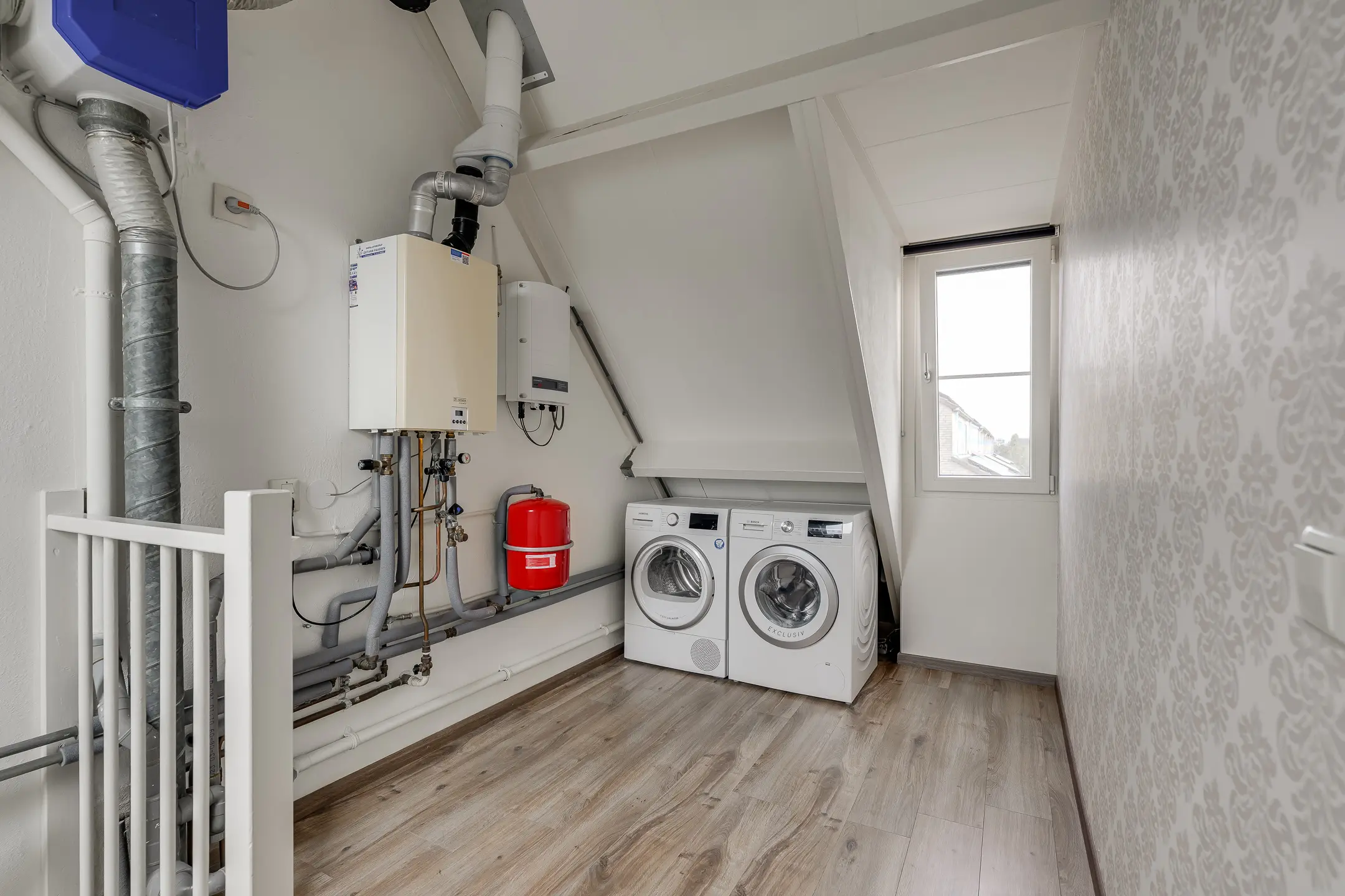 Vaste, open trap naar de overloop op zolder, waar zich de aansluiting voor wasmachine en droger, alsmede de installatie van de mechanische ventilatie en cv-ketel is gevestigd.