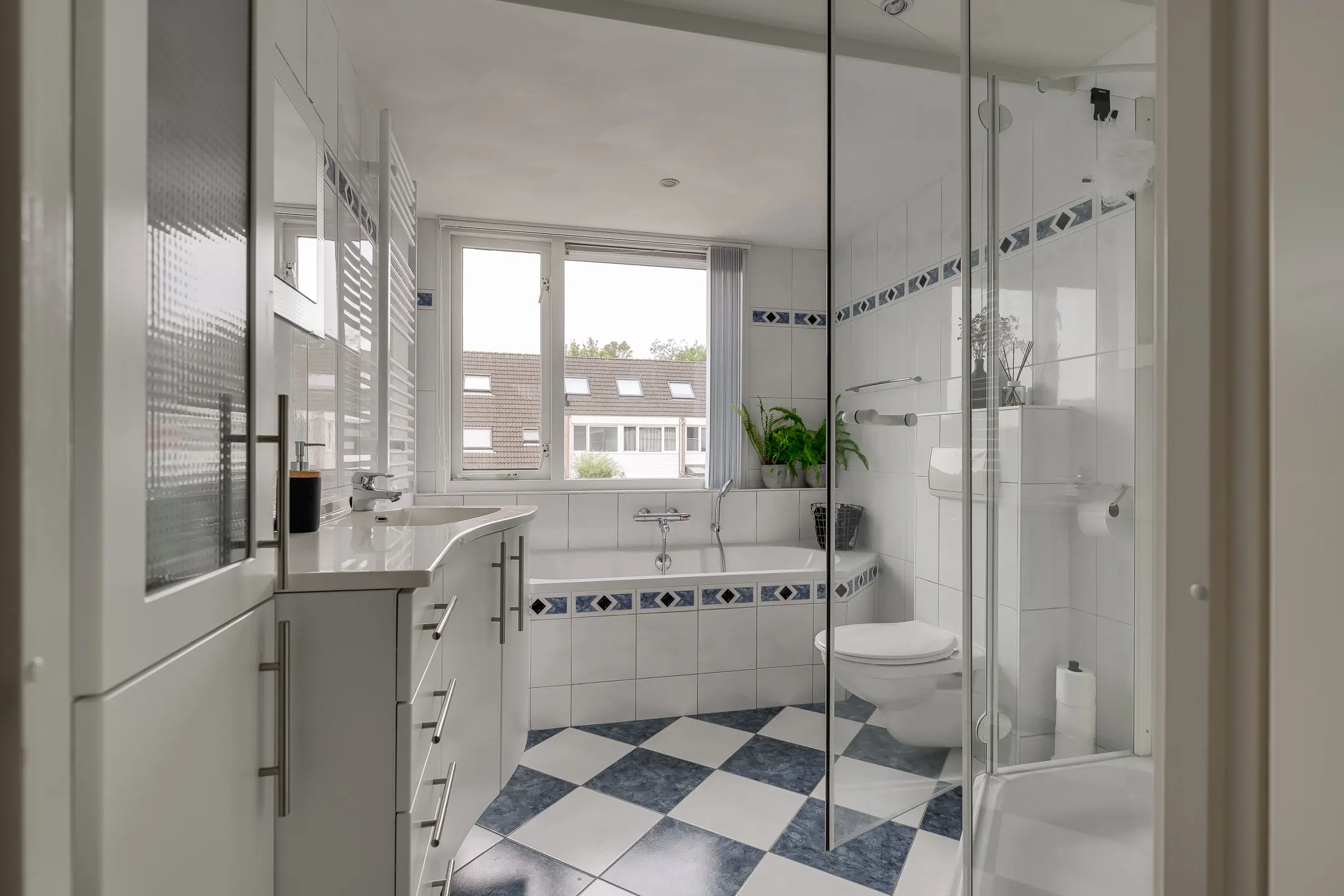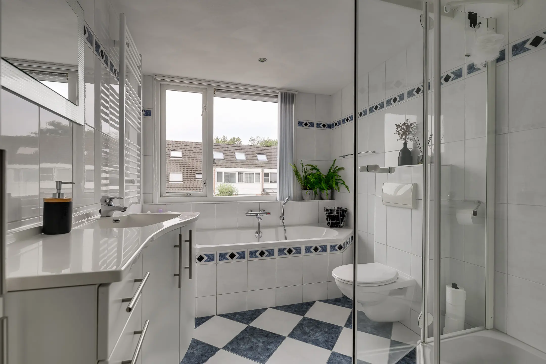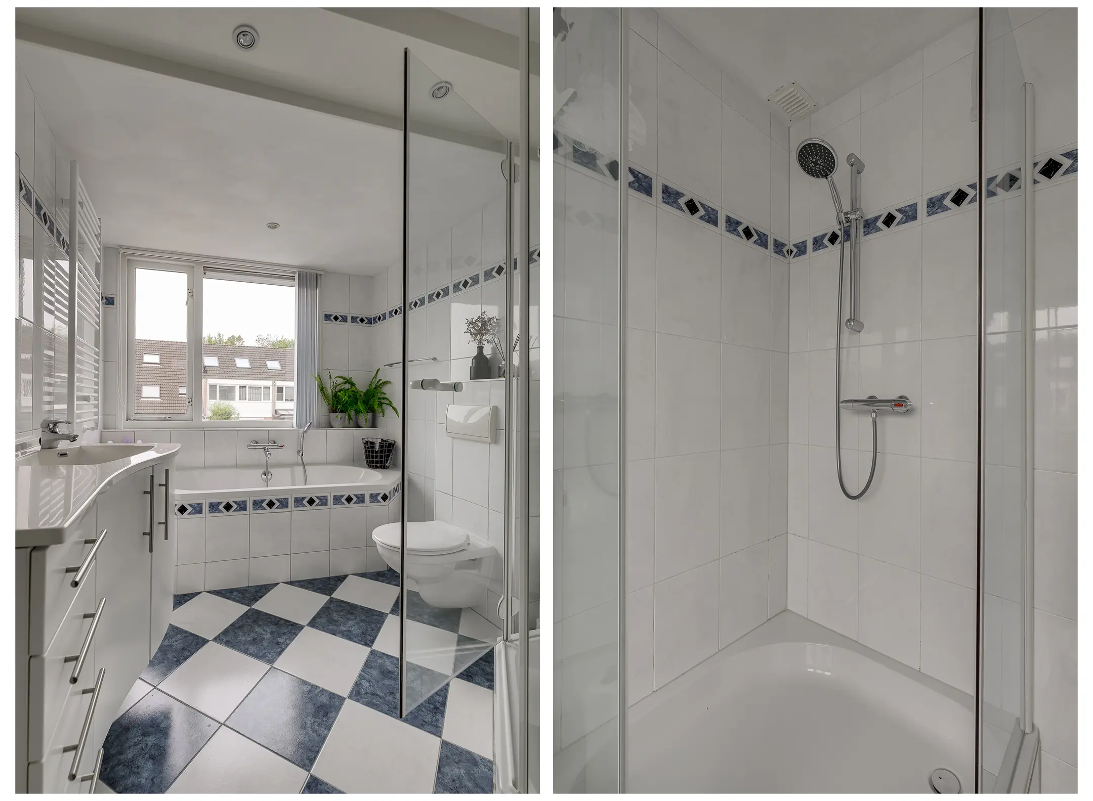- Compleet ingerichte badkamer met ligbad, douchecabine, wastafelmeubel en toilet;