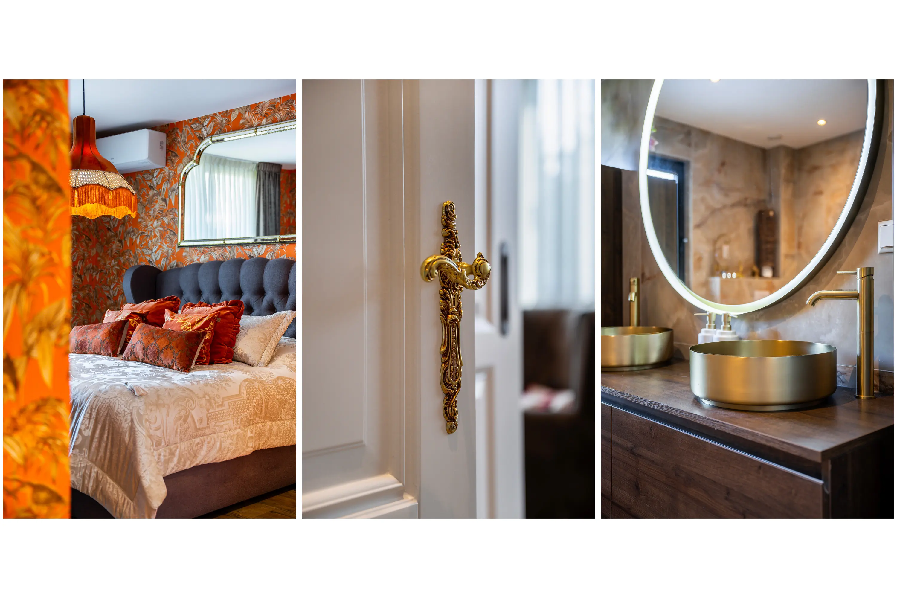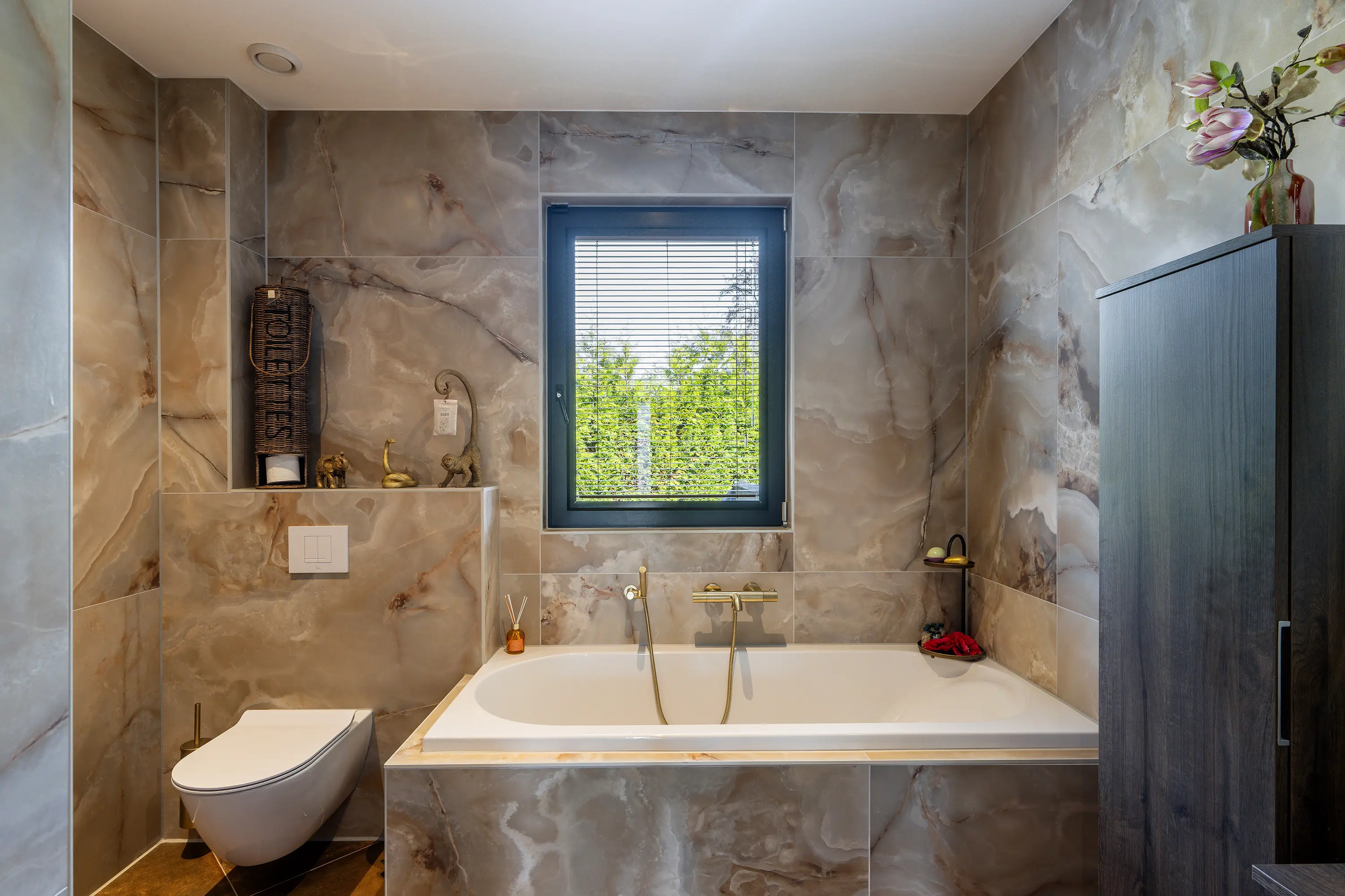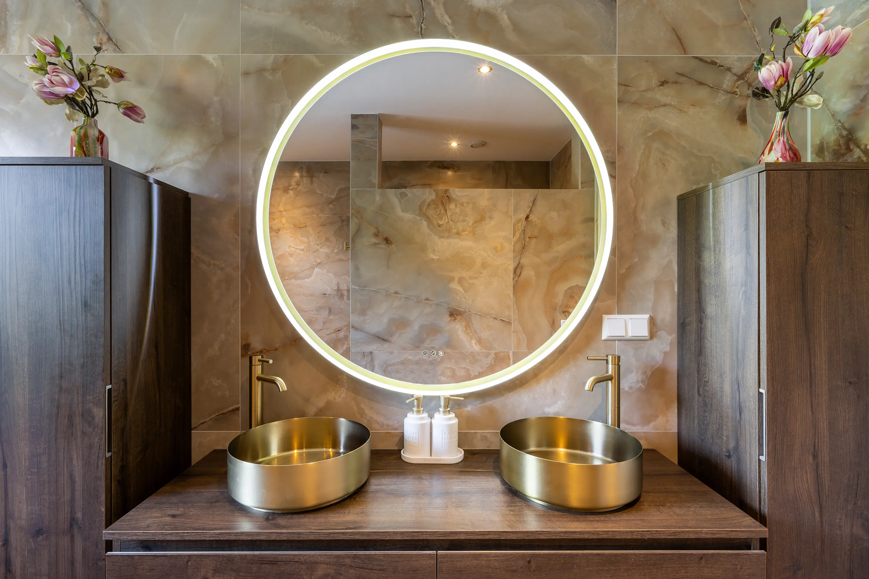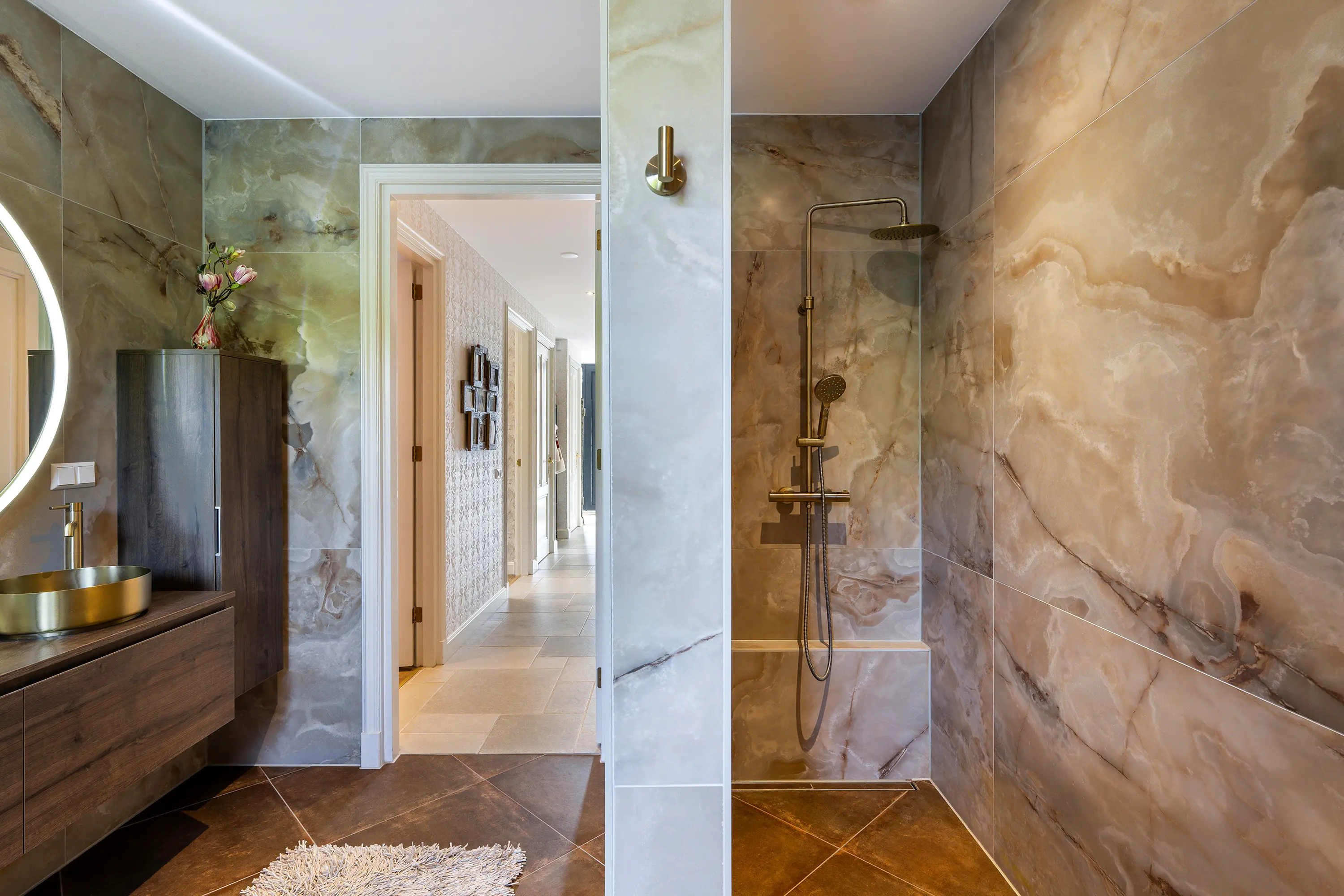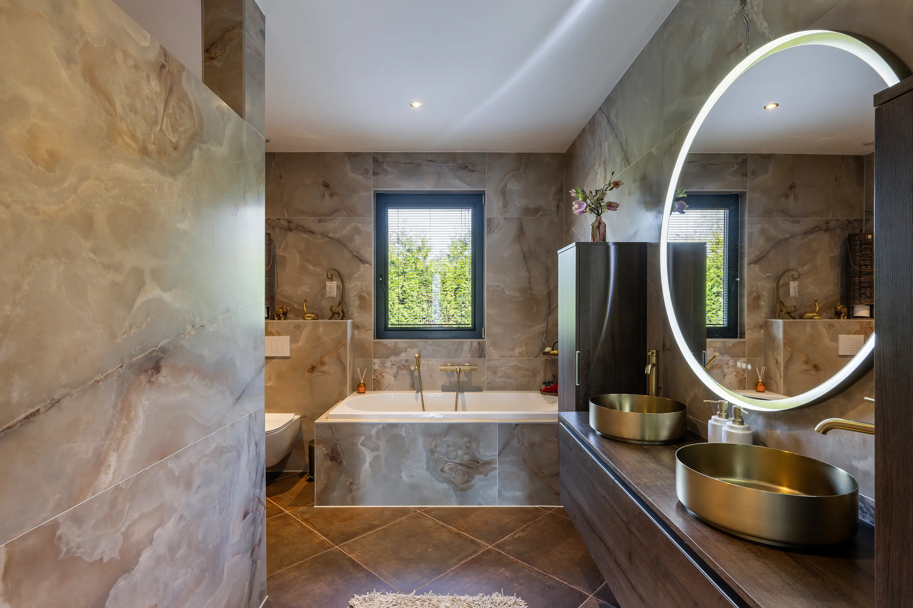 De badkamer straalt pure luxe uit en is hoogwaardig afgewerkt met tegels en stijlvolle goudkleurige details. De ruimte is compleet ingericht met een ligbad, een royale inloopdouche en een toilet. De dubbele wastafel met goudkleurige kranen en stijlvolle waskommen is geplaatst op een donker houten wastafelmeubel, wat zorgt voor een warme en luxe uitstraling. Daarnaast bieden twee hoge kasten volop praktische opbergruimte. De grote ronde spiegel met geïntegreerde verlichting maakt het geheel compleet en geeft de badkamer een moderne, hotel-chique sfeer.