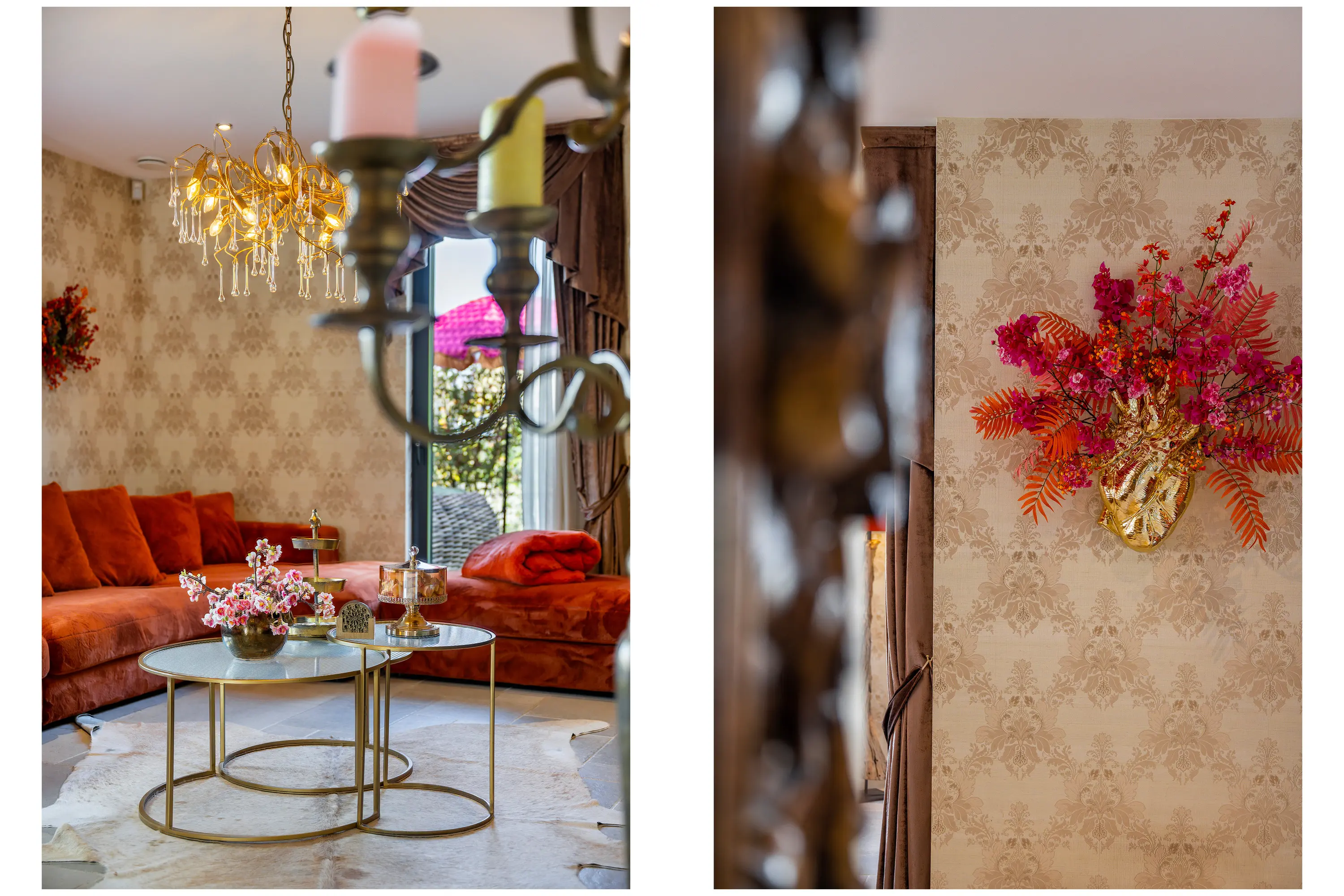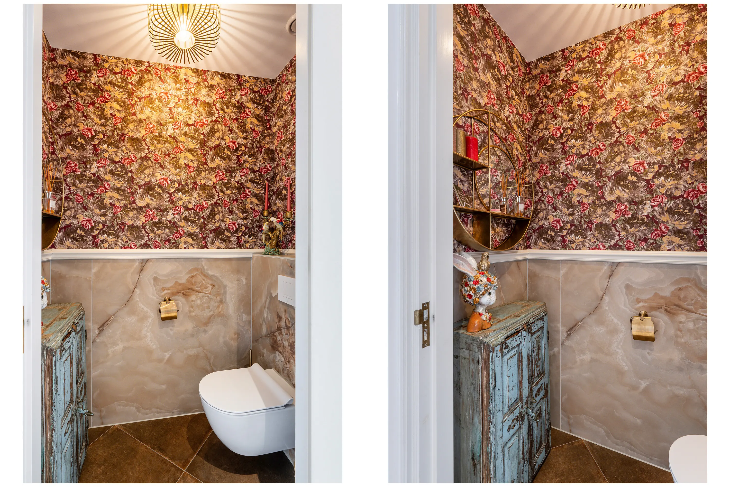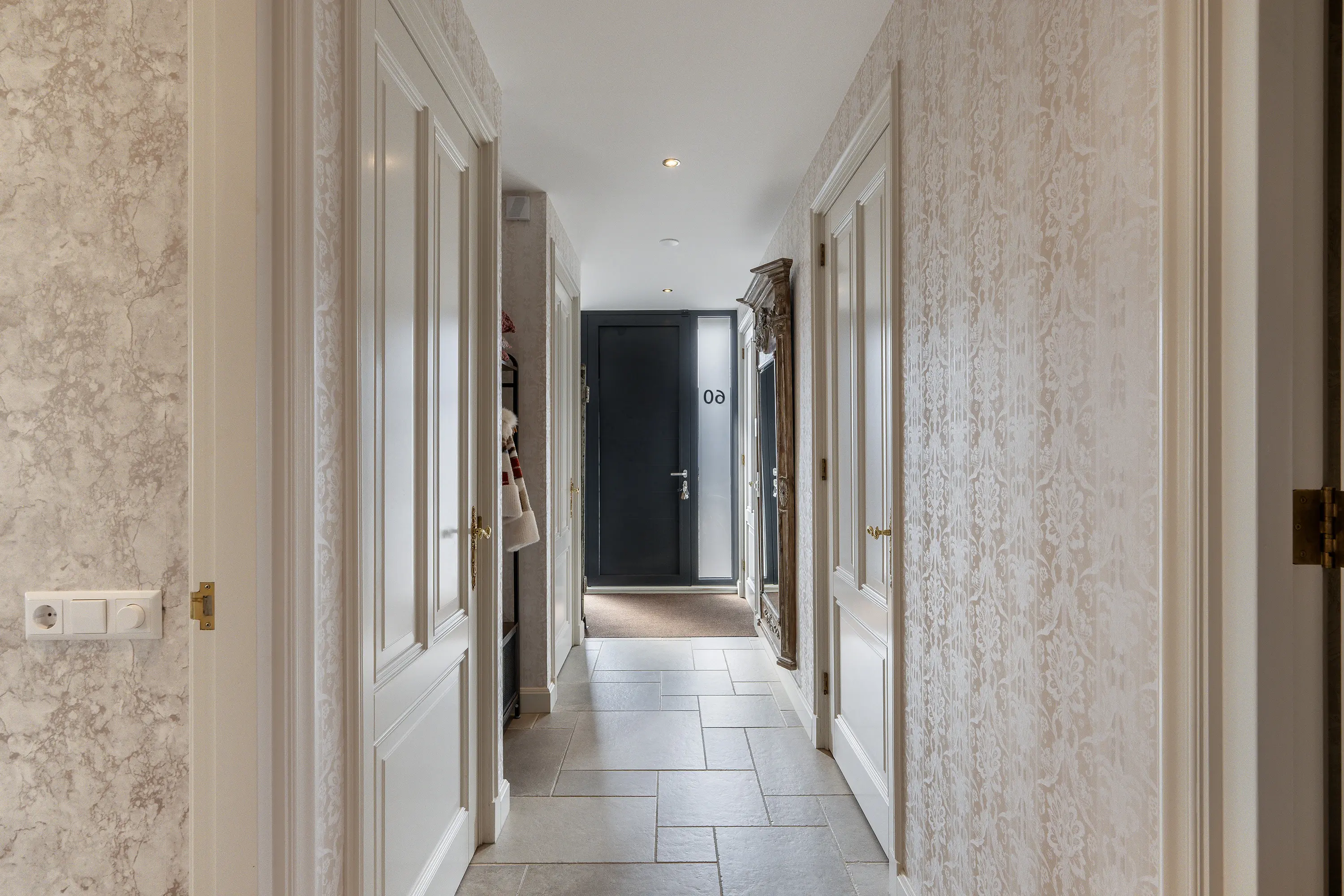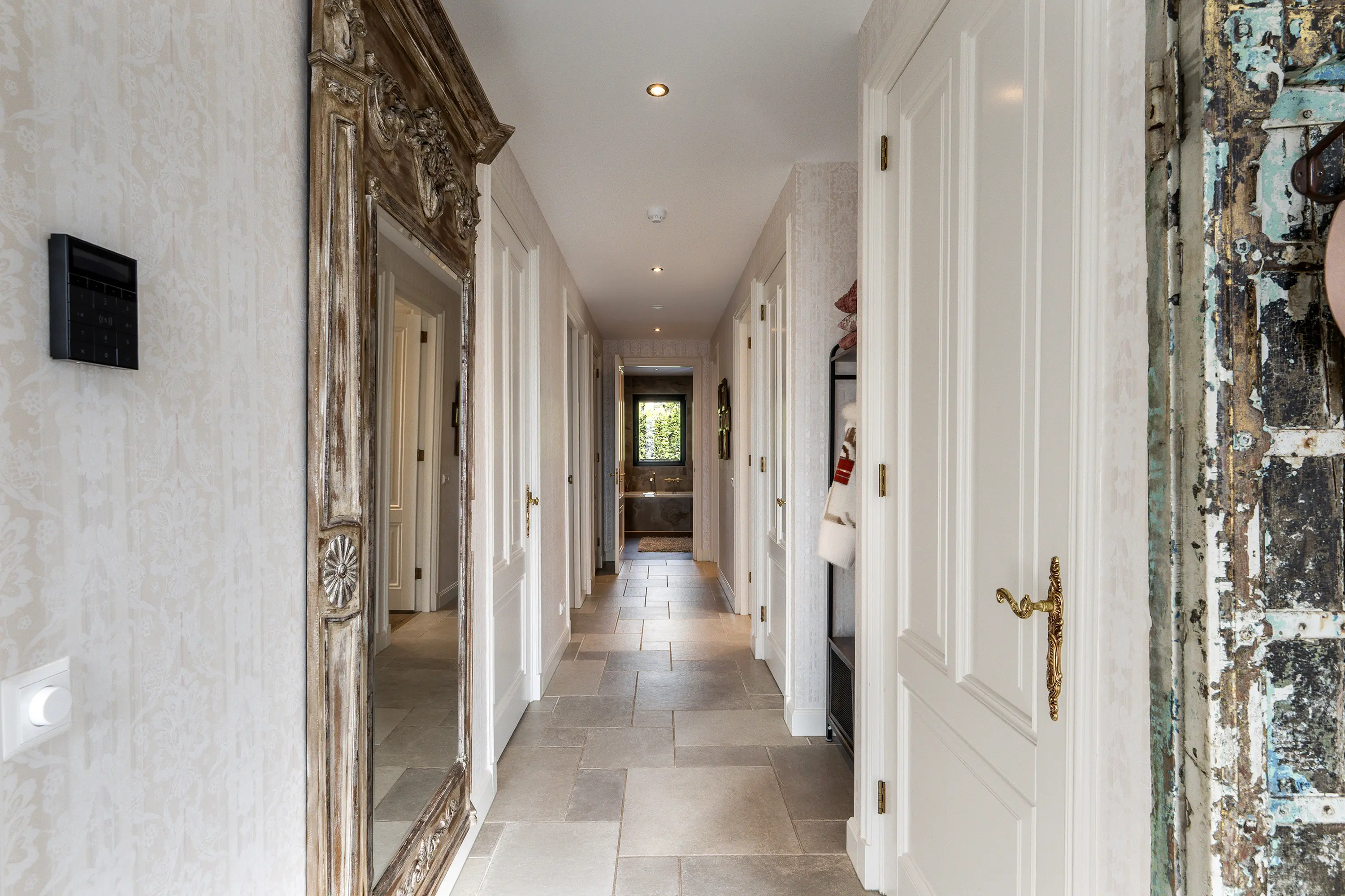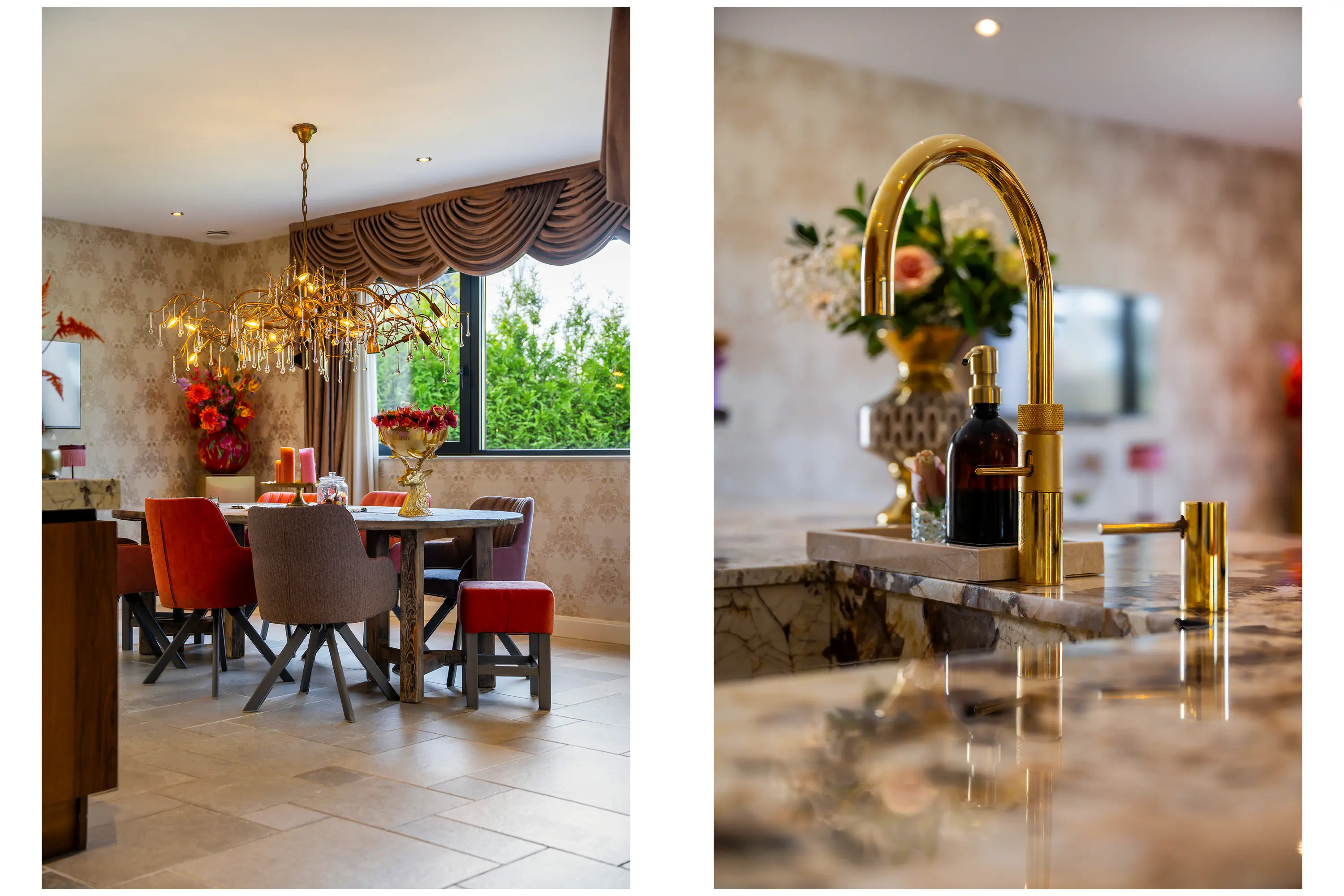 De badkamer straalt pure luxe uit en is hoogwaardig afgewerkt met tegels en stijlvolle goudkleurige details. De ruimte is compleet ingericht met een ligbad, een royale inloopdouche en een toilet. De dubbele wastafel met goudkleurige kranen en stijlvolle waskommen is geplaatst op een donker houten wastafelmeubel, wat zorgt voor een warme en luxe uitstraling. Daarnaast bieden twee hoge kasten volop praktische opbergruimte. De grote ronde spiegel met geïntegreerde verlichting maakt het geheel compleet en geeft de badkamer een moderne, hotel-chique sfeer.