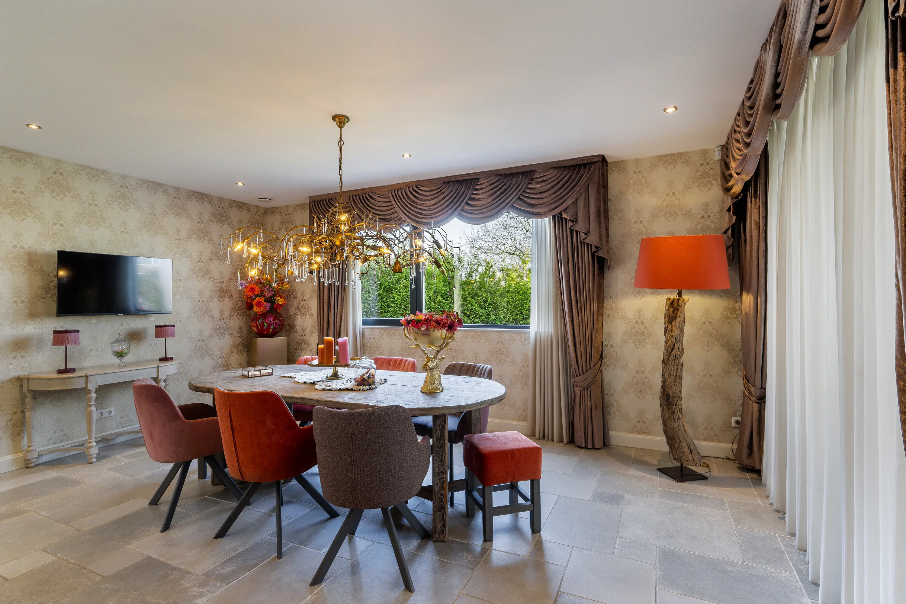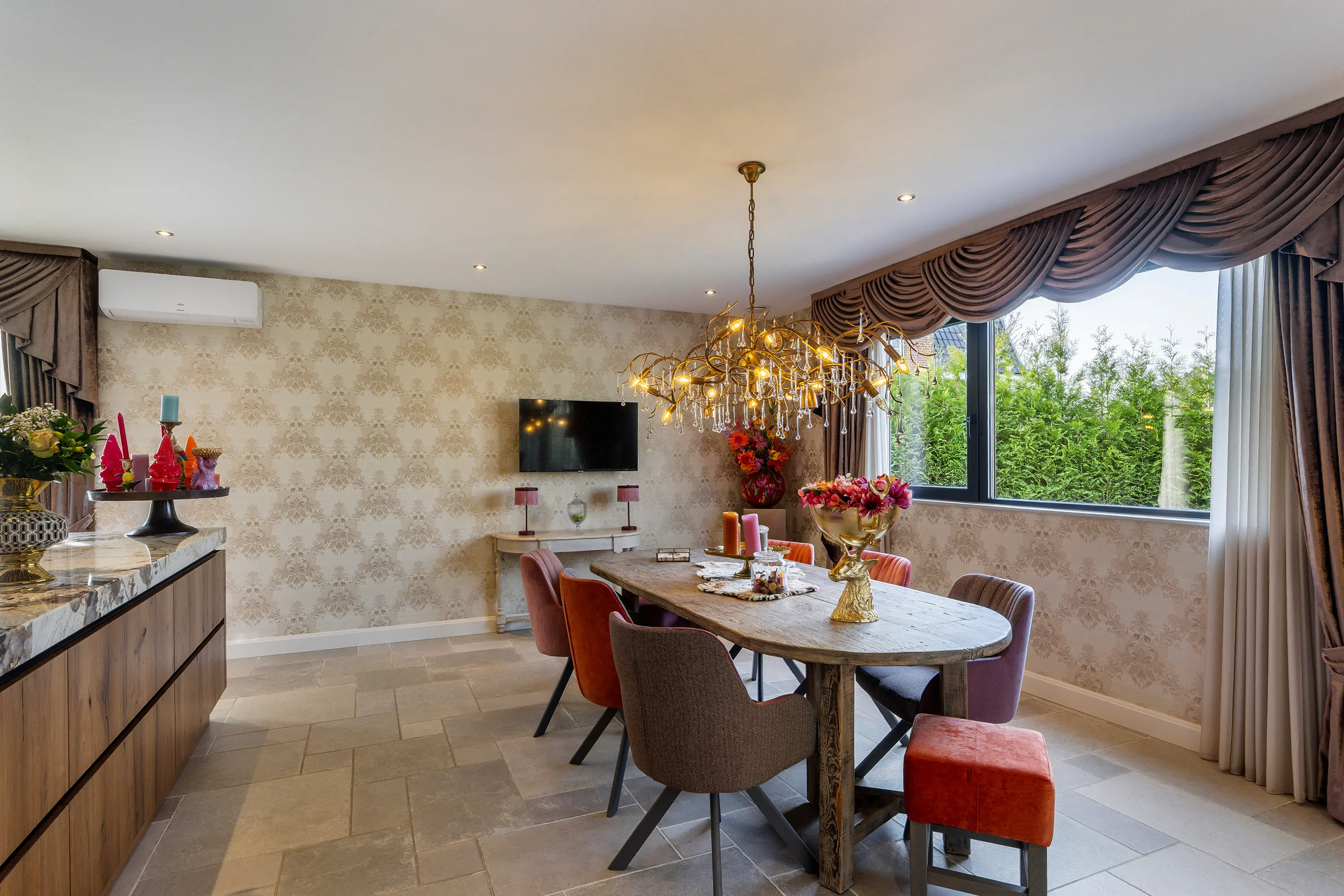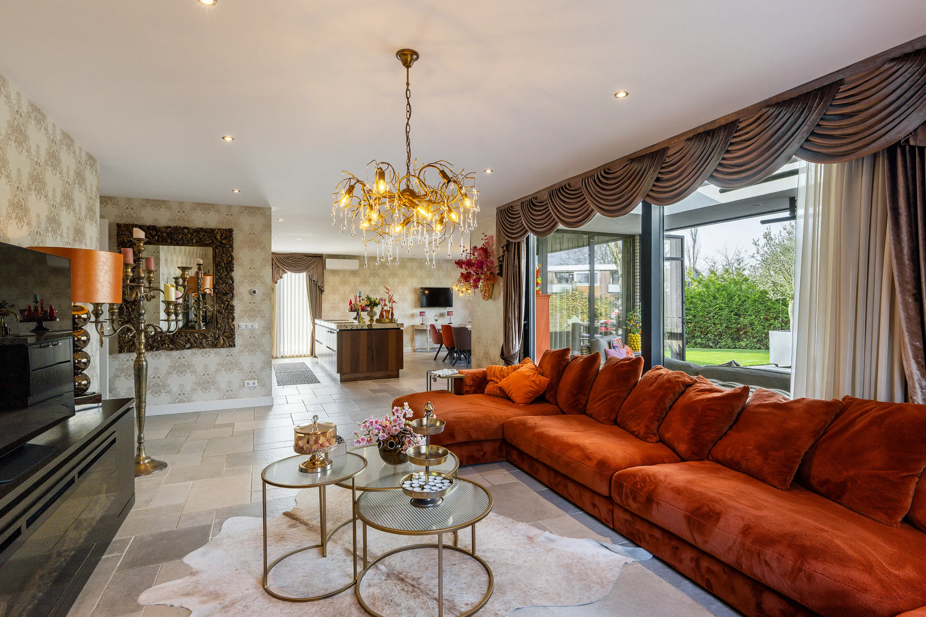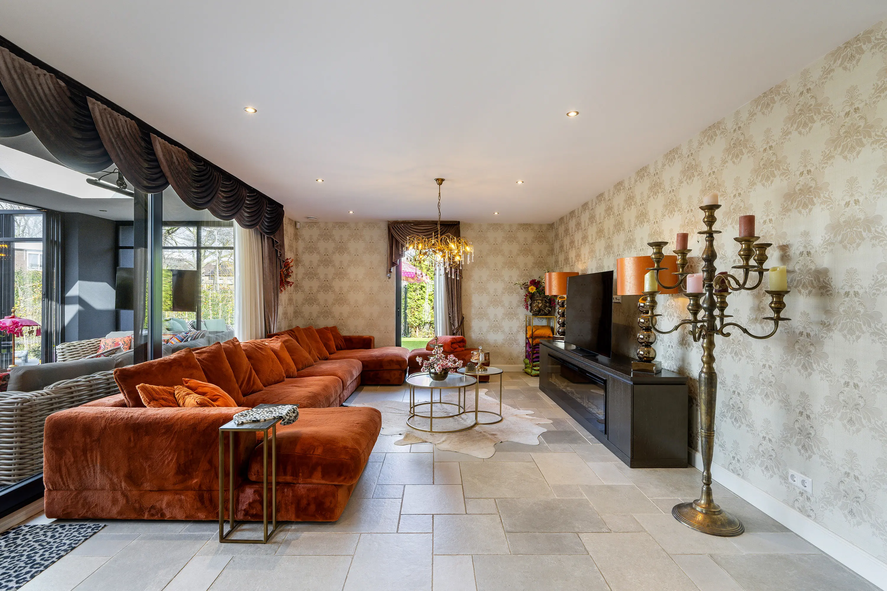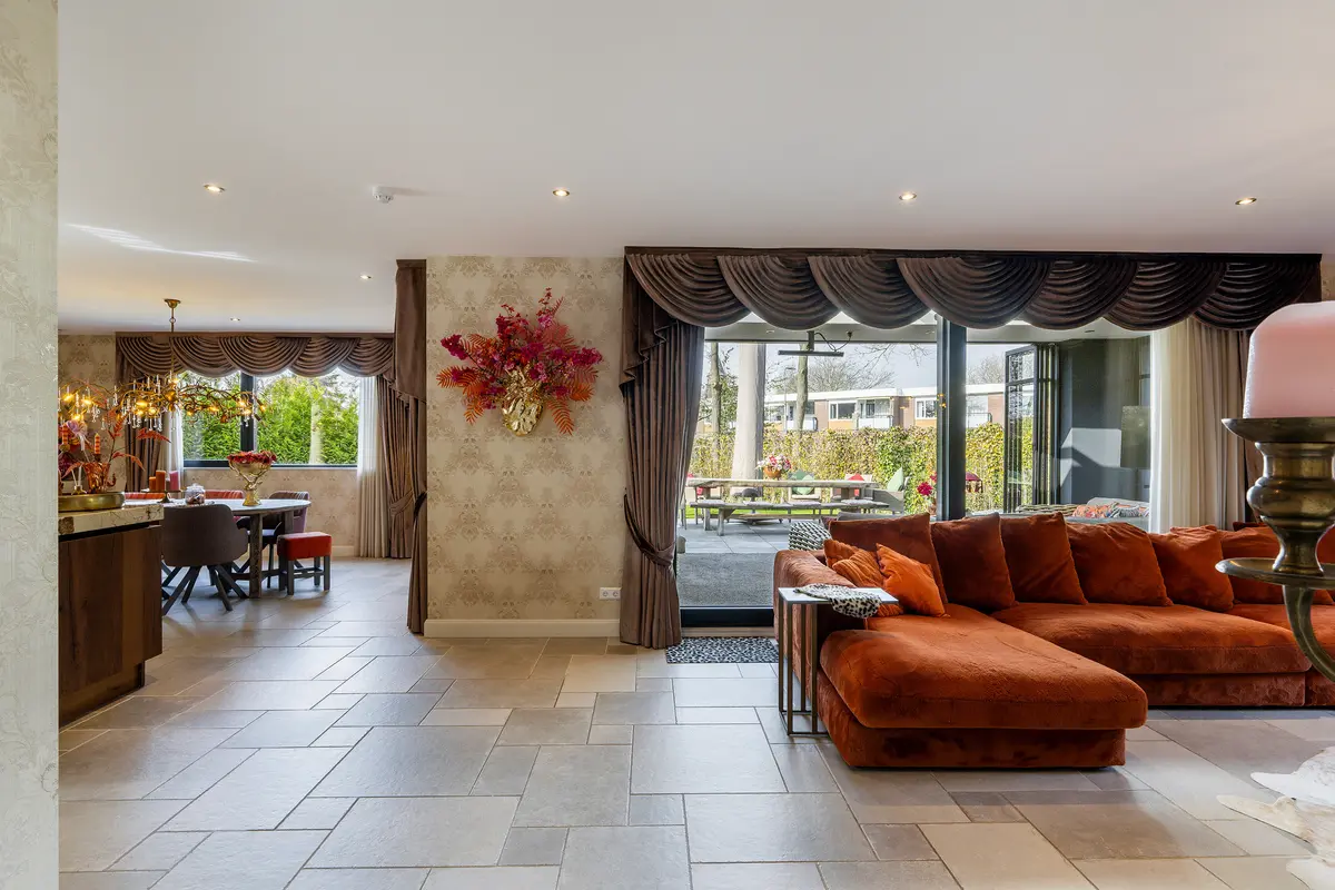 De royale woonkamer is een heerlijke leefruimte met veel natuurlijke lichtinval dankzij de grote raampartijen. De ruimte is modern en stijlvol afgewerkt met strak gestucte wanden en plafonds en voorzien van inbouwspots. Op de vloer ligt een fraaie plavuizen vloer met comfortabele vloerverwarming, welke door de gehele woning is door gelegd. Voor extra comfort is de woonkamer bovendien uitgerust met airconditioning, waardoor het hier in elk seizoen aangenaam verblijven is.