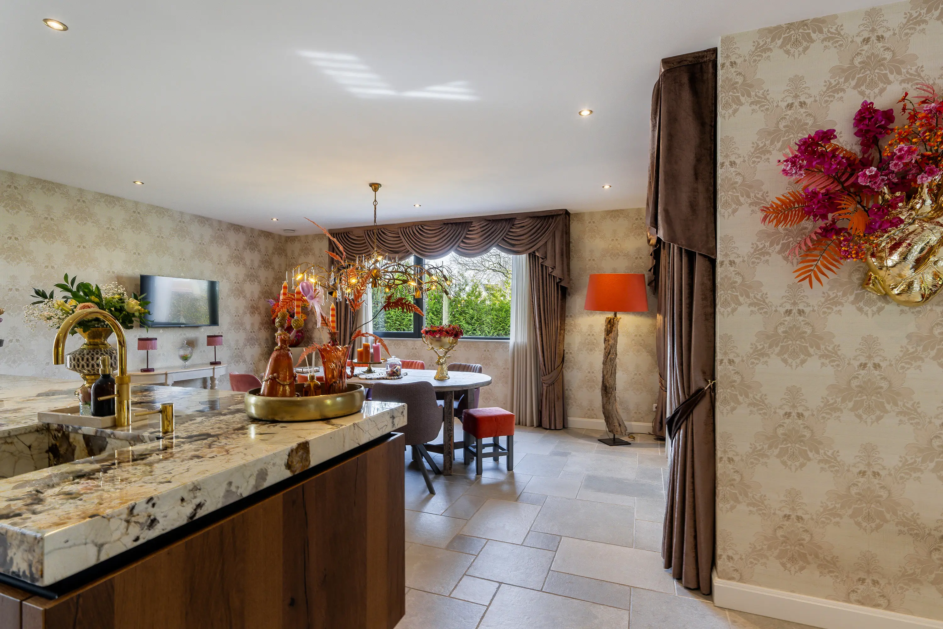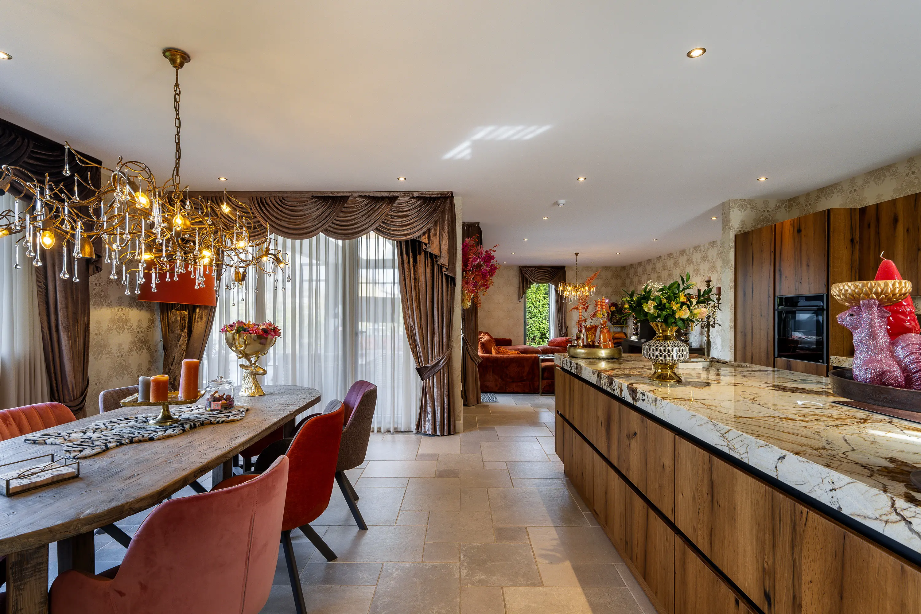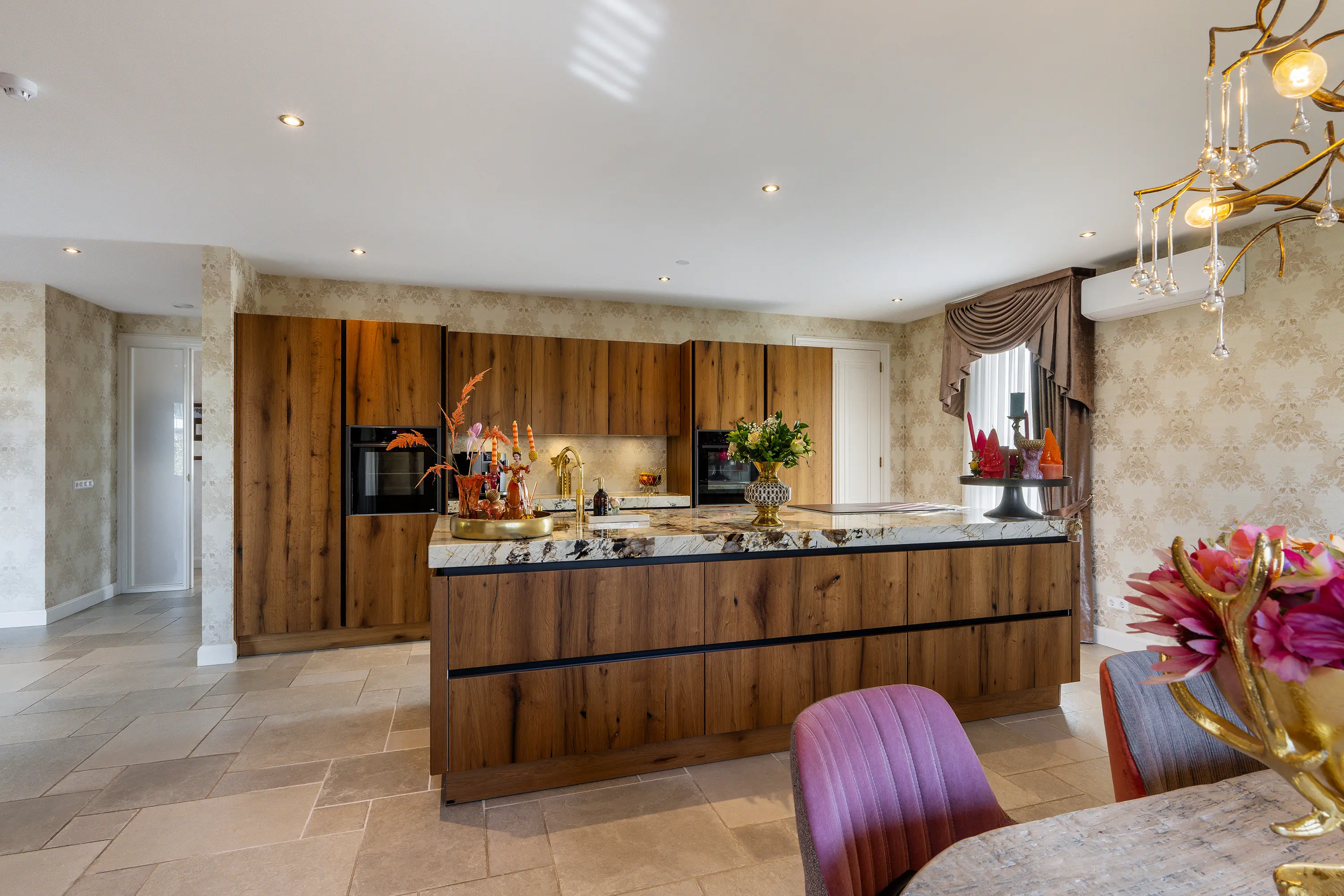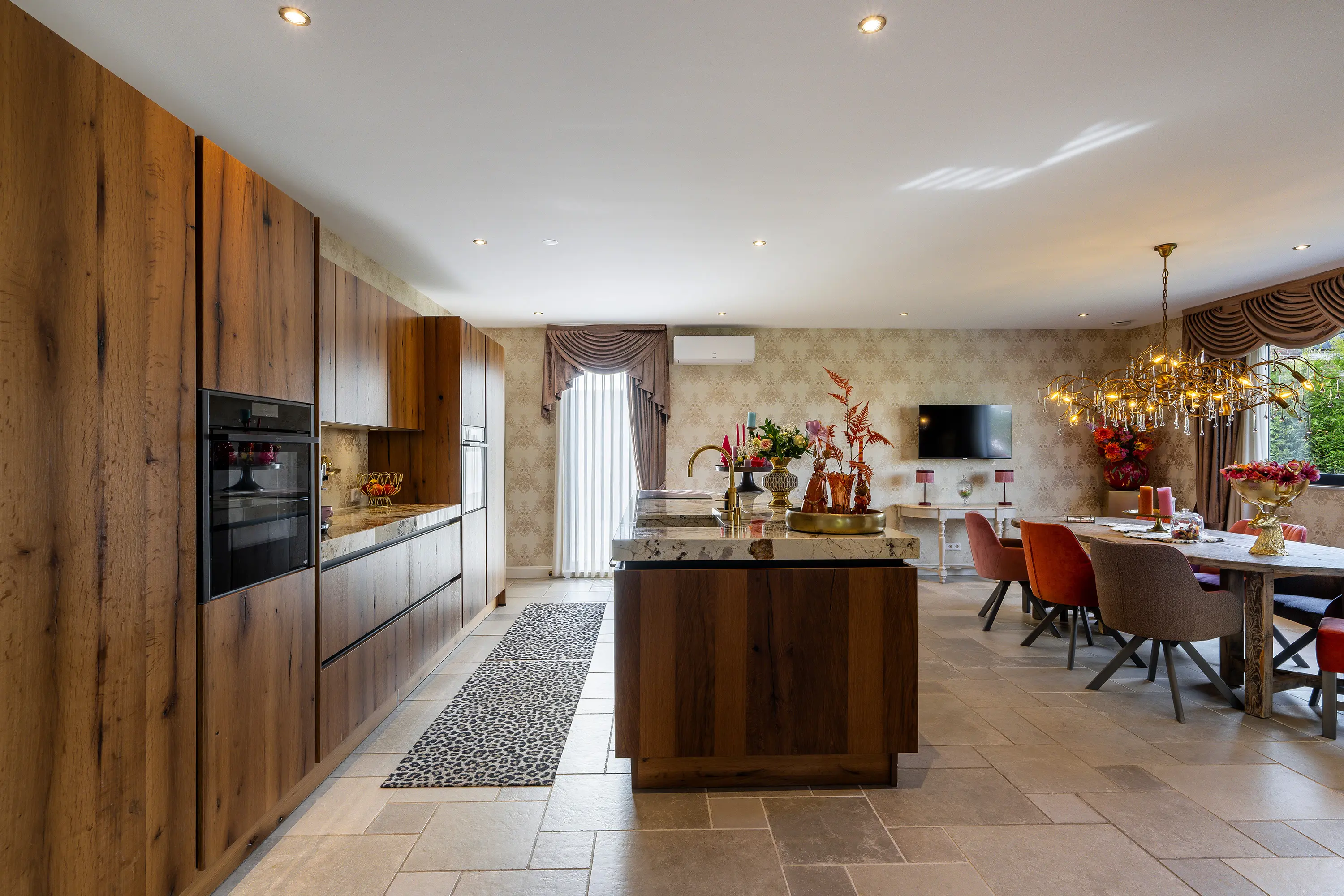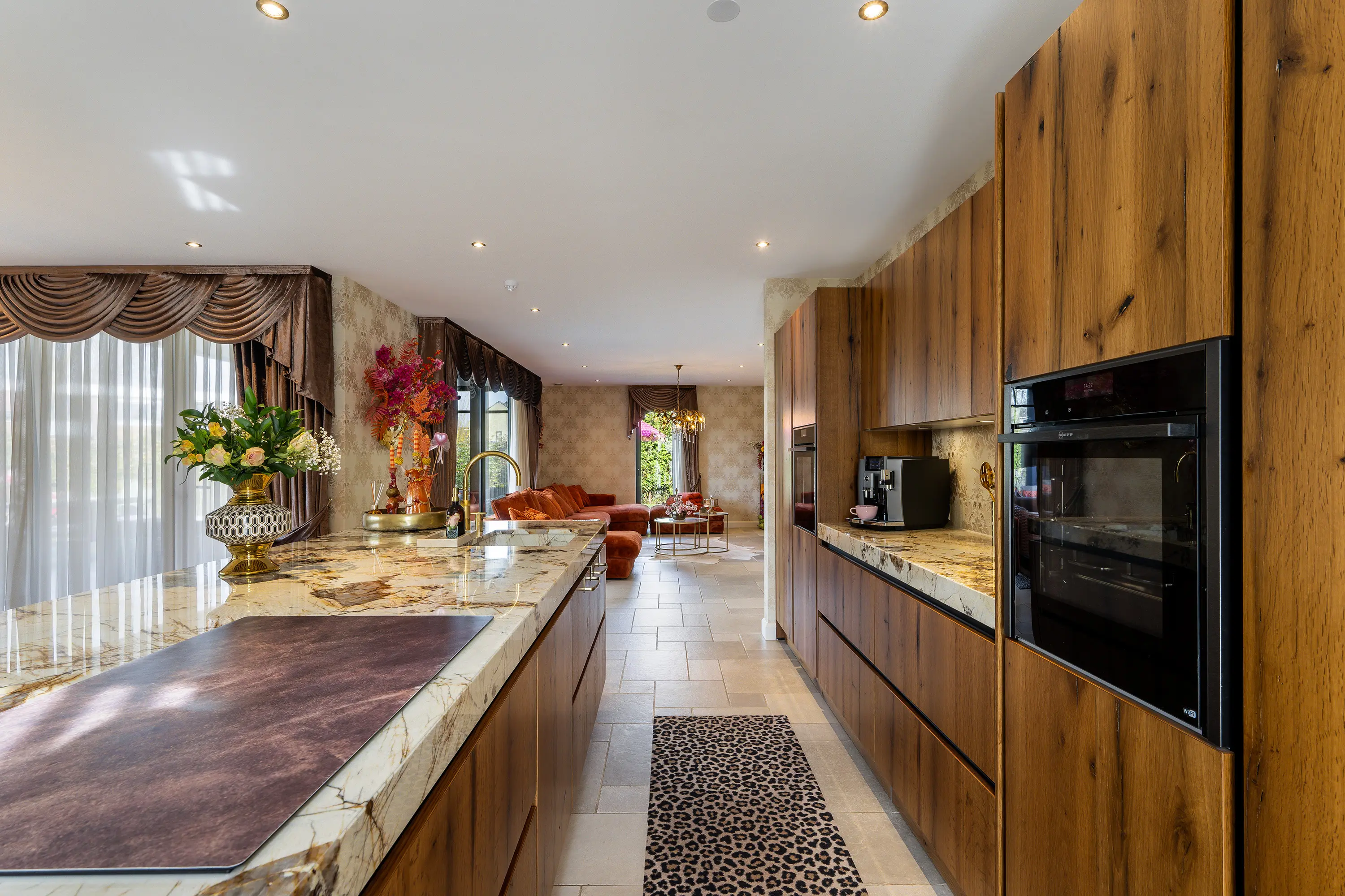 De woning beschikt over een prachtige leefkeuken met kookeiland, een echte blikvanger voor kookliefhebbers en een centrale plek in huis waar wonen en koken samenkomen. De moderne keuken is voorzien van hoogwaardige inbouwapparatuur, waaronder een inductiekookplaat met geïntegreerde afzuiging, twee ovens, een koelkast, en een vaatwasser. Het luxe natuurstenen werkblad met geïntegreerde spoelbak wordt stijlvol gecombineerd met een goudkleurige Quooker, wat de keuken een exclusieve uitstraling geeft. De eikenhouten kasten bieden daarnaast zeer veel opbergruimte en maken het geheel compleet. Een keuken waar zowel functionaliteit als design perfect samenkomen.