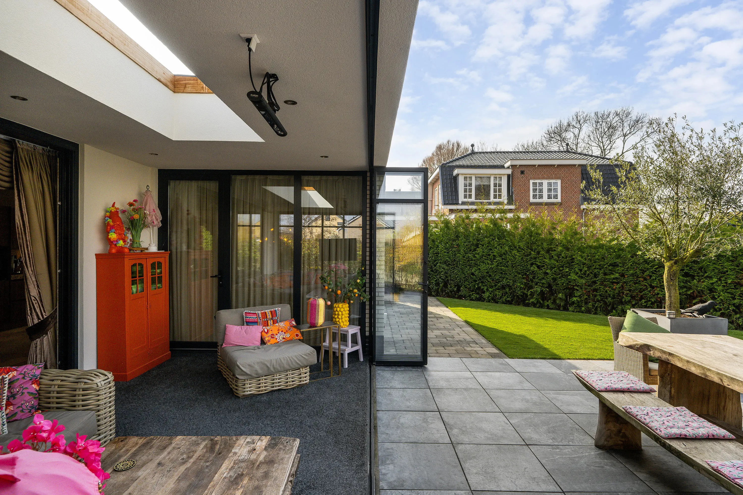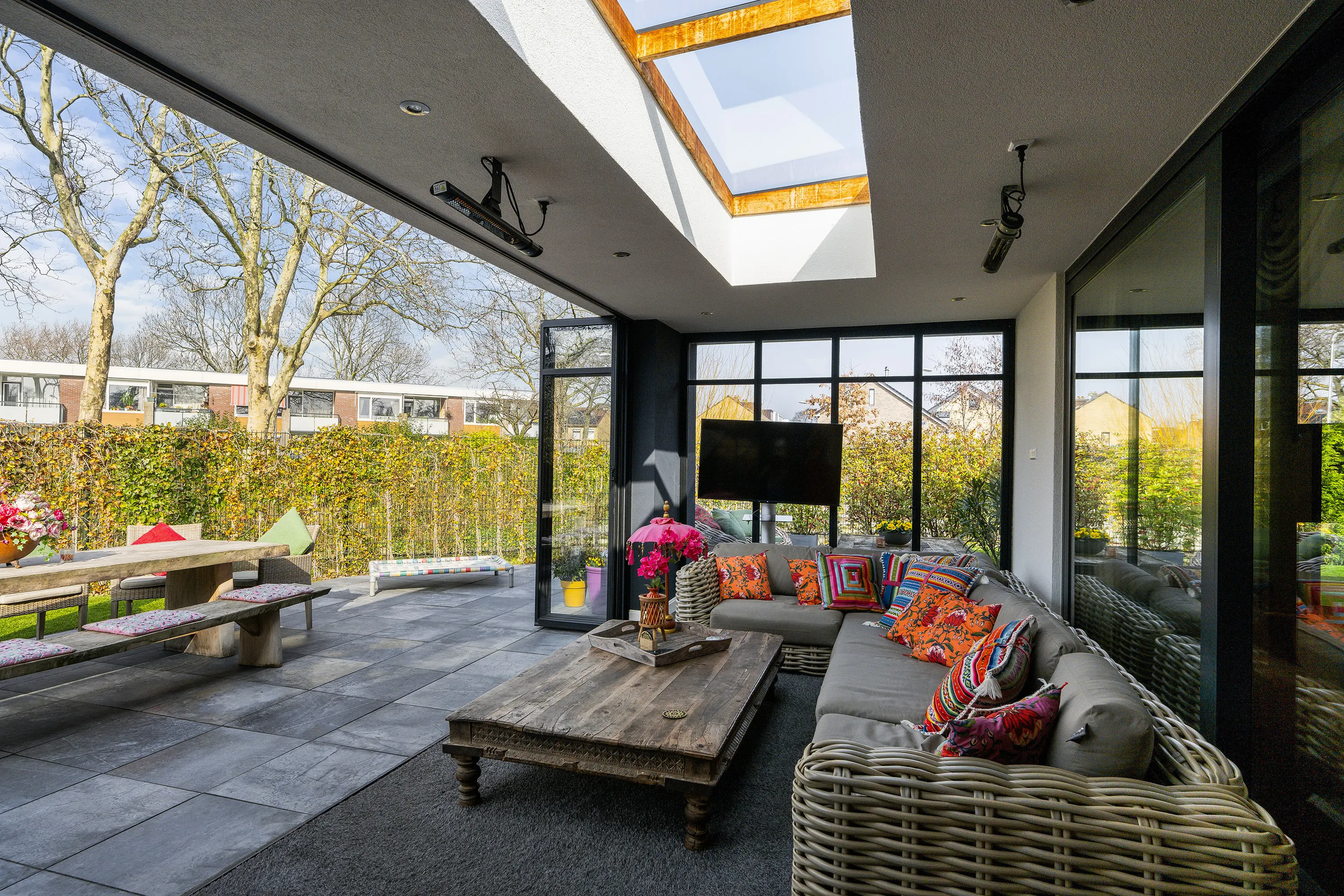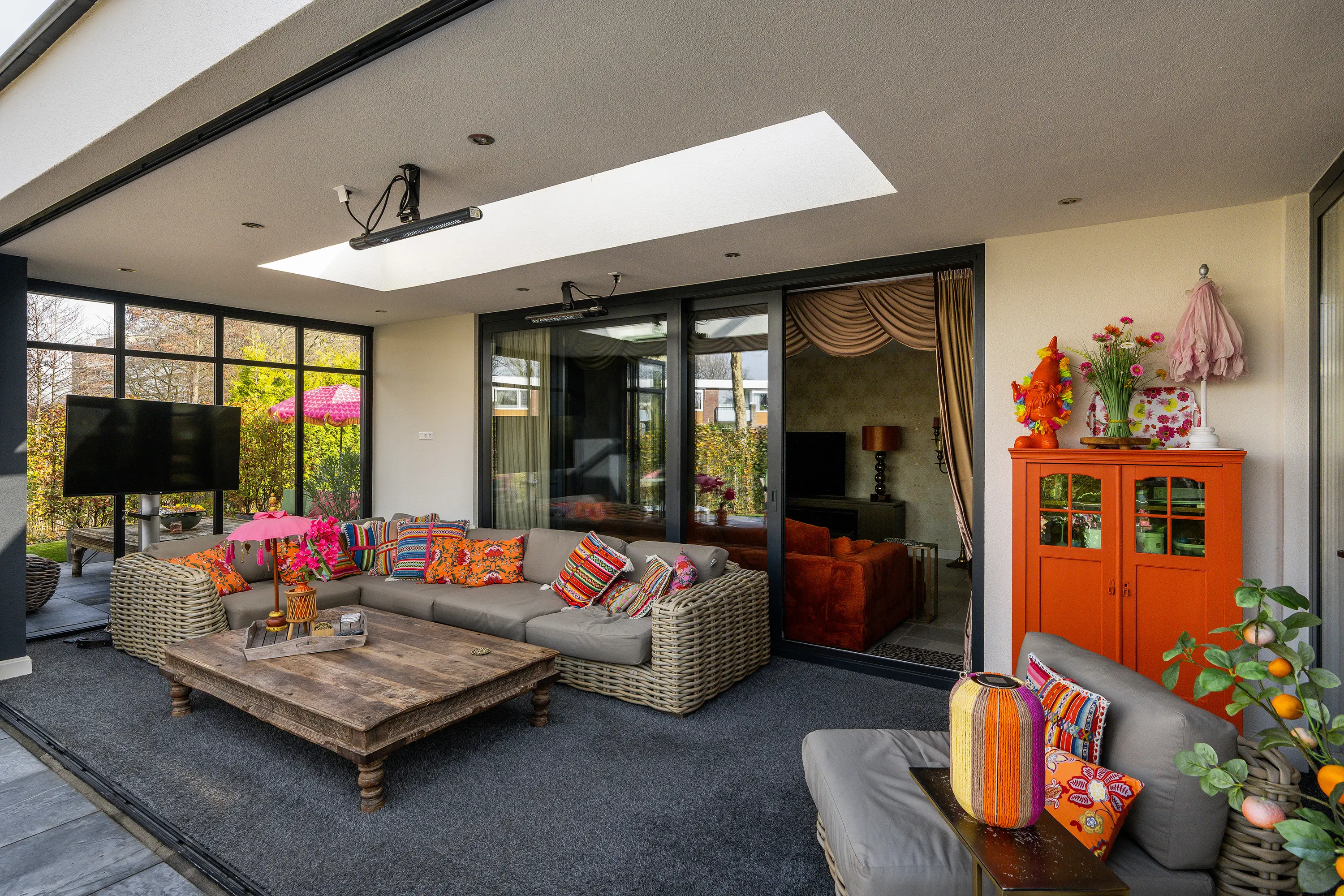 Via de grote schuifpui in de woonkamer bereikt u de luxe serre (ca. 27 m2), die zorgt voor een prachtige verbinding tussen binnen en buiten. Deze ruimte maakt het mogelijk om het hele jaar door te genieten van het buitenleven. De serre is volledig te openen en te sluiten, waardoor u flexibel bent in elk seizoen. Daarnaast is de serre voorzien van verlichting, een tv-aansluiting en een heater, waardoor het hier ook op koelere avonden comfortabel vertoeven is. De aanwezige lichtstraat zorgt voor een prettige lichtinval en versterkt het ruimtelijke gevoel.