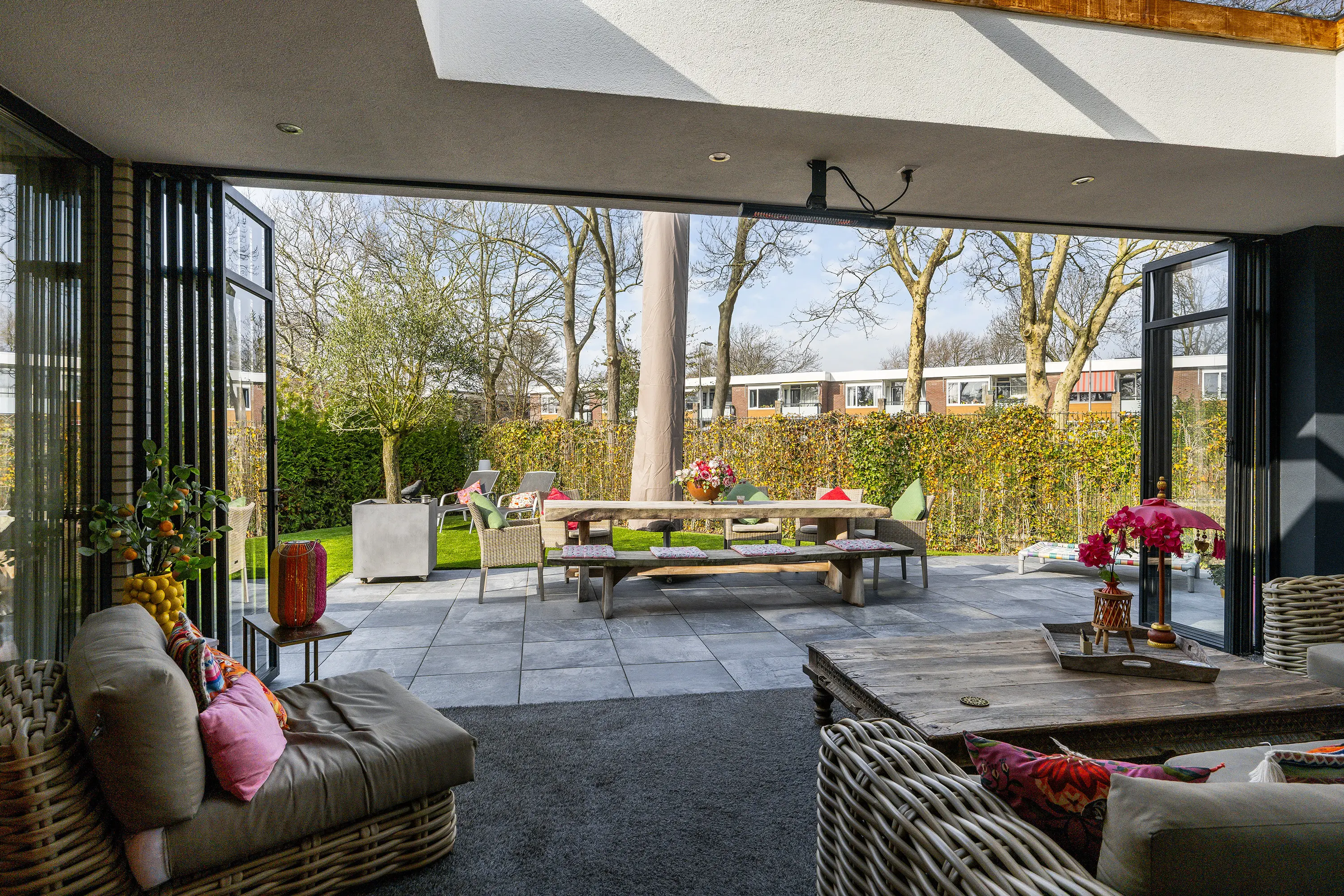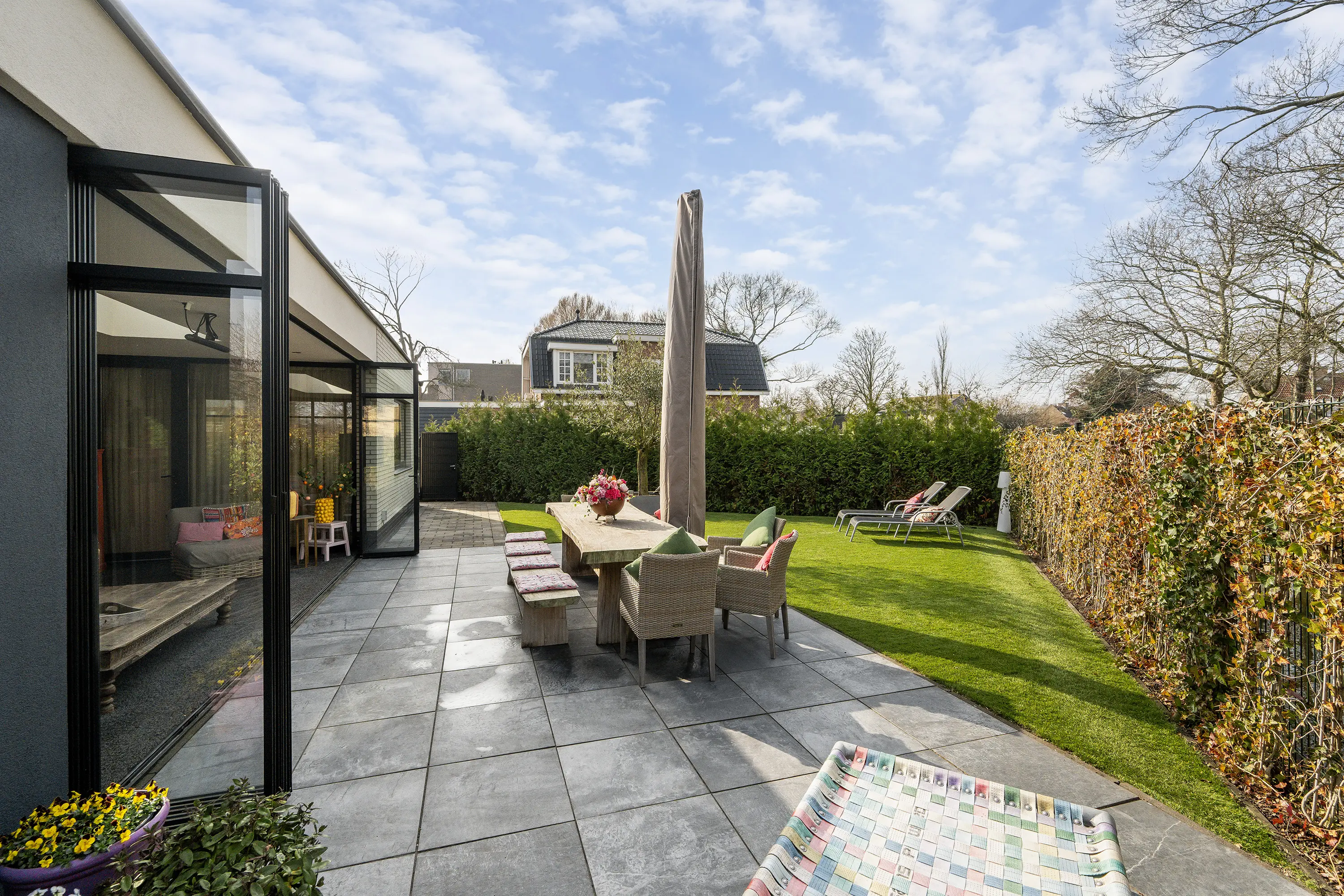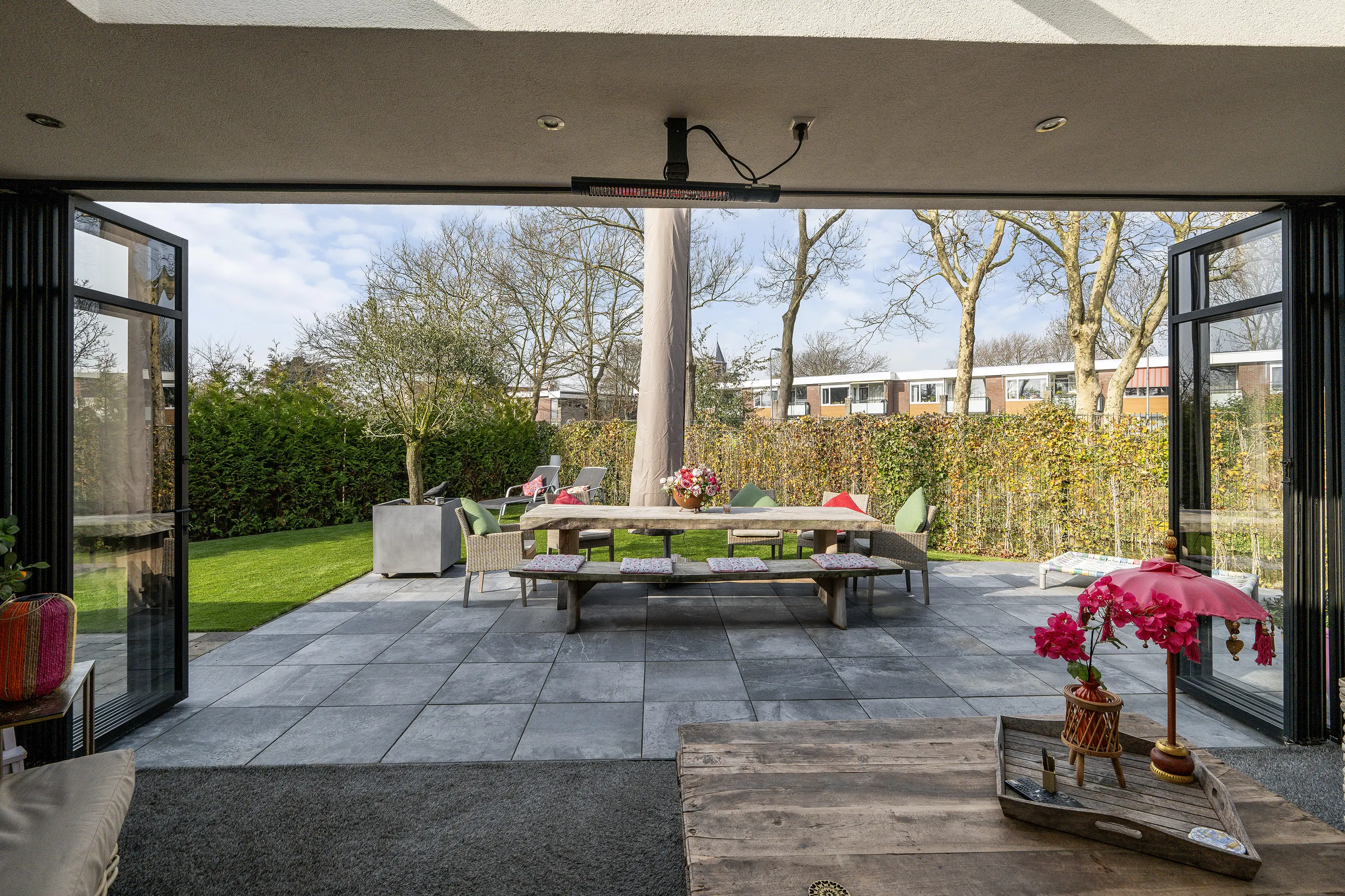 Via de grote schuifpui in de woonkamer bereikt u de luxe serre (ca. 27 m2), die zorgt voor een prachtige verbinding tussen binnen en buiten. Deze ruimte maakt het mogelijk om het hele jaar door te genieten van het buitenleven. De serre is volledig te openen en te sluiten, waardoor u flexibel bent in elk seizoen. Daarnaast is de serre voorzien van verlichting, een tv-aansluiting en een heater, waardoor het hier ook op koelere avonden comfortabel vertoeven is. De aanwezige lichtstraat zorgt voor een prettige lichtinval en versterkt het ruimtelijke gevoel.