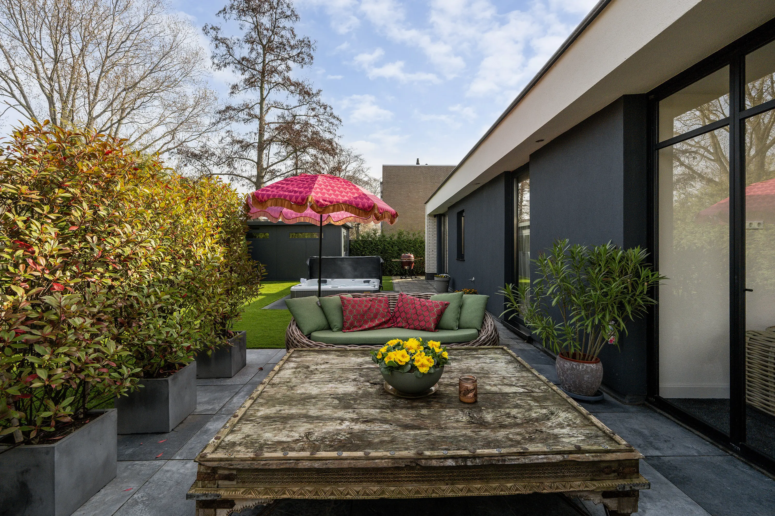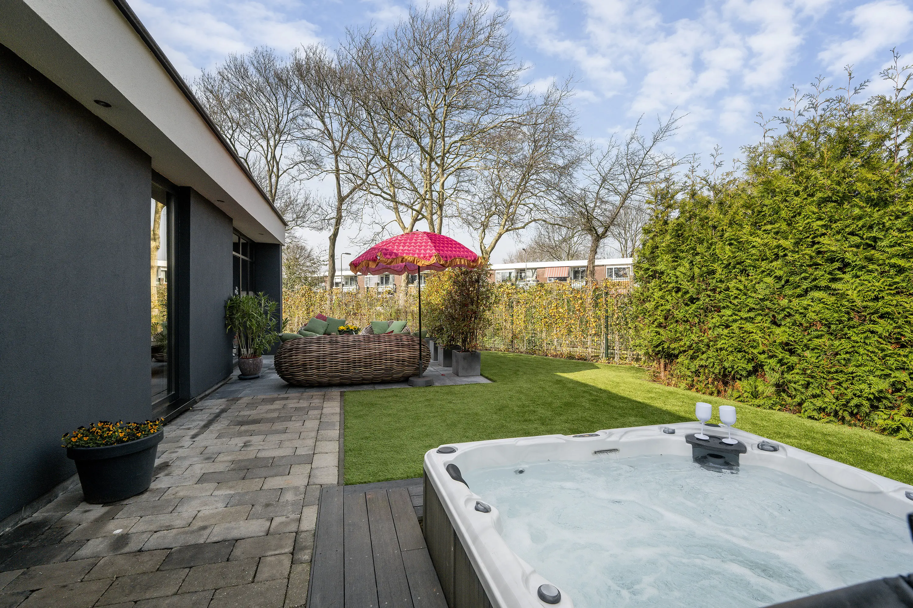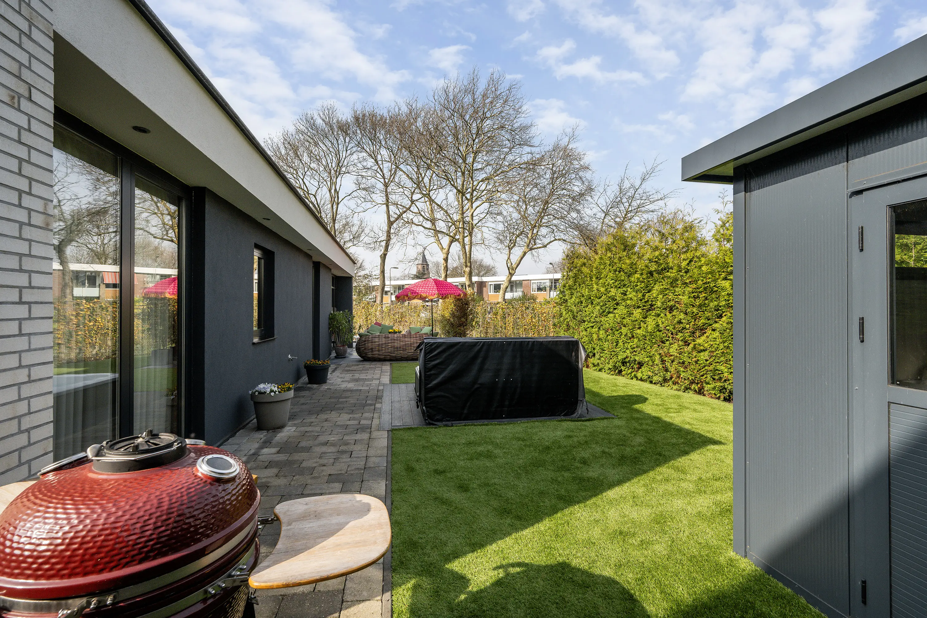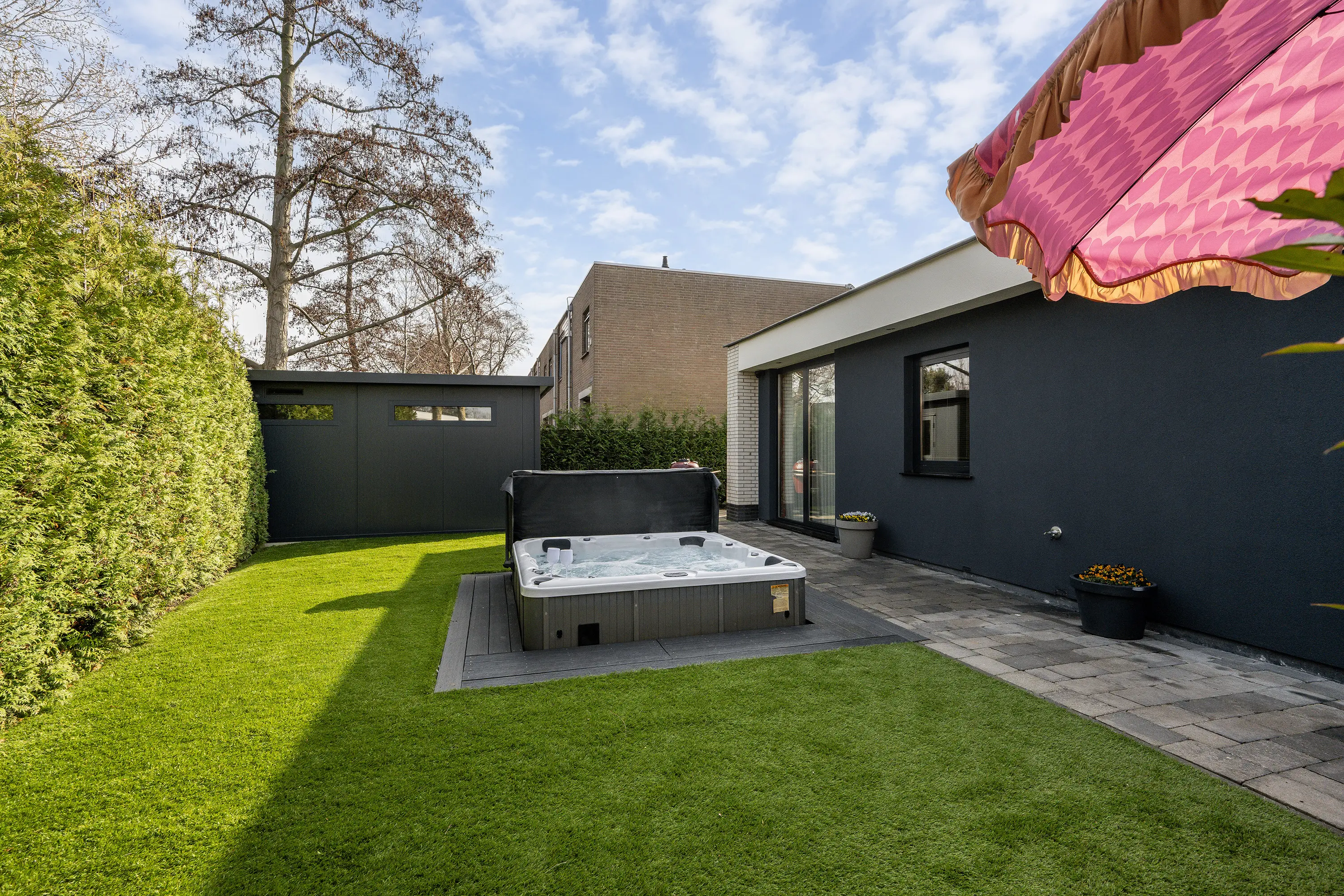 De achtertuin is een waar verlengstuk van de woning en biedt een heerlijke plek om te ontspannen. De tuin is fraai aangelegd, zeer ruim en geniet van veel zon en privacy, waardoor u hier op elk moment van de dag een fijne plek in de zon of schaduw kunt vinden. Met recht voelt het hier als vakantie in eigen tuin. De tuin beschikt over een losstaande berging, een jacuzzi en een onderhoudsvriendelijk kunstgras gazon. Dankzij de aanwezige bomen en heggen is er volop beschutting en privacy, waardoor u hier in alle rust kunt genieten van het buitenleven.