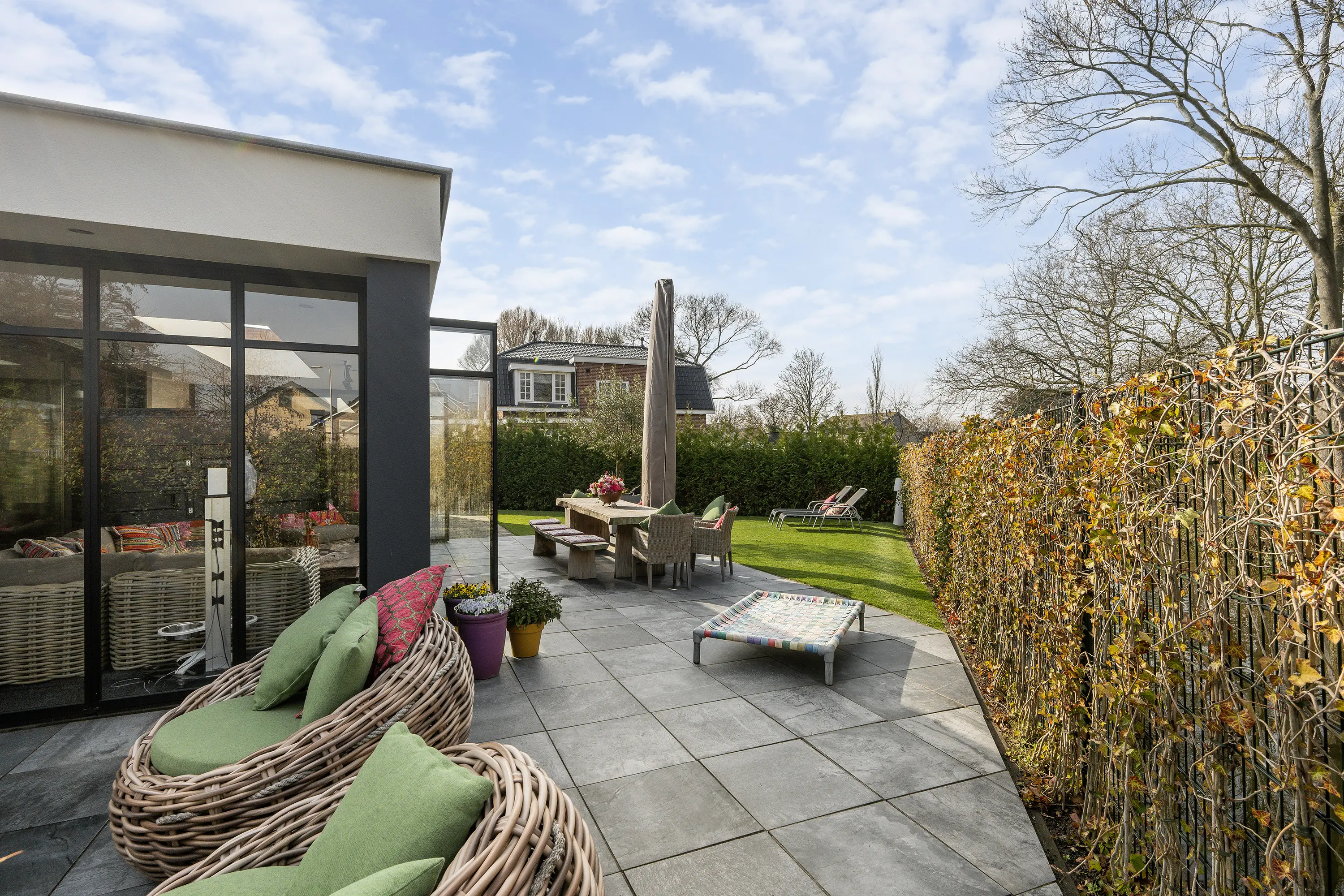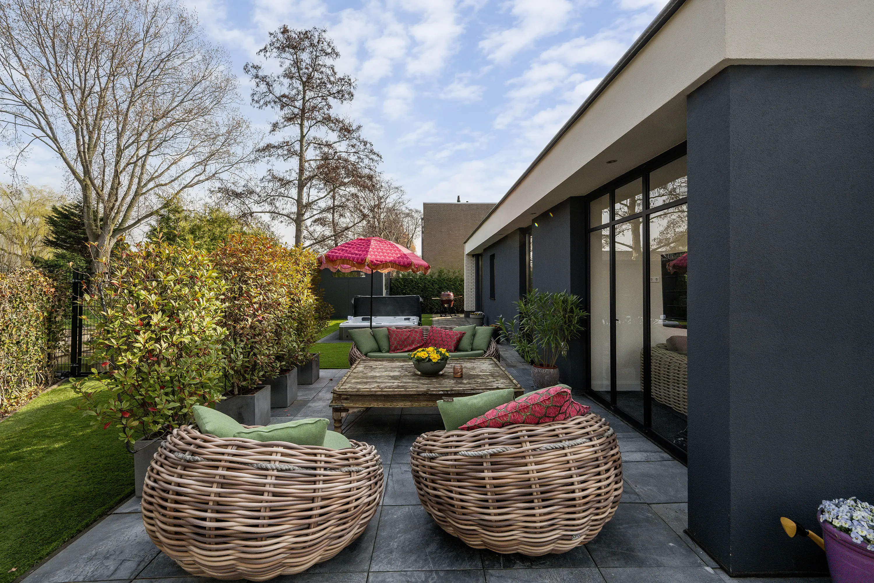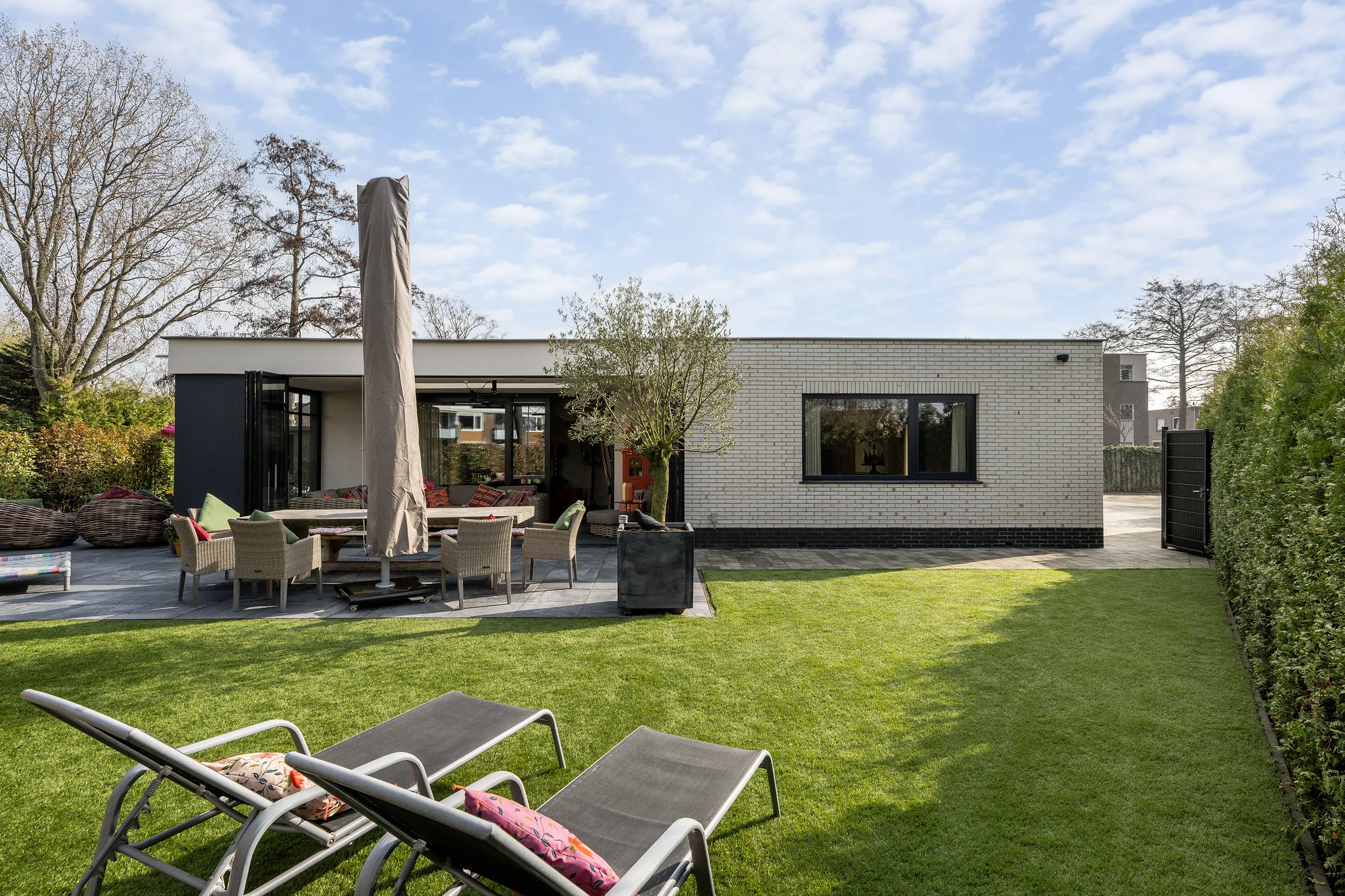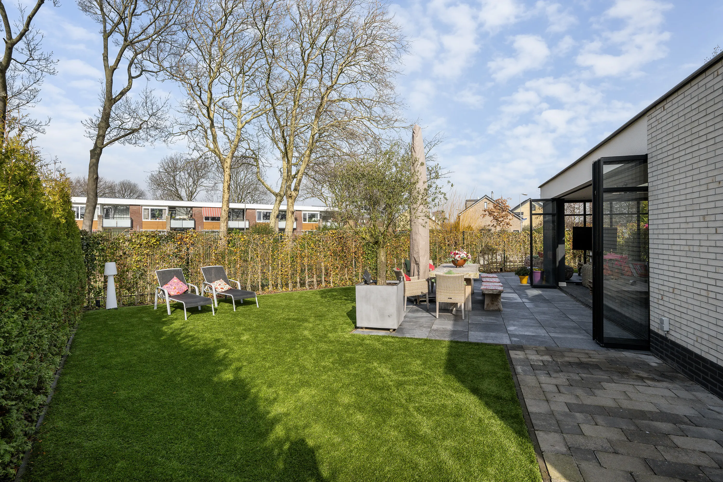 De achtertuin is een waar verlengstuk van de woning en biedt een heerlijke plek om te ontspannen. De tuin is fraai aangelegd, zeer ruim en geniet van veel zon en privacy, waardoor u hier op elk moment van de dag een fijne plek in de zon of schaduw kunt vinden. Met recht voelt het hier als vakantie in eigen tuin. De tuin beschikt over een losstaande berging, een jacuzzi en een onderhoudsvriendelijk kunstgras gazon. Dankzij de aanwezige bomen en heggen is er volop beschutting en privacy, waardoor u hier in alle rust kunt genieten van het buitenleven.