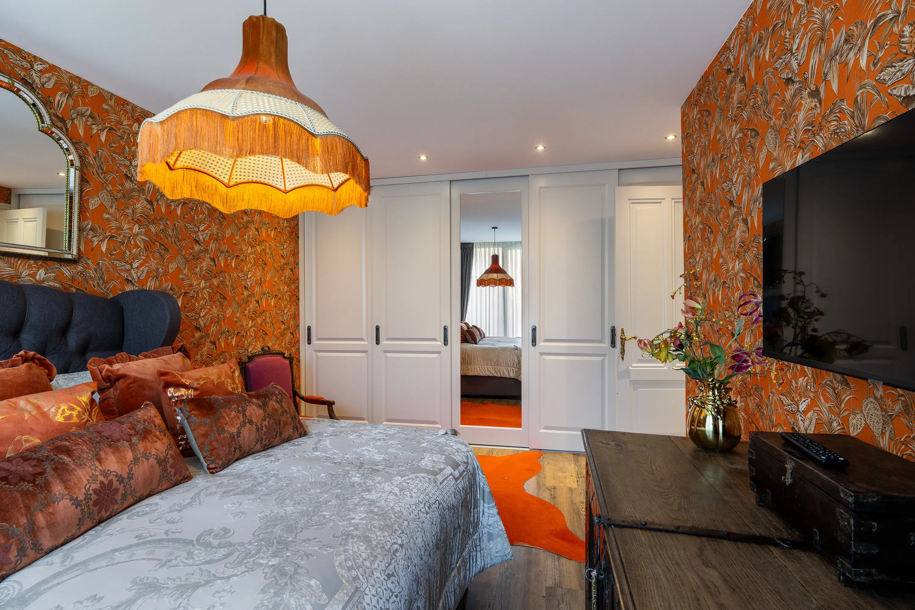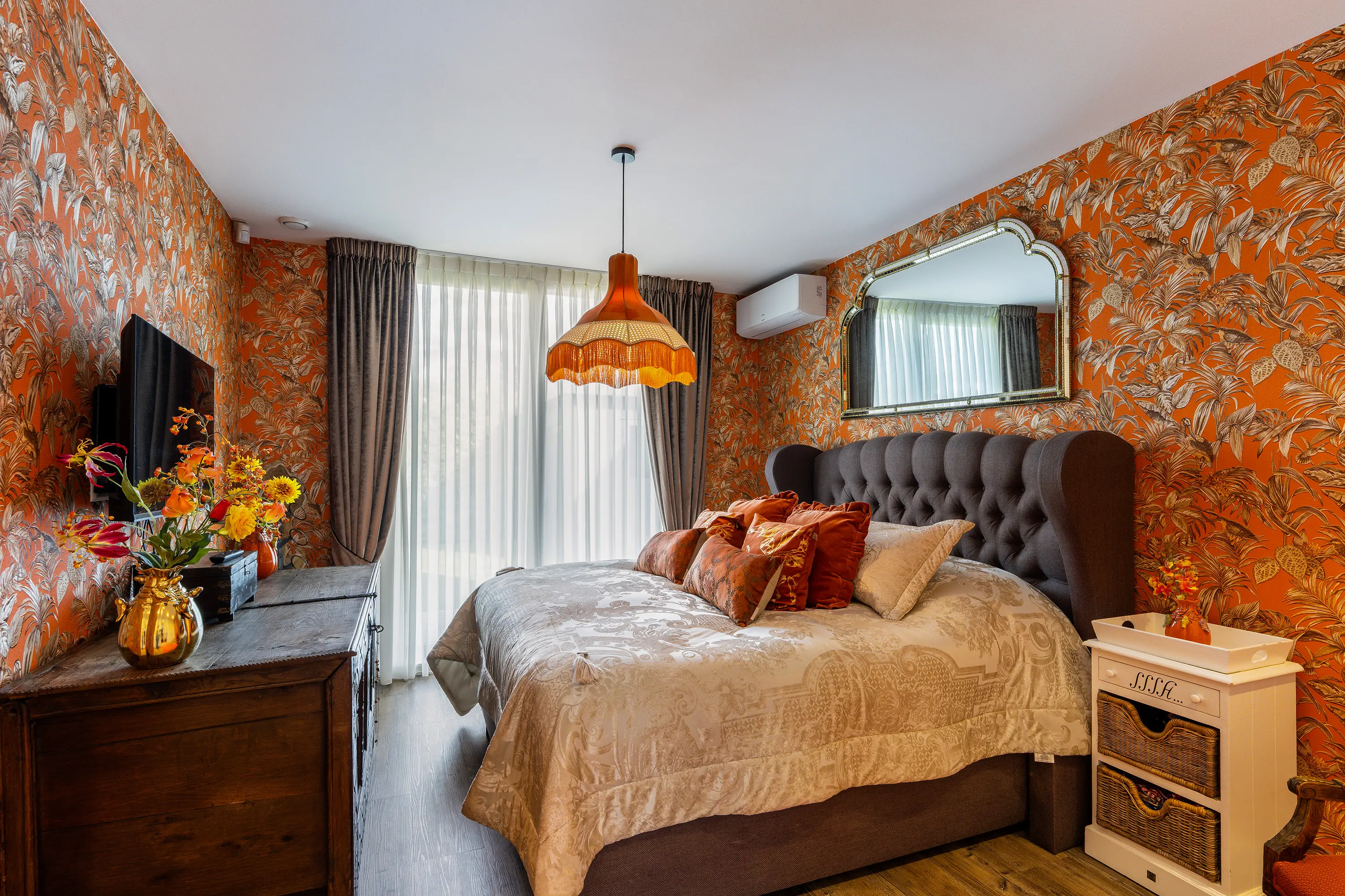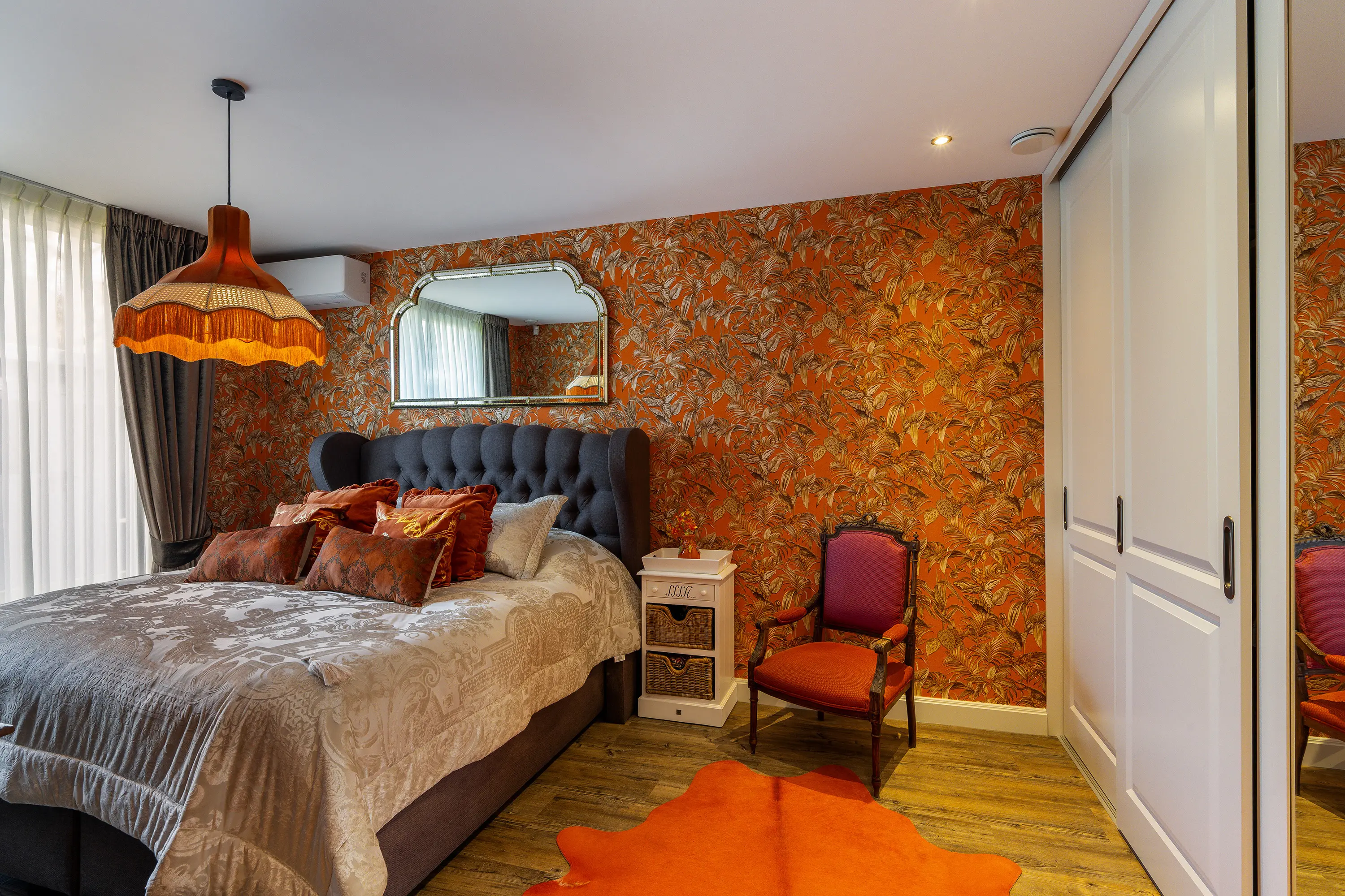 De masterbedroom is gelegen aan de achterzijde van de woning en biedt een rustige en comfortabele plek om te ontspannen. Deze kamer is voorzien van een ingebouwde kastenwand, airconditioning en een grote raampartij met uitzicht op de tuin, waardoor ook hier veel natuurlijk licht binnenvalt.