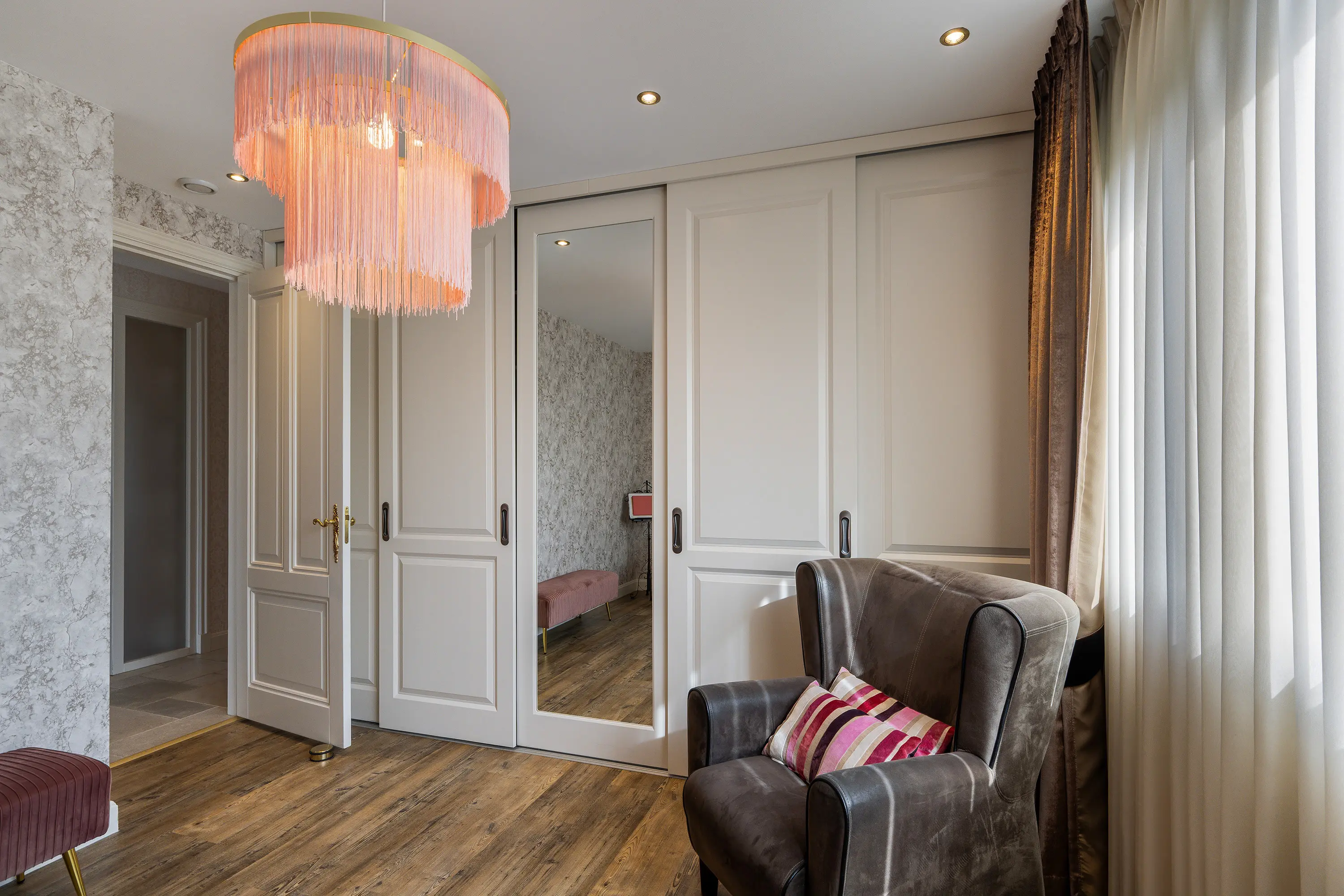 De tweede slaapkamer is royaal van formaat en eveneens voorzien van airconditioning en een ingebouwde kastenwand. De derde slaapkamer, gelegen aan de voorzijde van de woning, is eveneens goed bemeten en zeer veelzijdig in gebruik. Deze ruimte is ideaal als logeerkamer, hobbyruimte of thuiswerkplek.