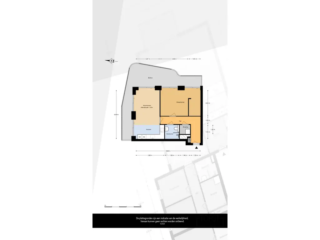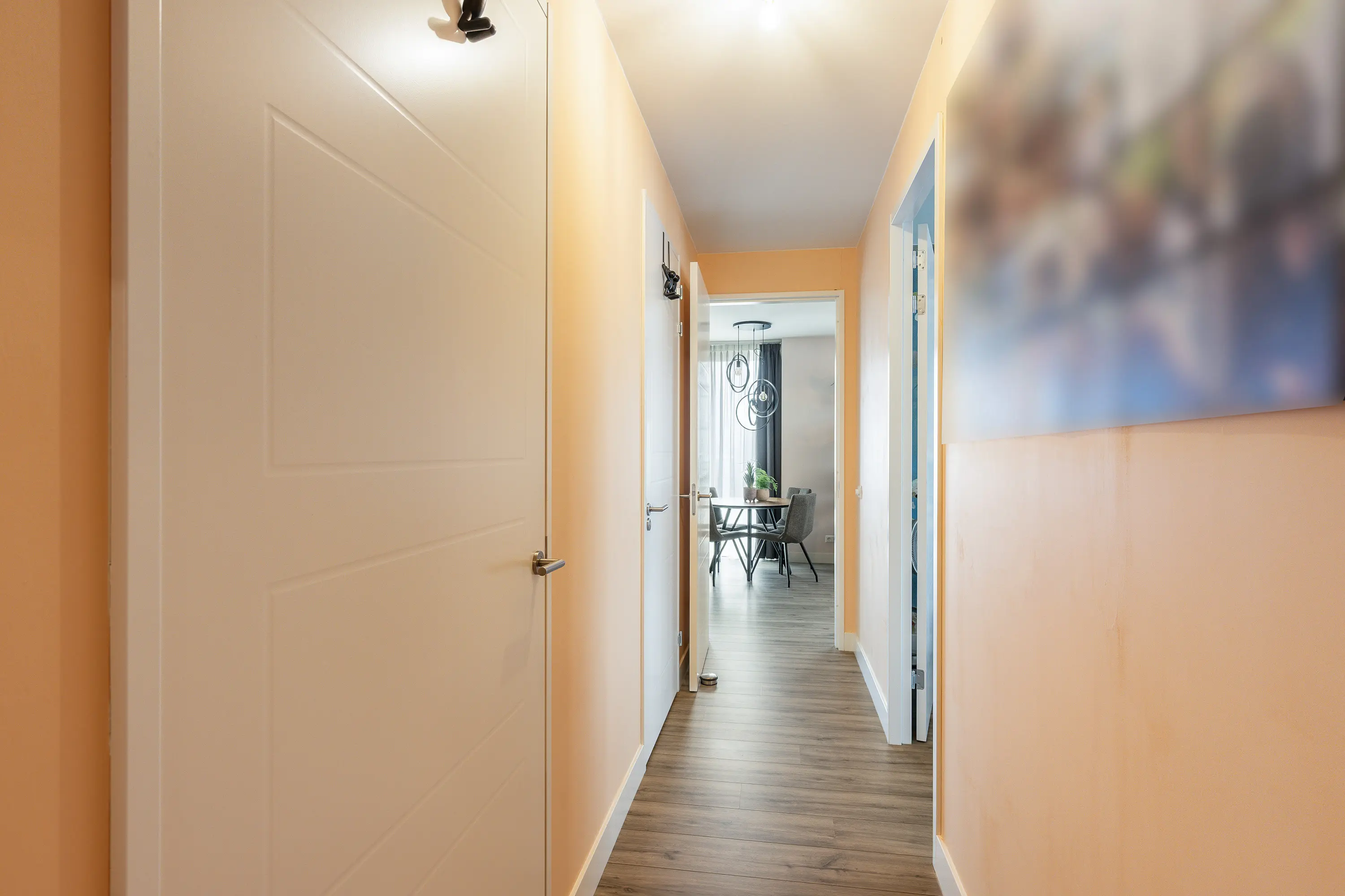 Bij binnenkomst komt u in de ruime L-vormige hal met meterkast. Vanuit hier heeft u toegang tot de woonkamer, slaapkamer, badkamer en de separate technische/wasruimte met warmtepomp en aansluiting voor wasmachine.