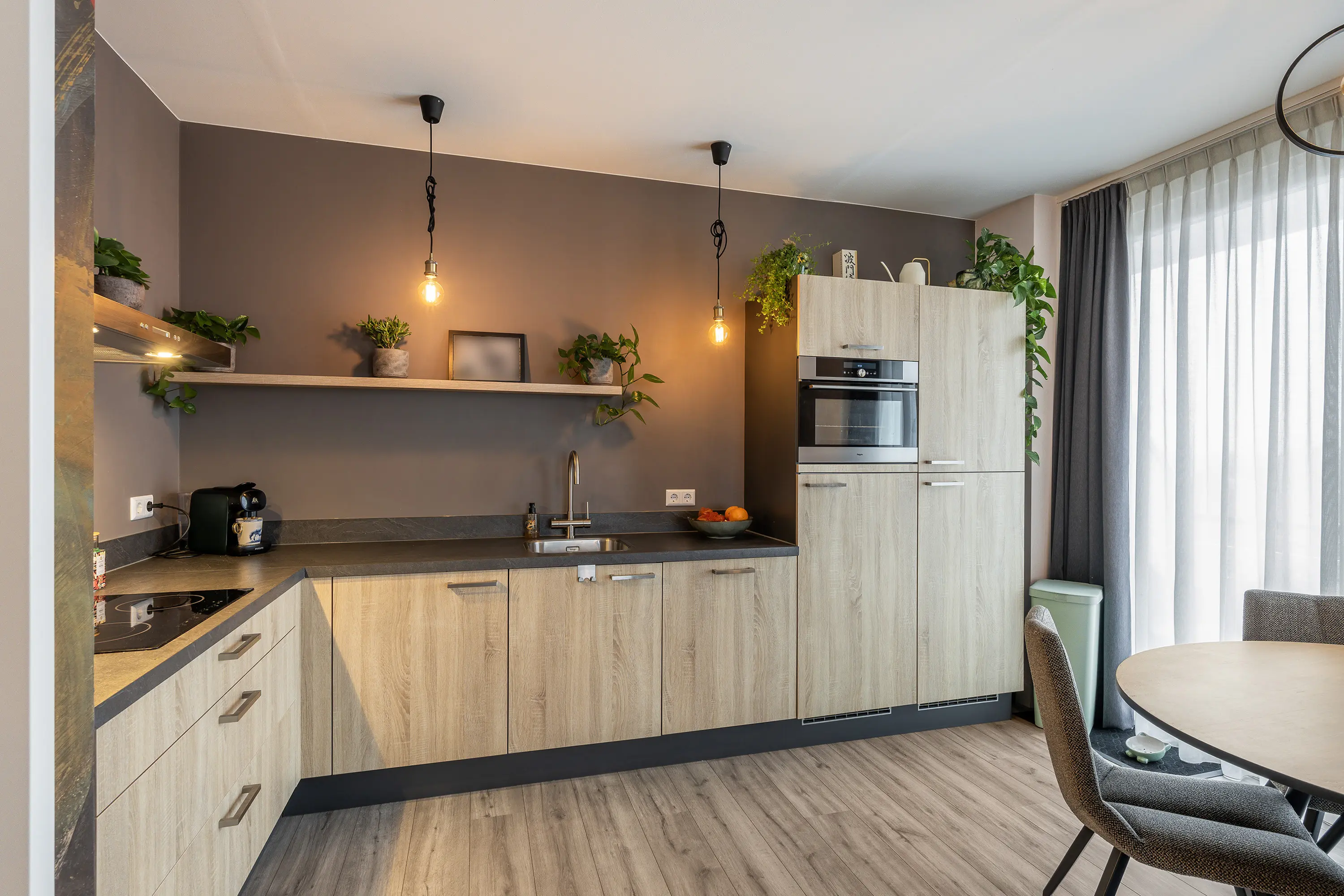 Aan het einde van de hal bereikt u de lichte woonkamer met open keuken. De ruimte wordt gekenmerkt door grote raampartijen en meerdere schuifpuien naar het terras. De keuken is stijlvol uitgevoerd met een zwart werkblad, inductiekookplaat en combi-oven. Er is volop ruimte voor een gezellige eethoek.
