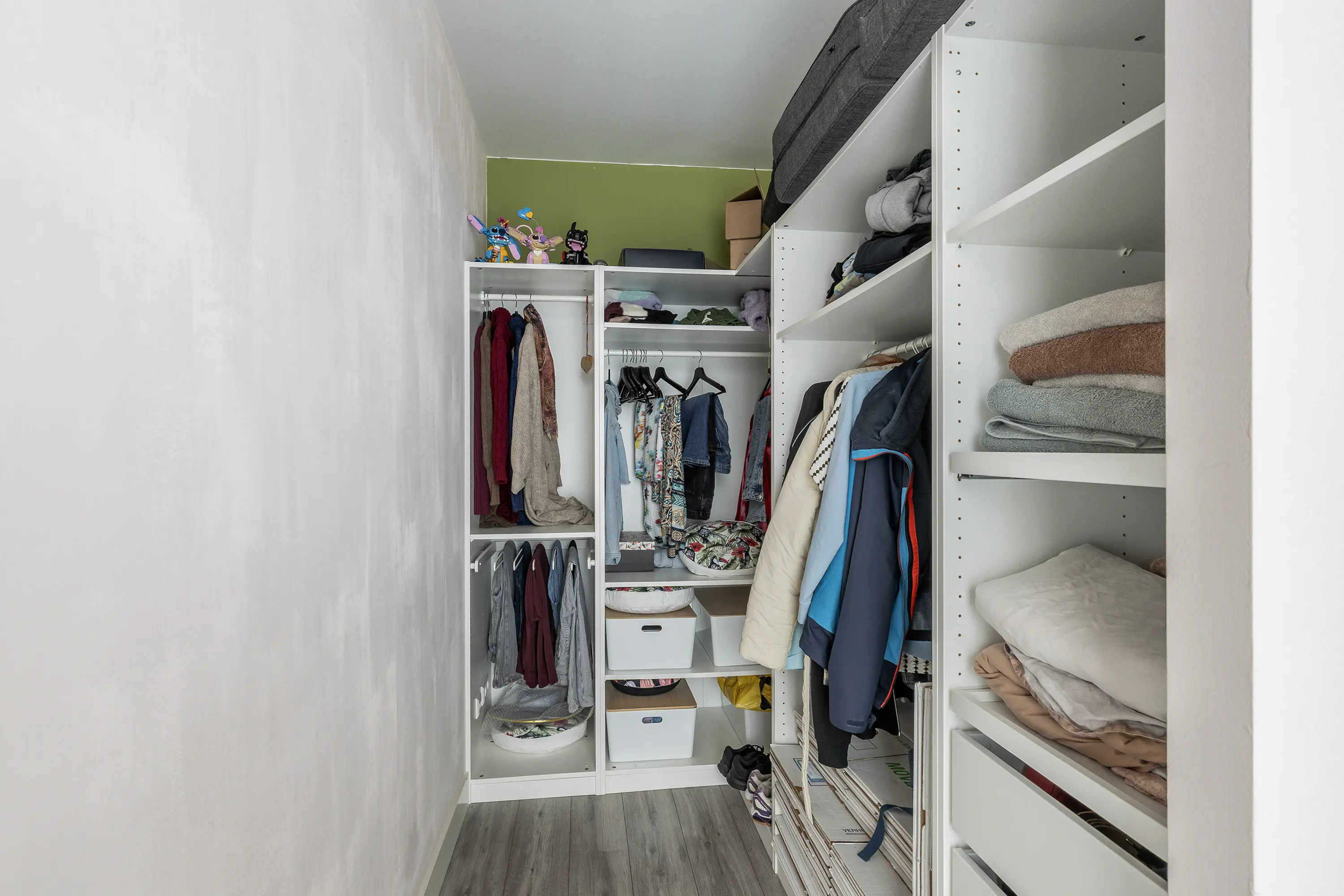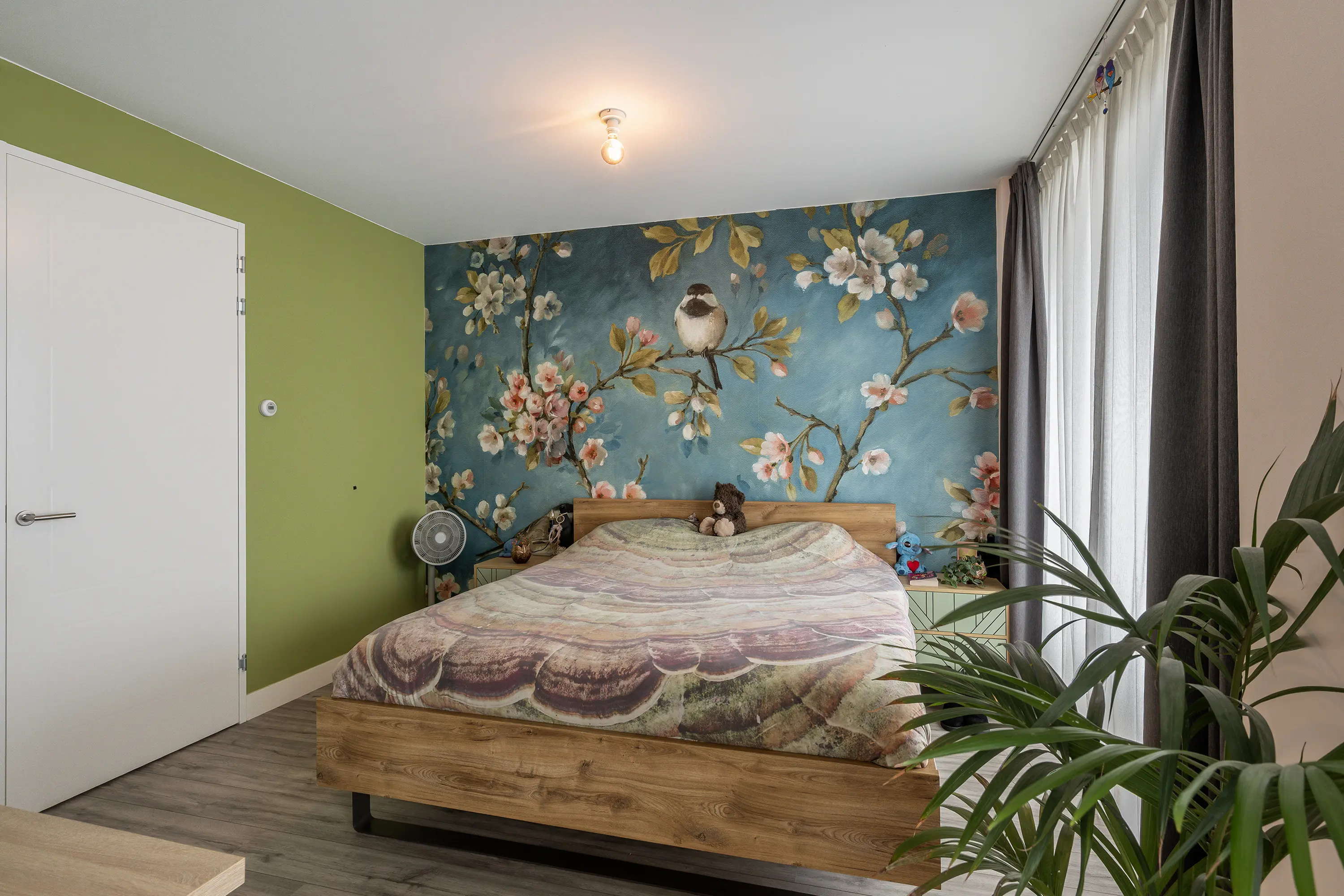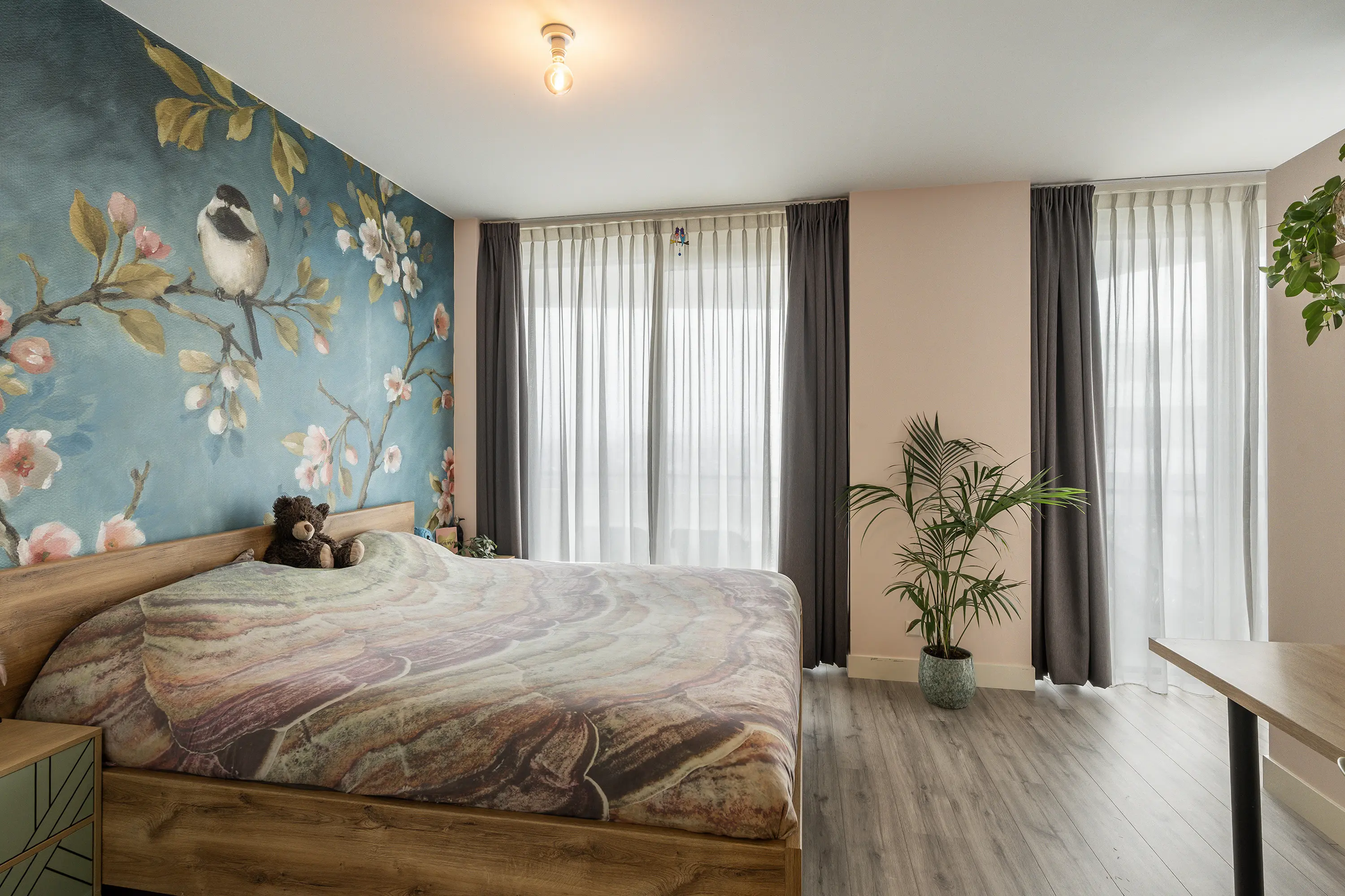 De slaapkamer is ruim opgezet en biedt direct toegang tot het terras via een schuifpui. Aangrenzend bevindt zich de royale inloopkast, ideaal voor wie houdt van overzicht en opbergruimte. De moderne badkamer is compleet uitgerust met een regendouche, handdouche, wastafelmeubel met bergruimte en toilet.